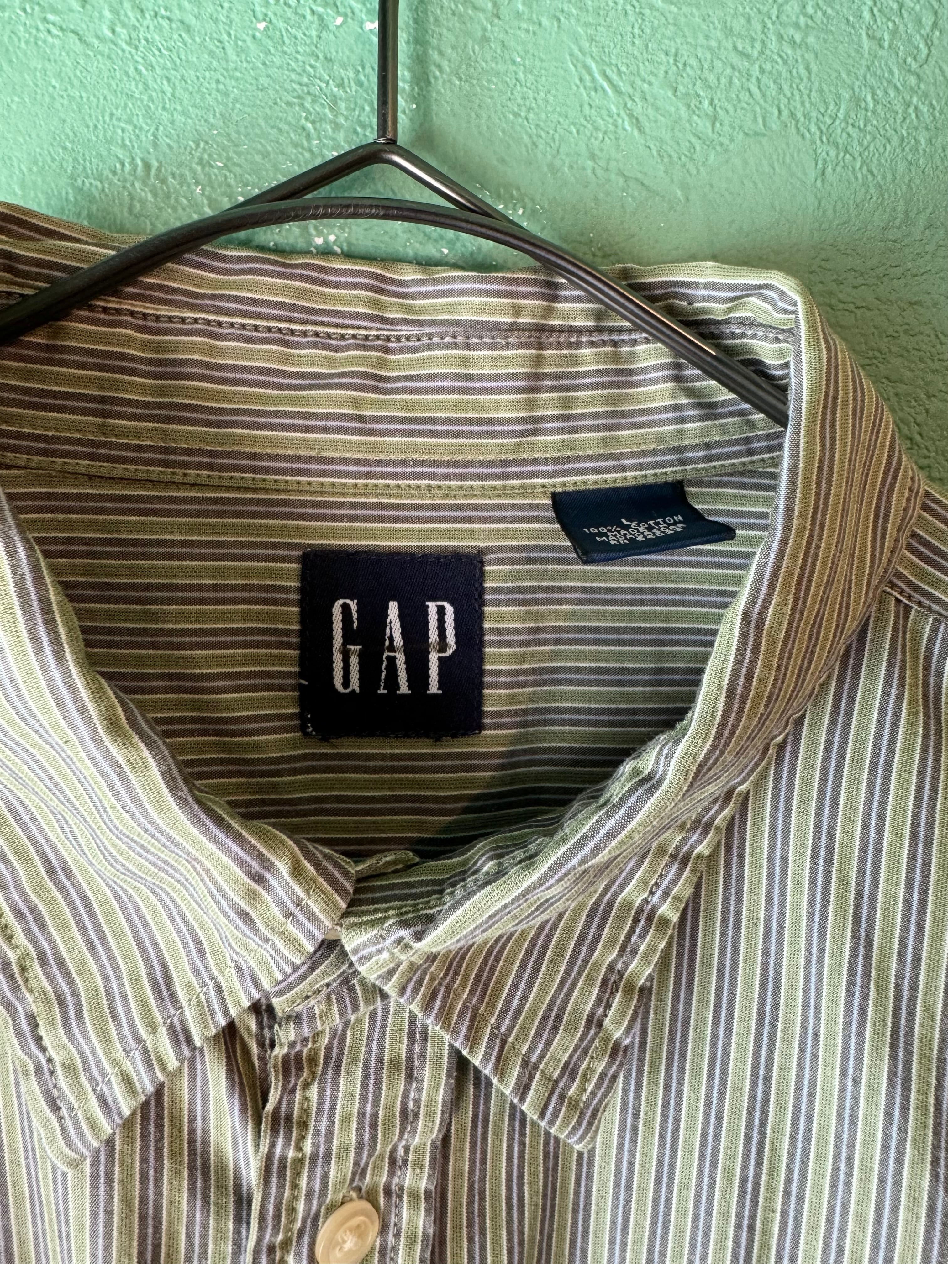 こちらはカーキをベースとした淡いブルーのストライプパターンのコットンシャツ。