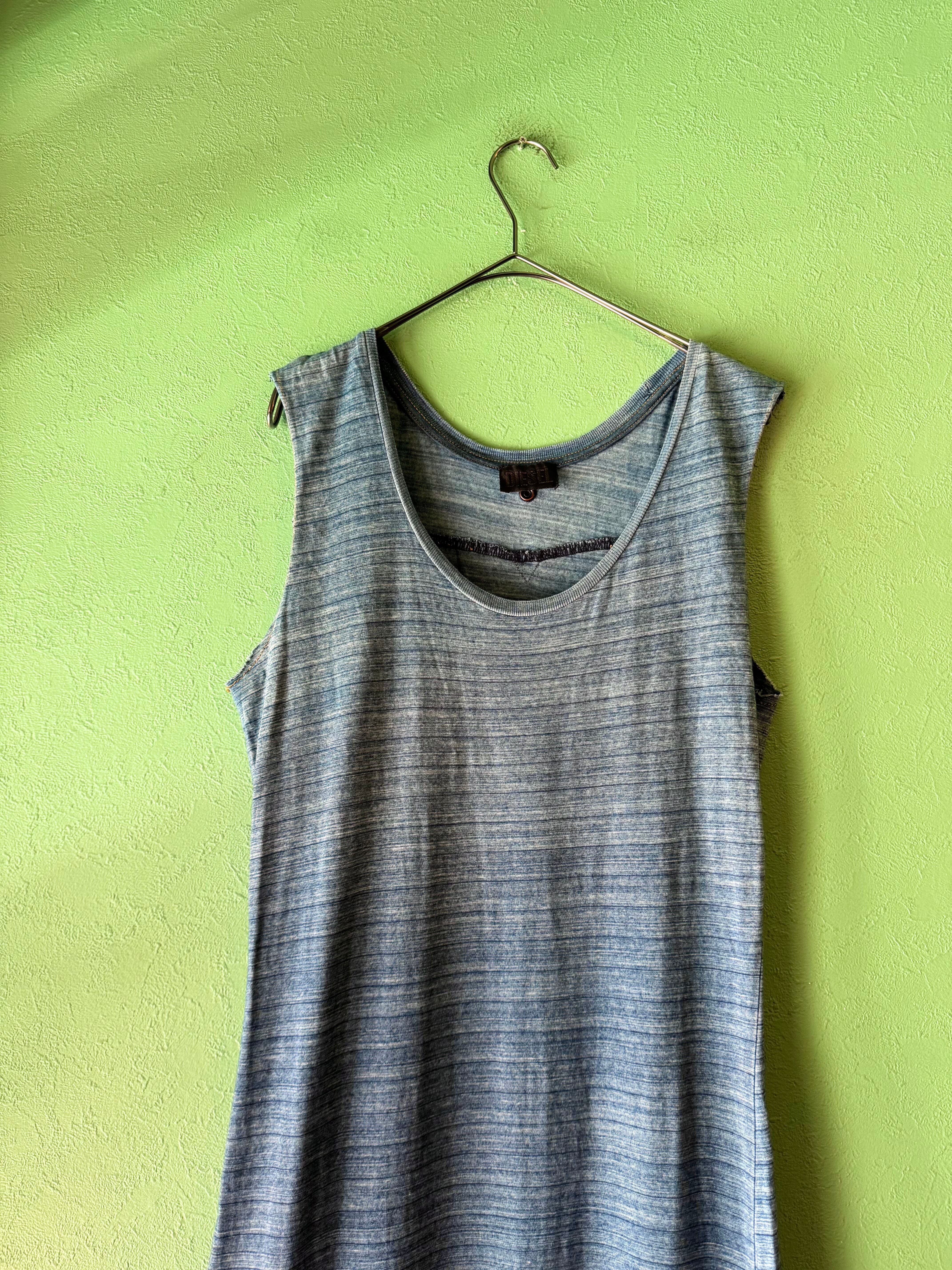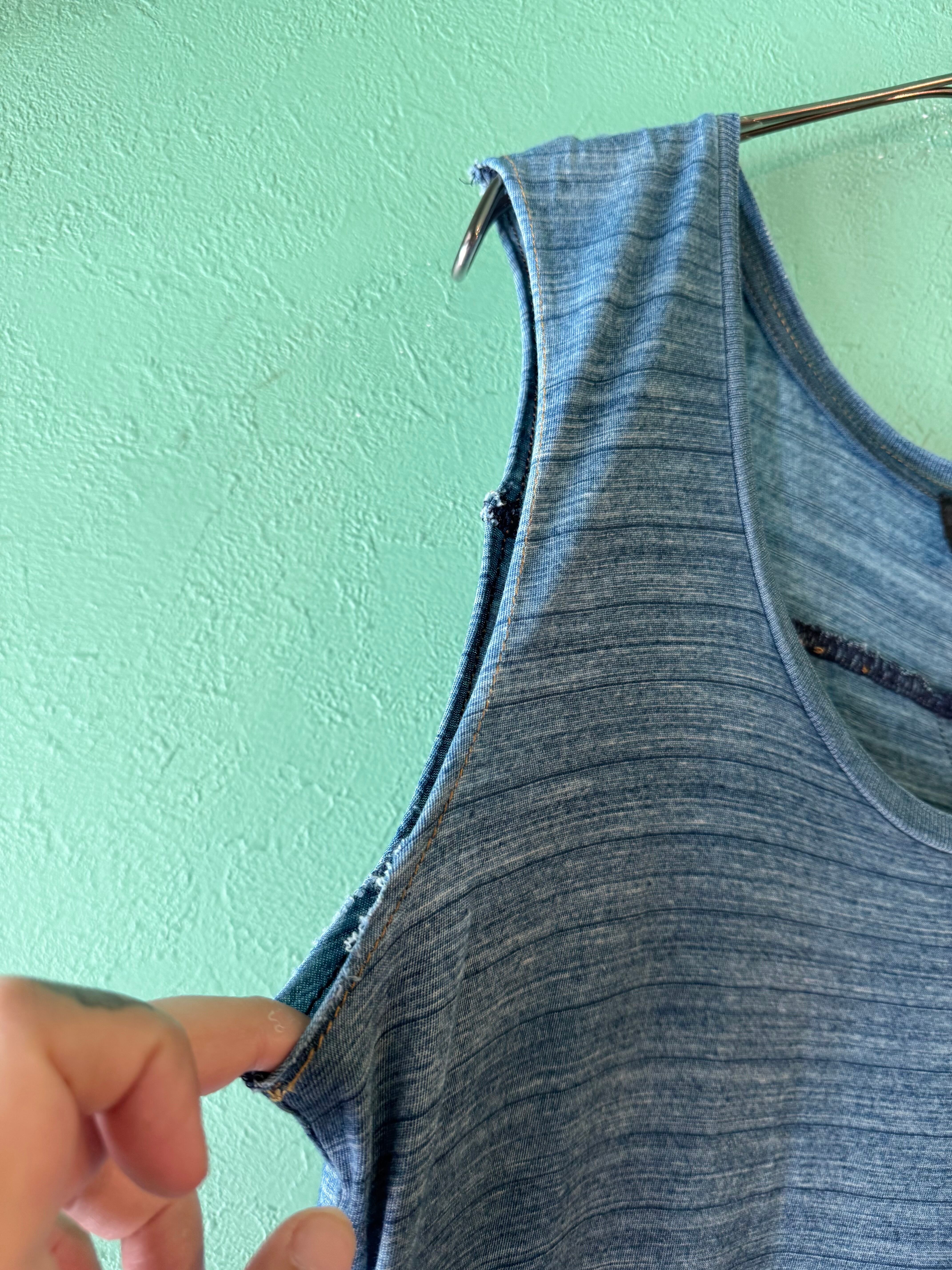 デニムアイテムを彷彿させるステッチワークに袖も切りっぱなしのようになっており、ややグラデーションがかったデザインになっています。