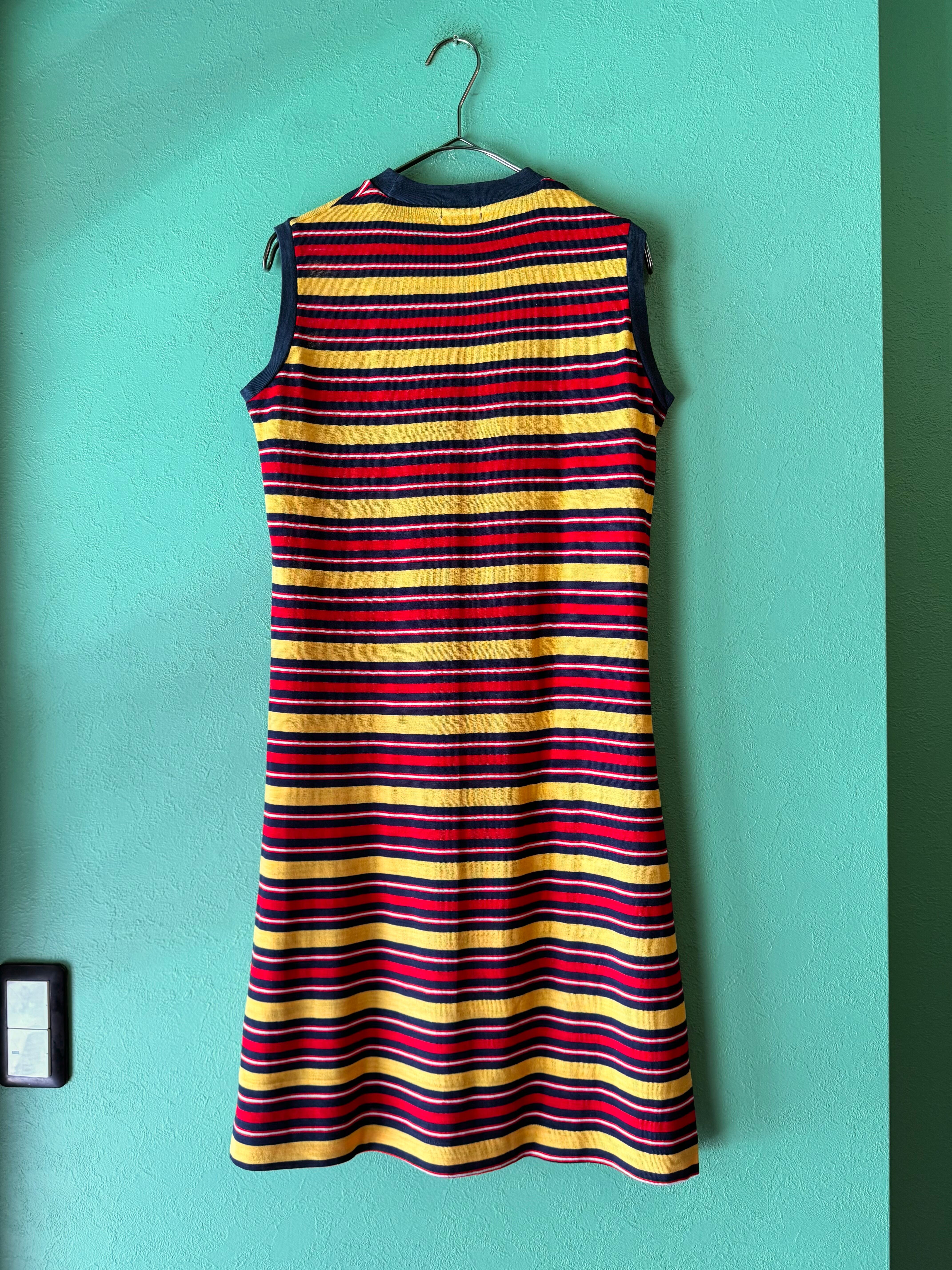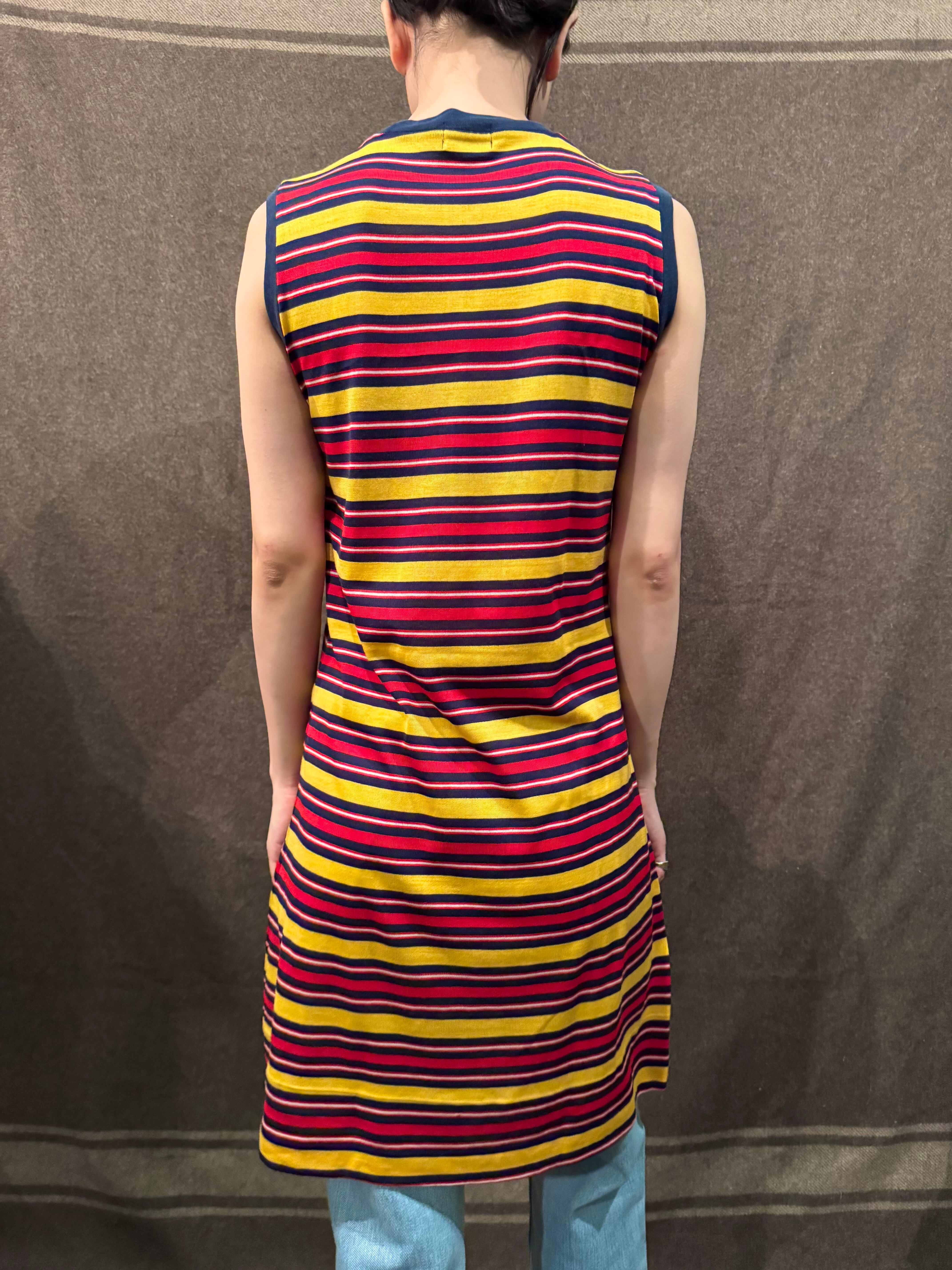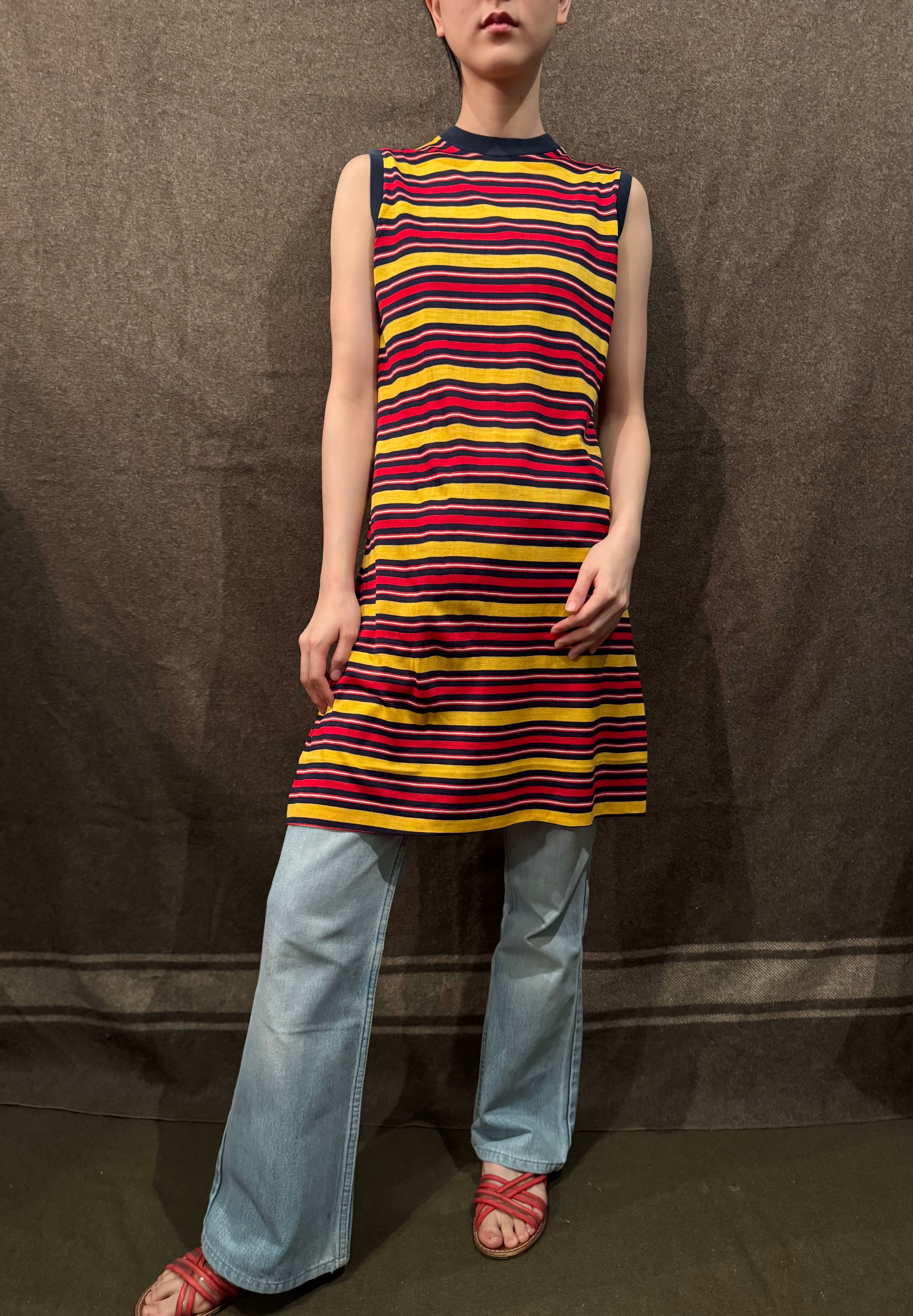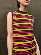 こちらはレッド×イエロー×ネイビー×ホワイトのレトロライクなマルチボーダーパターンの可愛いミニワンピース。