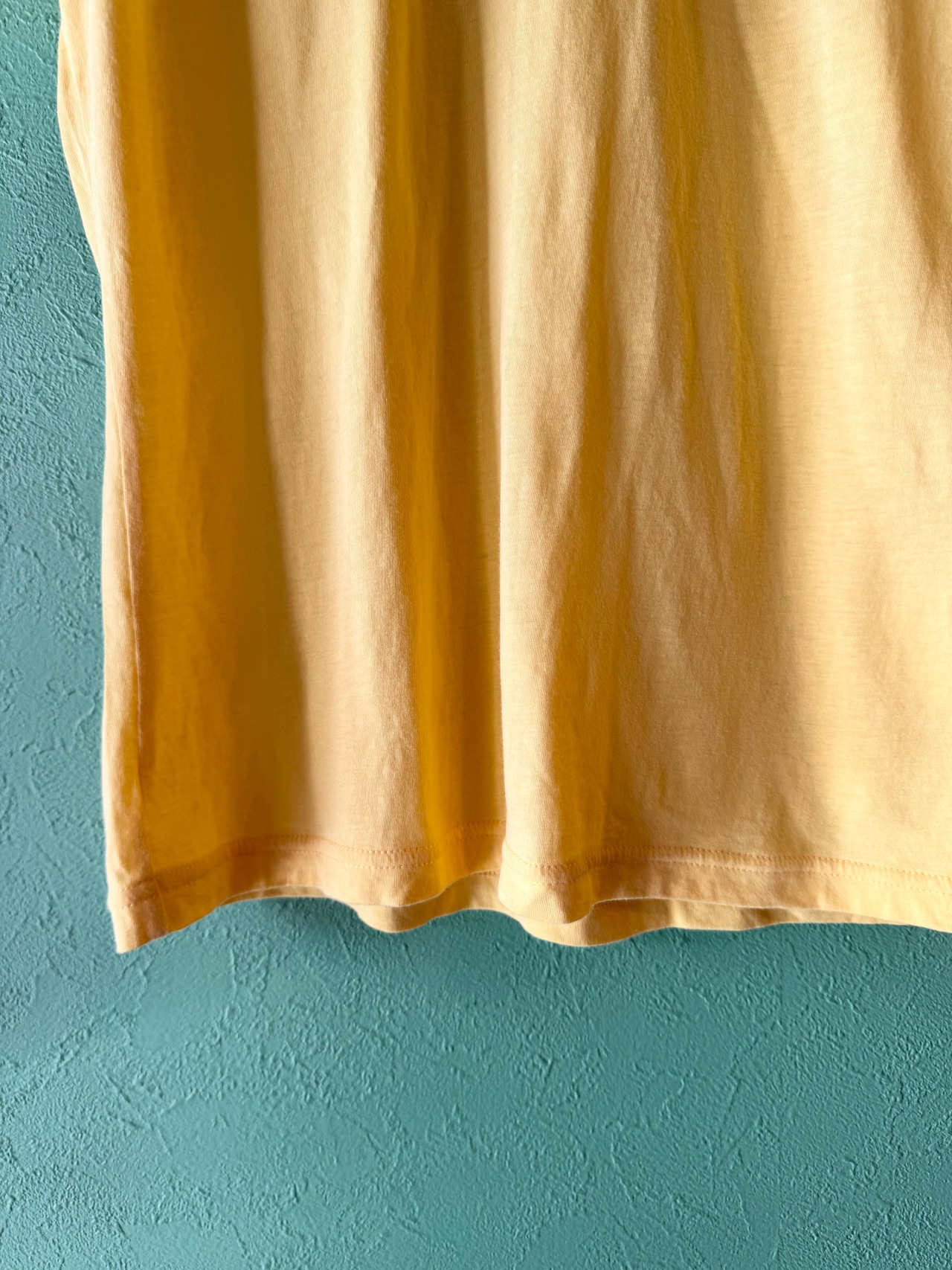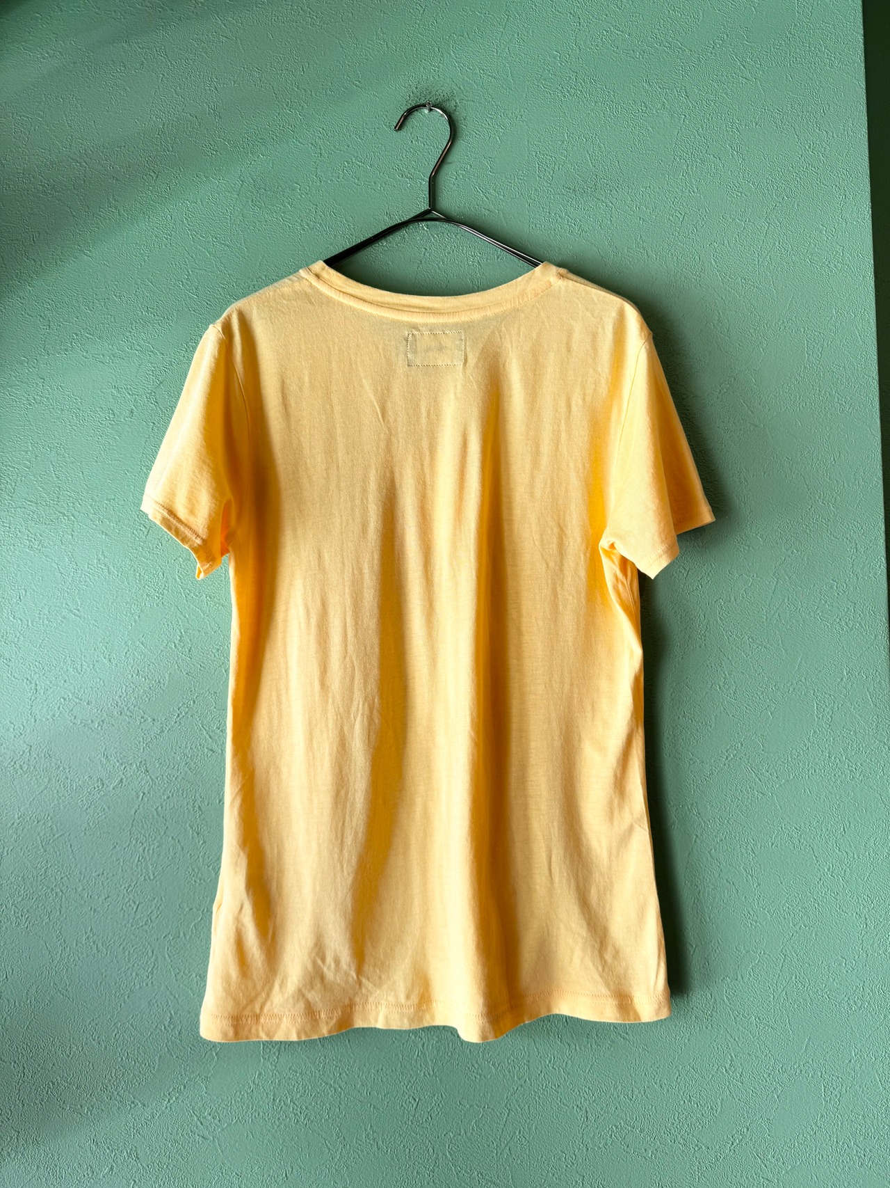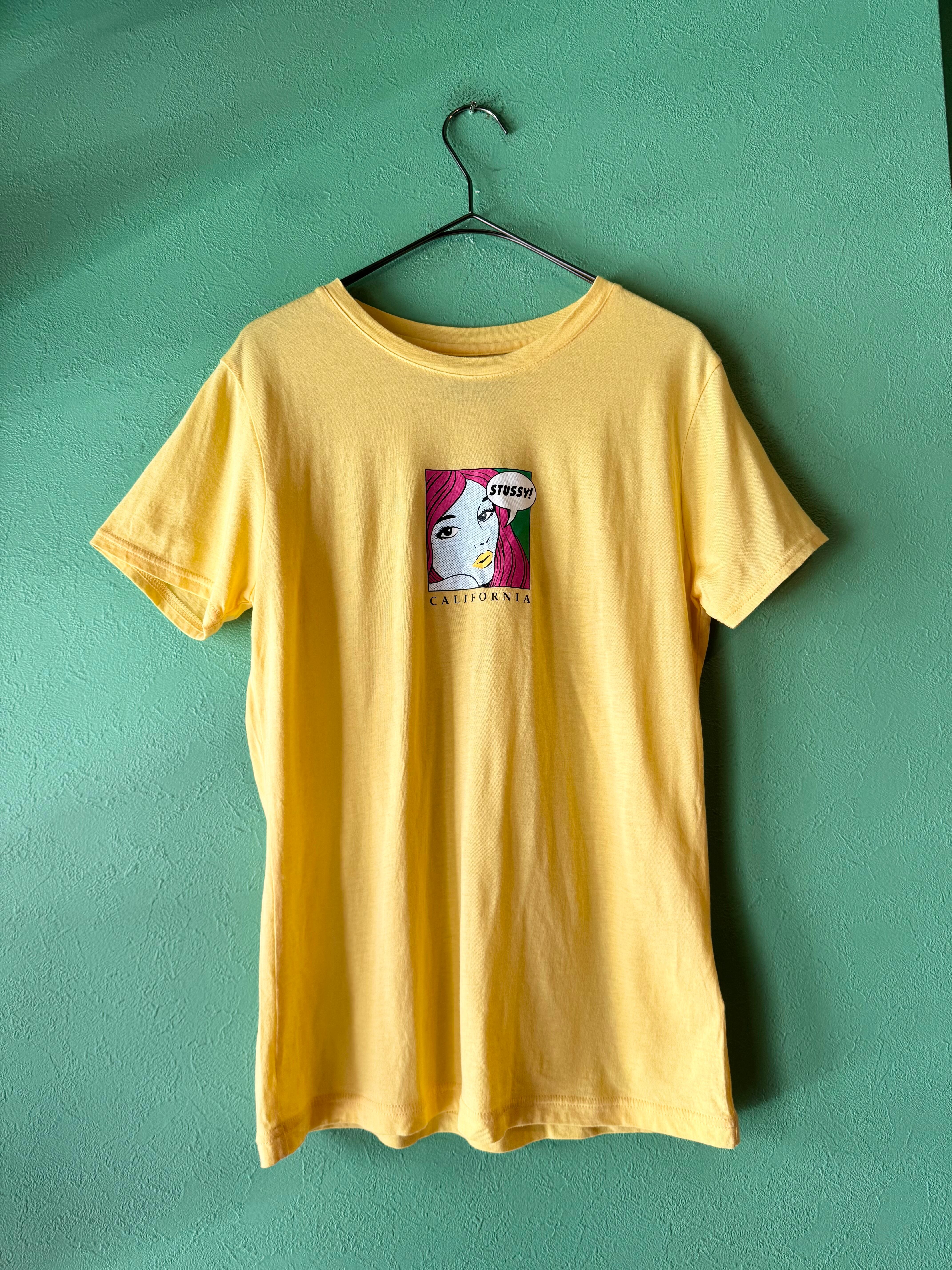 こちらは可愛らしいイエローボディーにまるで宇宙人のようなサイケなカラーリングのギャルがプリントされたTシャツ。
