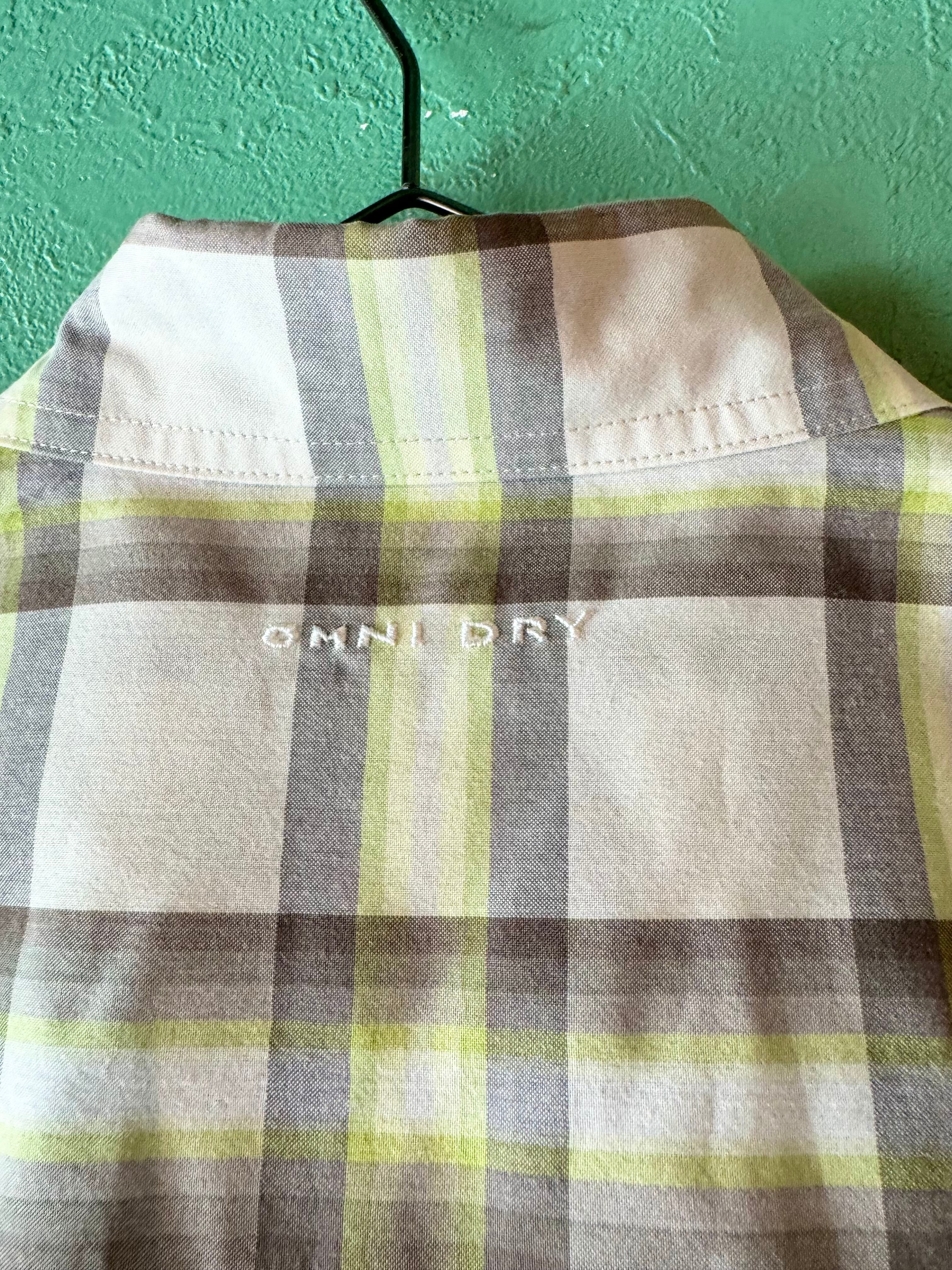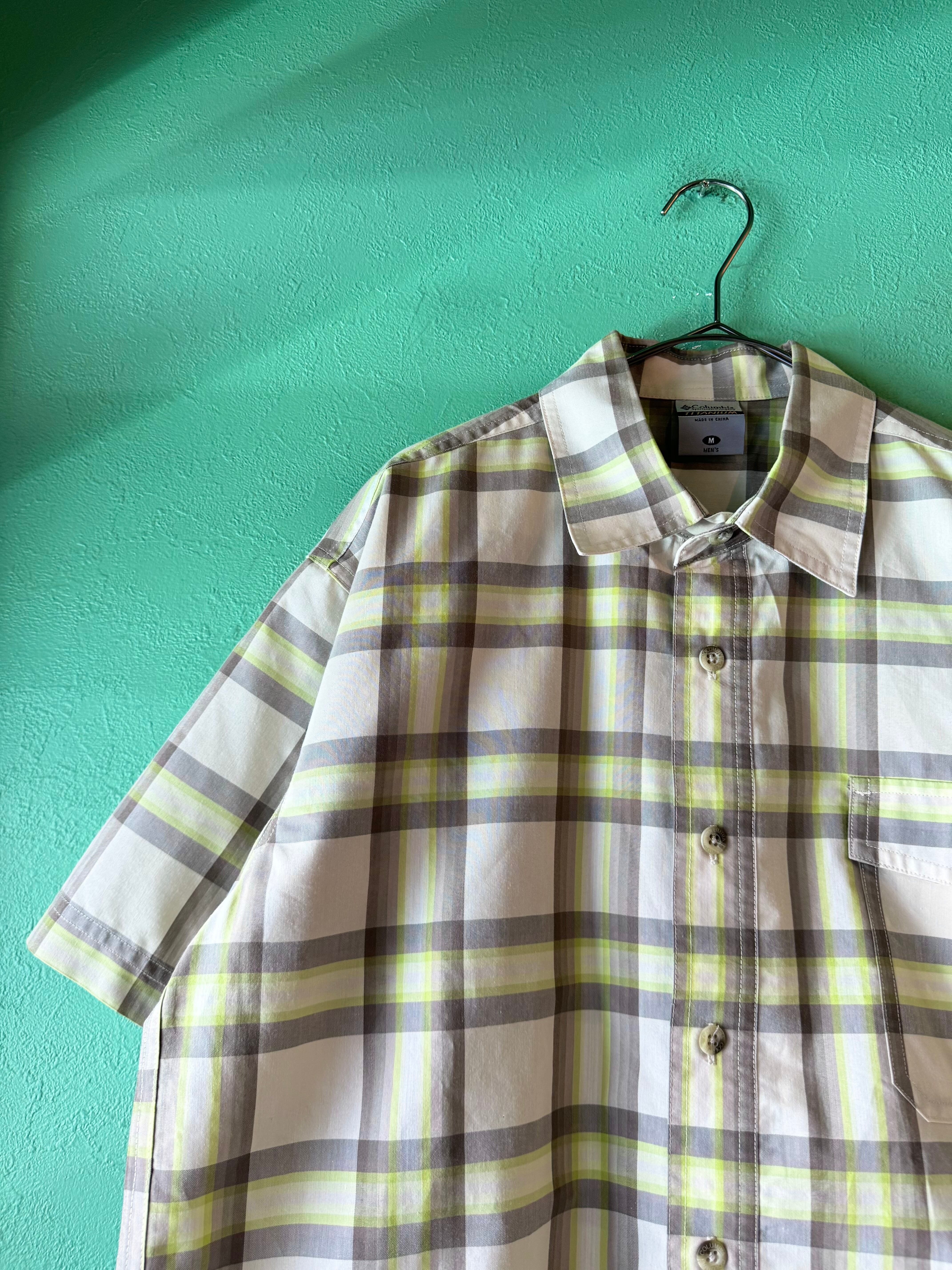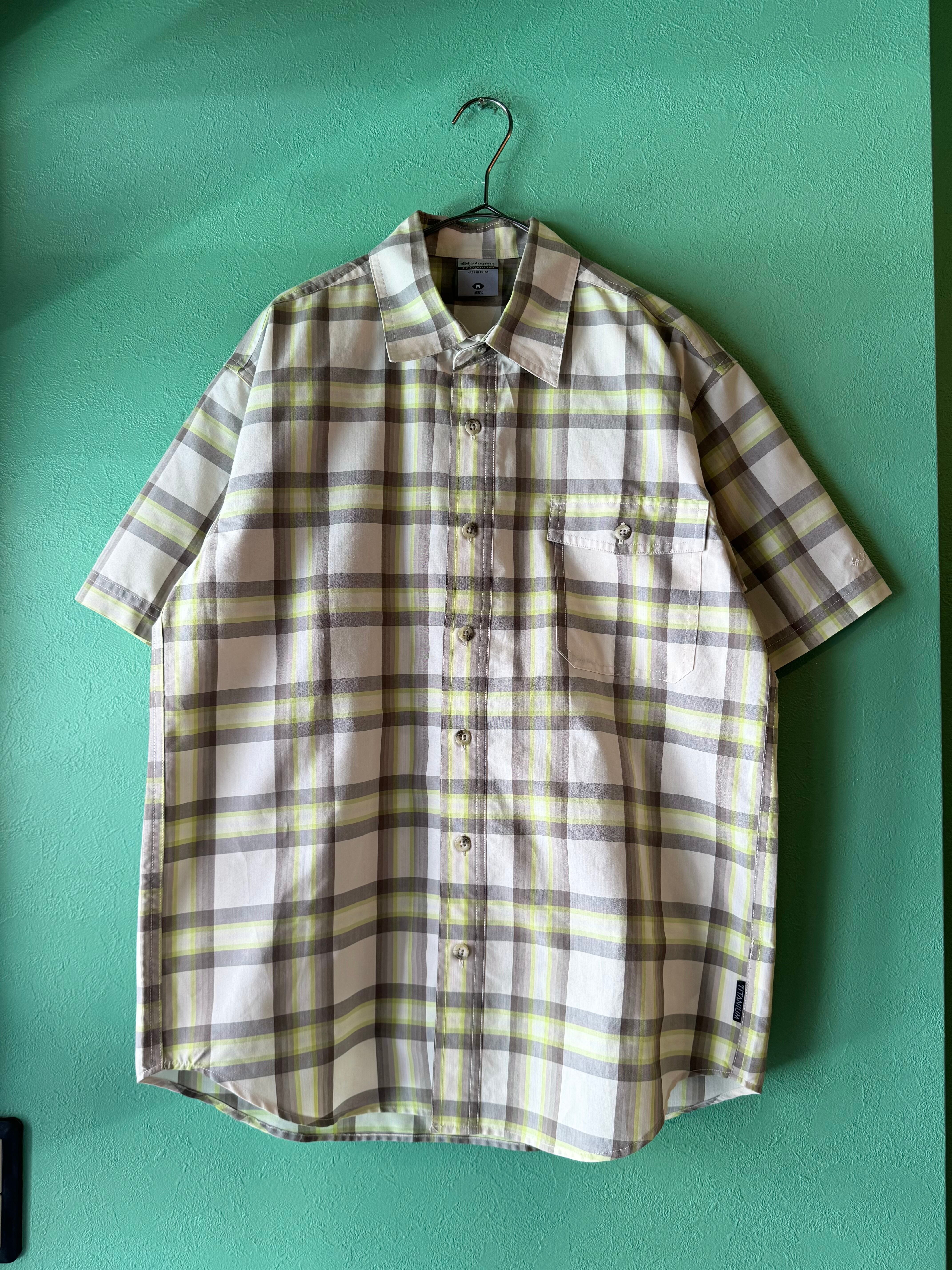 こちらはよく見ると淡いパープルからグラデーションでチャコールグレー、差し色としてライムグリーンの絶妙なカラーリングのチェックパターンの可愛い半袖シャツ。