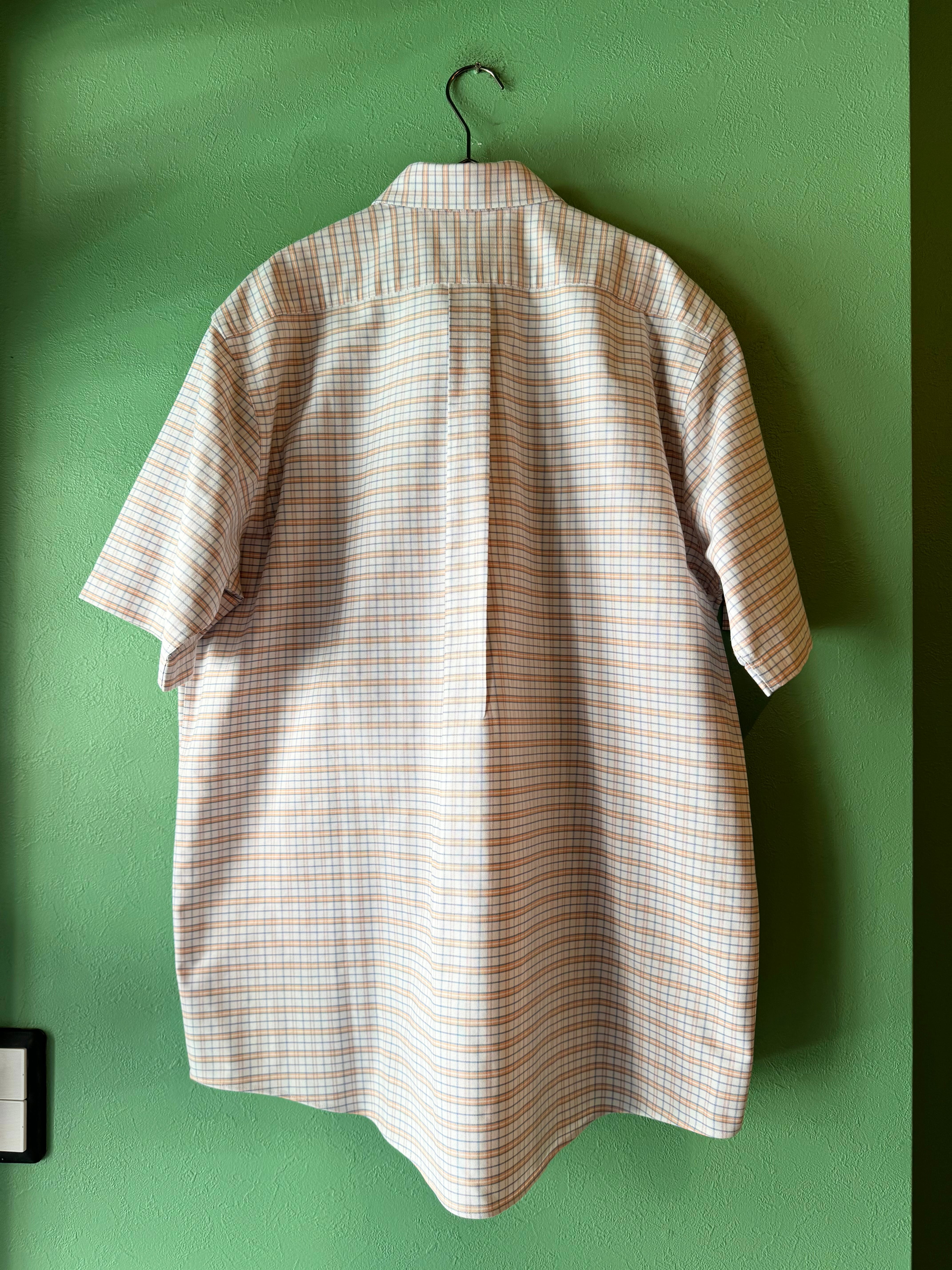 こちらはオフホワイトに近い淡いベージュをベースにオレンジ×ブルーのチェックパターンになった可愛らしい半袖シャツです。