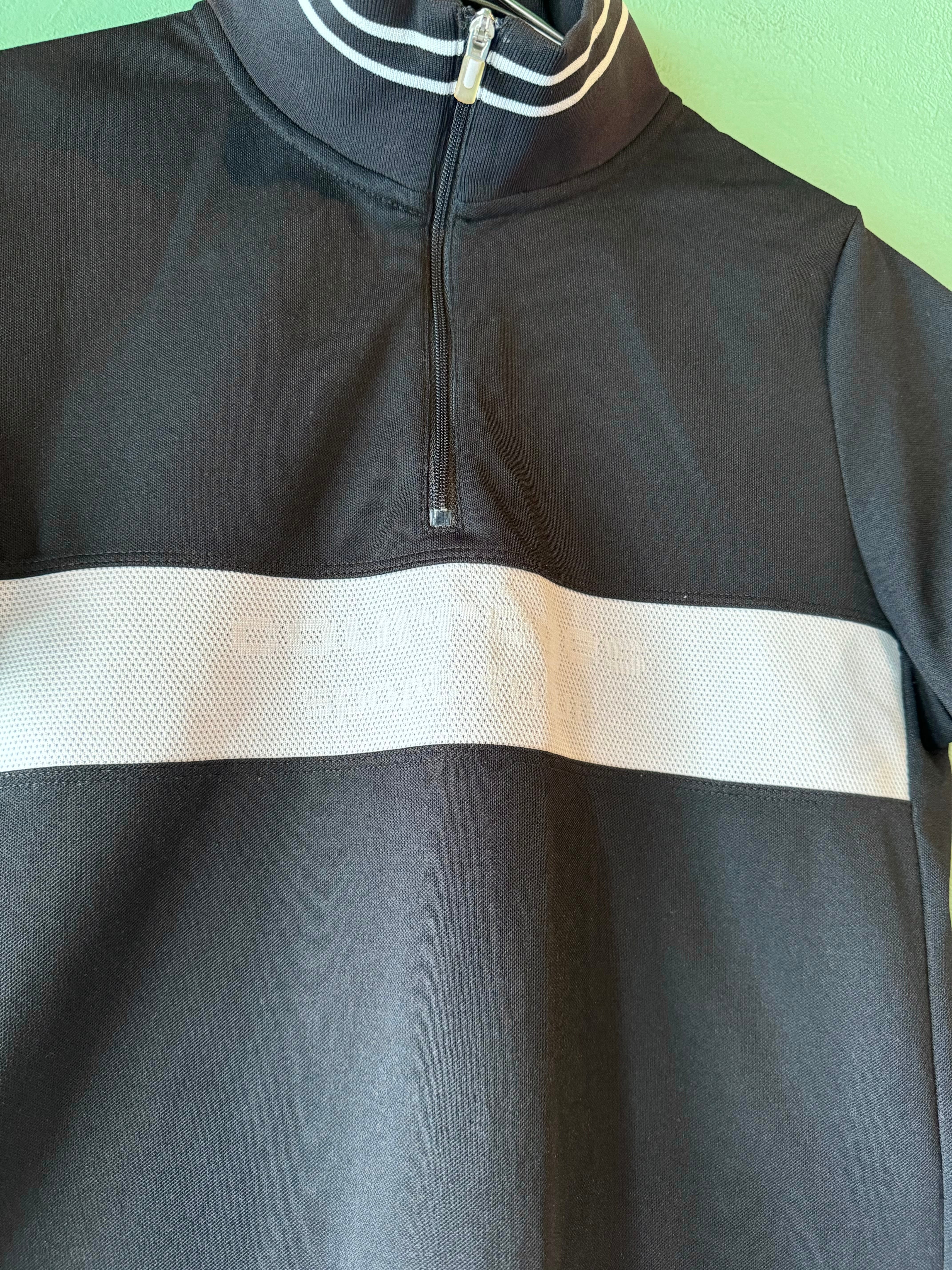 トラックジャケット風のハーフジップとフロントにはメッシュの切り替えでうっすらとブランドロゴが見えるスポーツライクなデザインになっています。