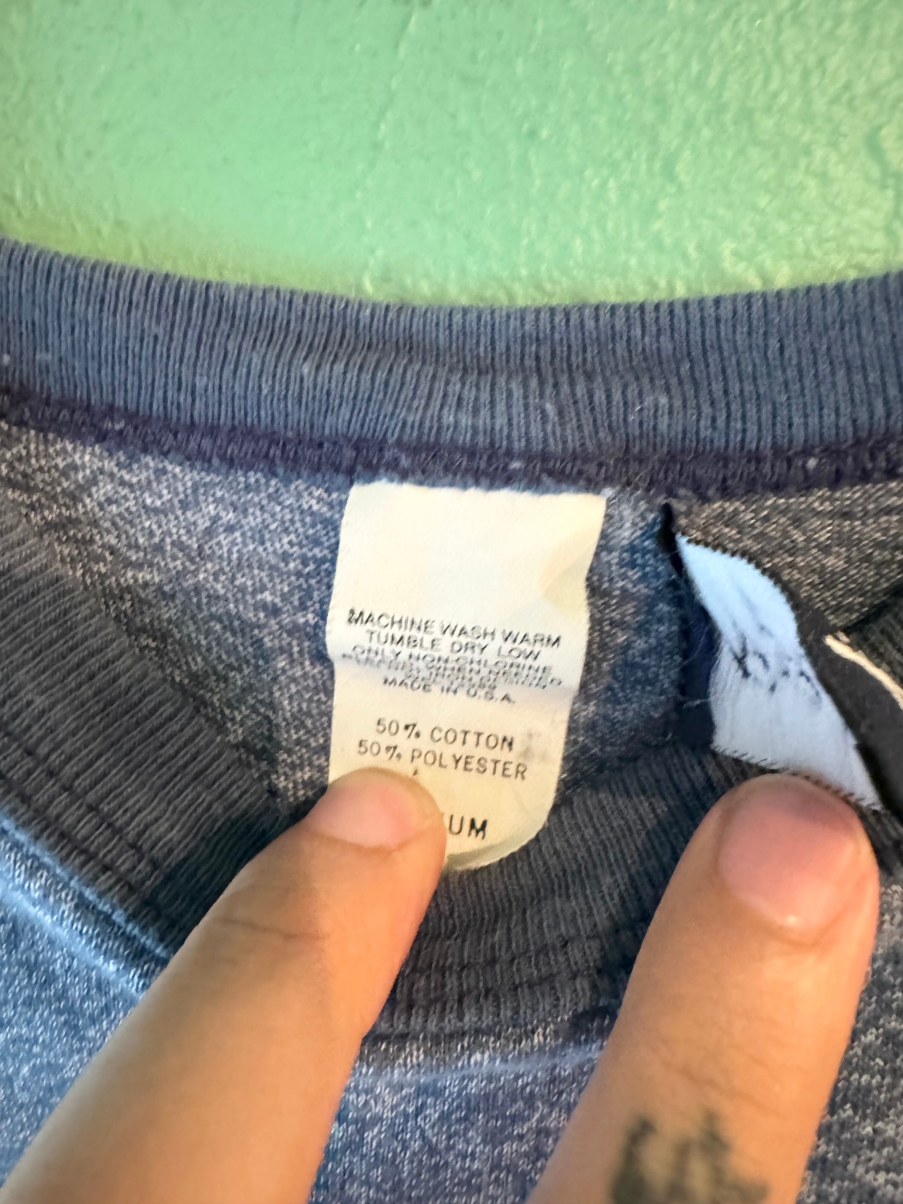 こちらはネイビー寄りのブルーカラーの霜降りボディーに同色のパイピングデザインのリンガーTシャツ。