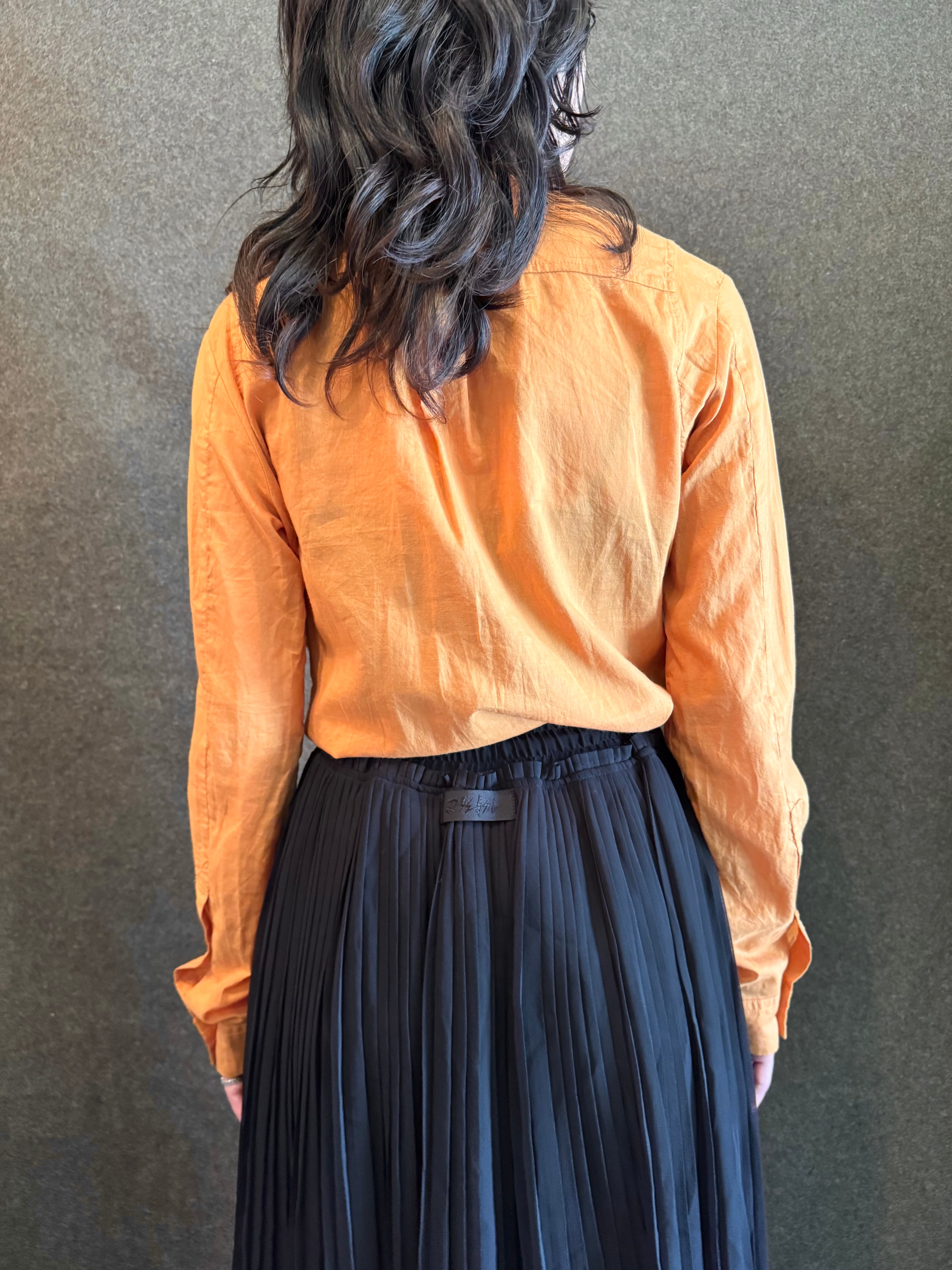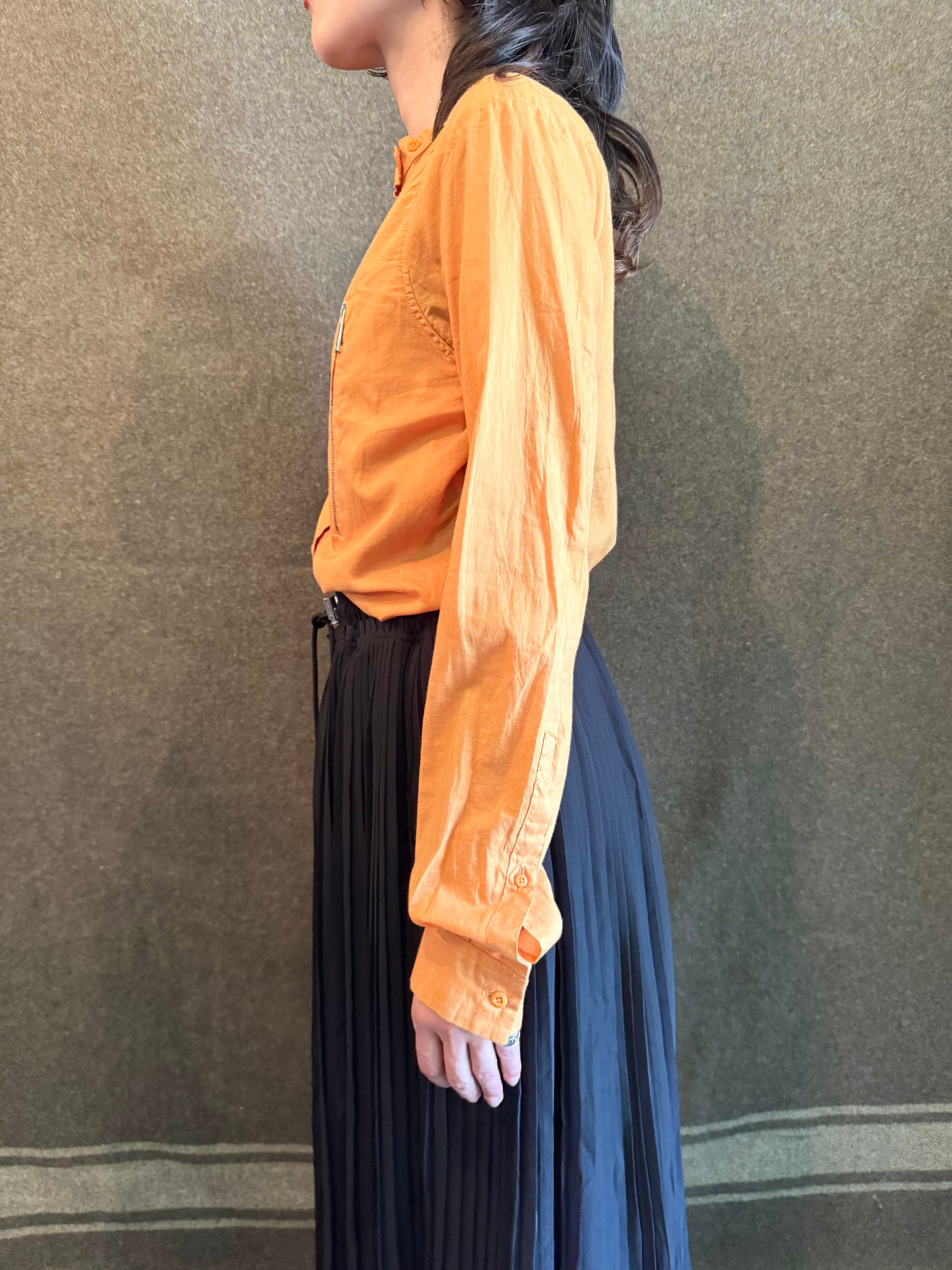 こちらはくすんだオレンジカラーに襟のないノーカラー、左胸に斜めについたジップがアクセントになっています。
