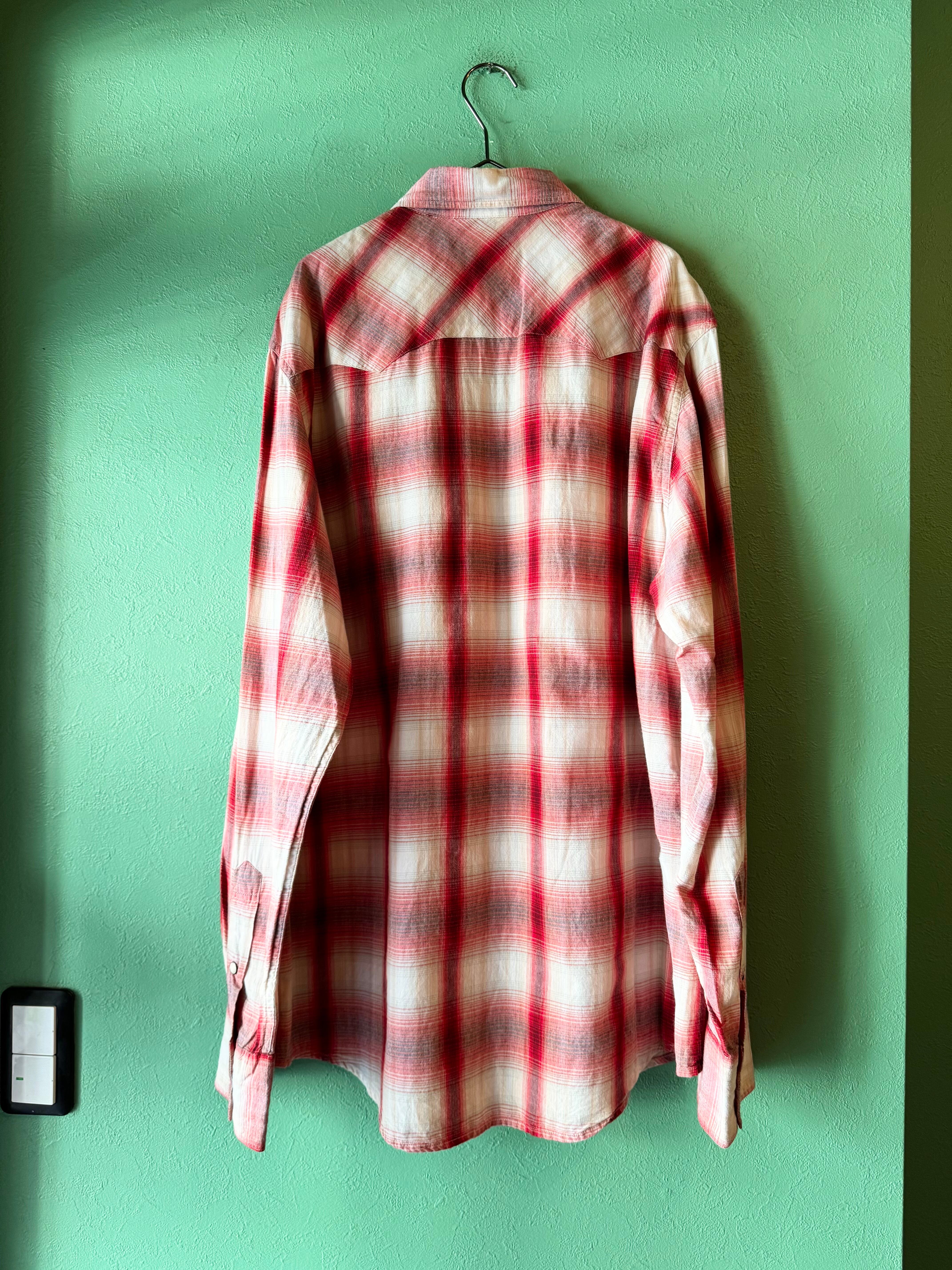 レッド×ホワイト×ブラックのチェックパターンになっており、スナップボタンを使用したウエスタンシャツディテールのシャツです。