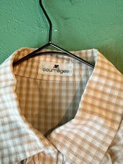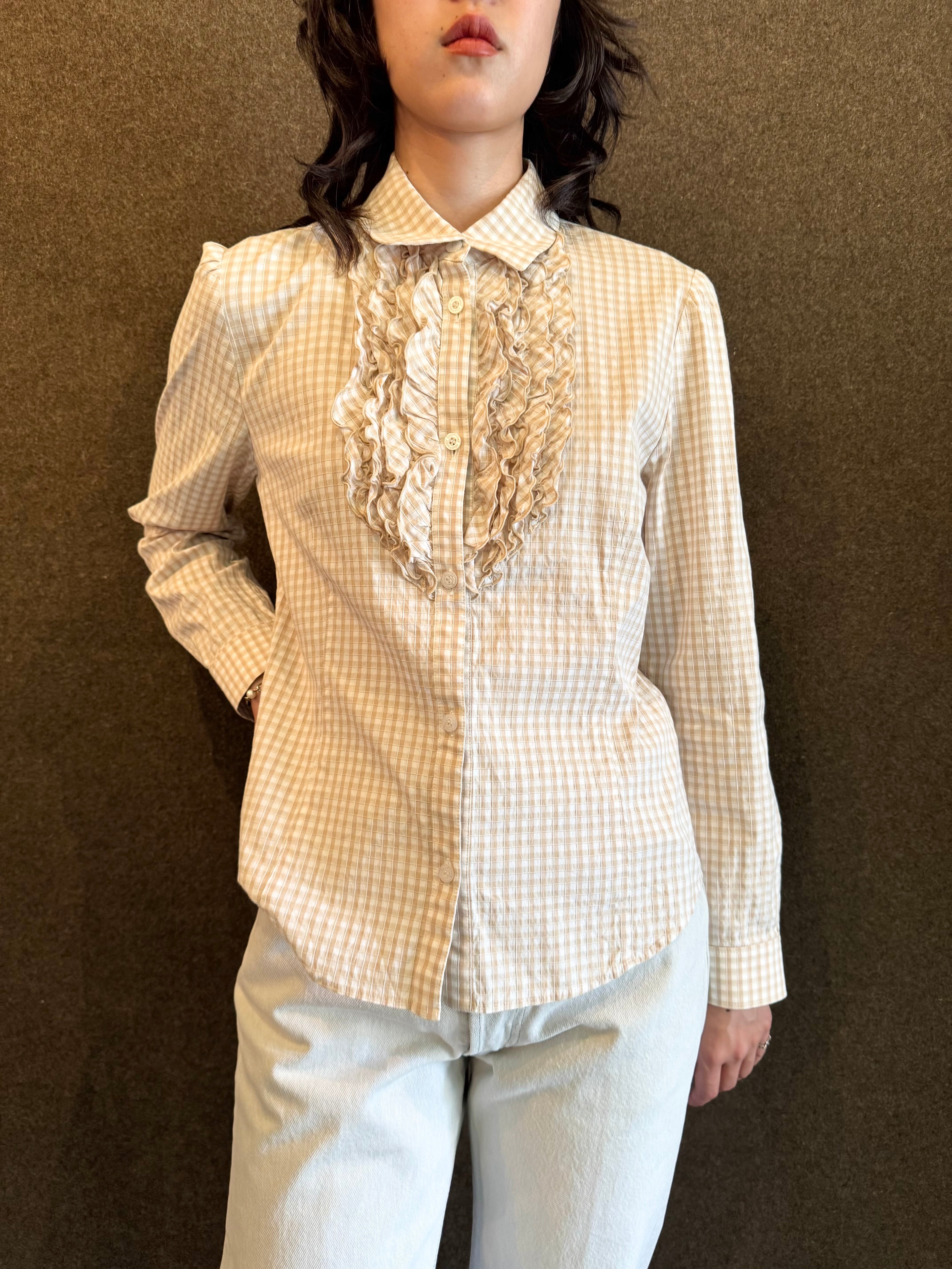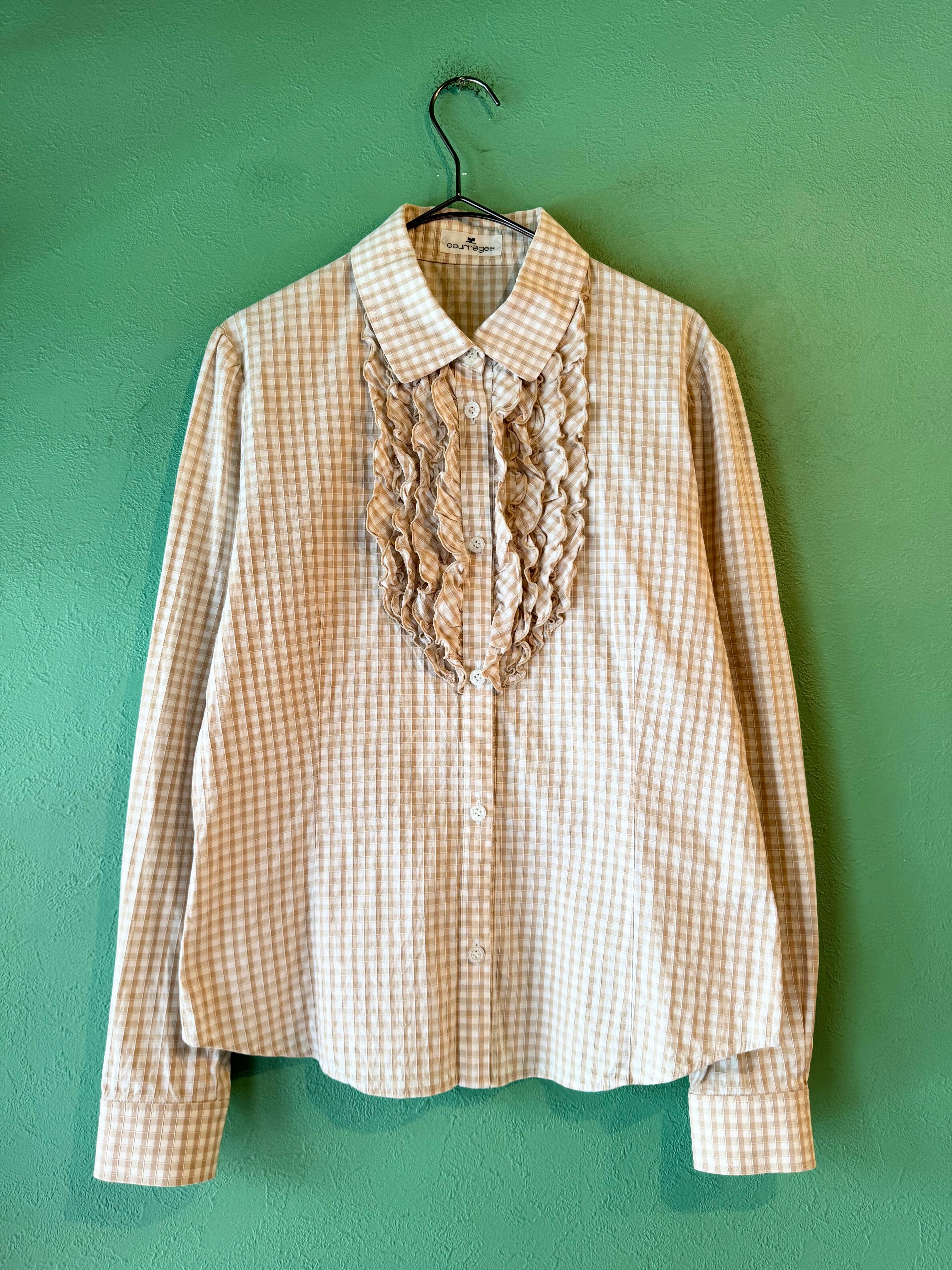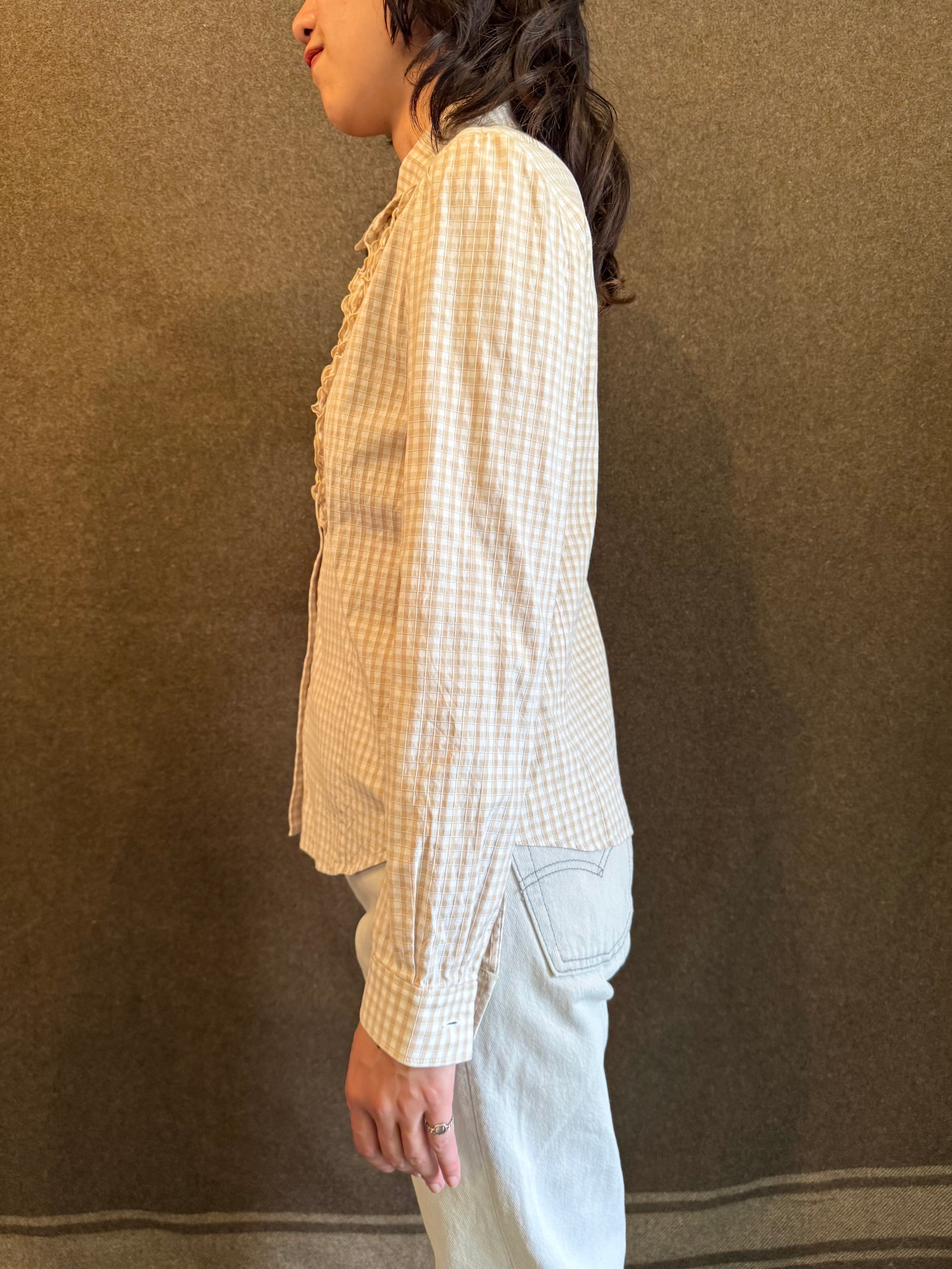 フォーマルなイメージのブザムシャツですがオフホワイト×ベージュの可愛らしいチェックパターンによることでカジュアルにも着やすくなっています。