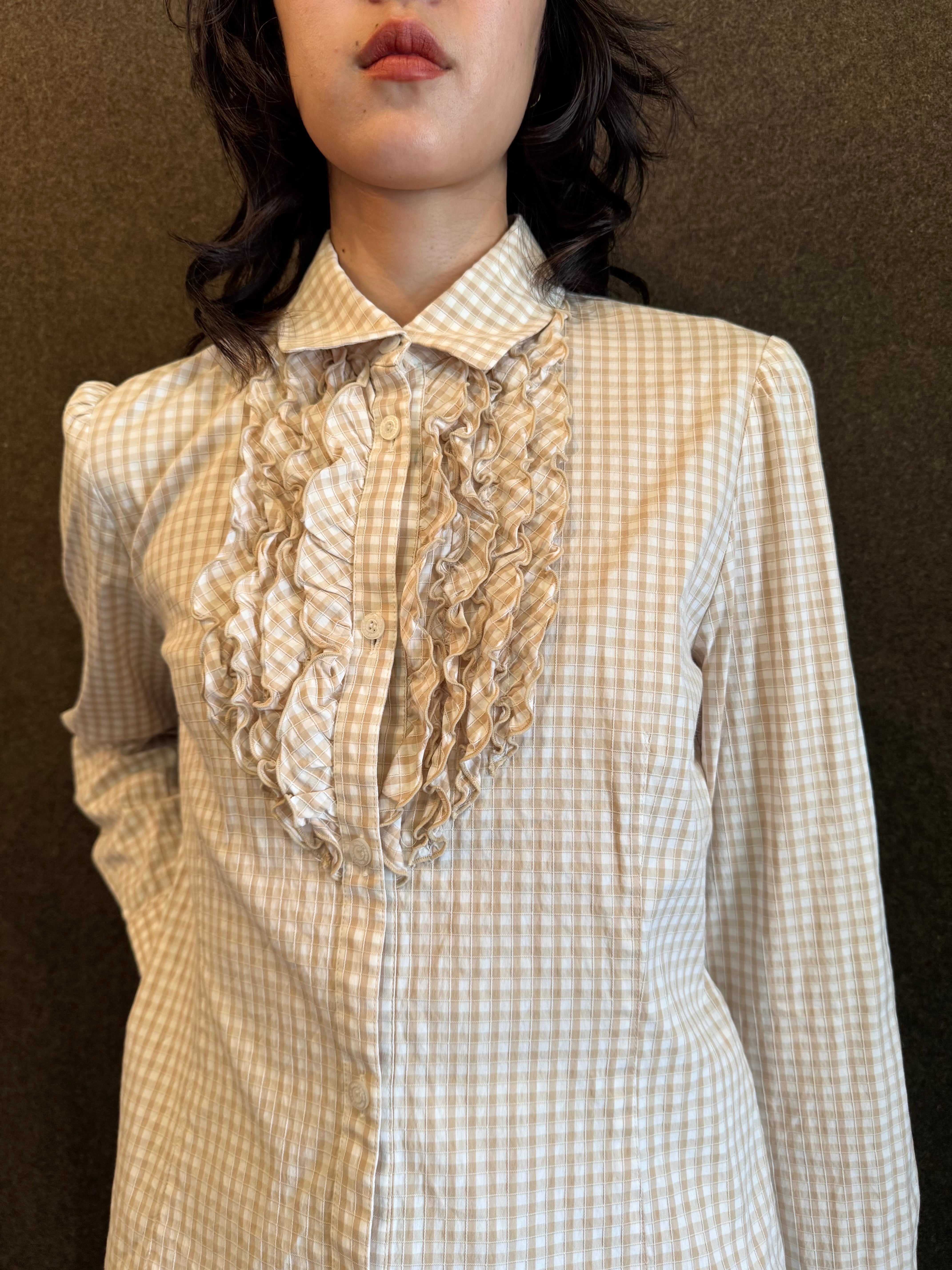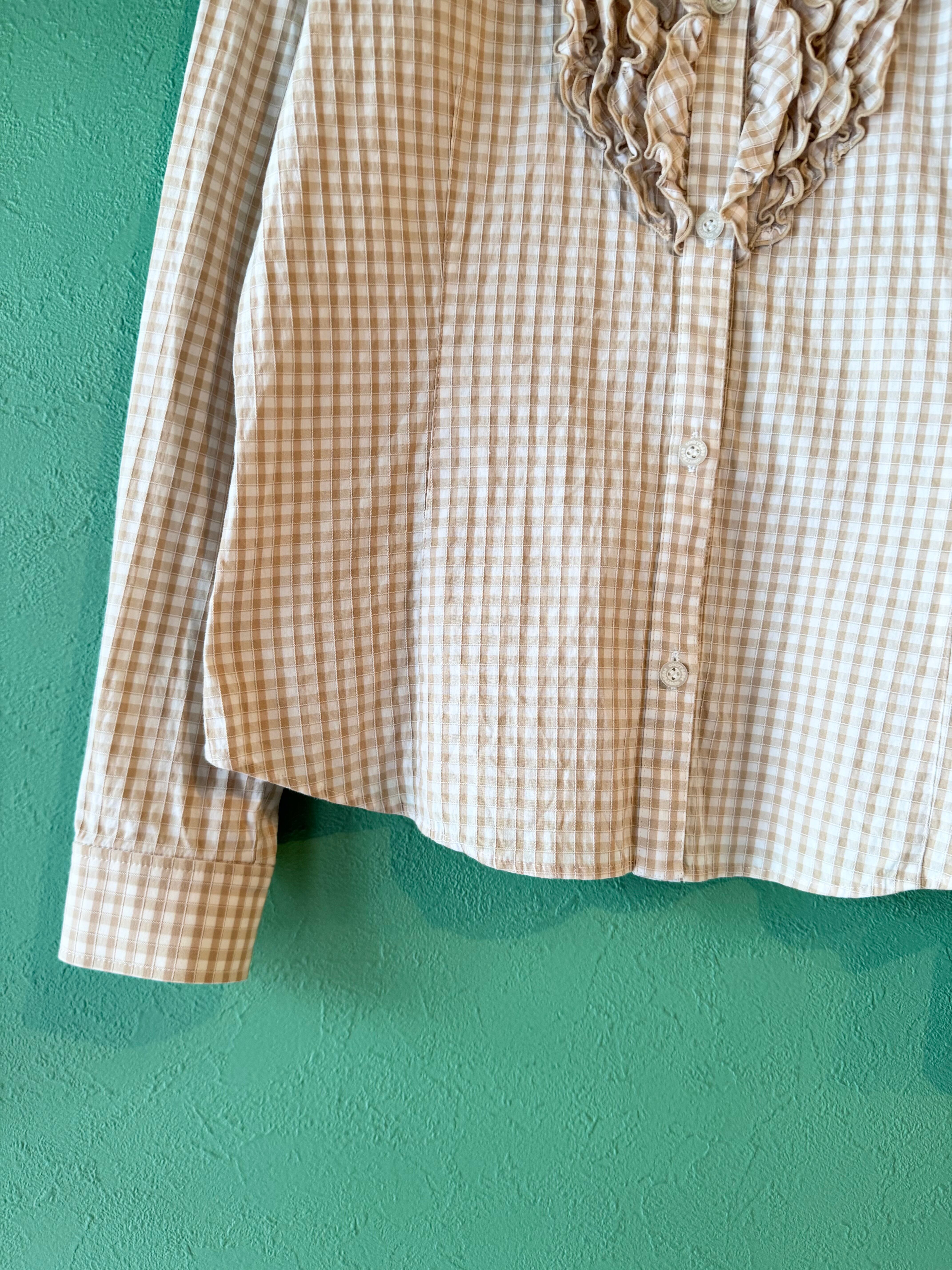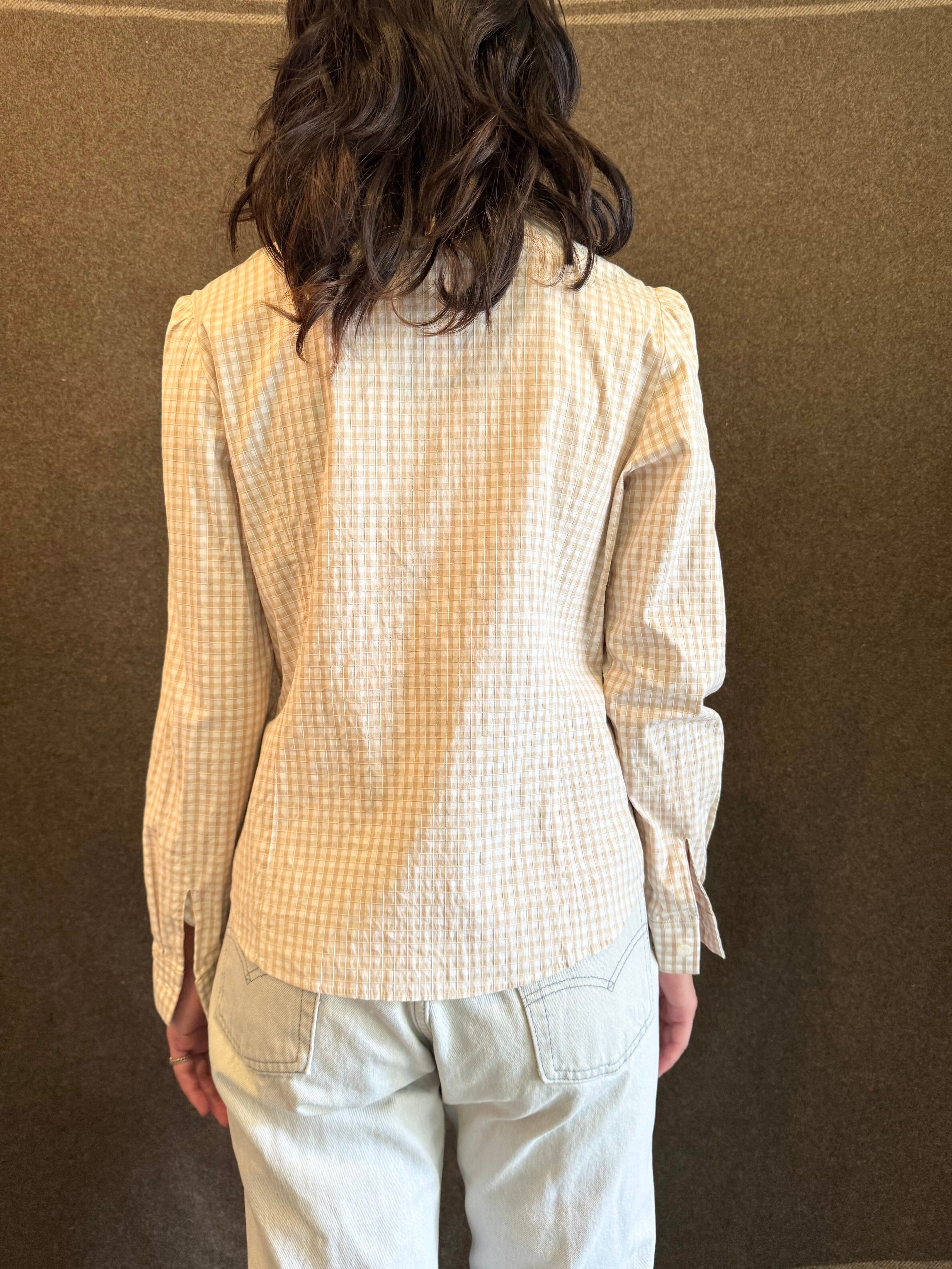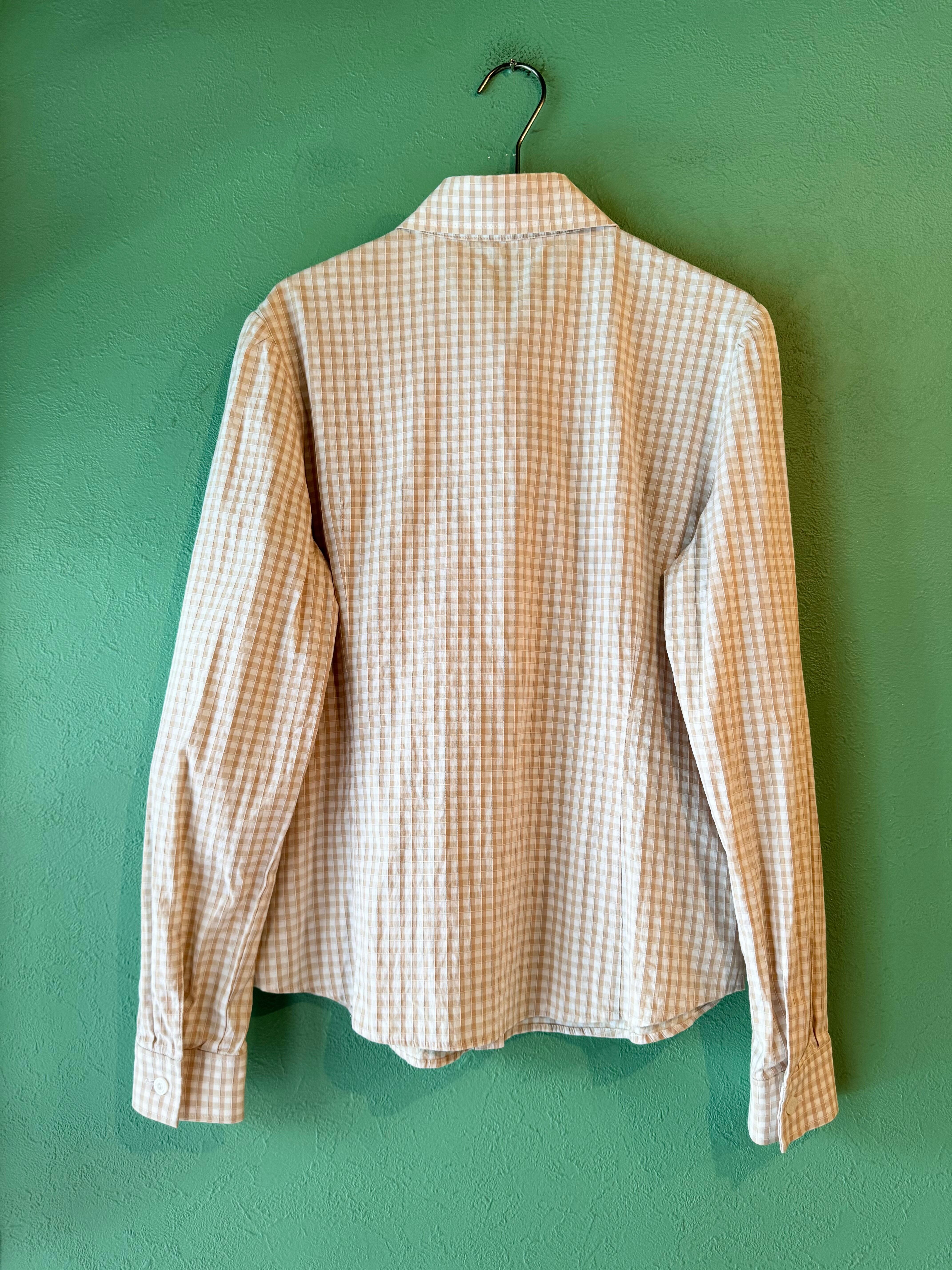 フォーマルなイメージのブザムシャツですがオフホワイト×ベージュの可愛らしいチェックパターンによることでカジュアルにも着やすくなっています。