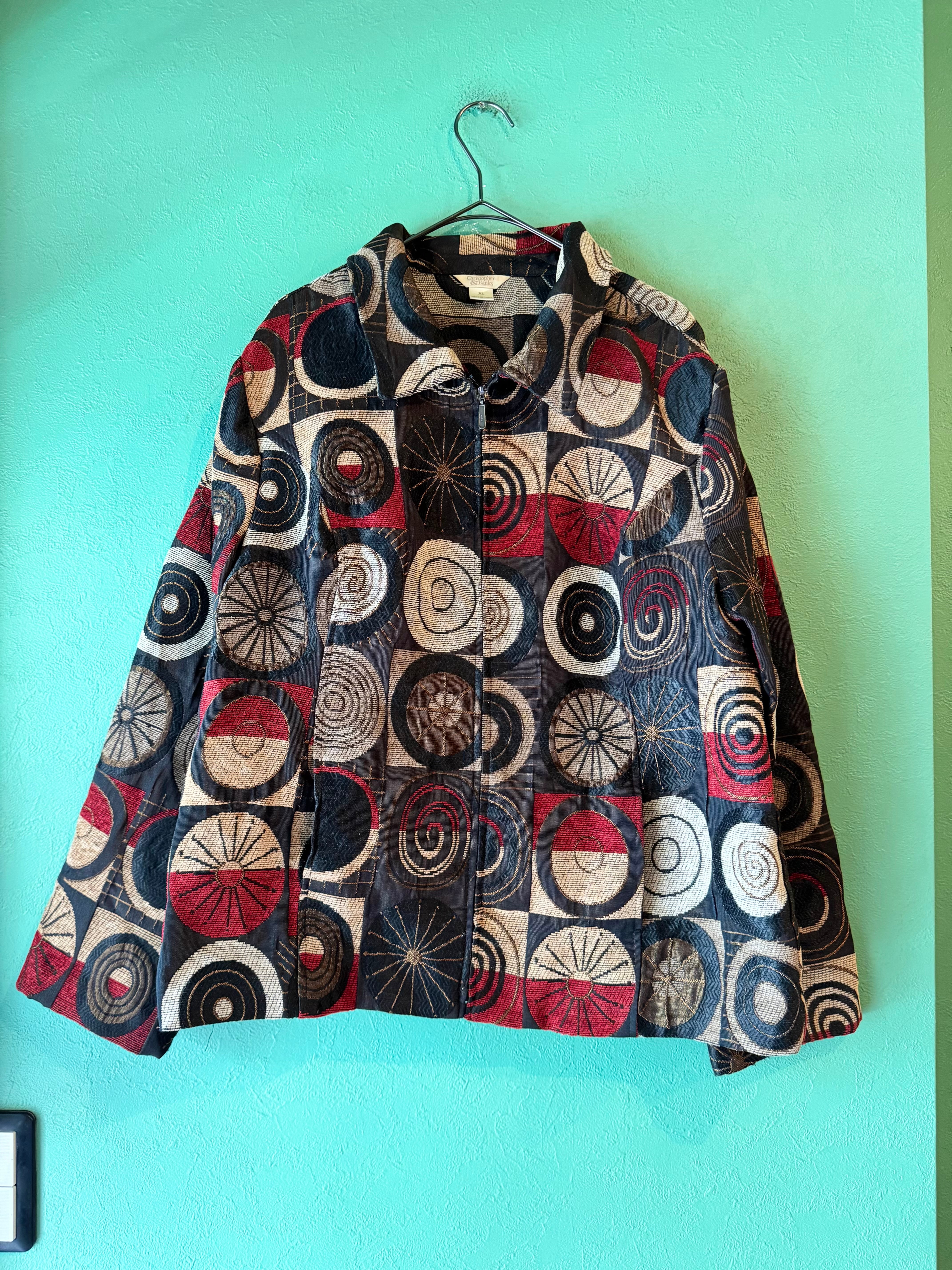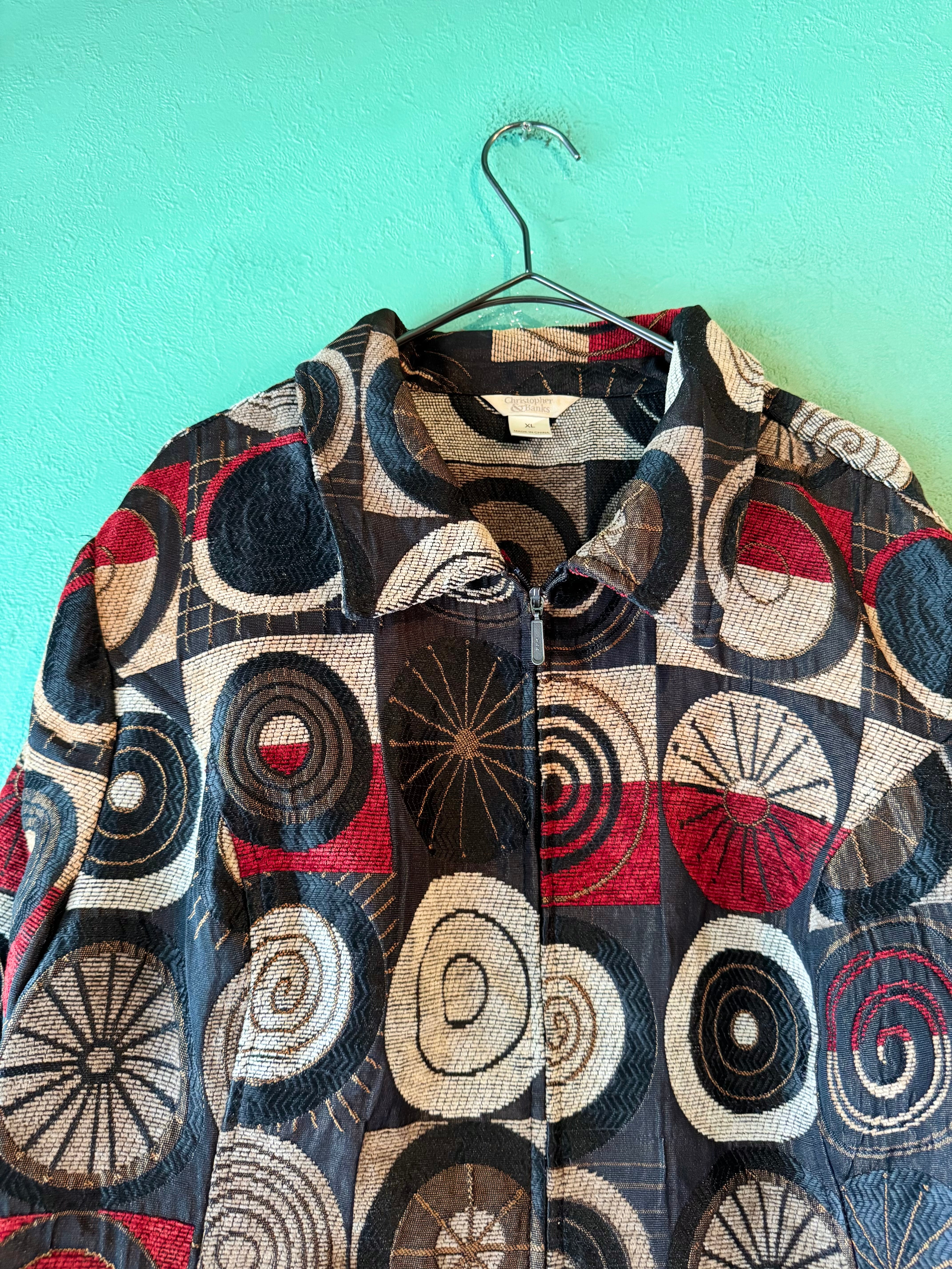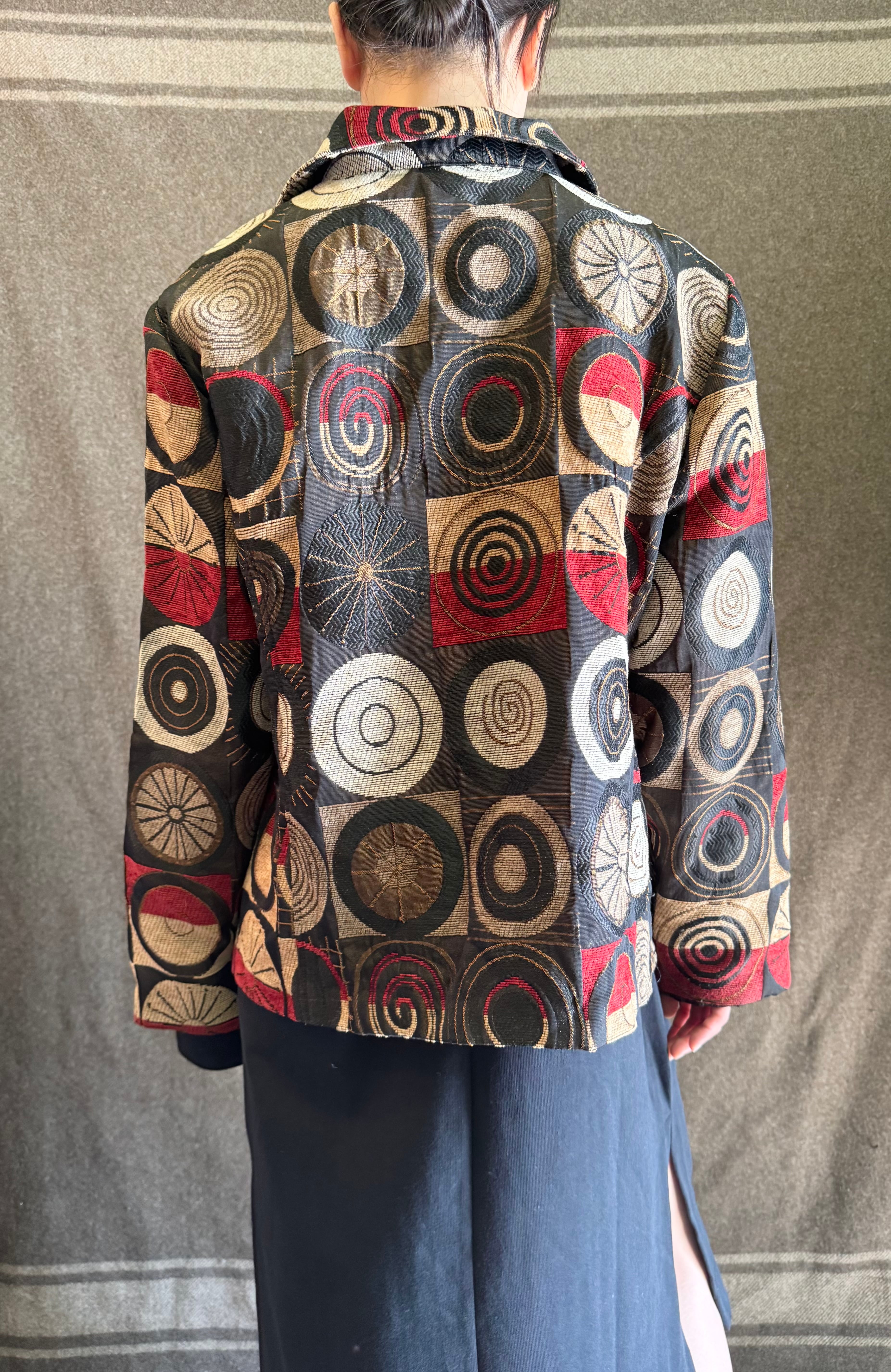 独特なサークル模様が目を引くヴィンテージならではのアイテムで、色味は落ち着いているもののインパクトのある1着かと思います。