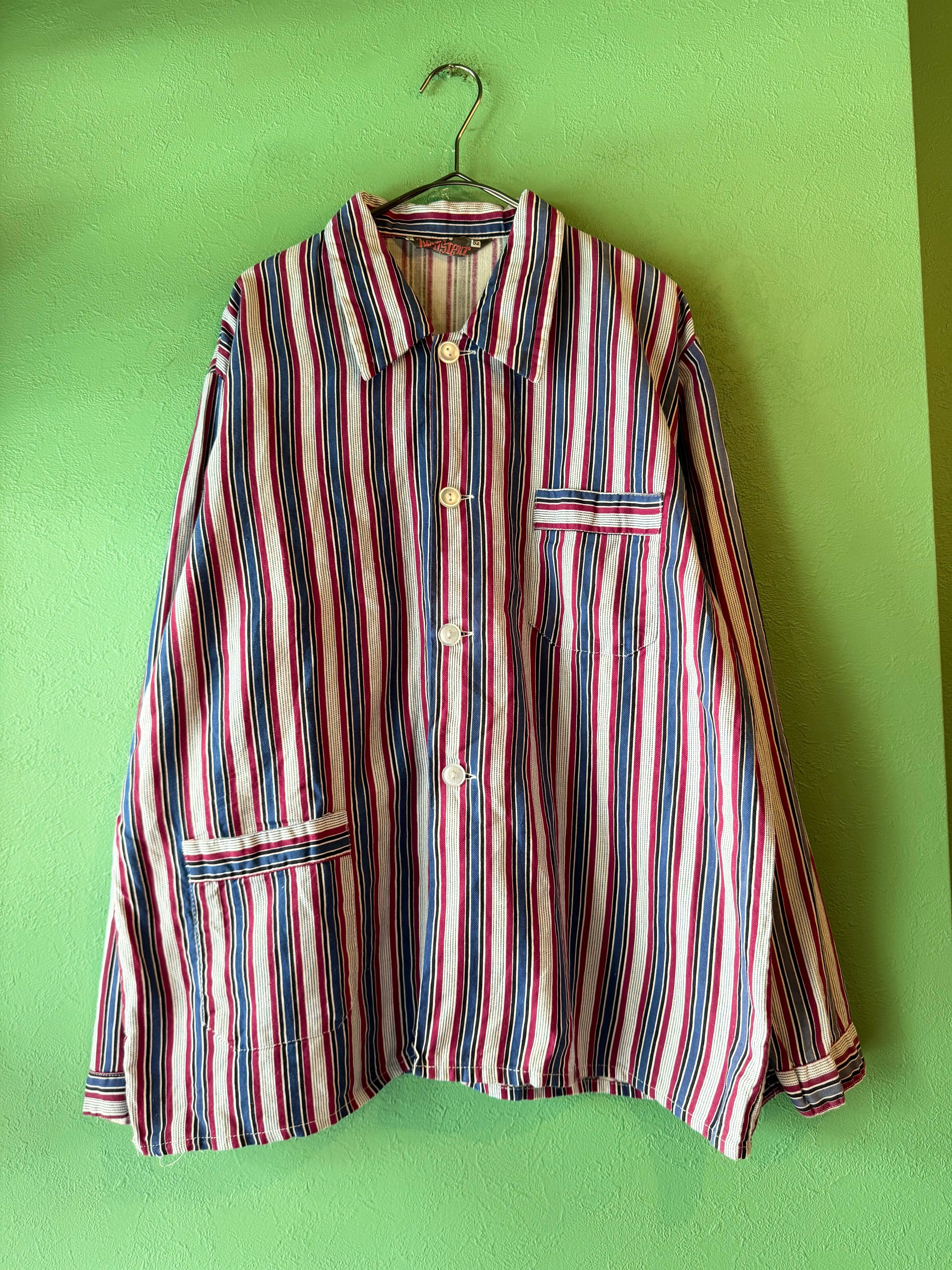 こちらトリコロール調のくすんだカラーリングのストライプパターンシャツ。