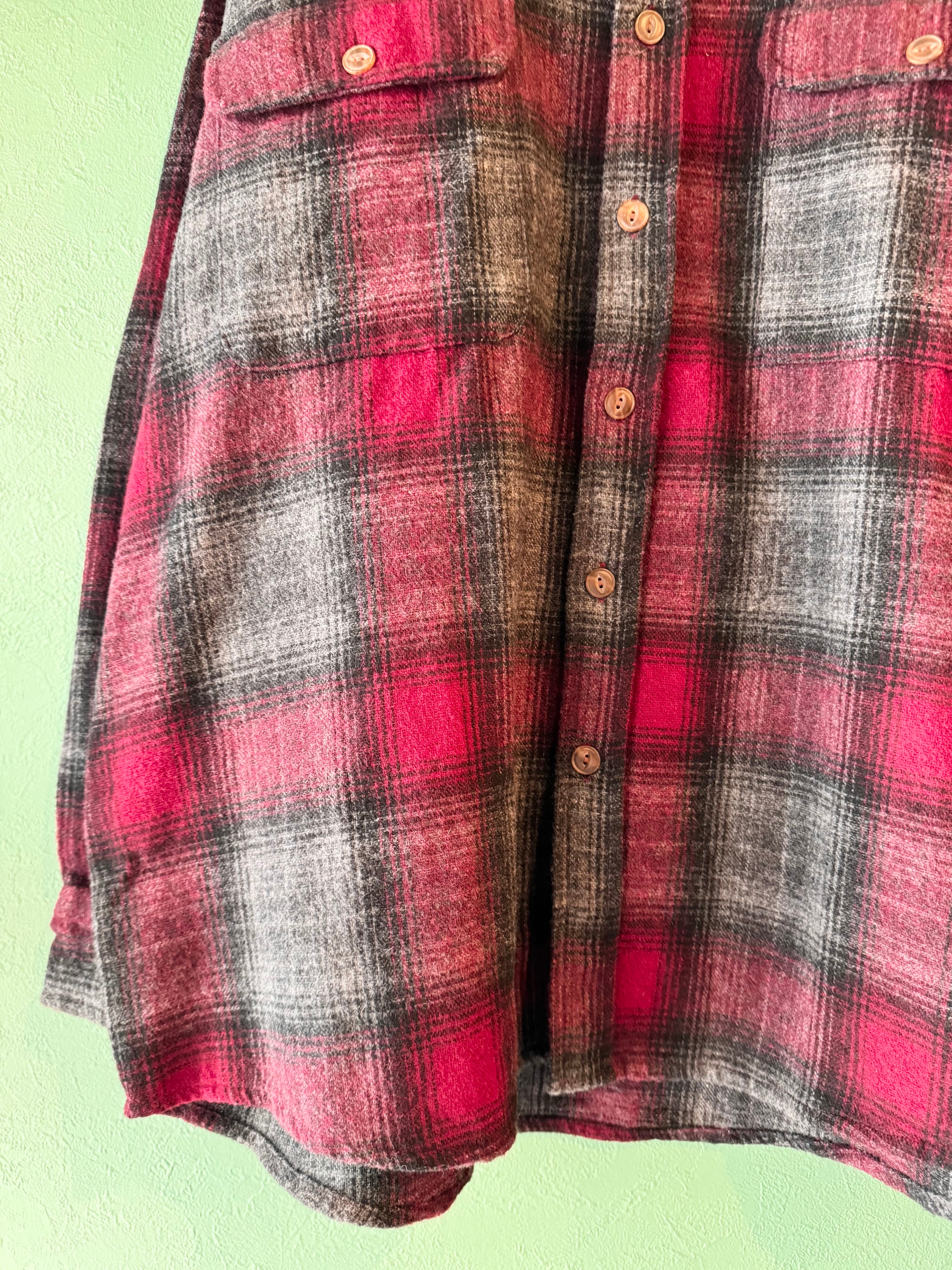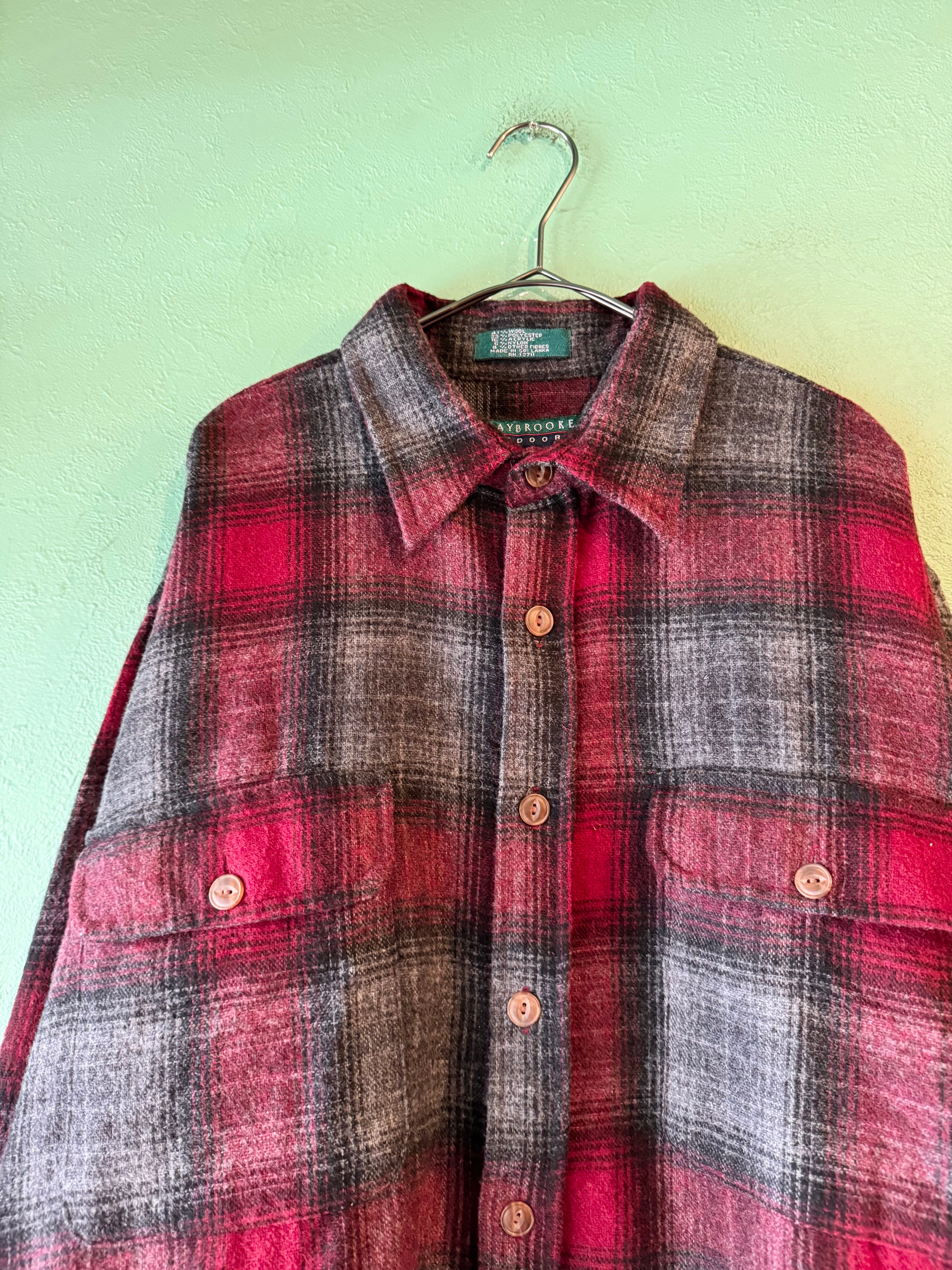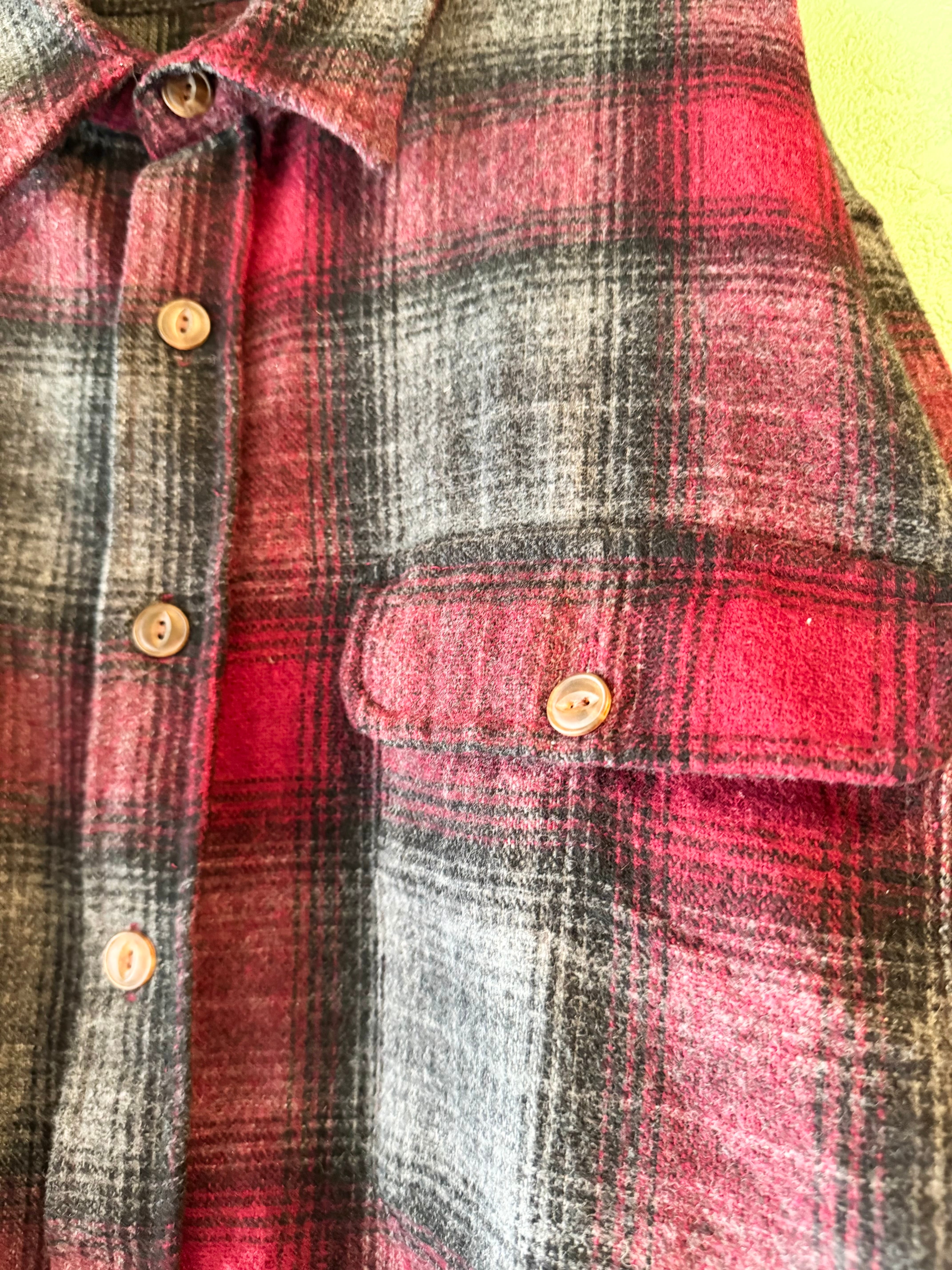 レッド×グレーを基調としたカラーリングのチェックパターンに両胸のフラップポケット、猫目ボタンを使用したヴィンテージライクな細かいデザインも古着好きにはたまらないポイントかと思います。