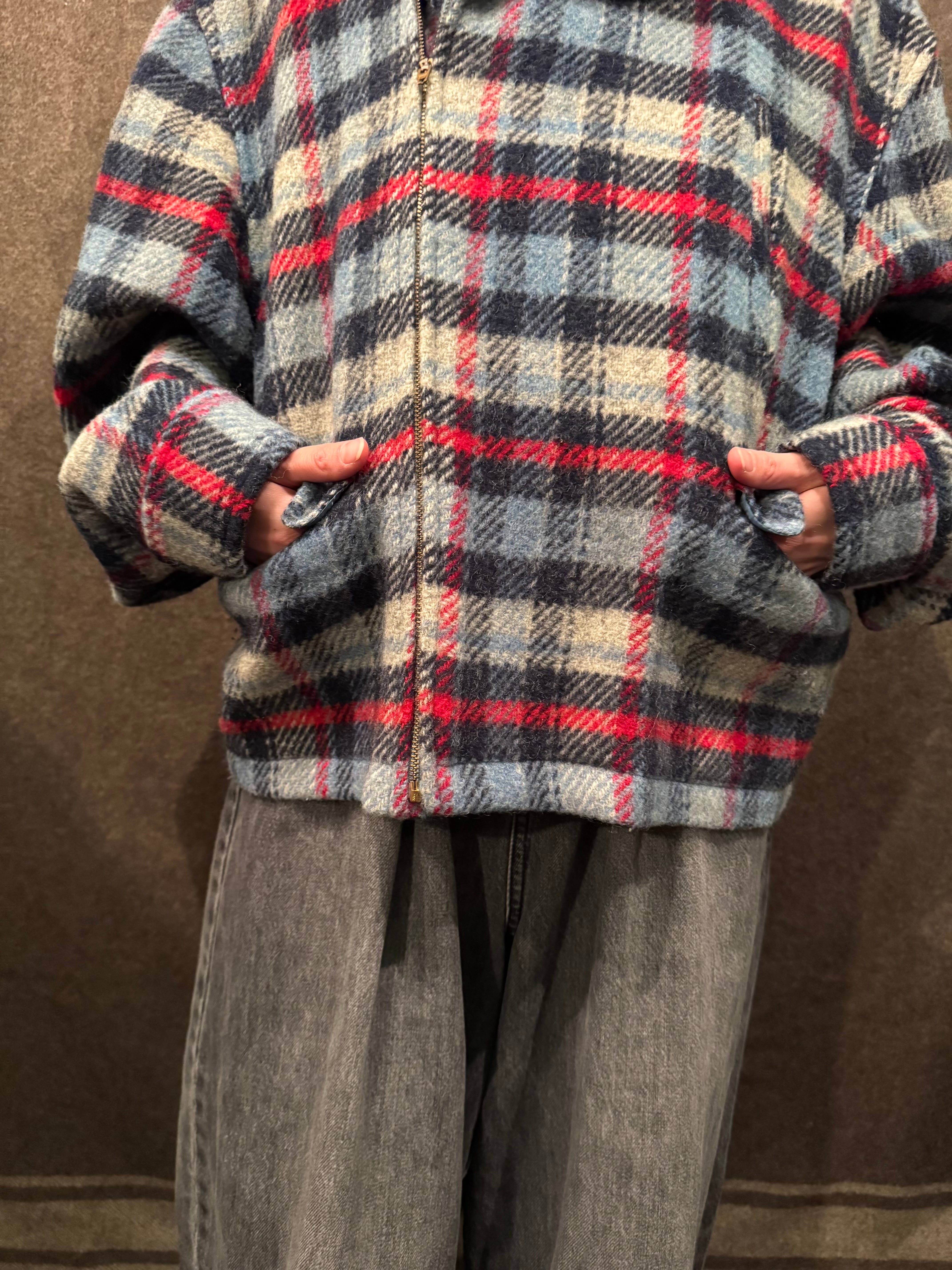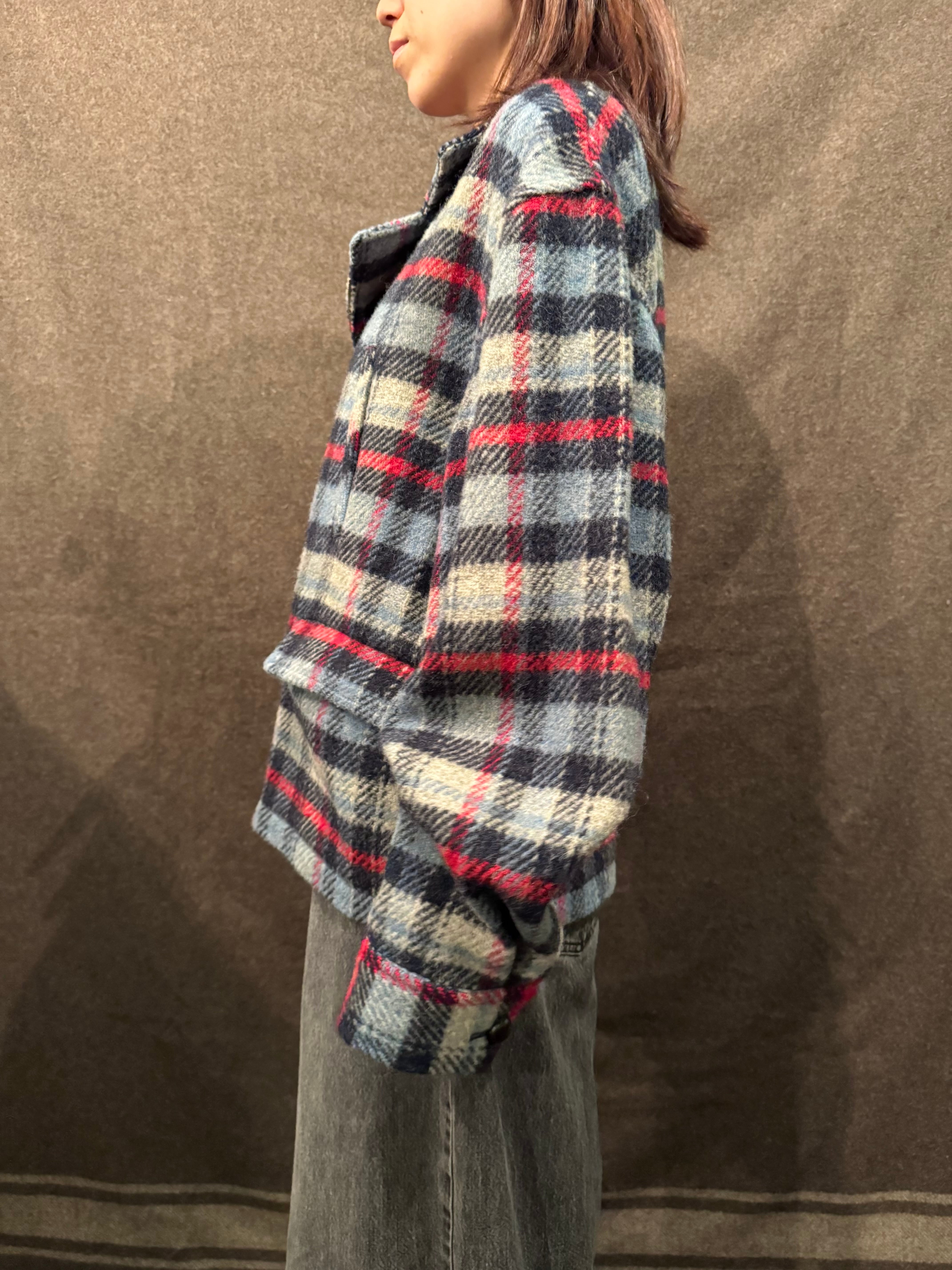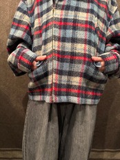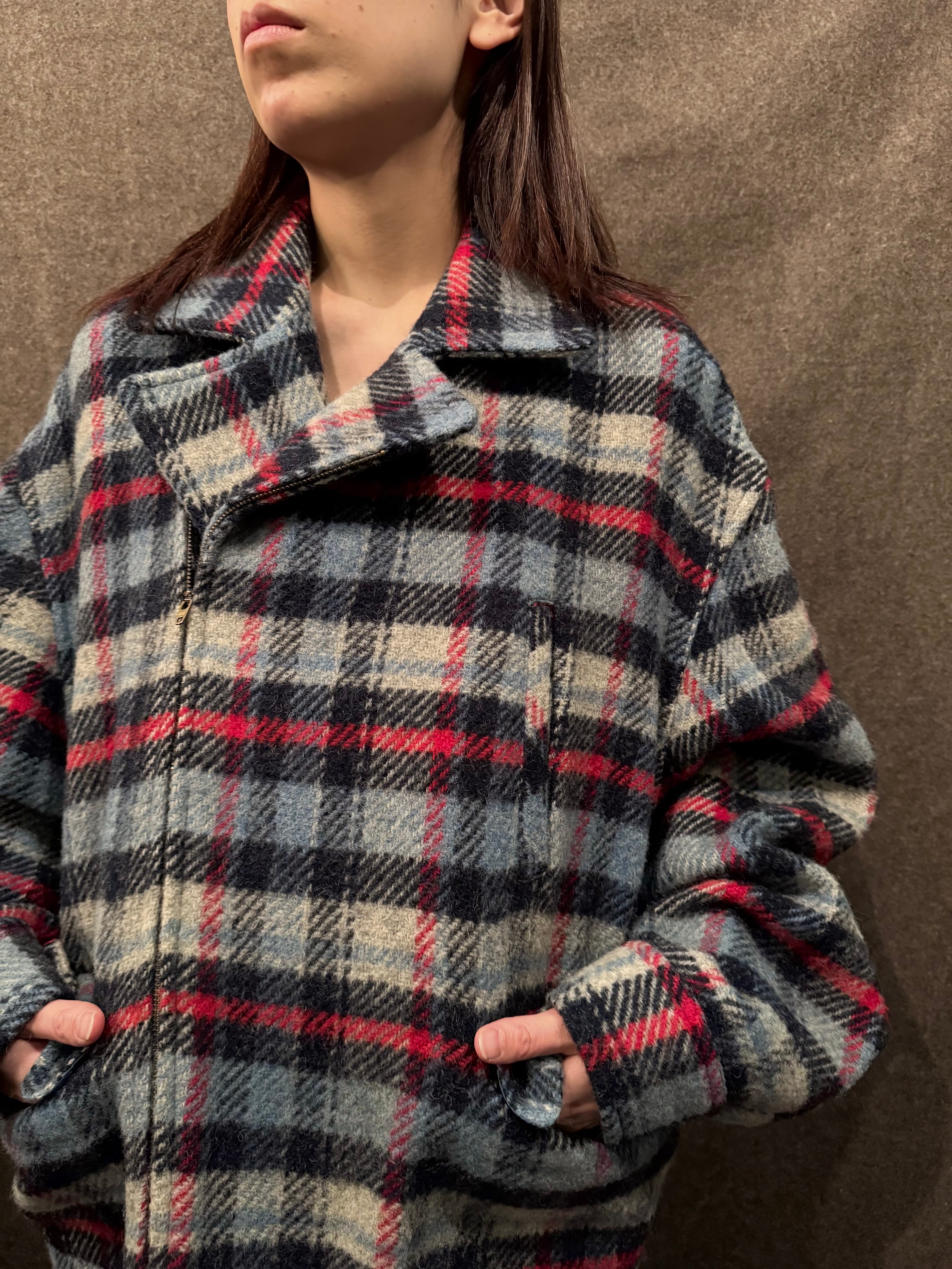 こちらはまるでダブルのライダースジャケットのようなディテールのチェックジャケット。
