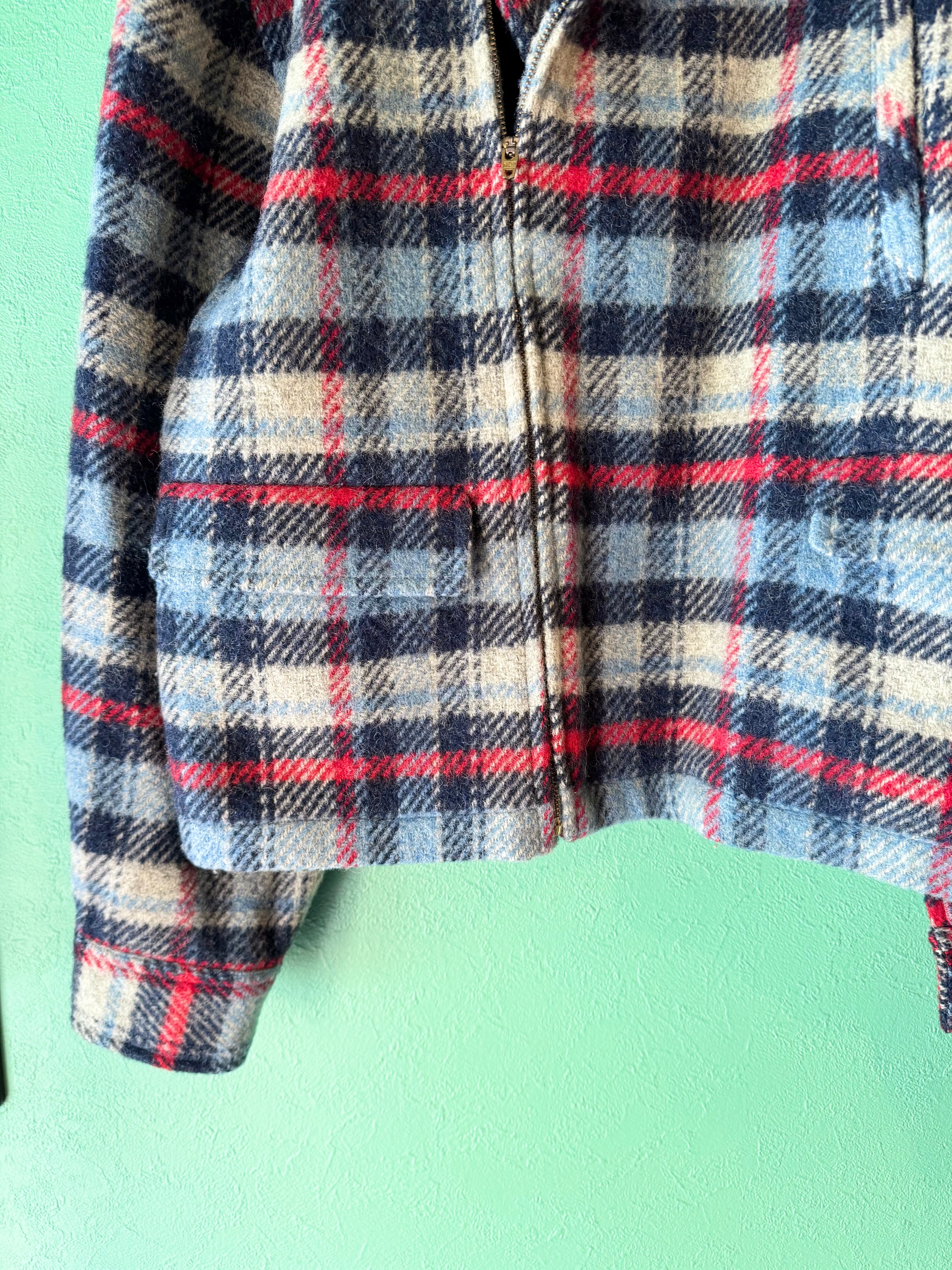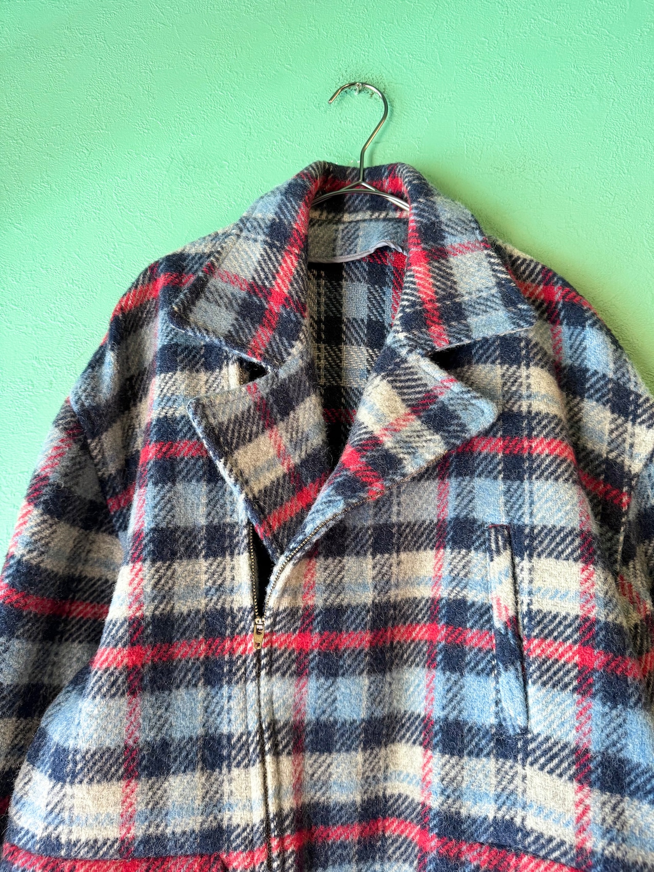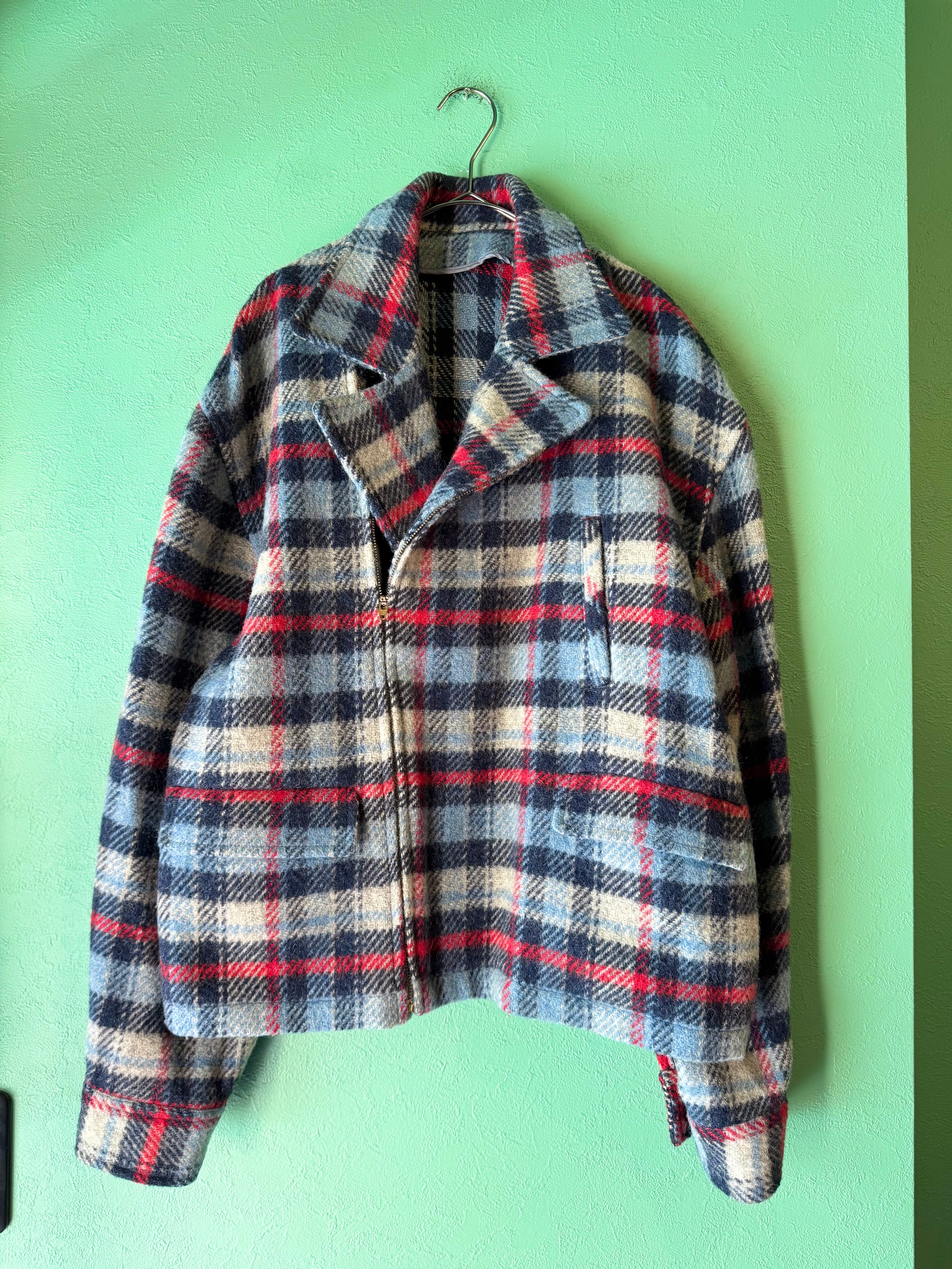 こちらはまるでダブルのライダースジャケットのようなディテールのチェックジャケット。