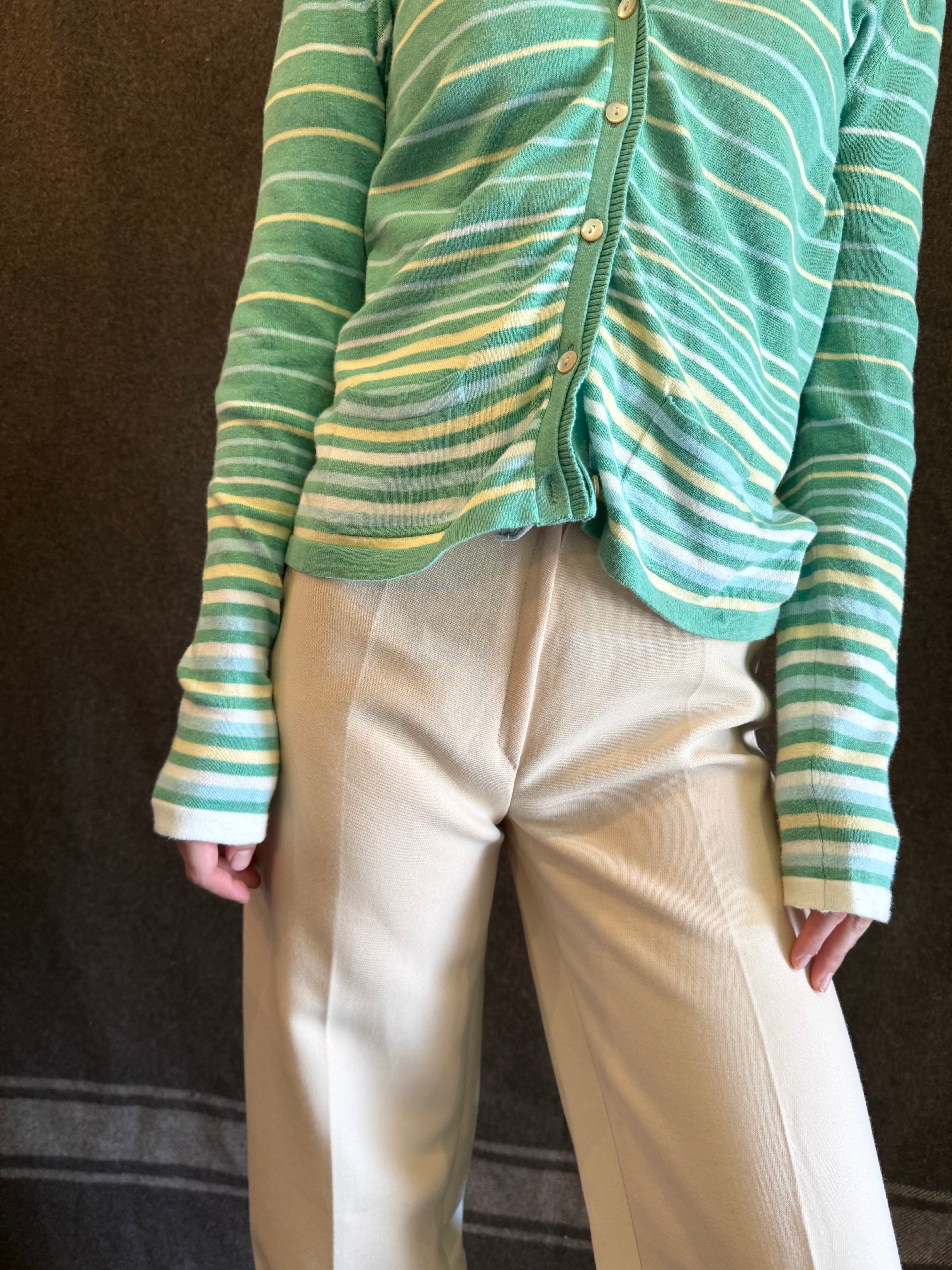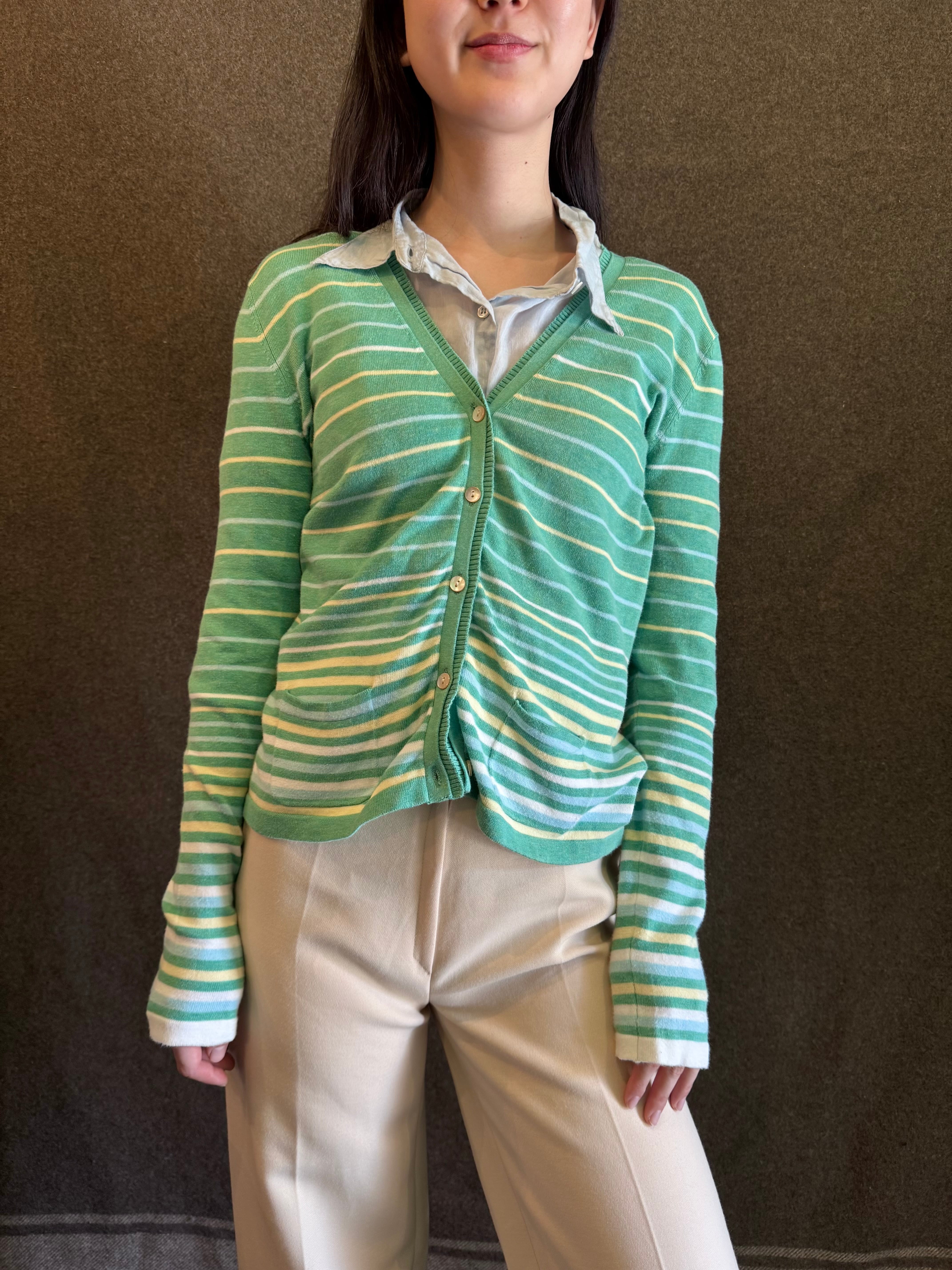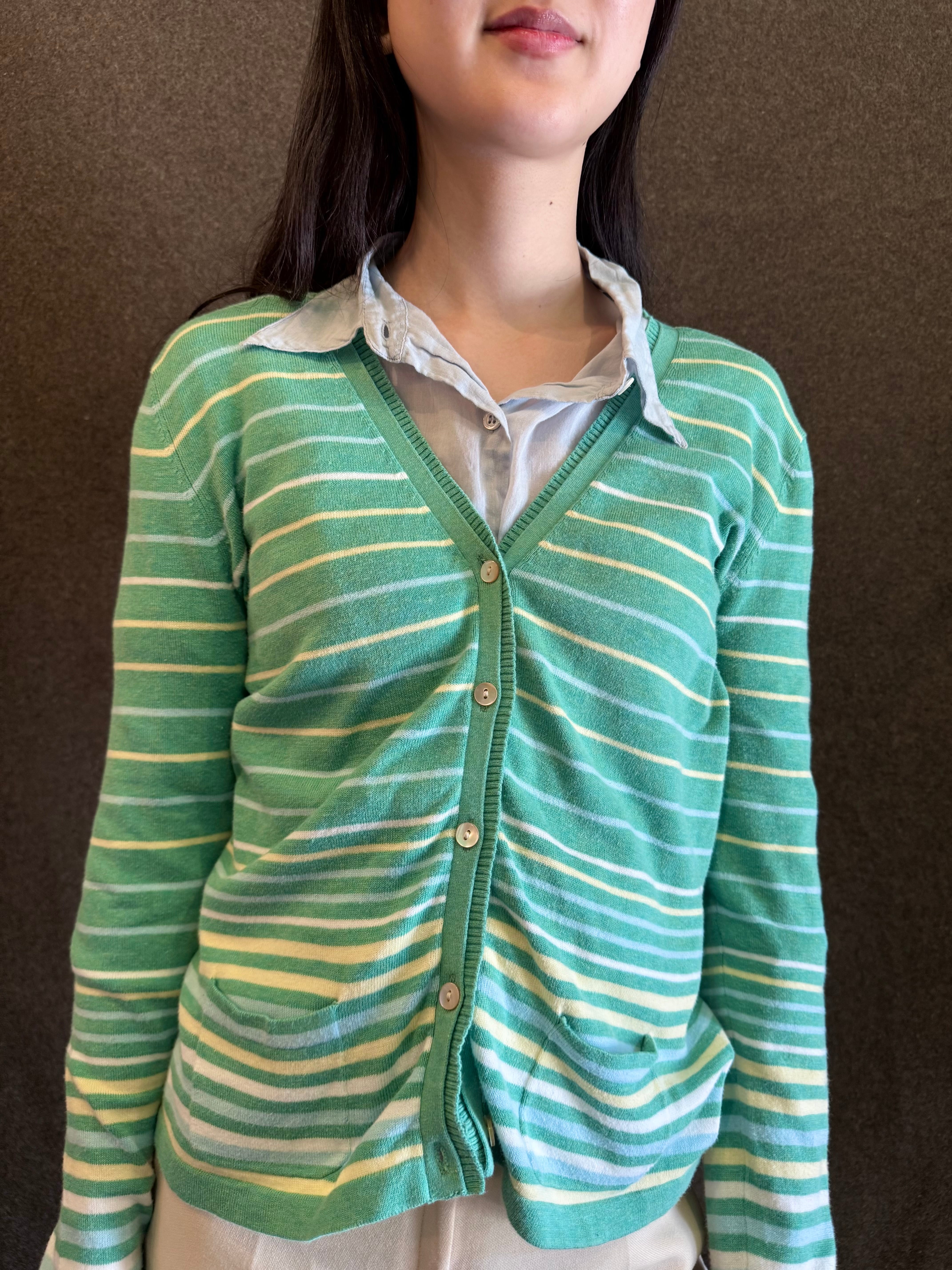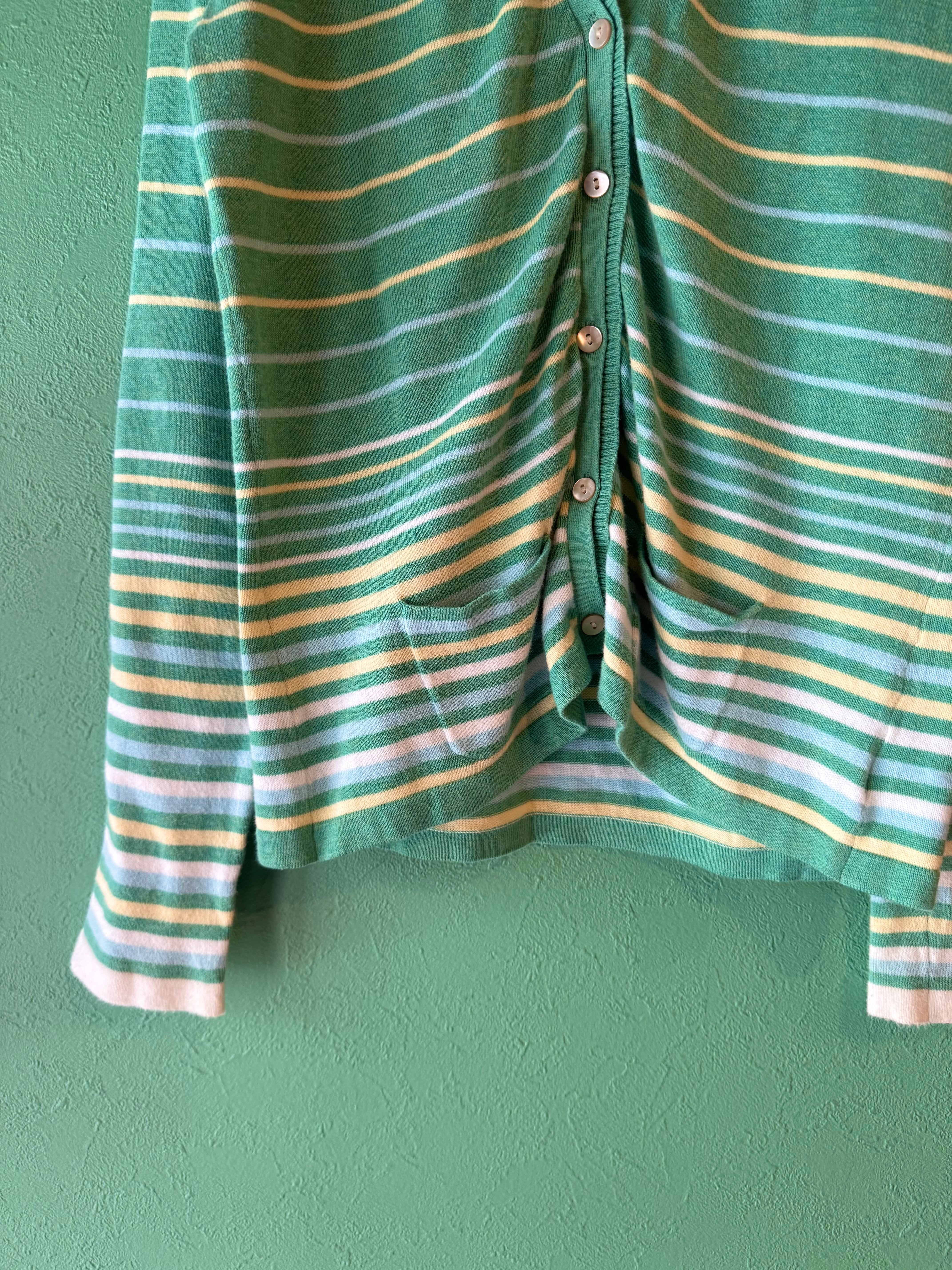 こちらはグリーンを基調としイエロー×水色×ホワイトのボーダーパターンになったニットカーディガン。