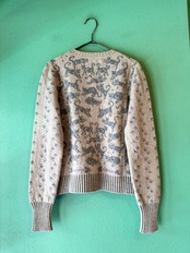 こちらはフロントに猫、裾には骨になった魚、袖は足跡の柄になった可愛らしいデザインのニットカーディガン。