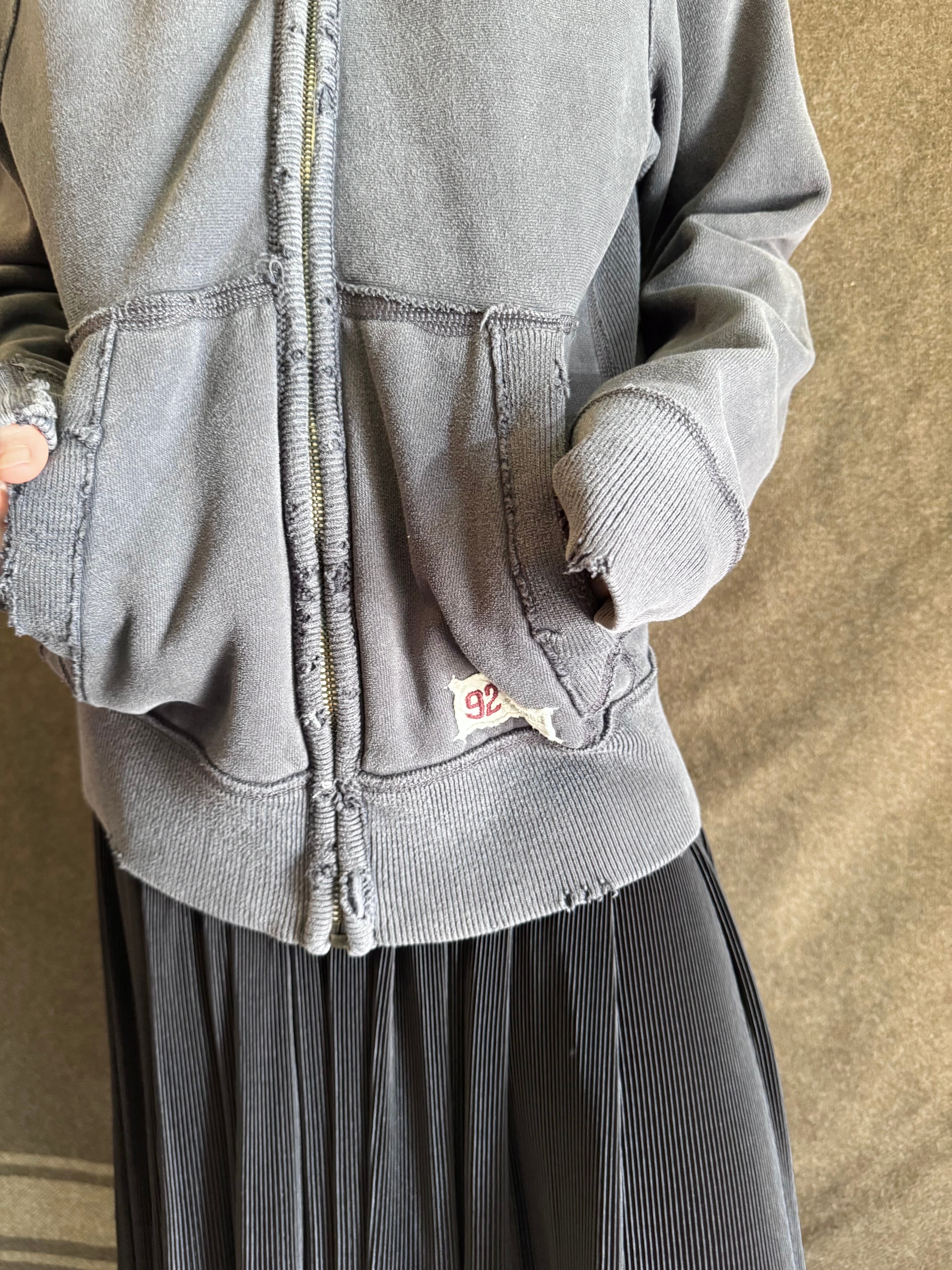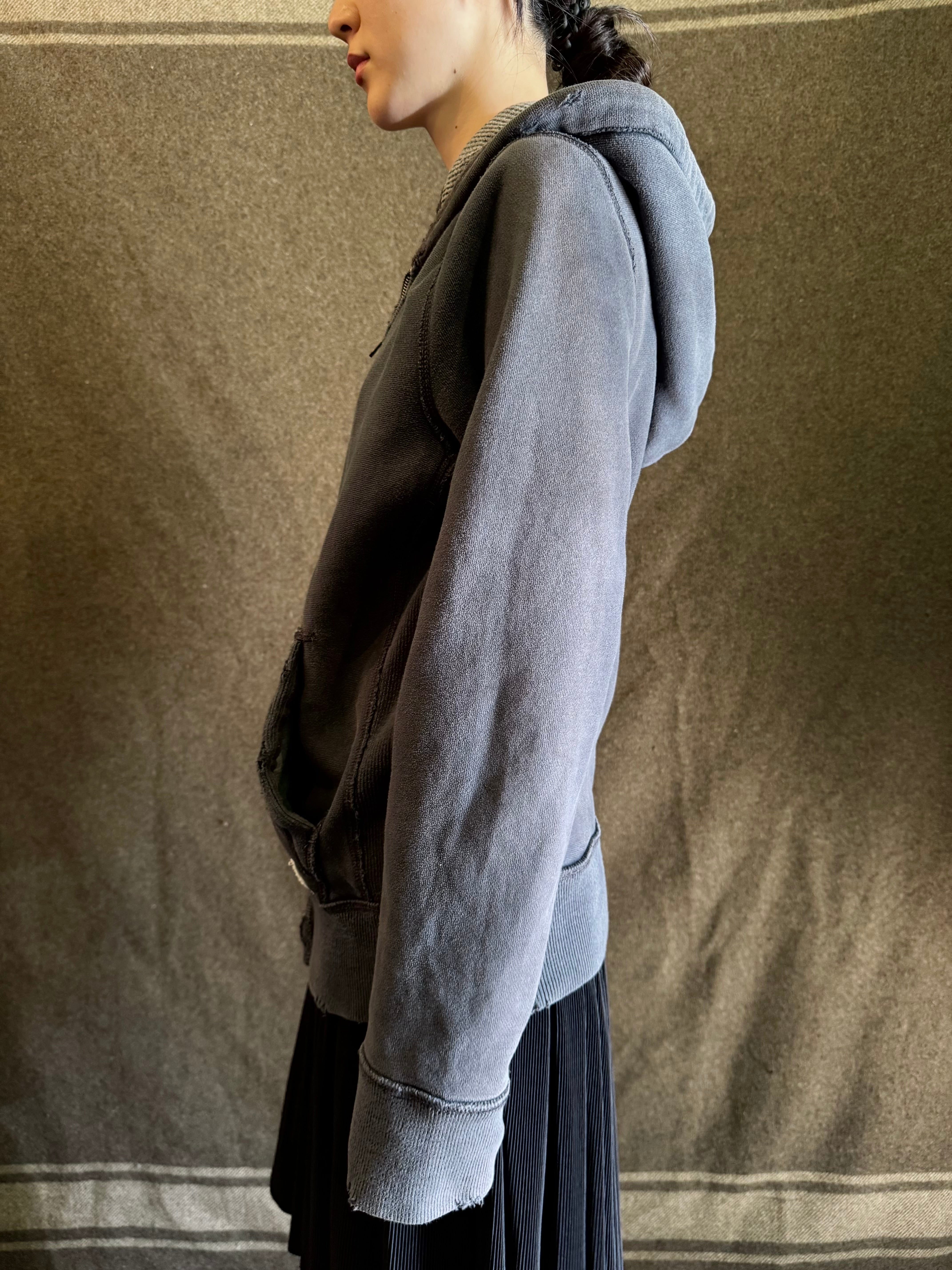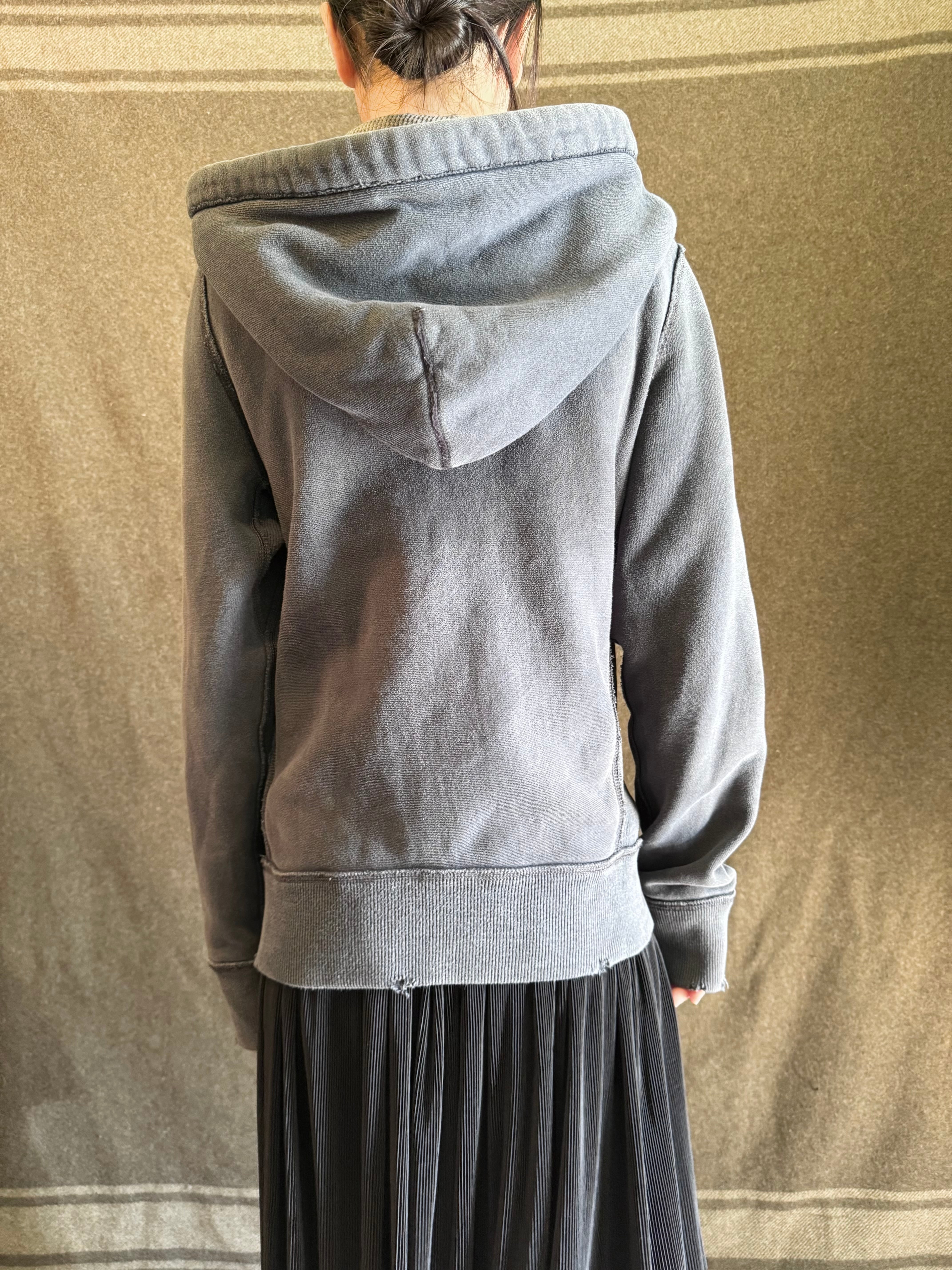 こちらはフェードしたブラックに近いネイビーカラーにリアルなダメージを再現したデザインのジップパーカー。