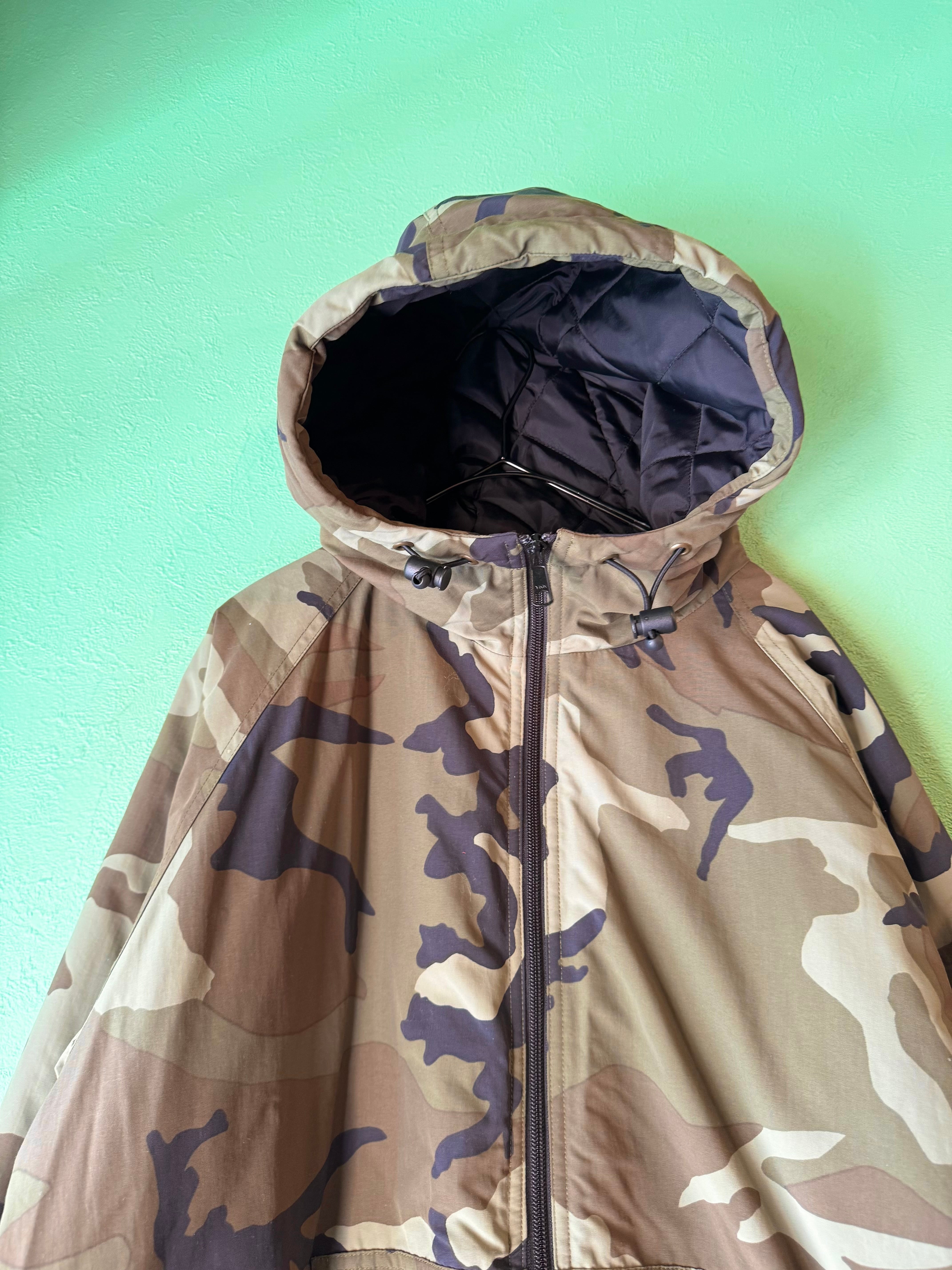 ウッドランド調のストリートライクなカモフラージュパターンに頭部まで温めてくれるフーディタイプになっています。