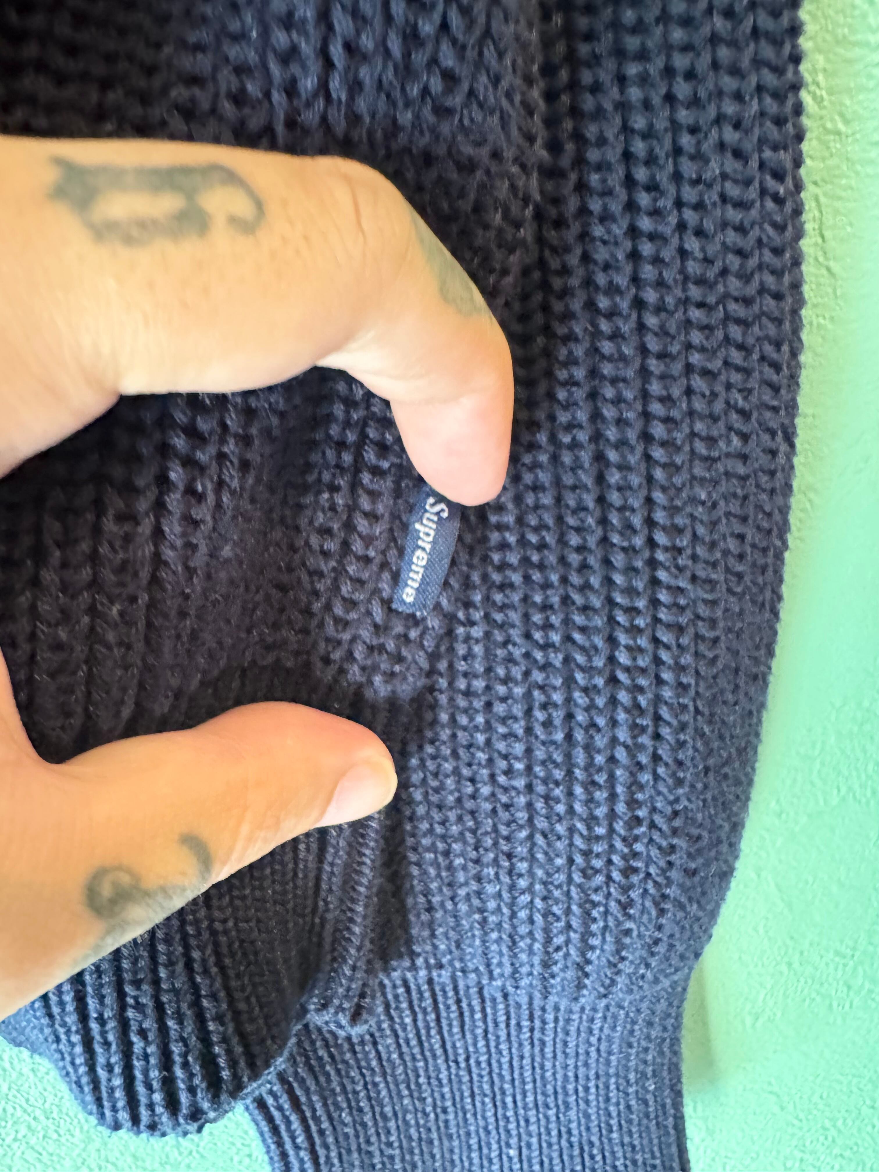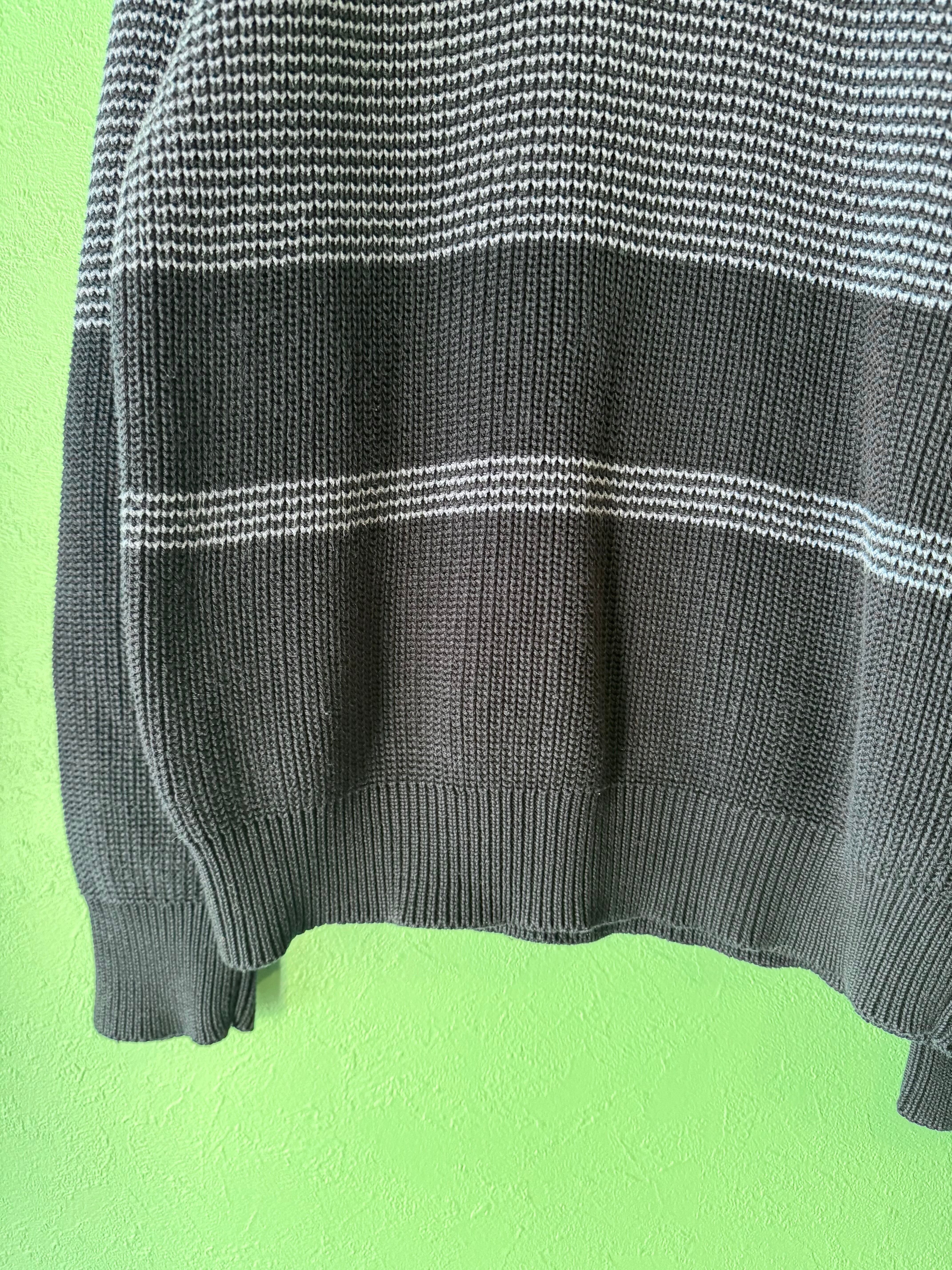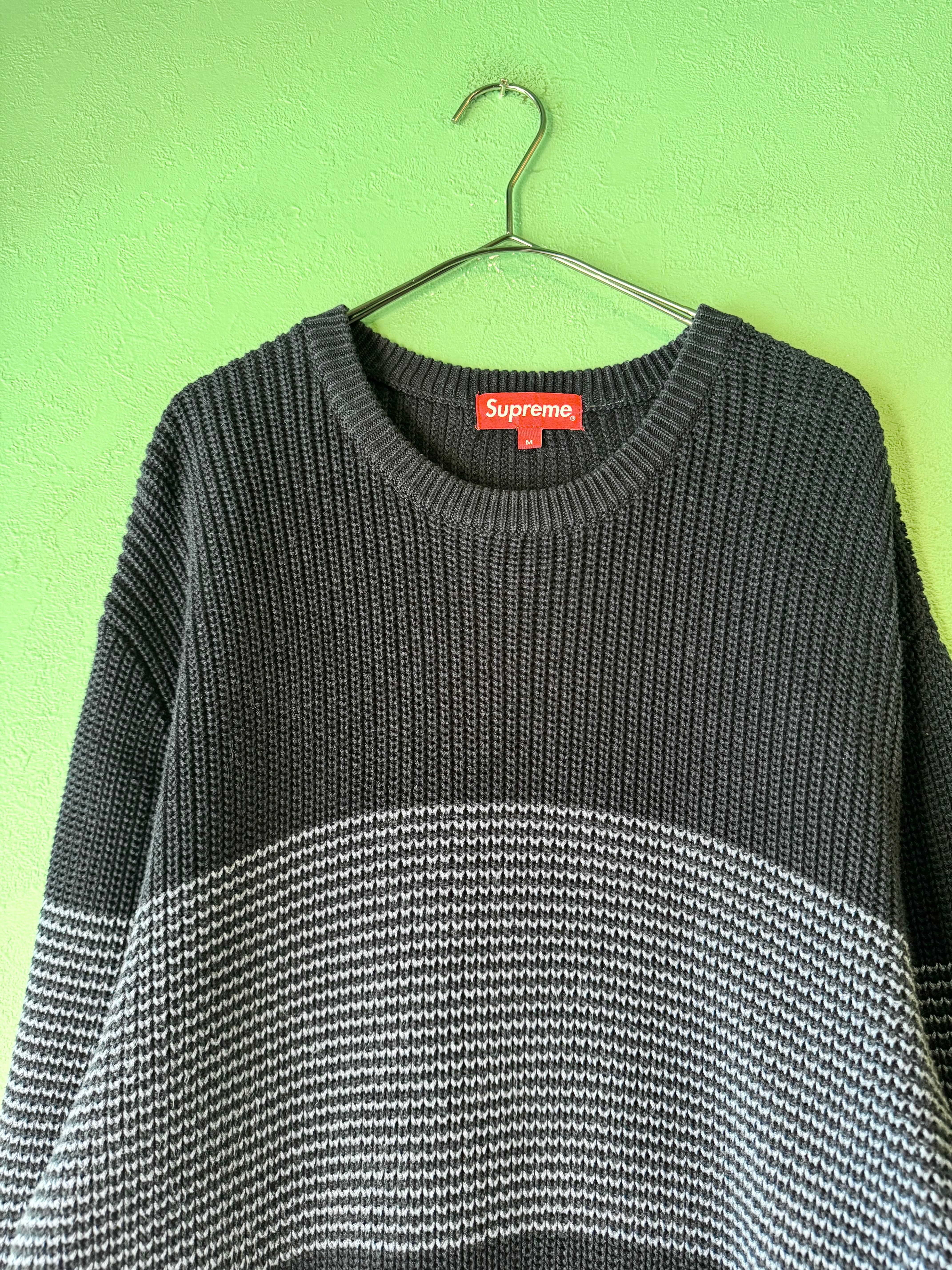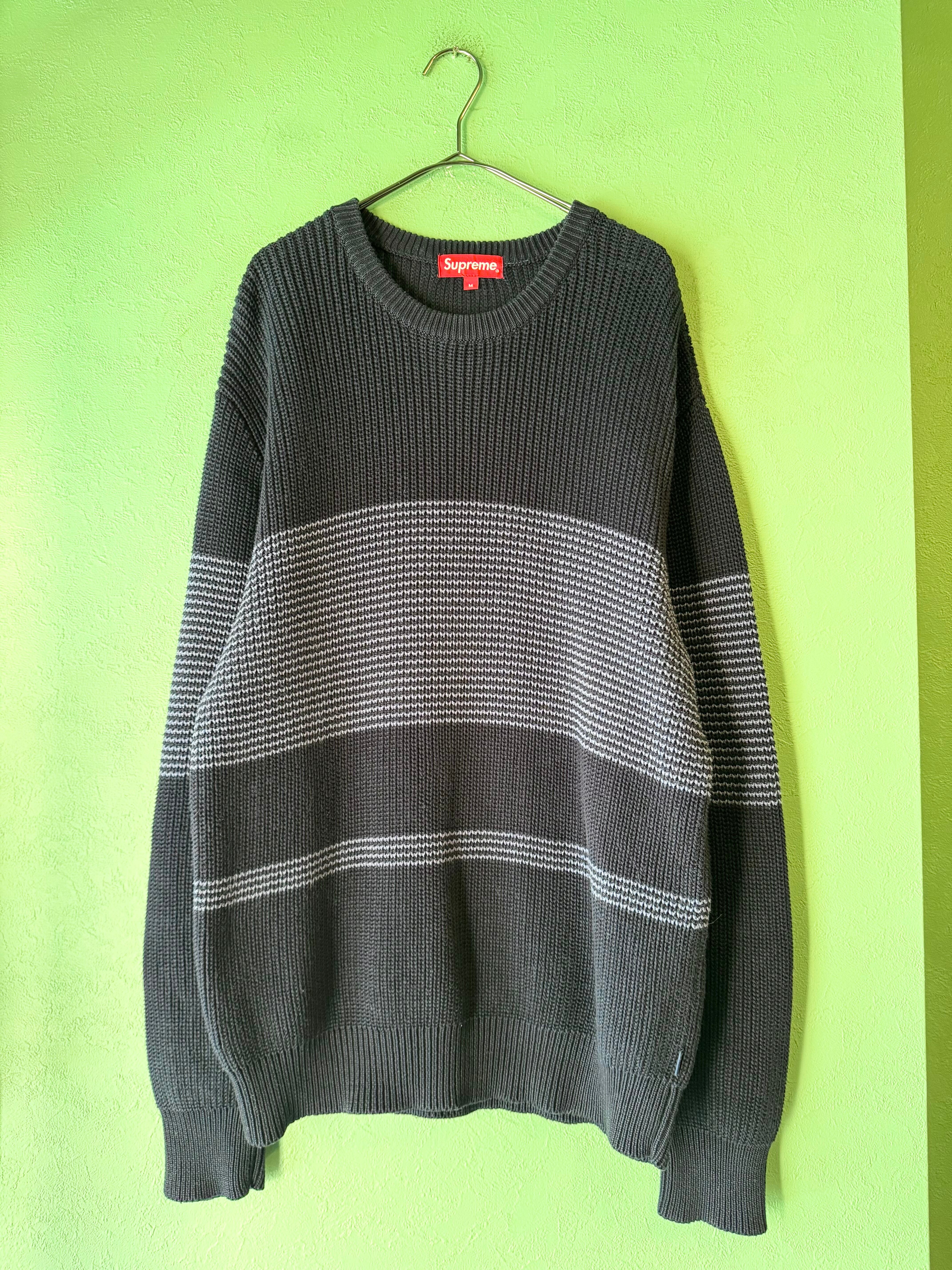 こちらはネイビーベースにライトブルーカラーのボーダーデザインになったニット。