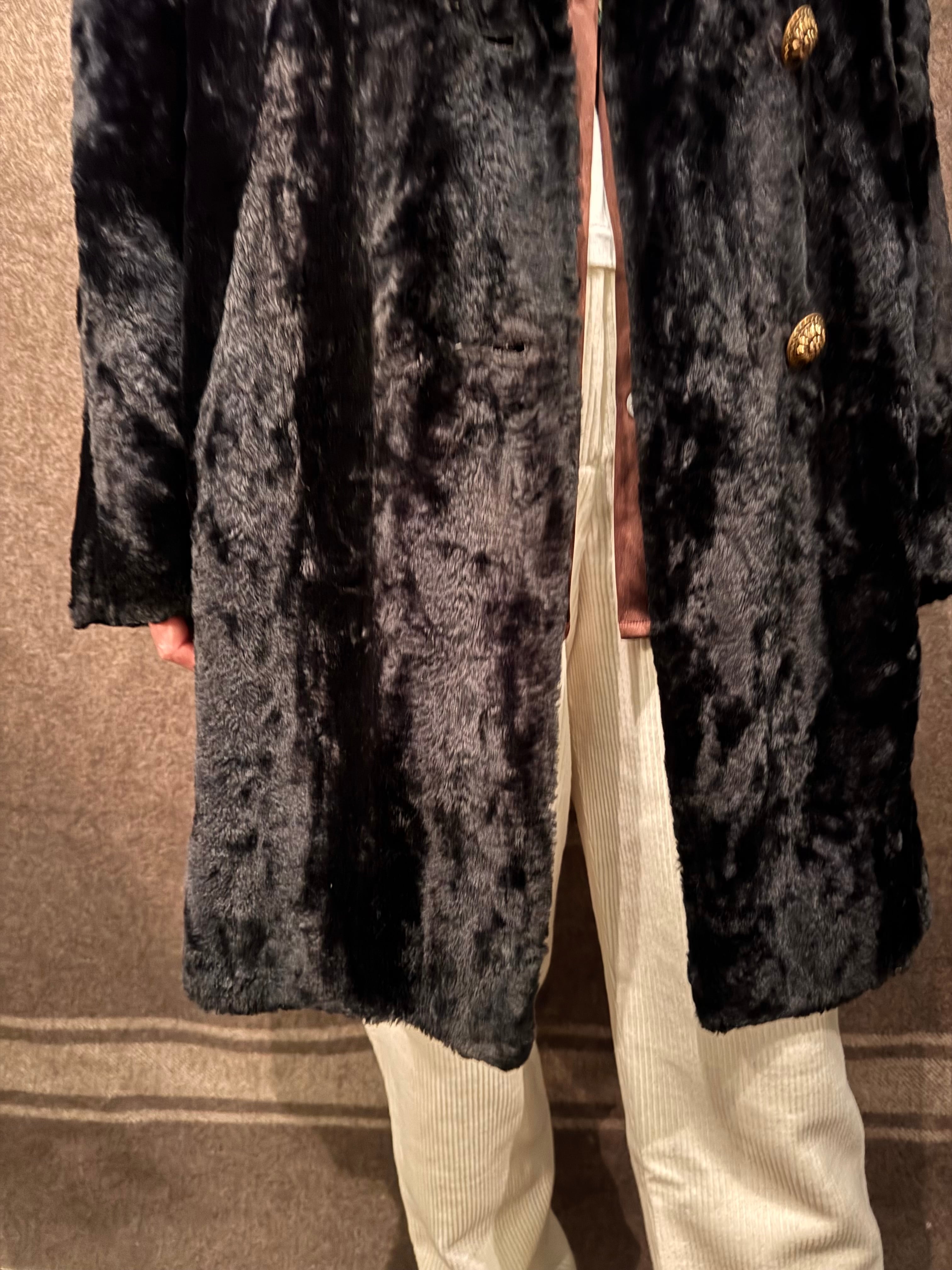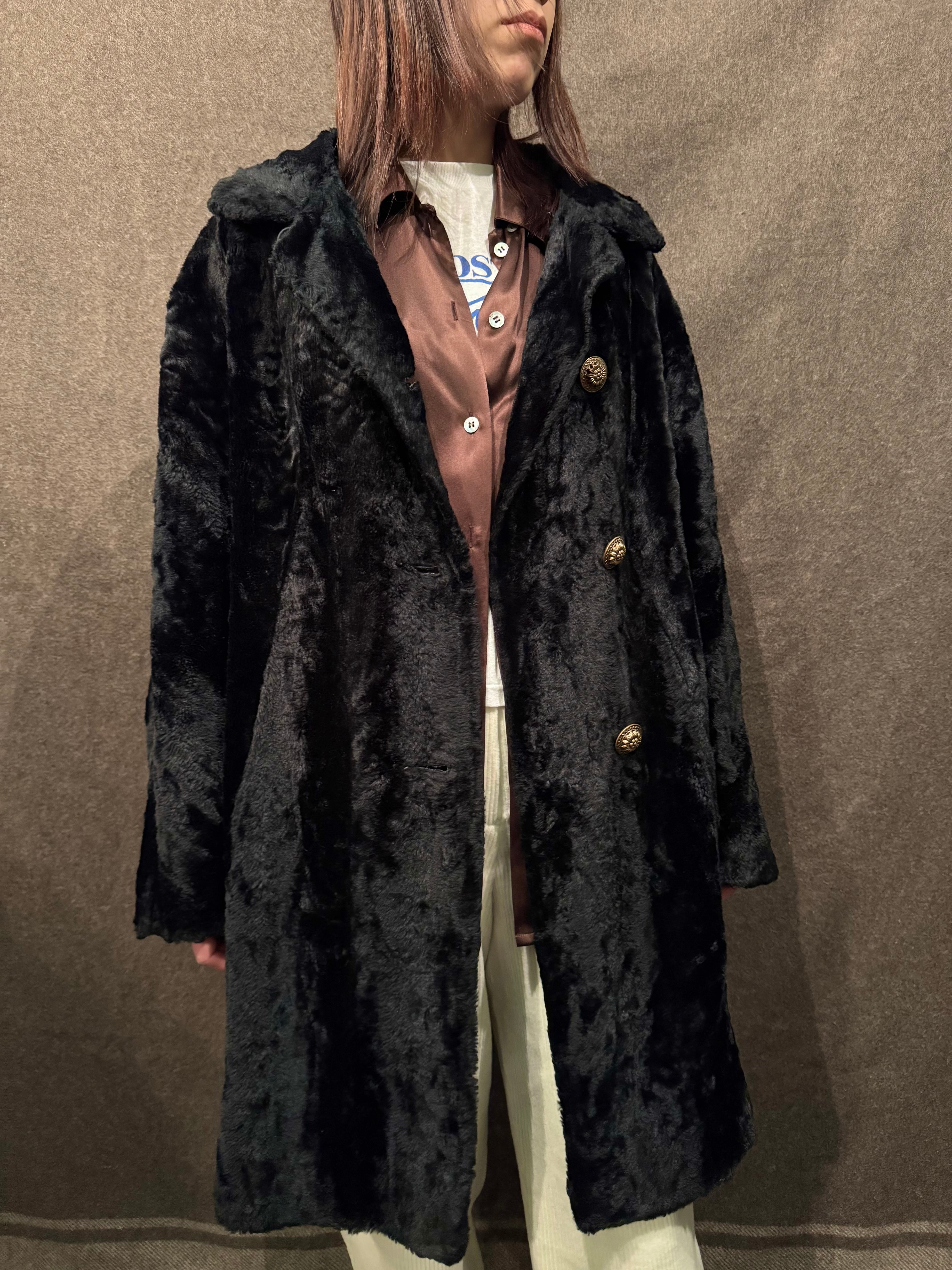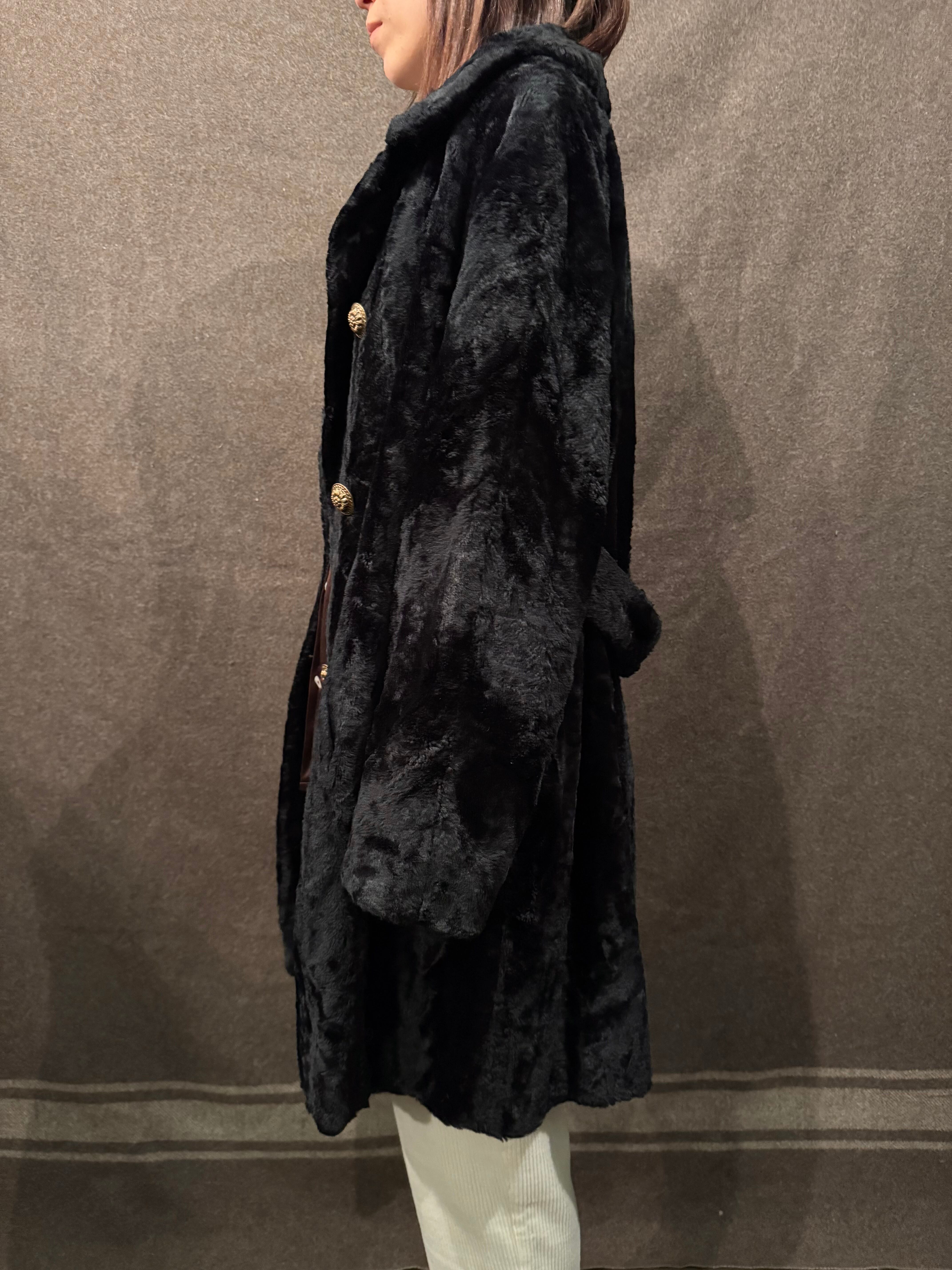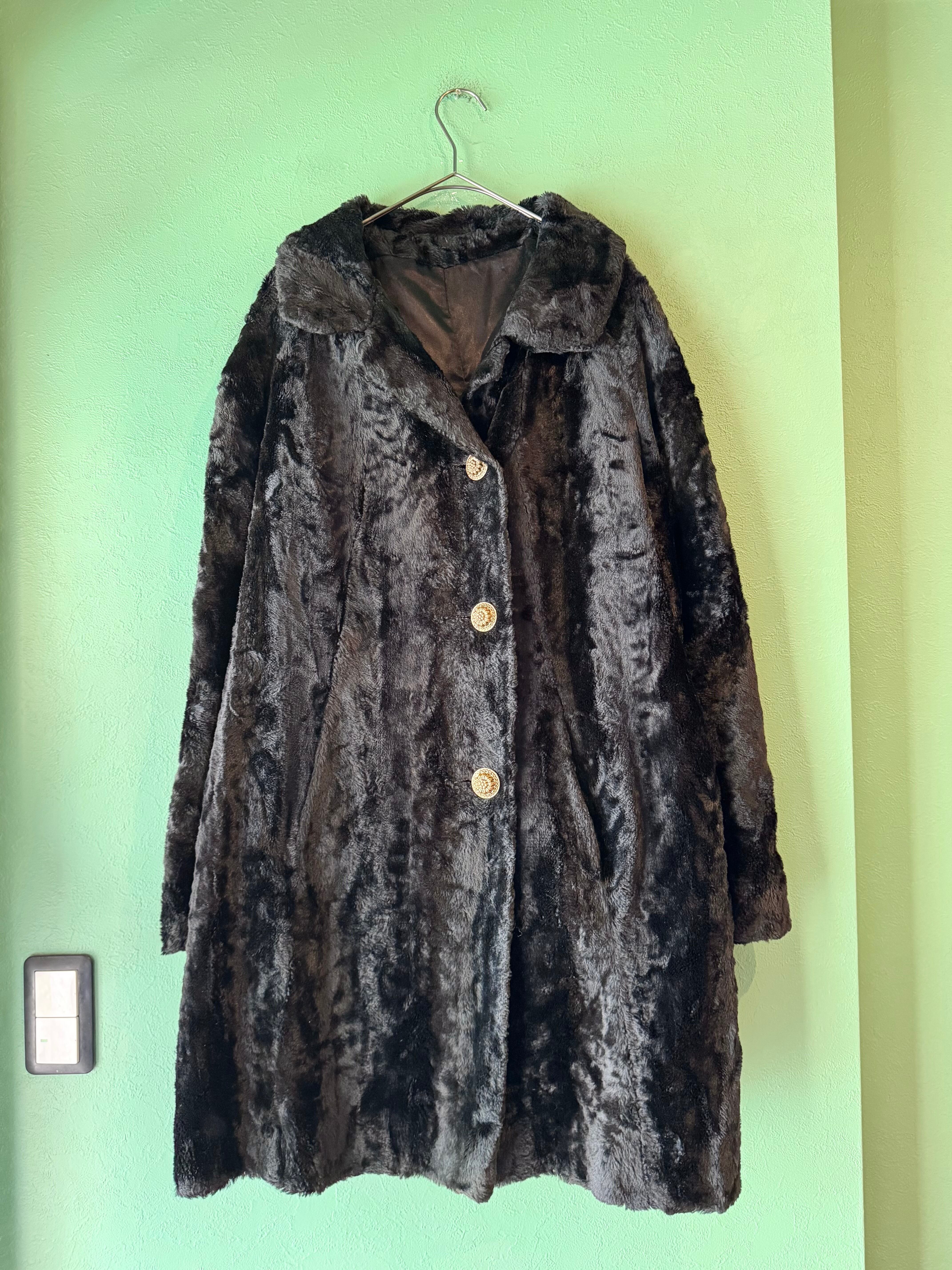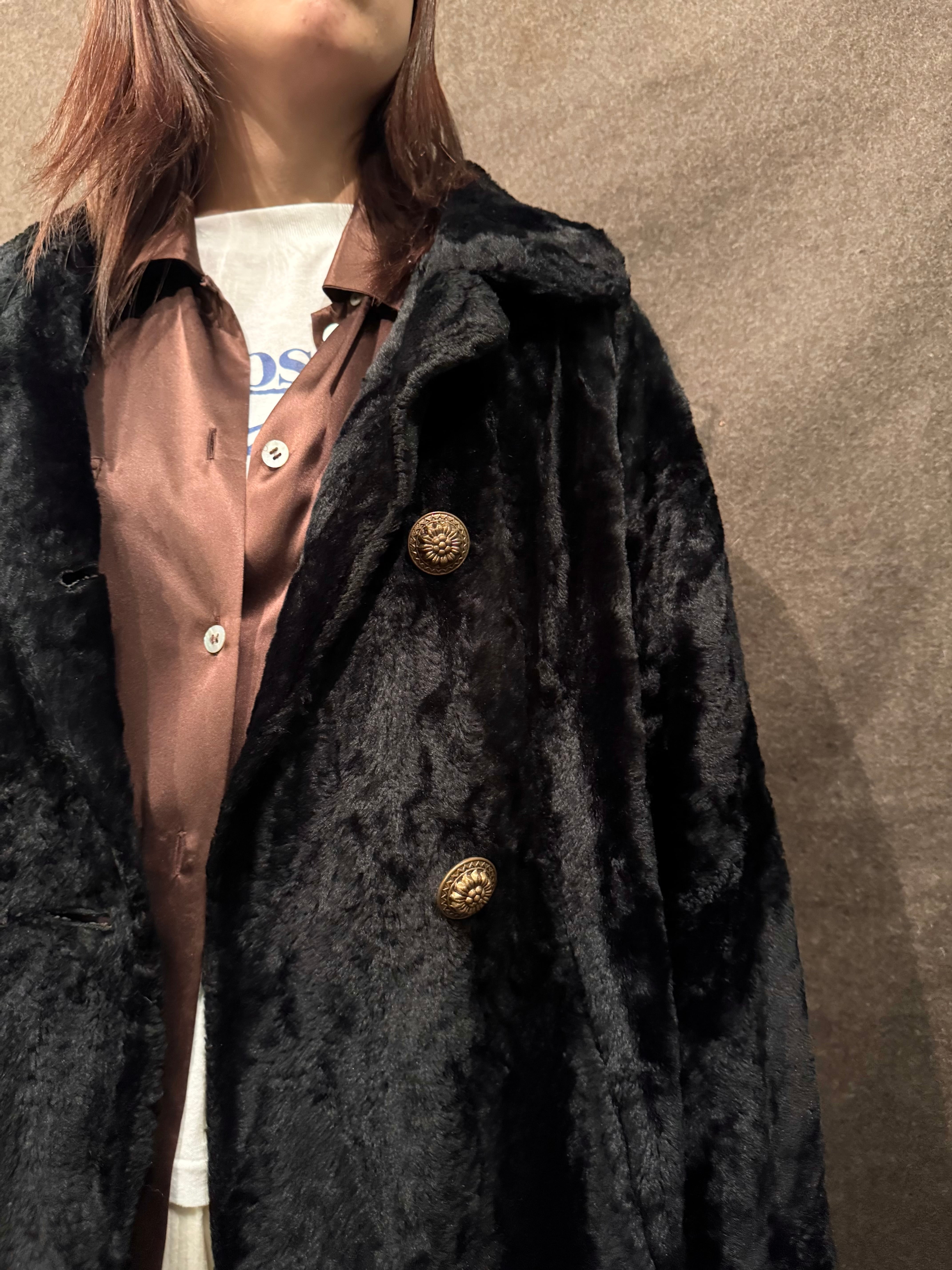こちらは光沢のあるファー素材にカッコいいブラックボディーに映える金ボタンがアクセントとなったコート。