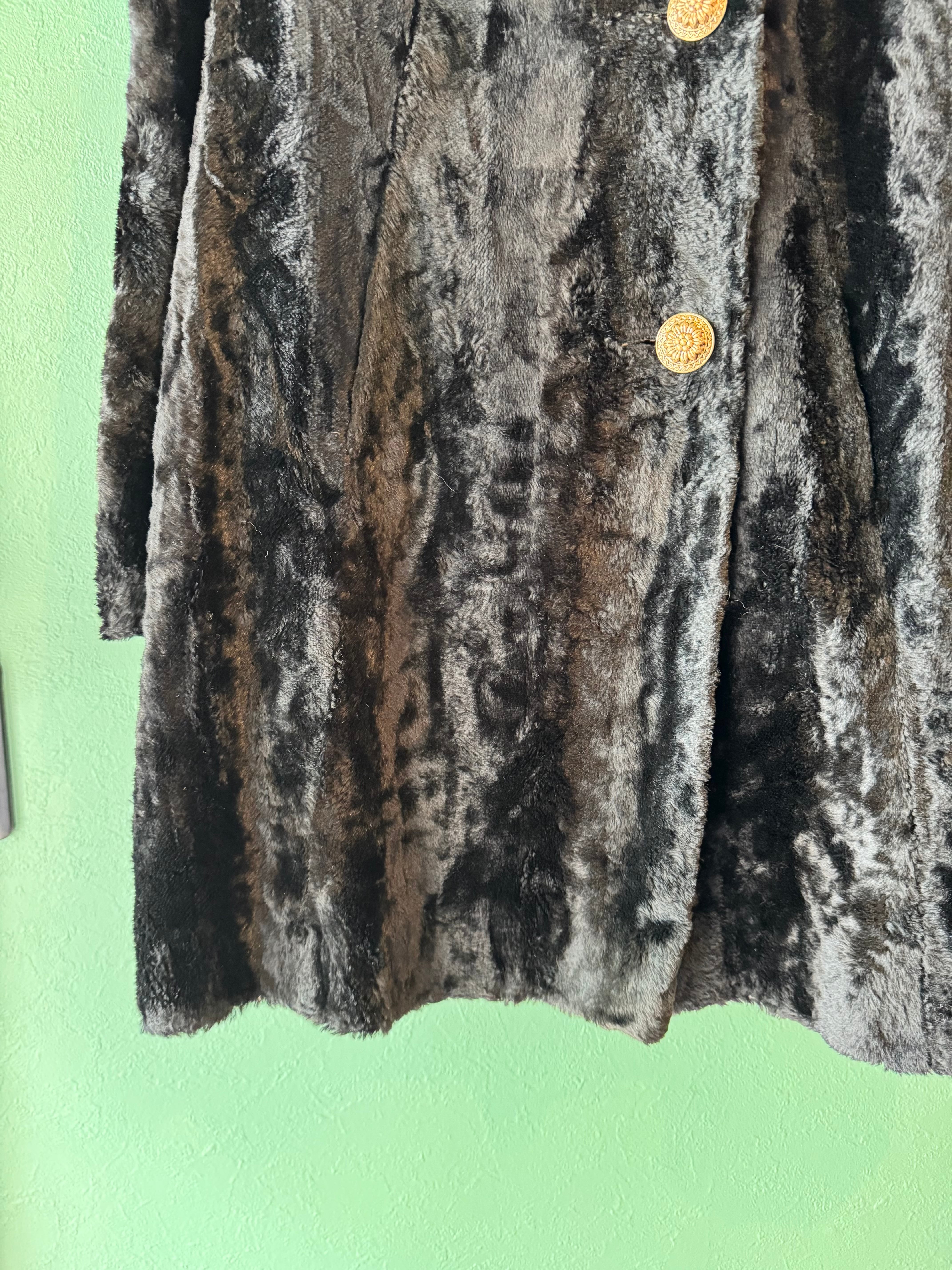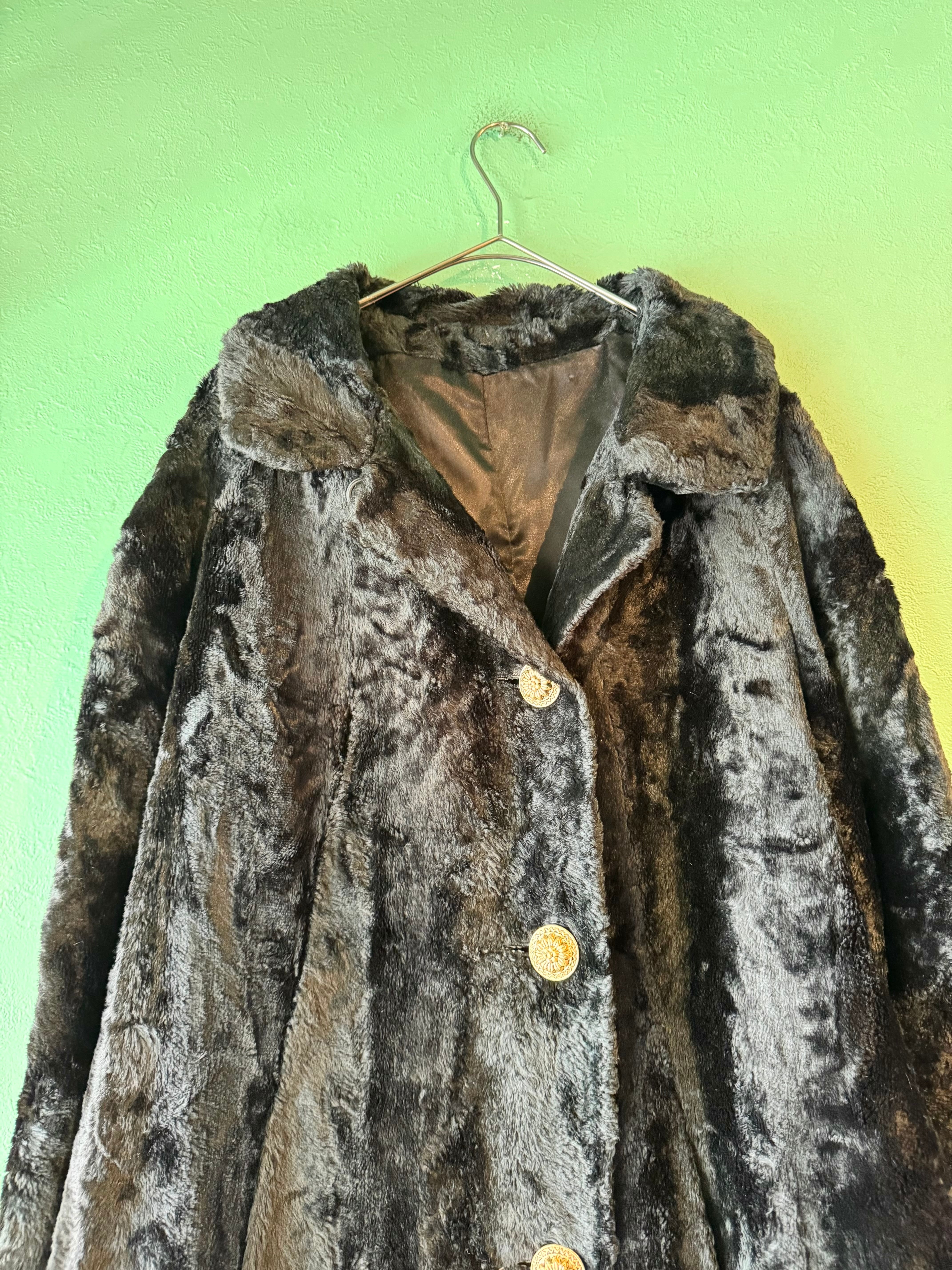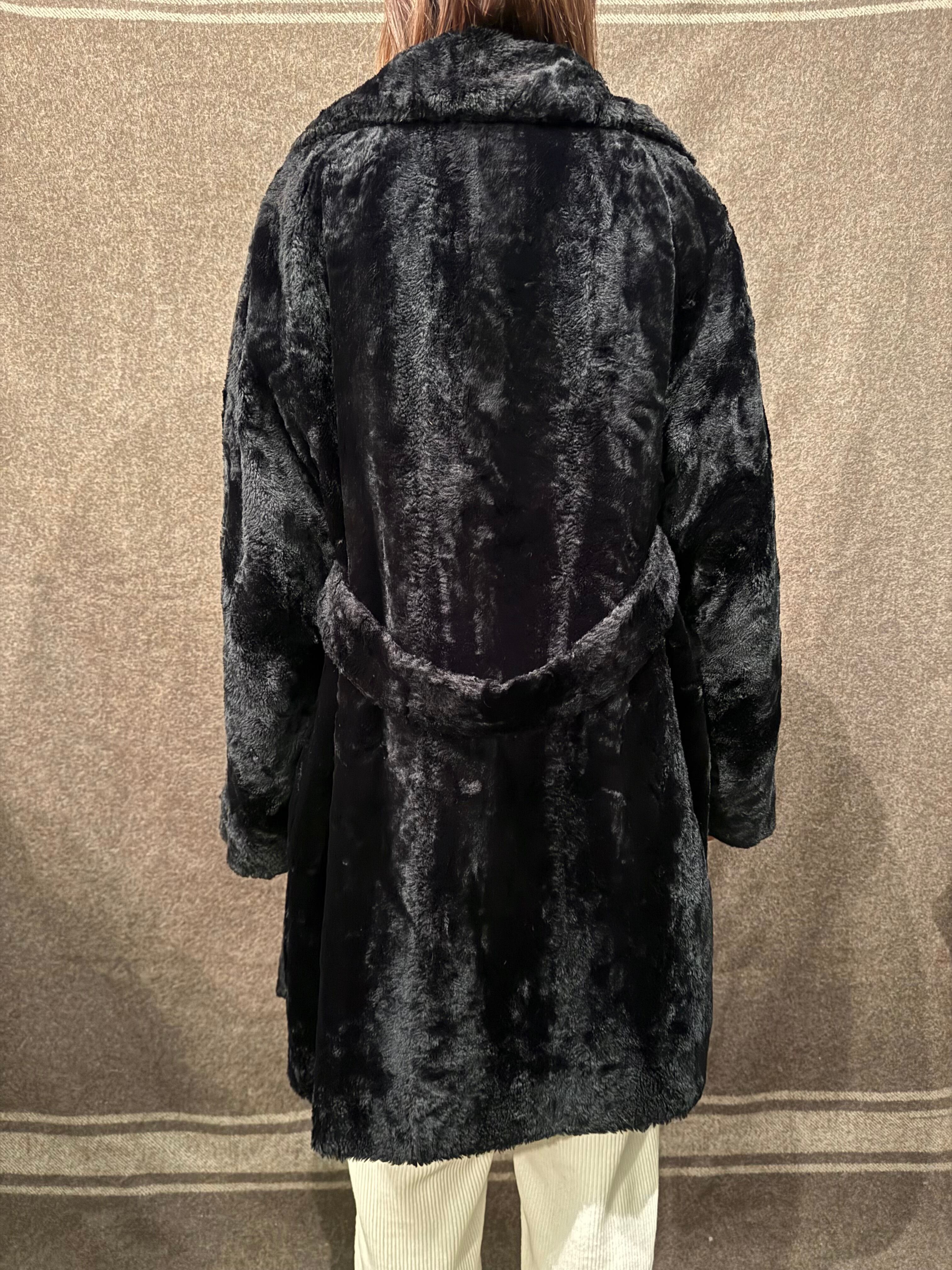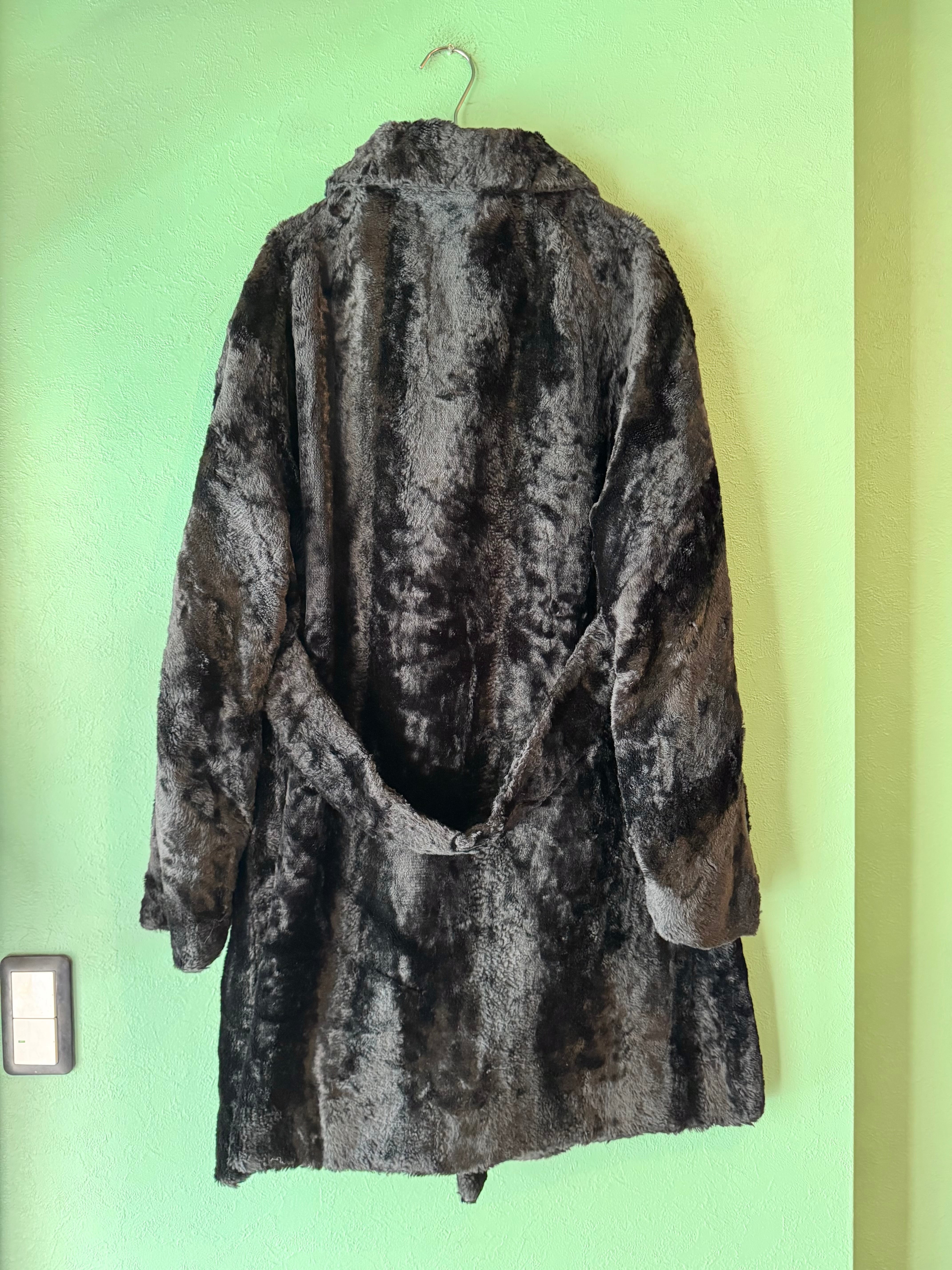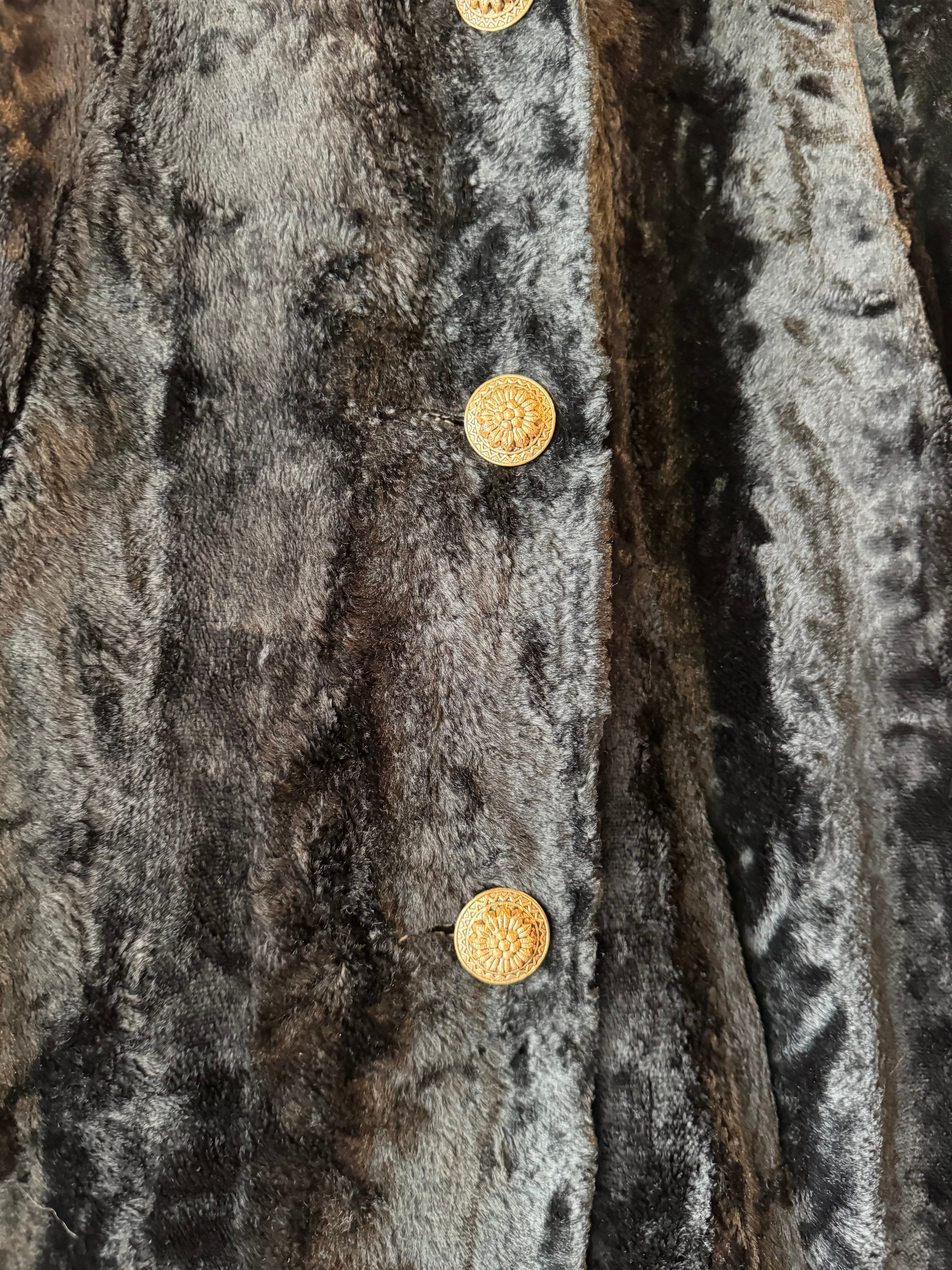 こちらは光沢のあるファー素材にカッコいいブラックボディーに映える金ボタンがアクセントとなったコート。