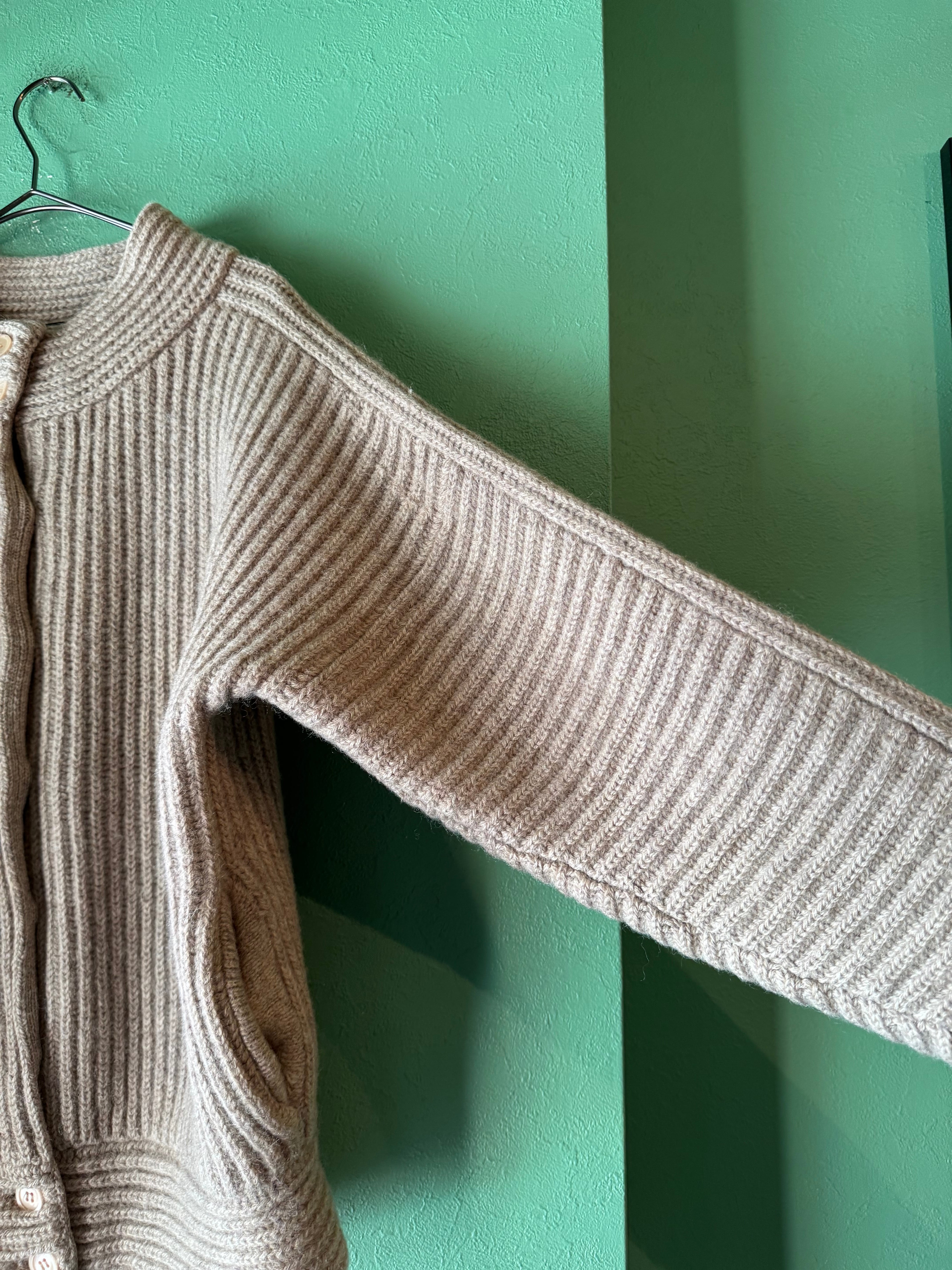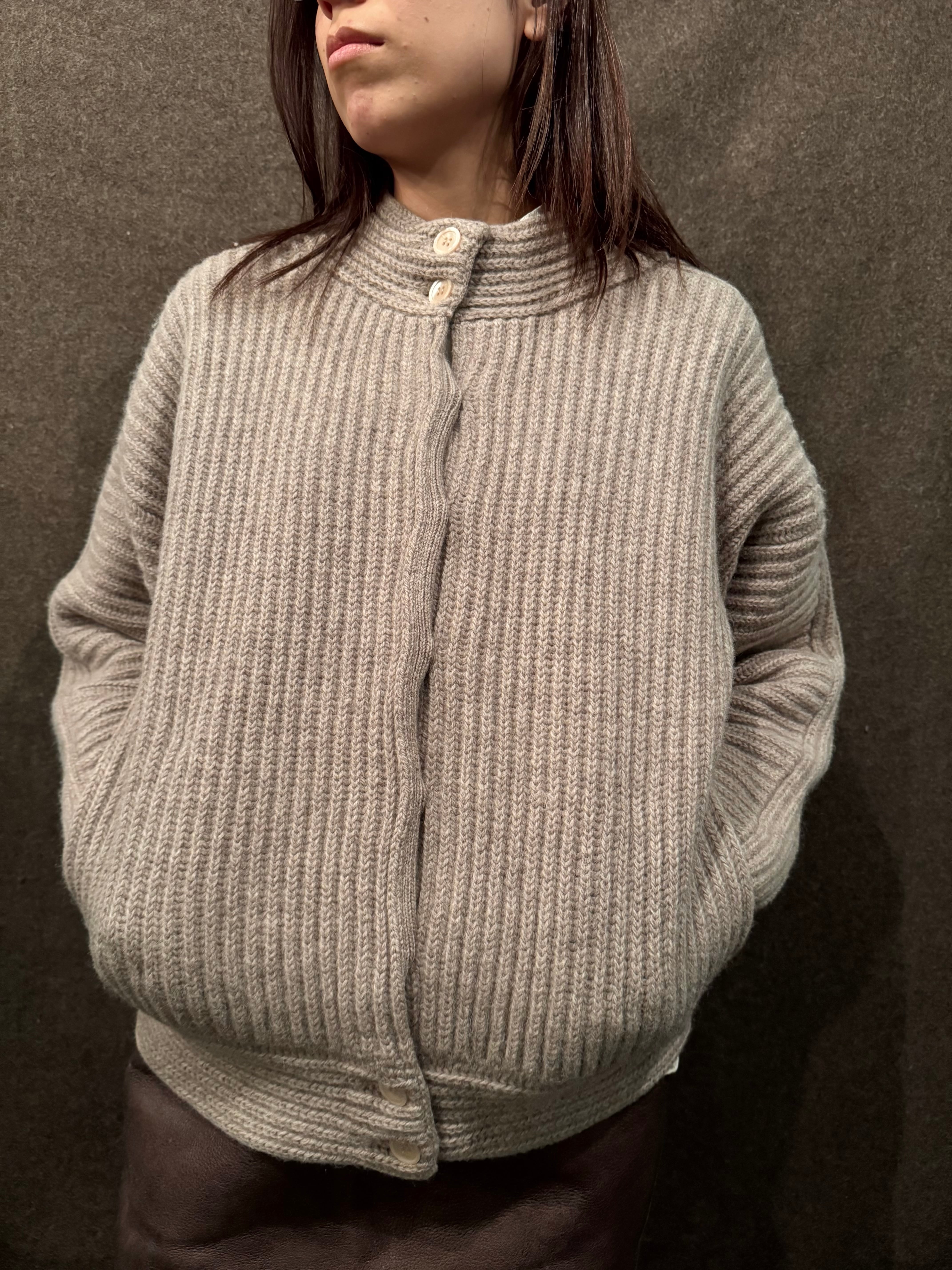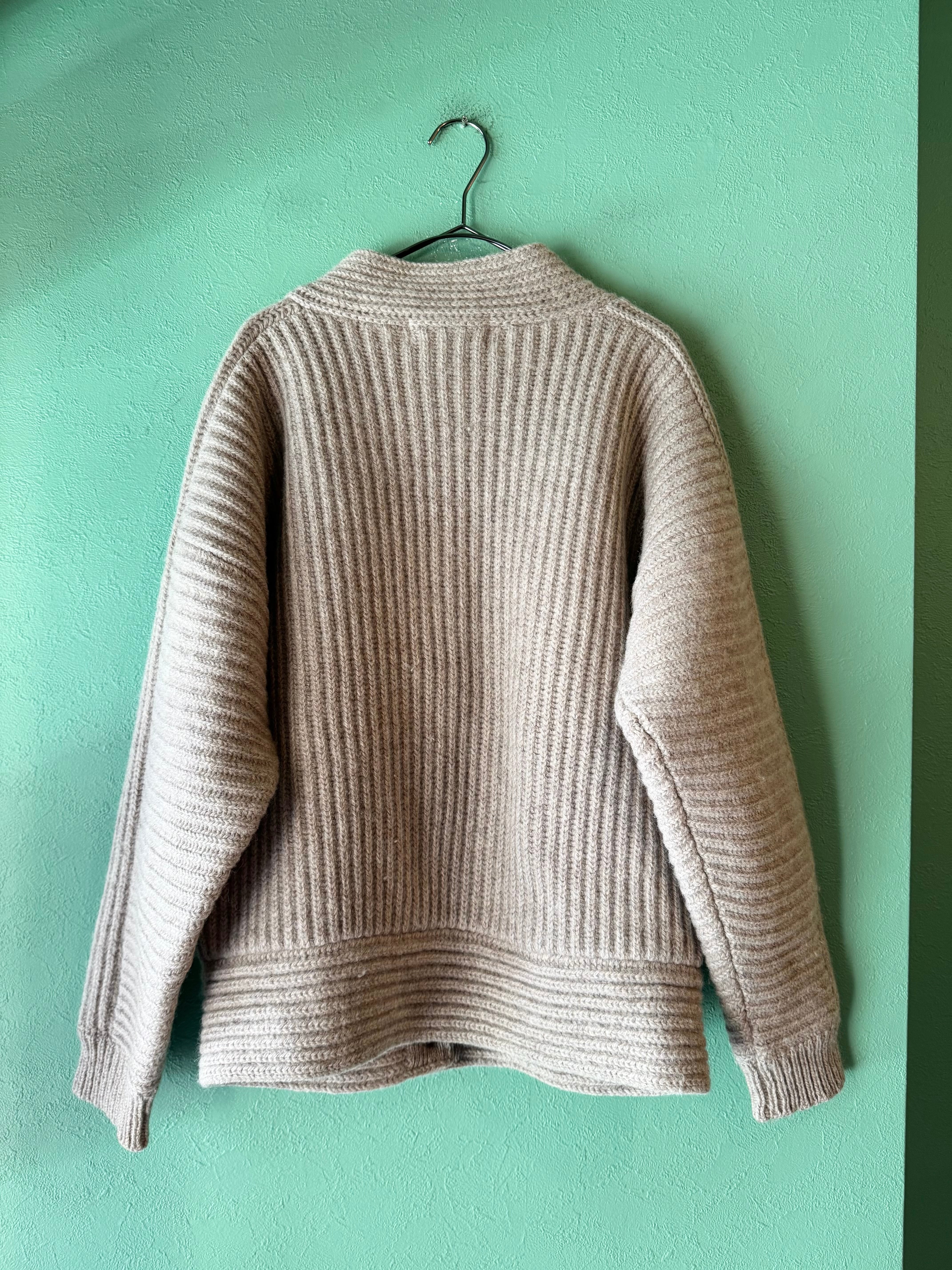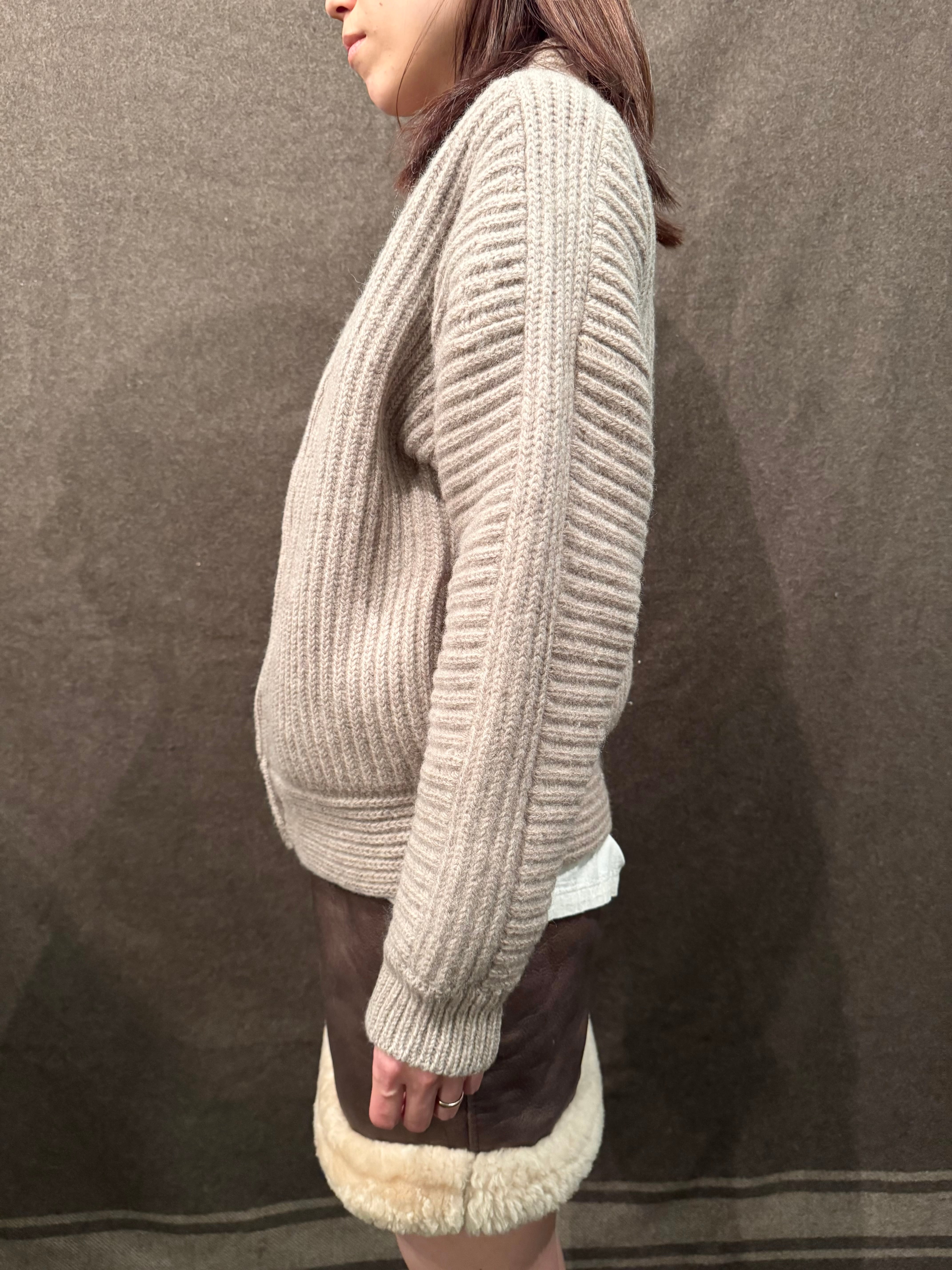 こちらは肉厚なニット地にリブ編みのライトベージュカラーのニットジャケット。