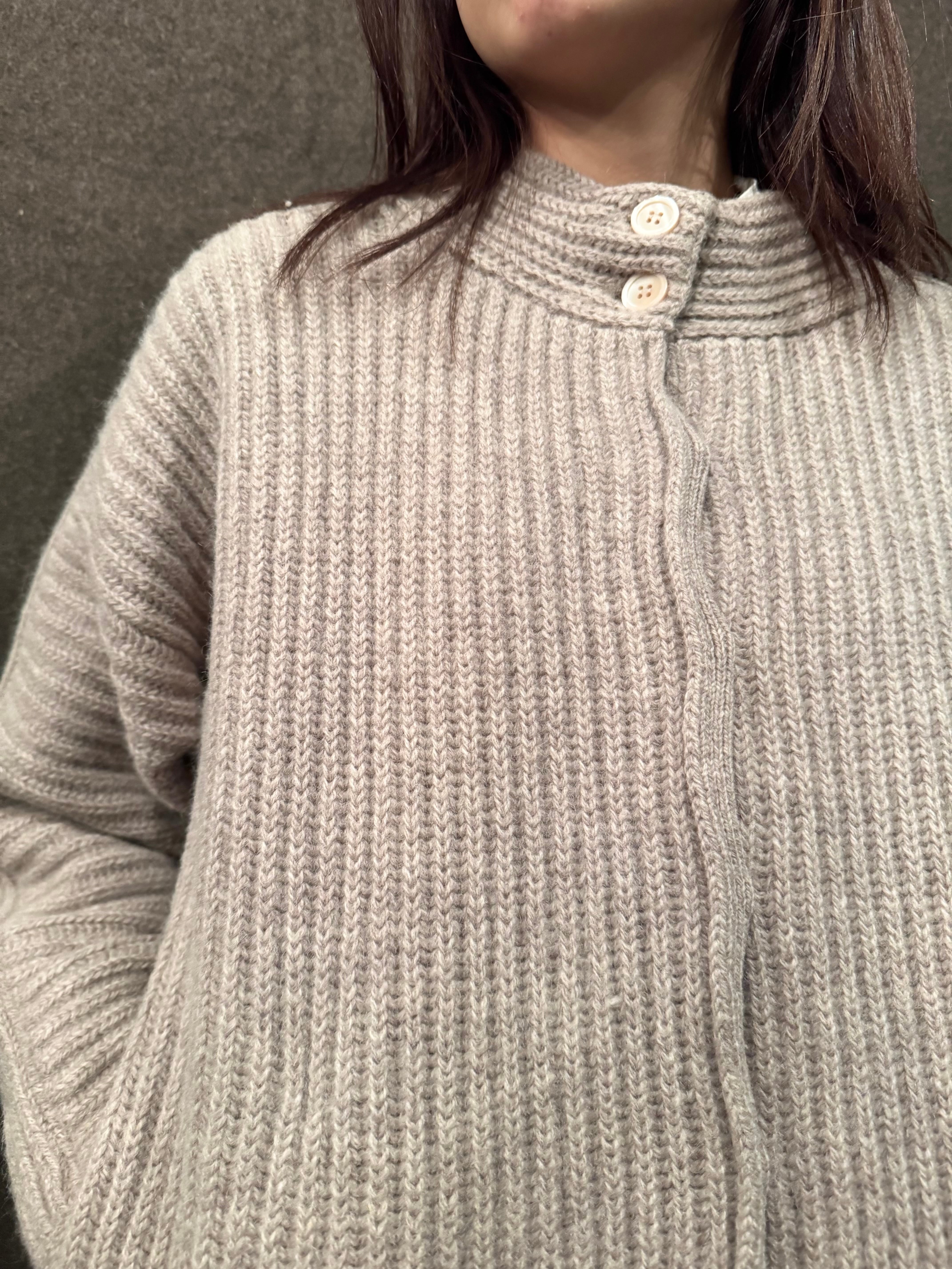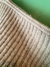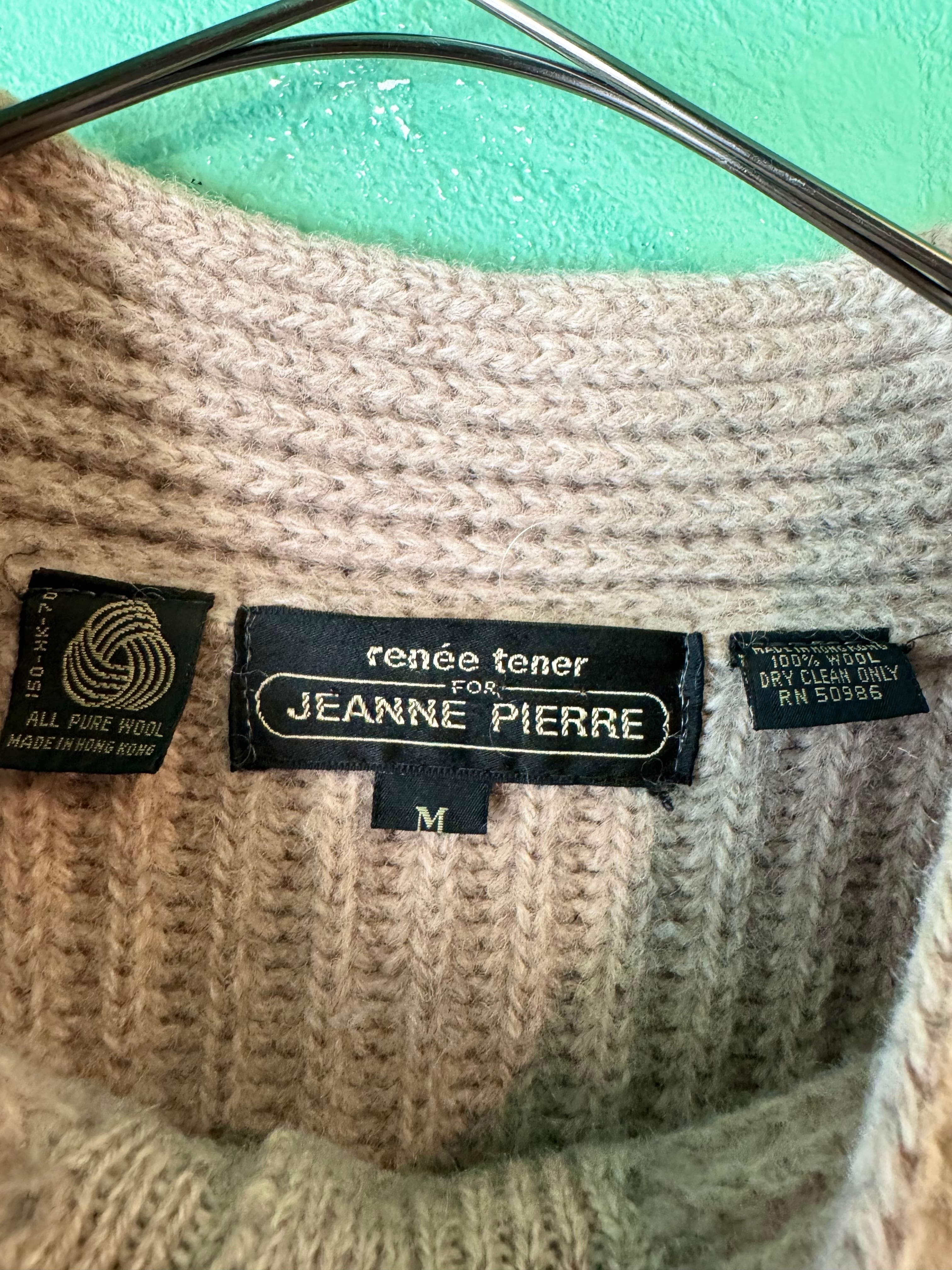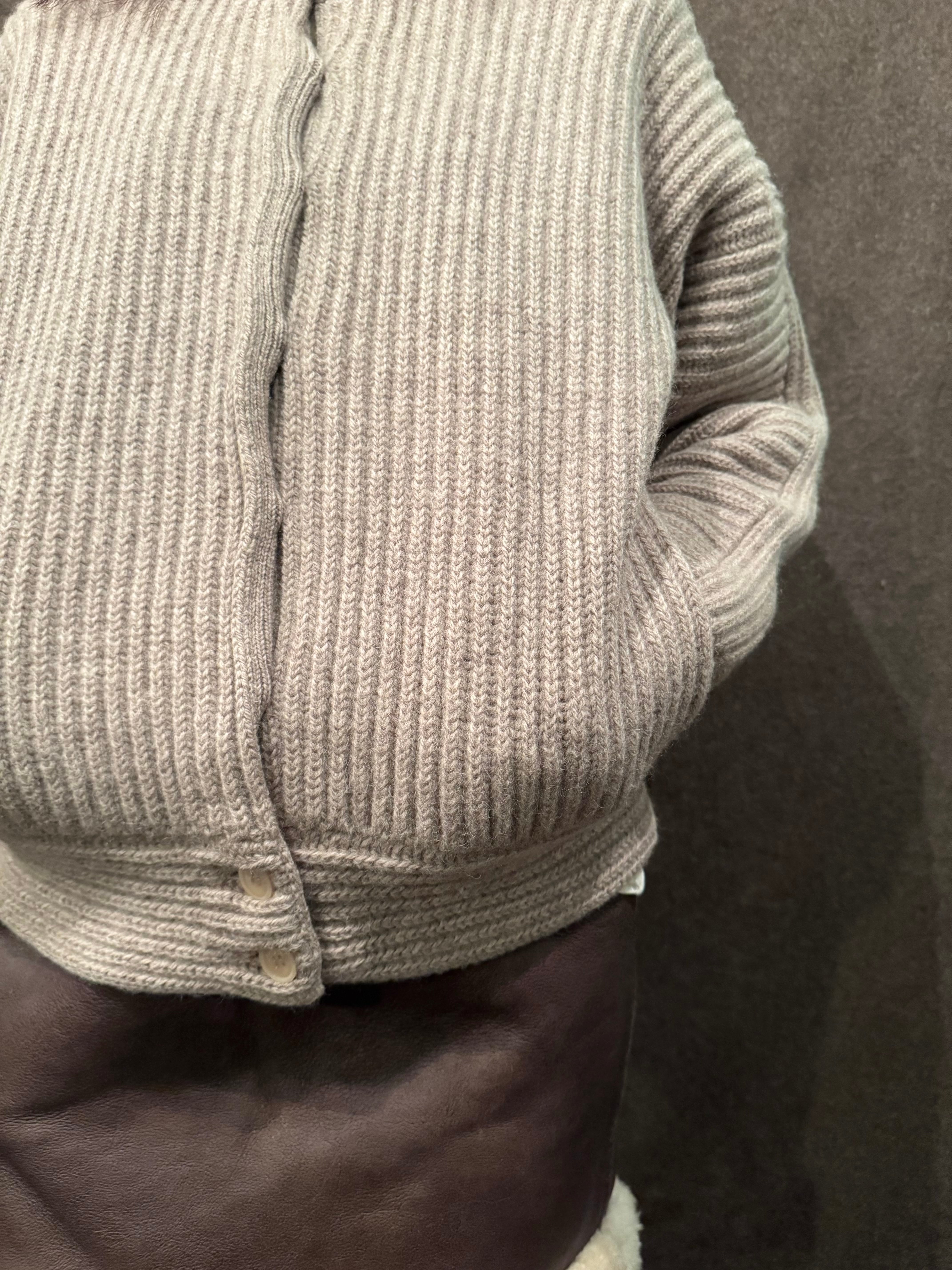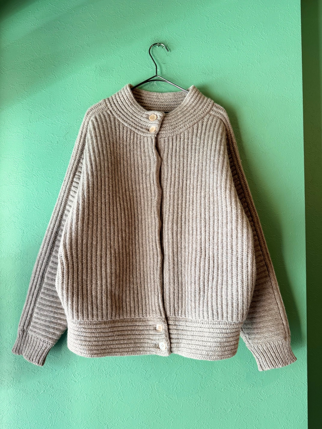 こちらは肉厚なニット地にリブ編みのライトベージュカラーのニットジャケット。