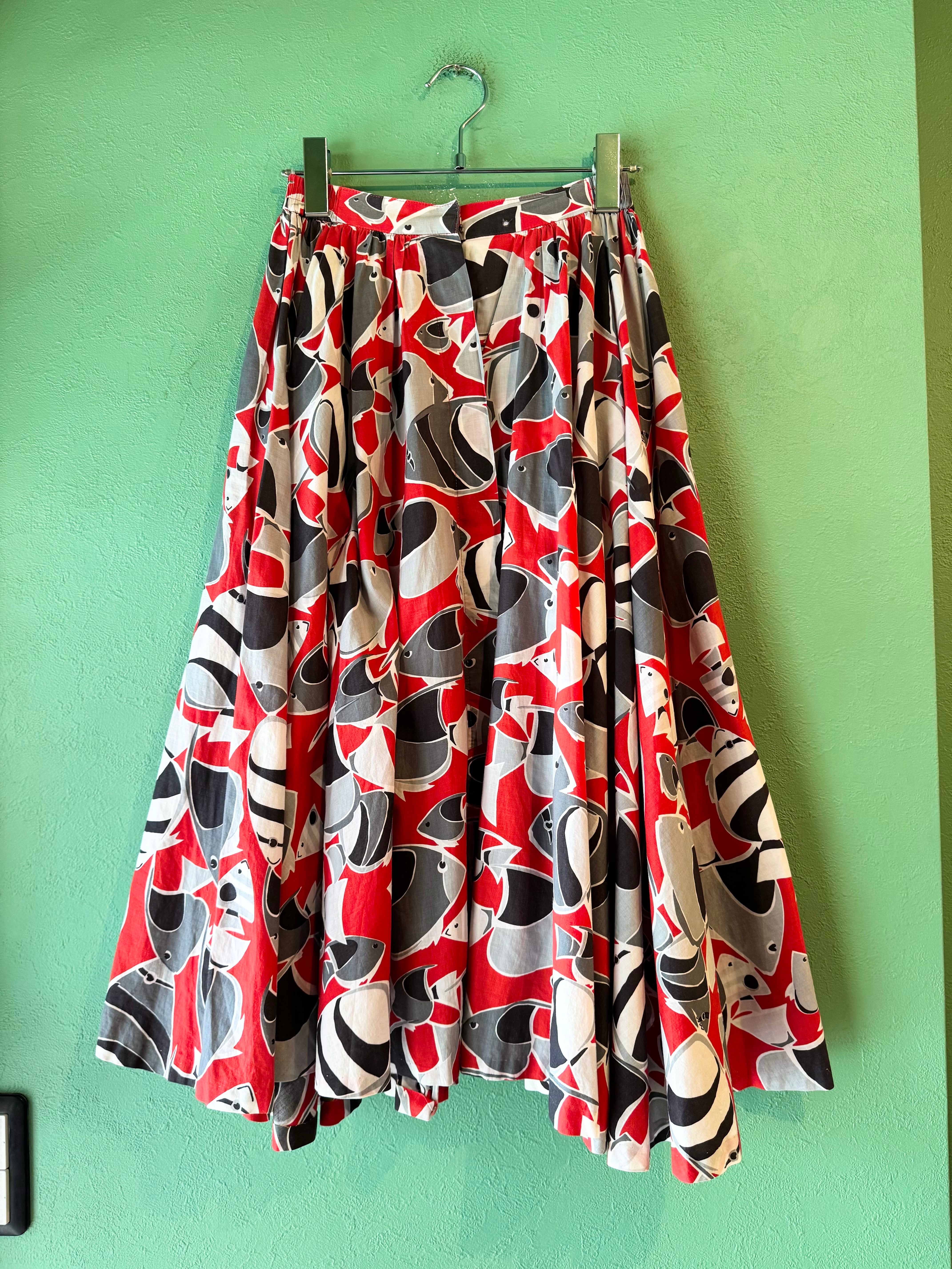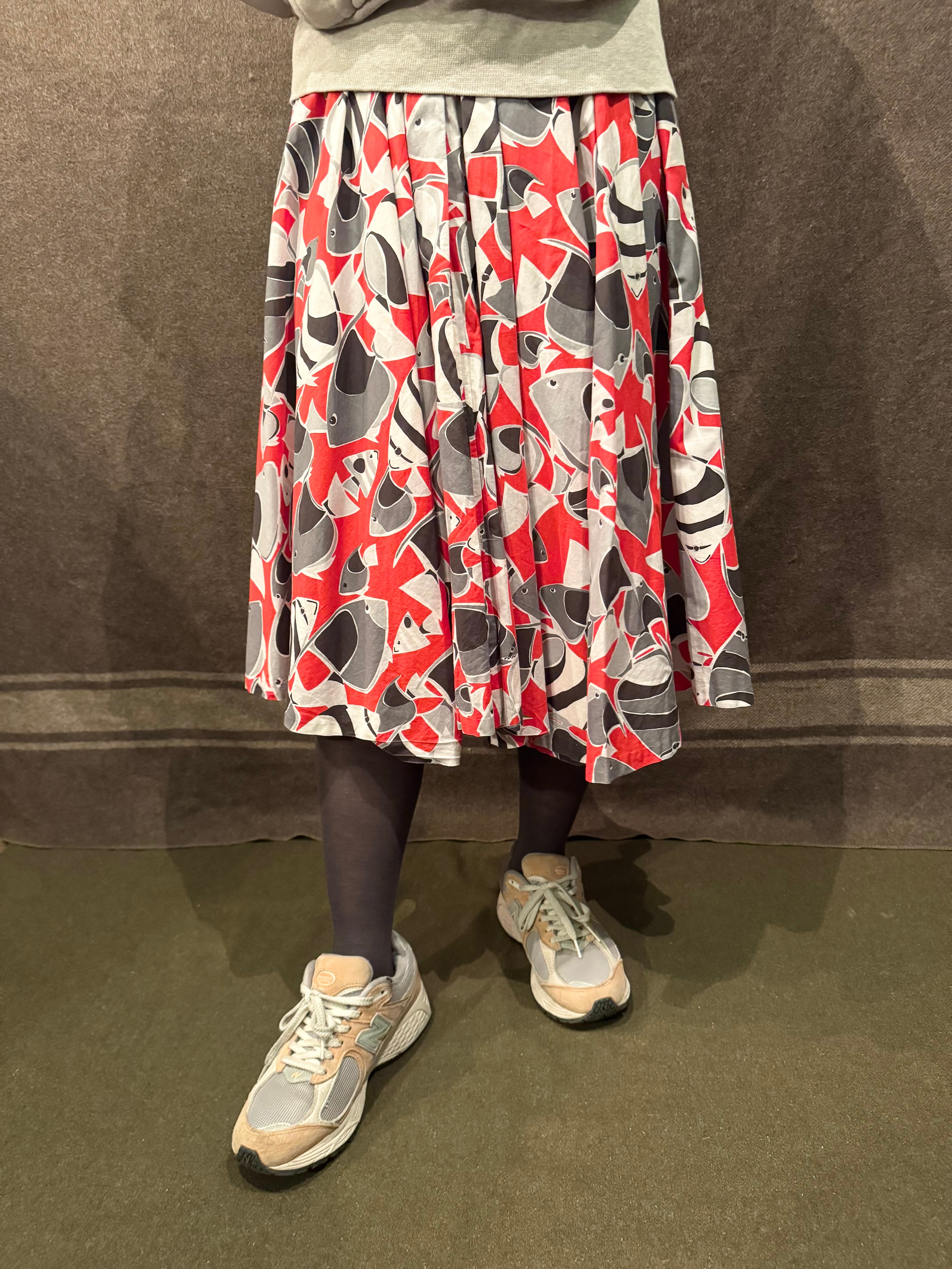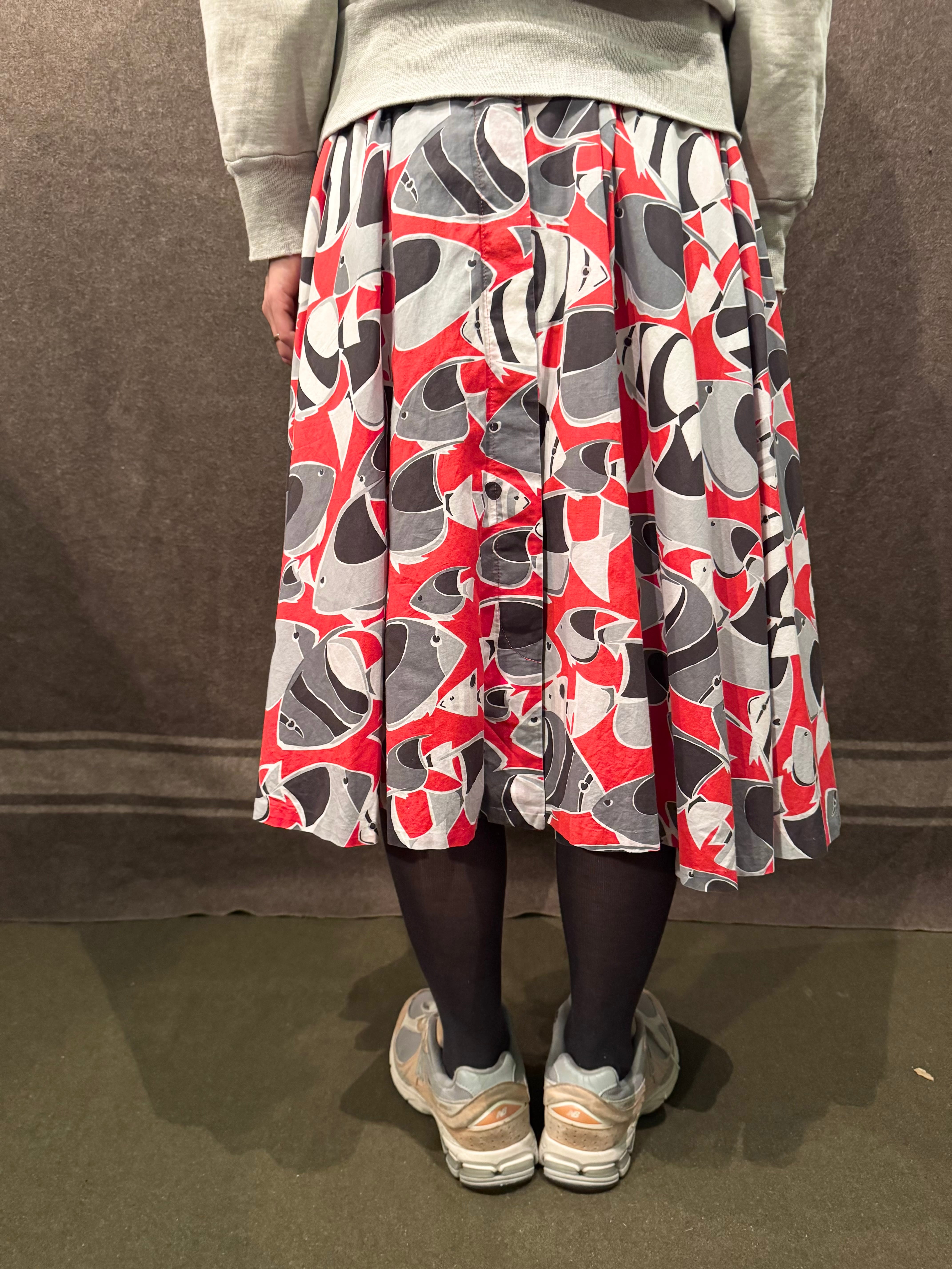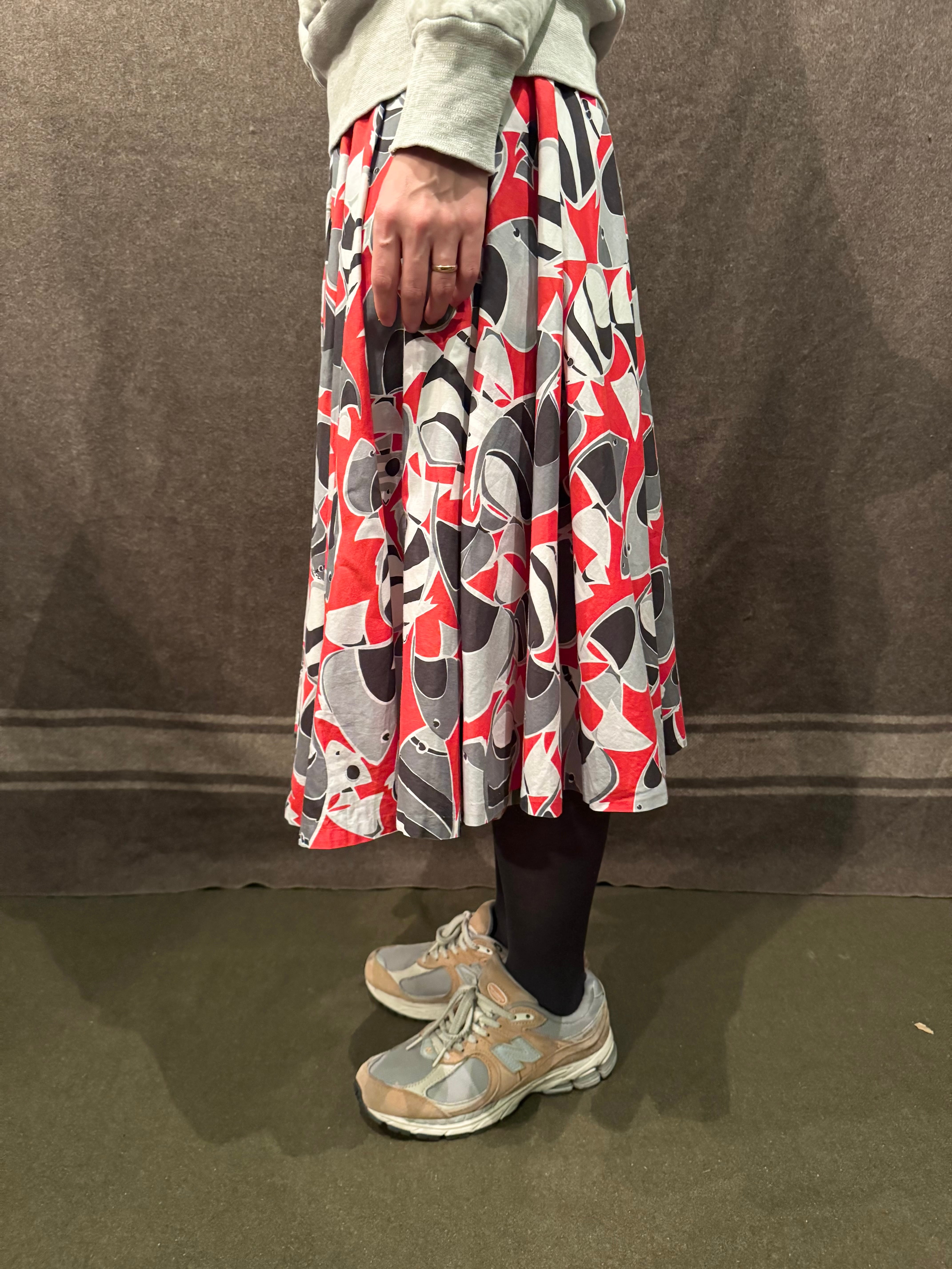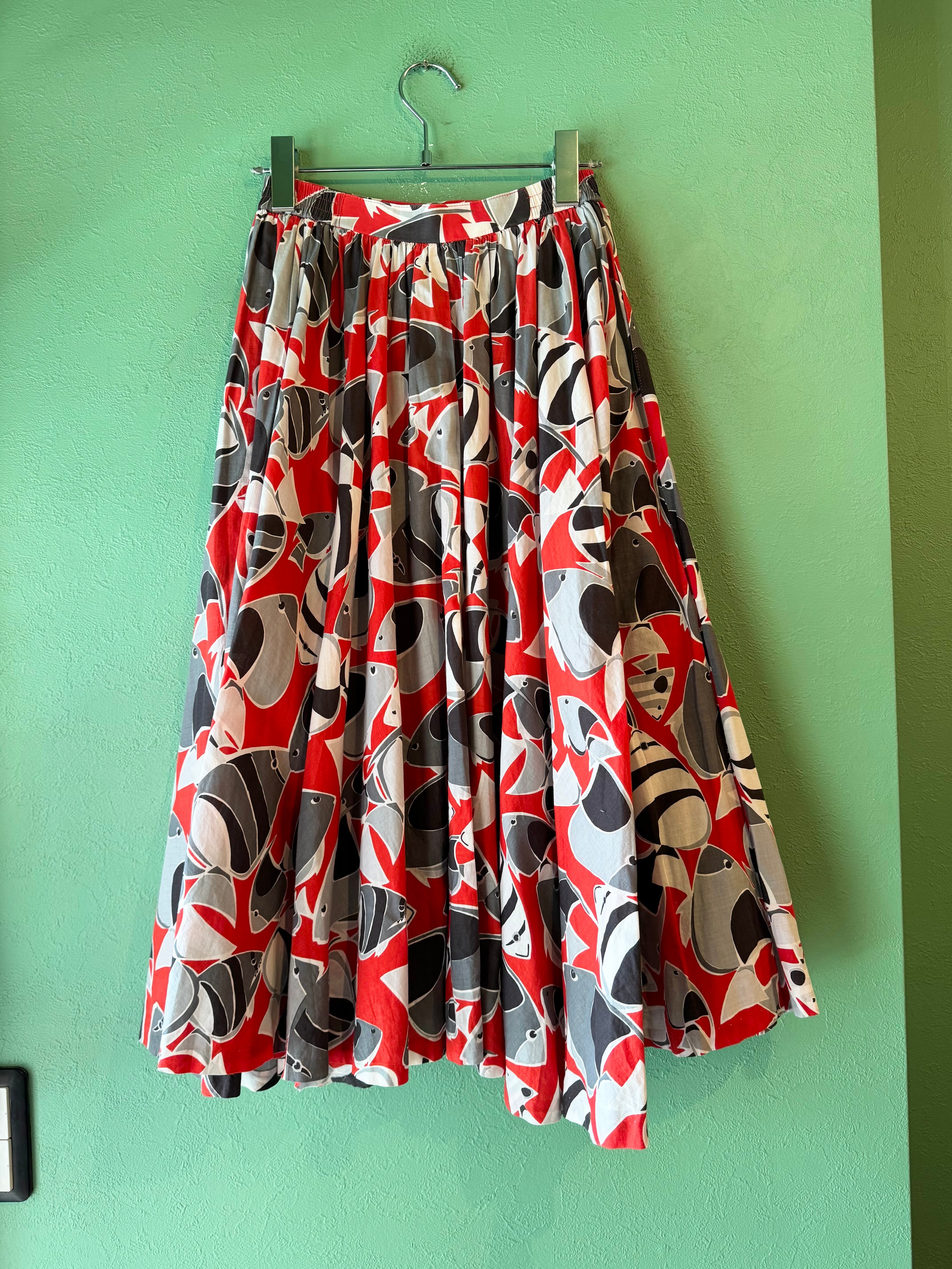 こちらはインパクト大な魚柄のロングスカート。レトロポップなカラーリングにドレープの効いた可愛らしいフレアシルエットになっています。