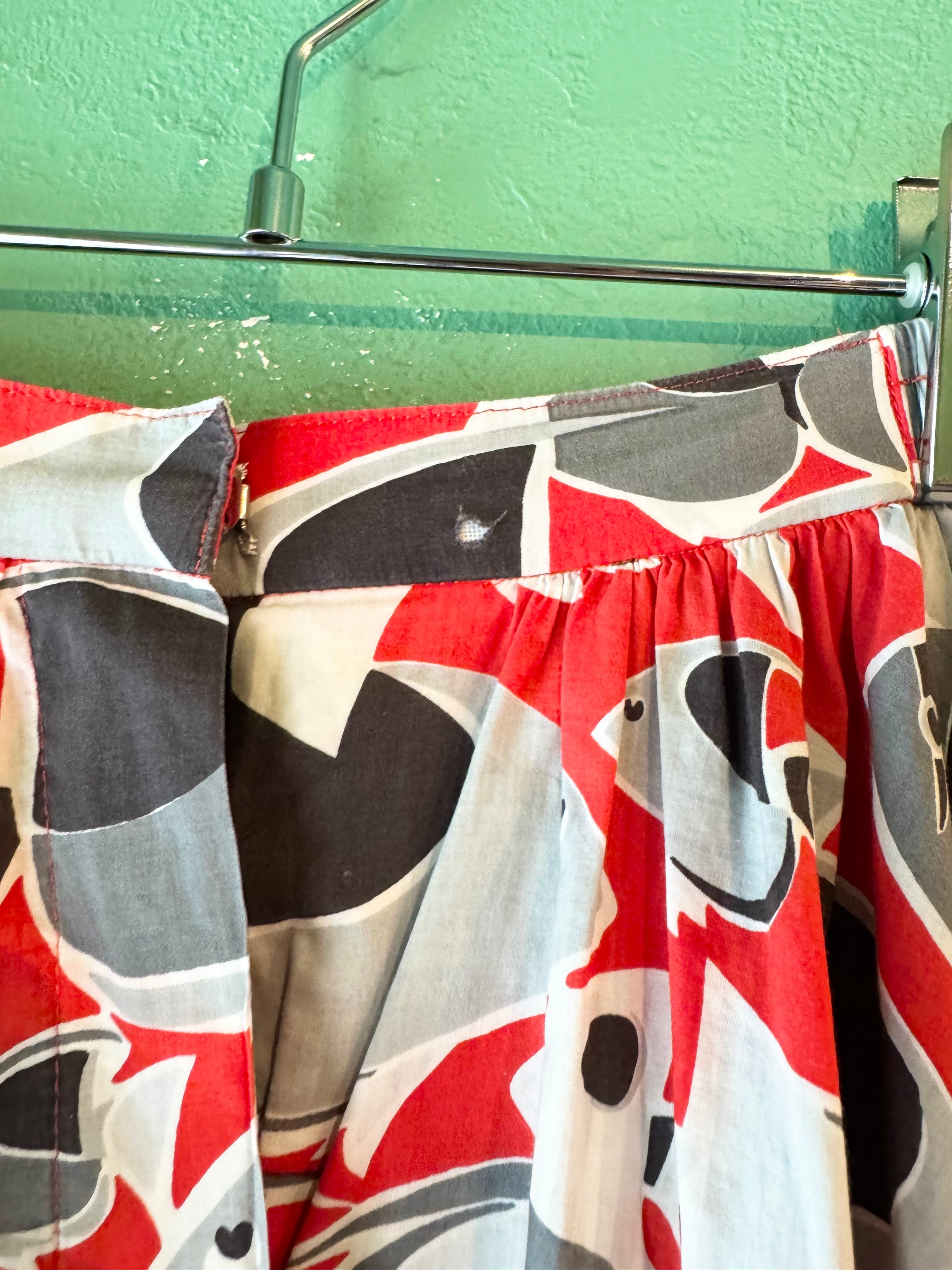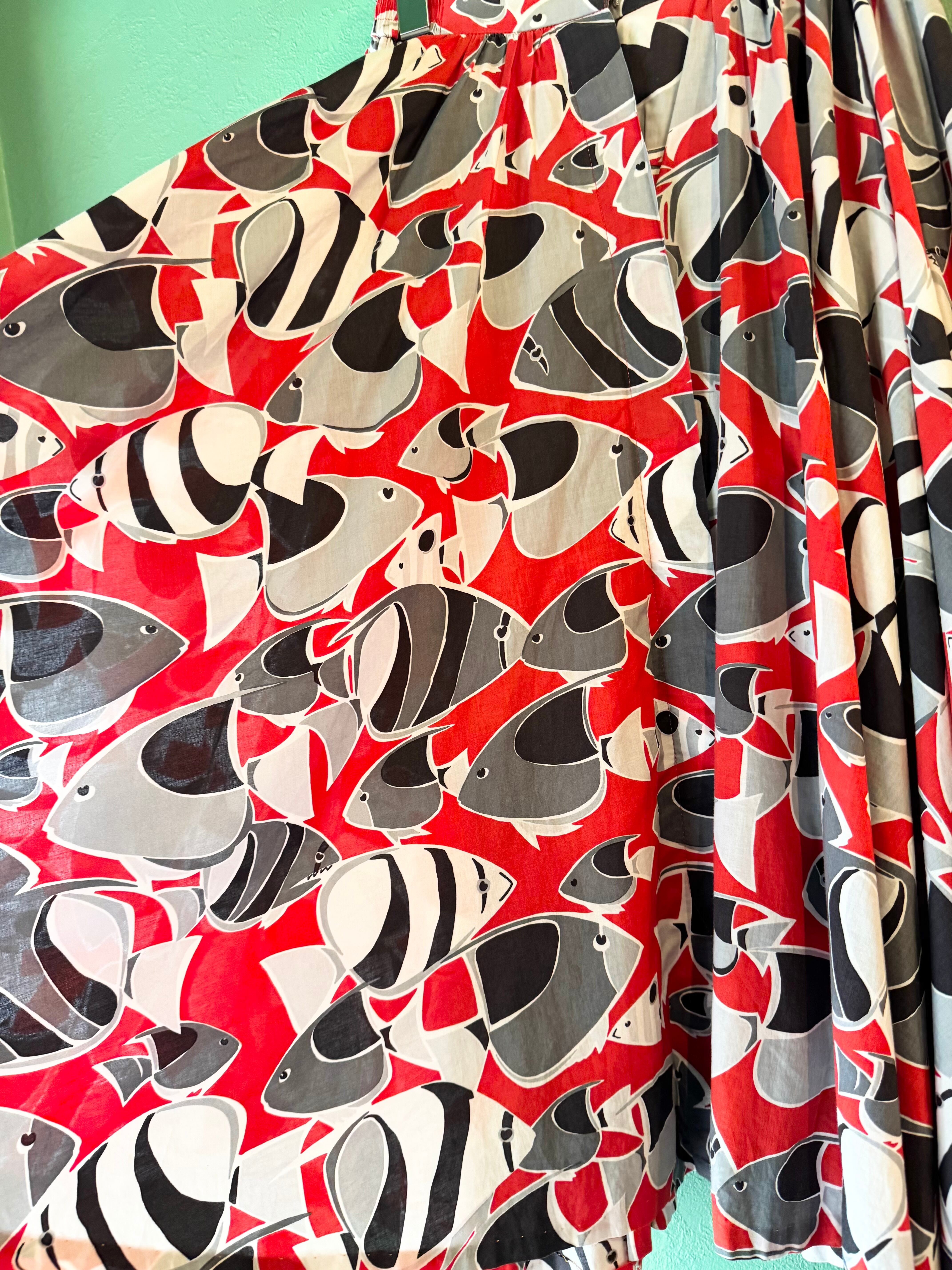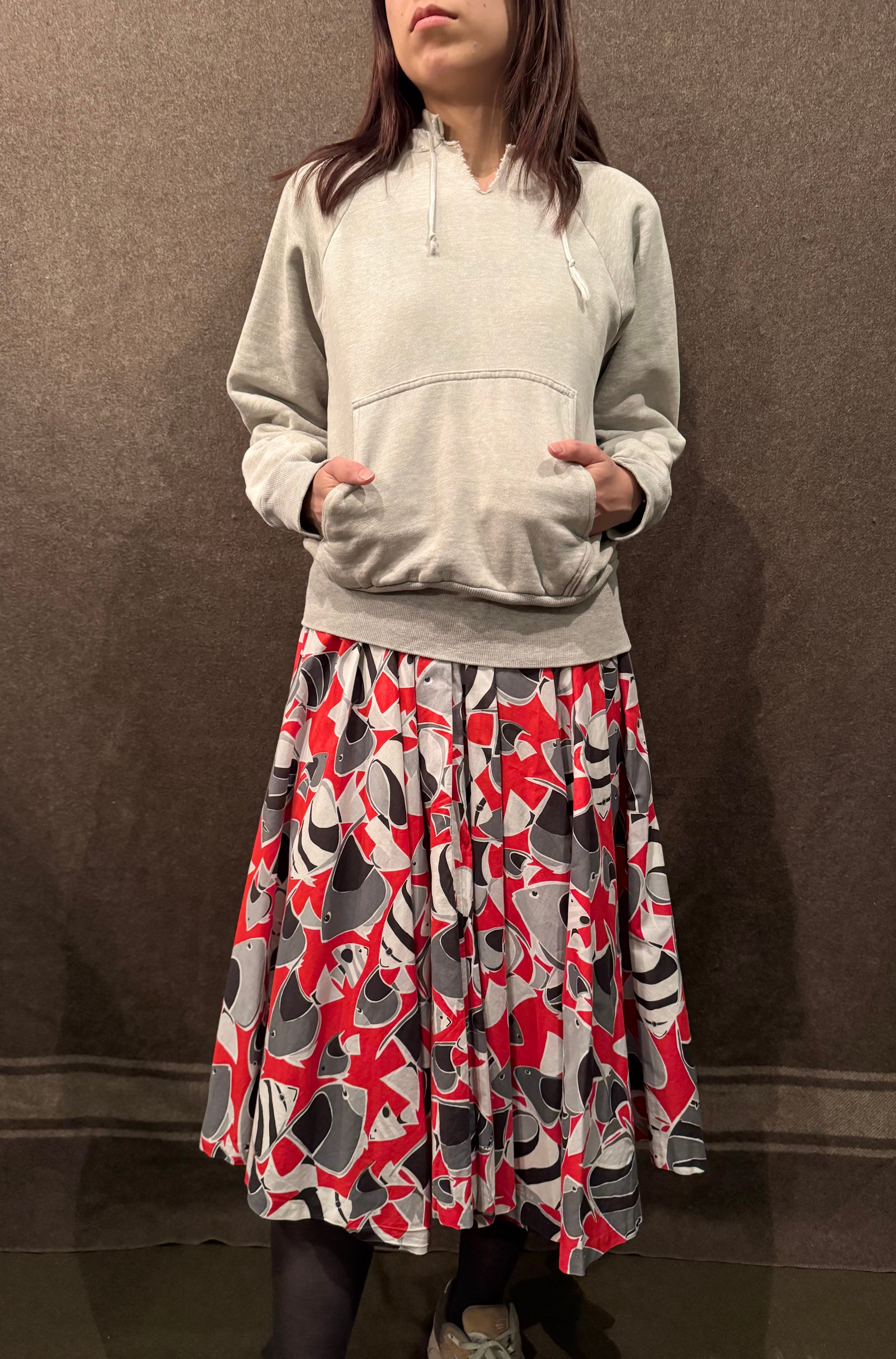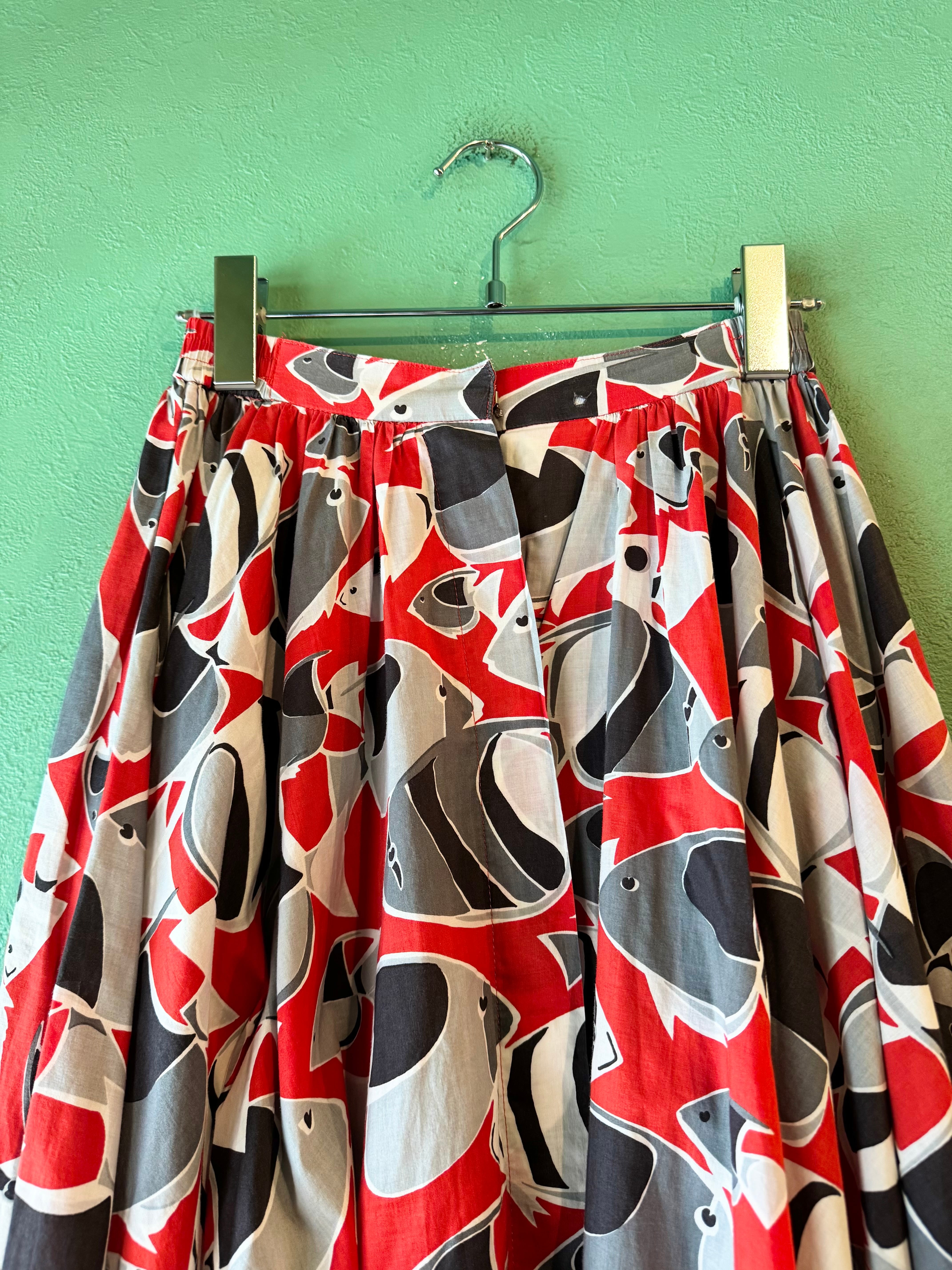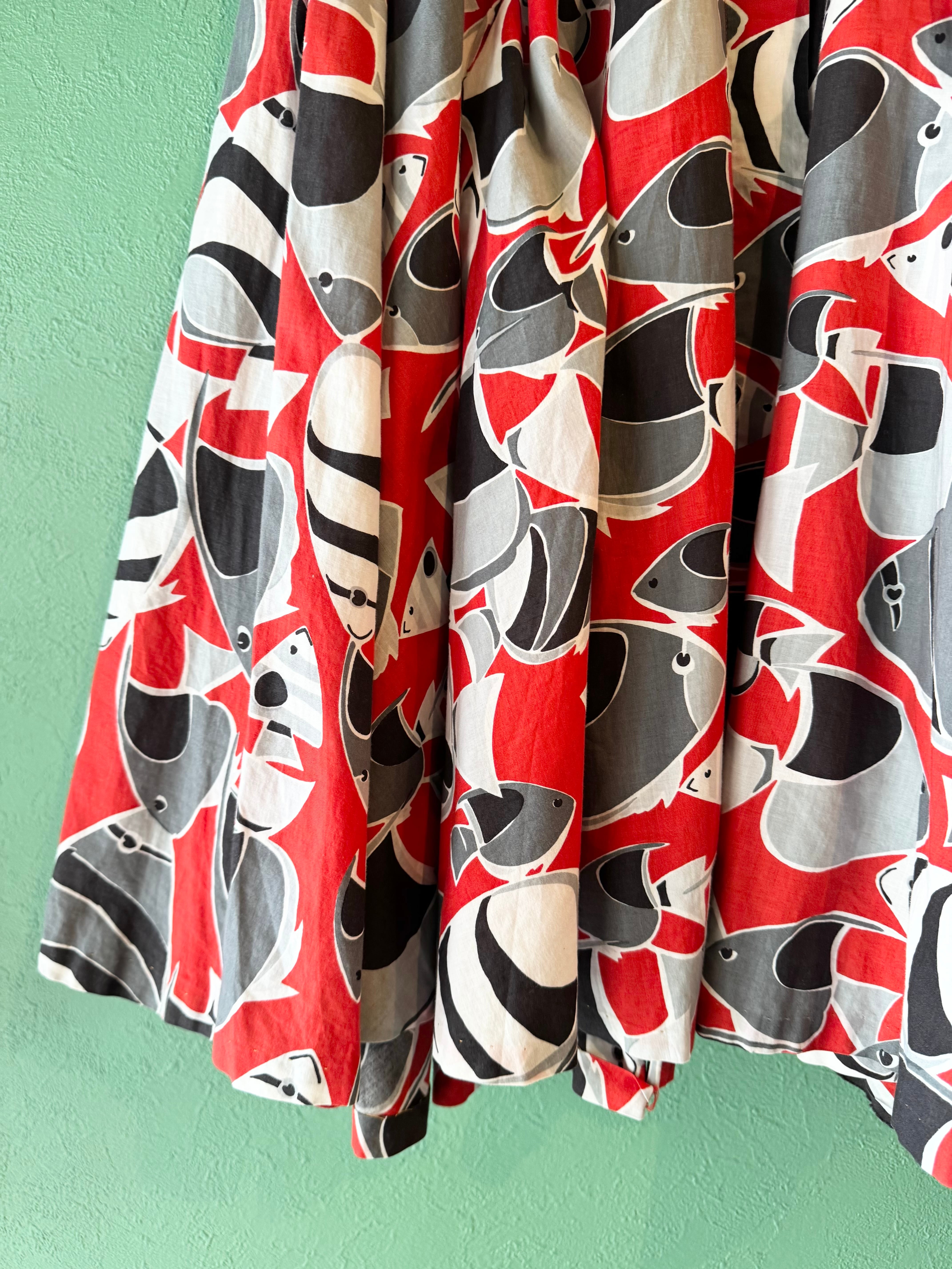 こちらはインパクト大な魚柄のロングスカート。レトロポップなカラーリングにドレープの効いた可愛らしいフレアシルエットになっています。