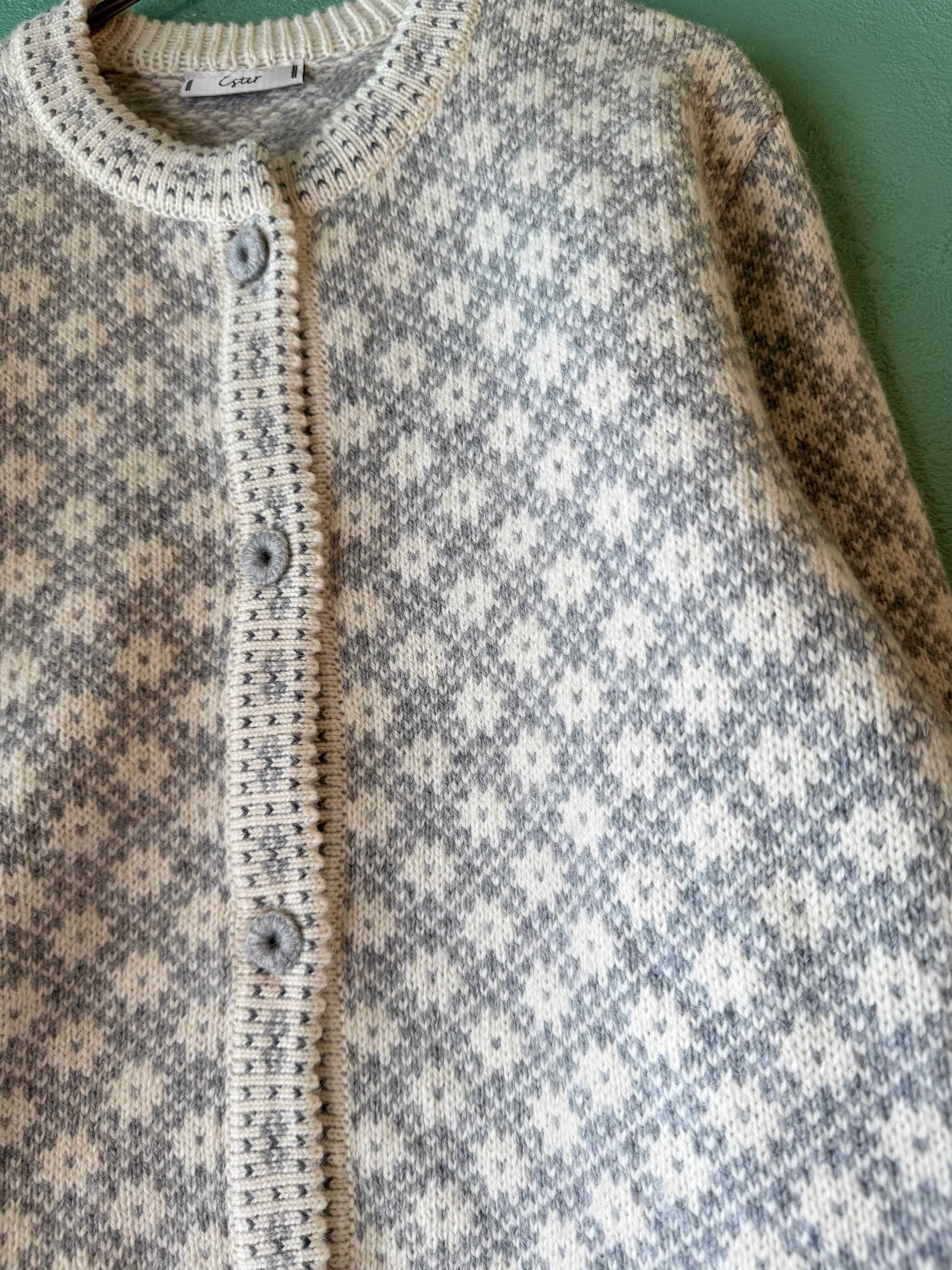 こちらは雪の結晶?のような総柄が可愛いニットカーディガン。