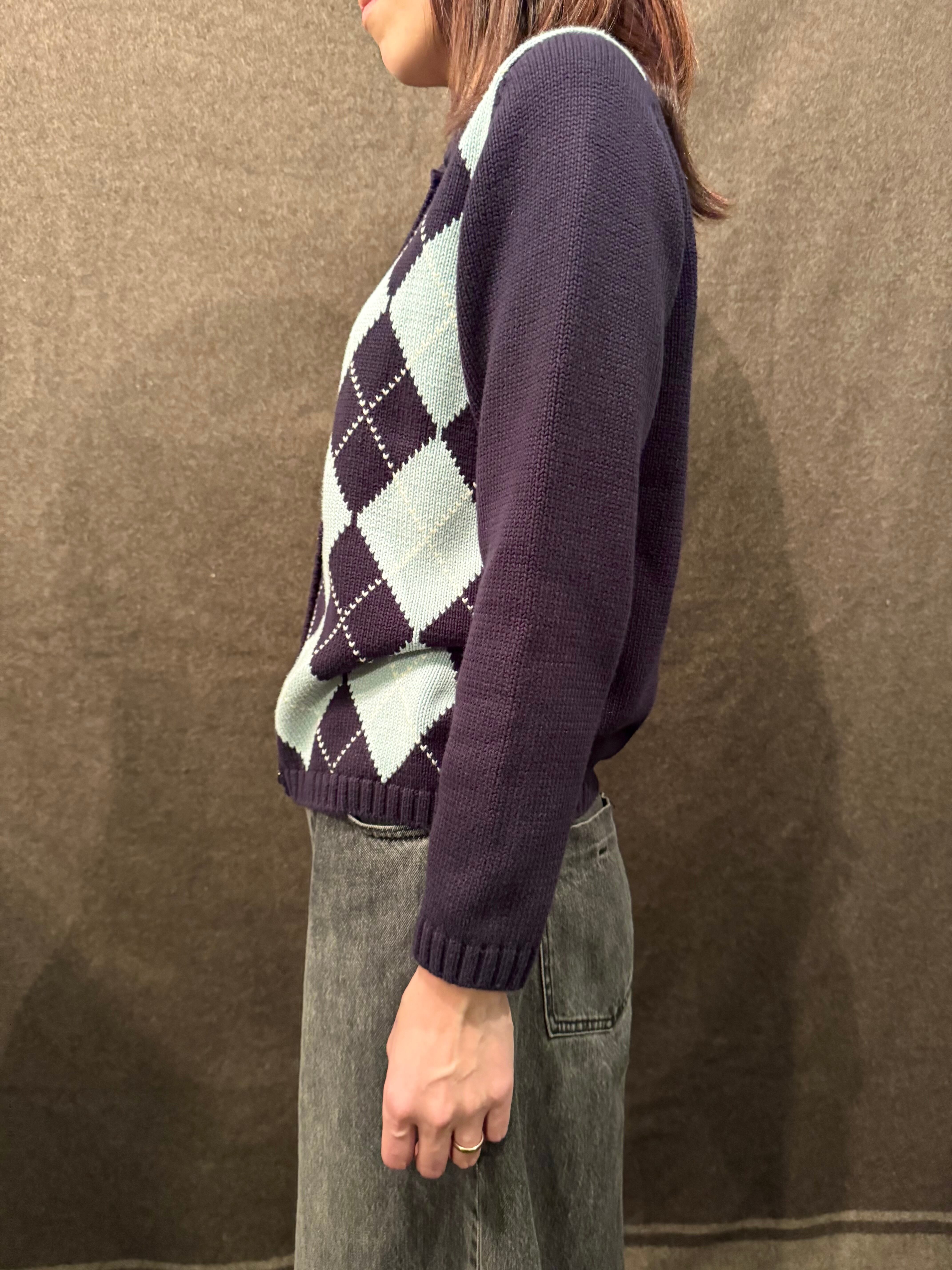 ネイビーをベースとした水色のアーガイルパターンに通年着れるコットン素材となっています。