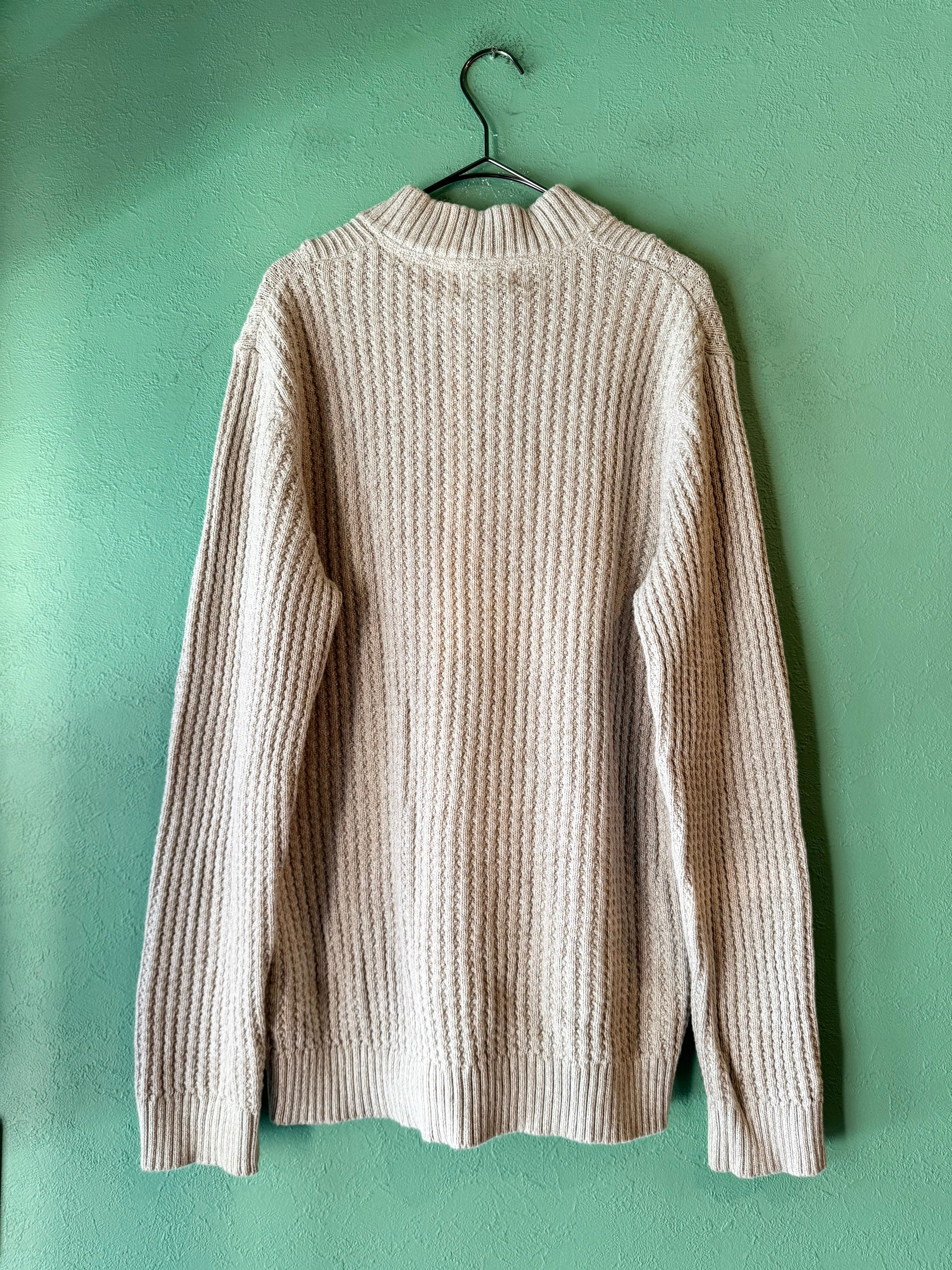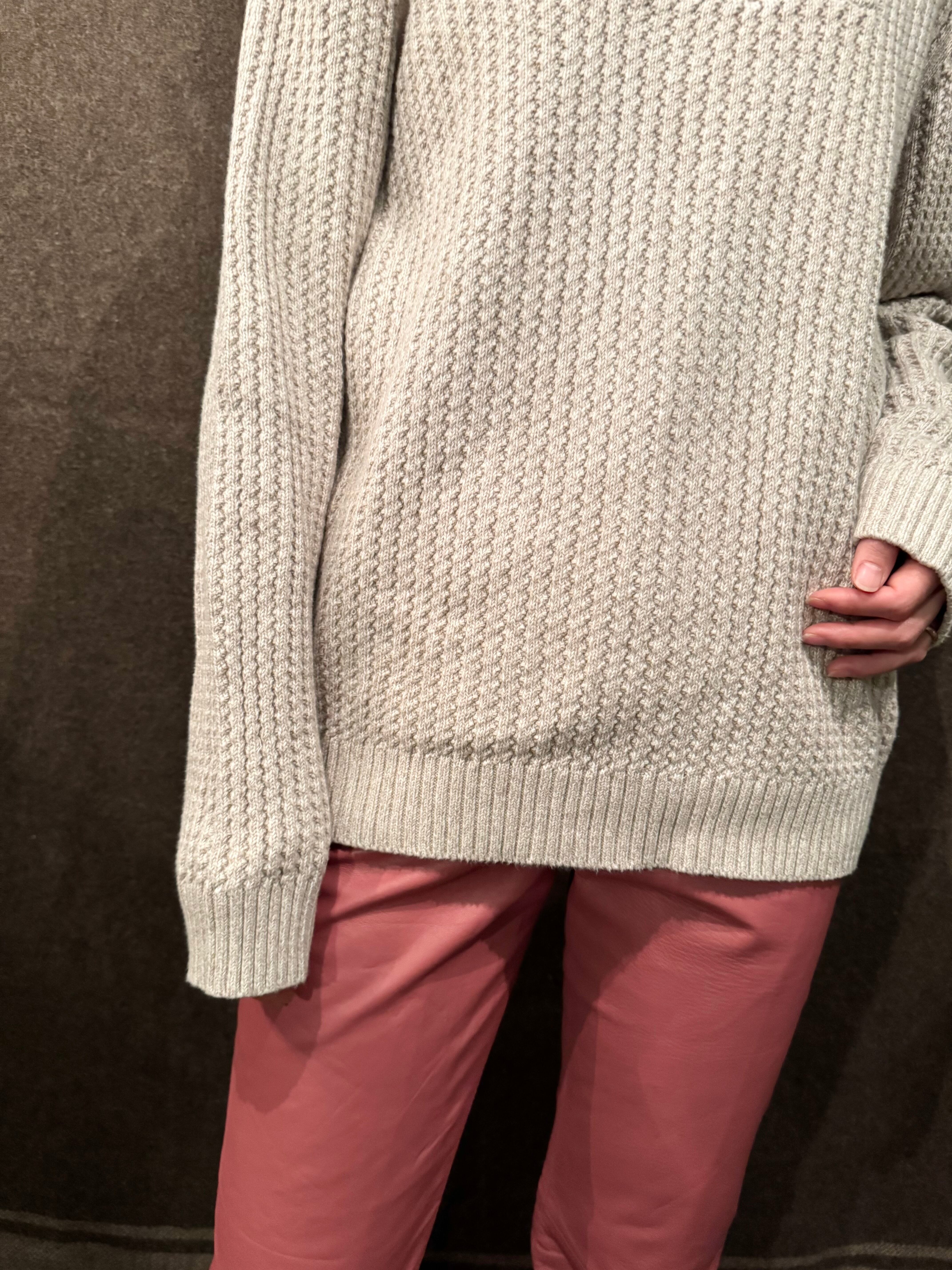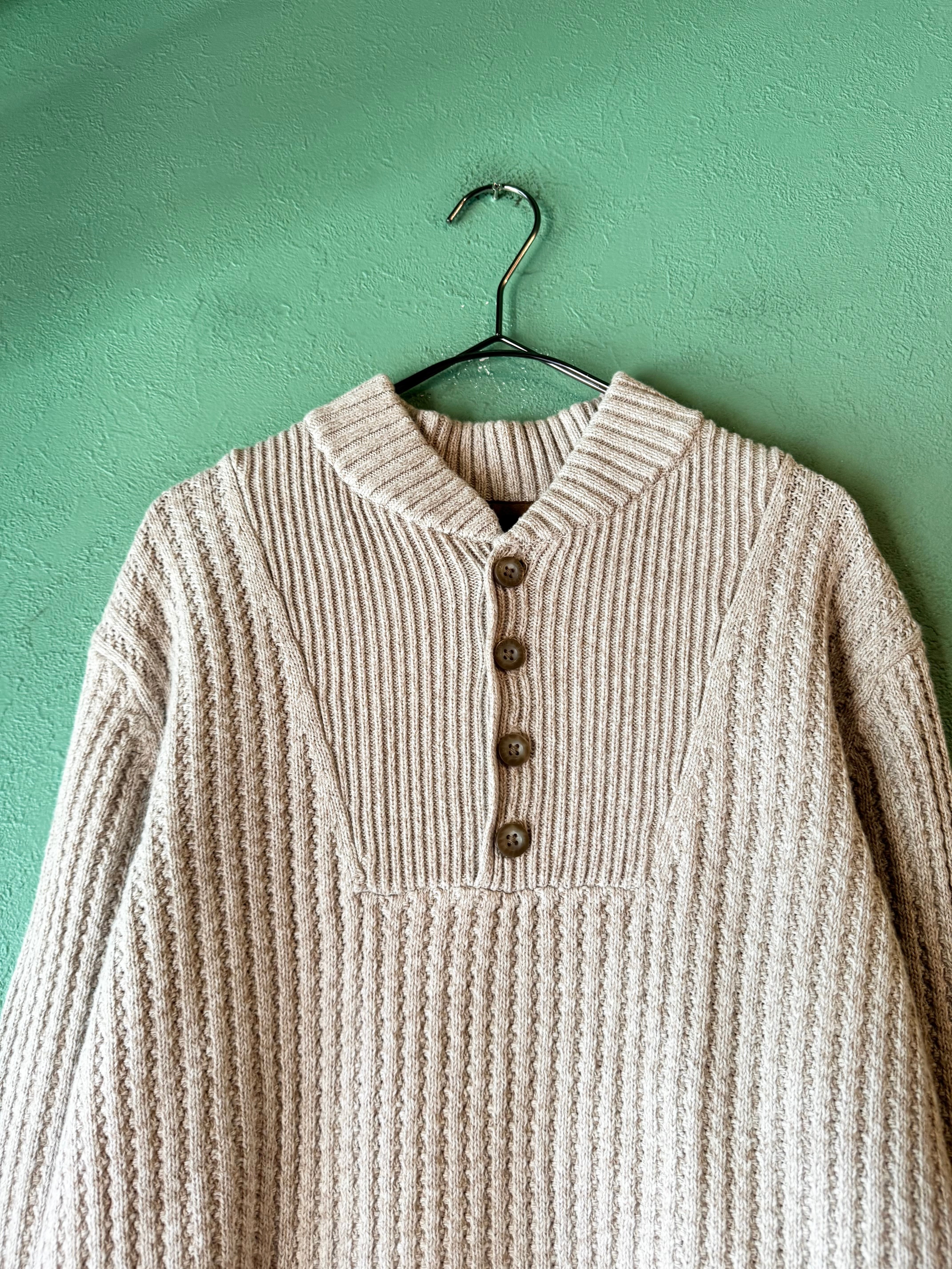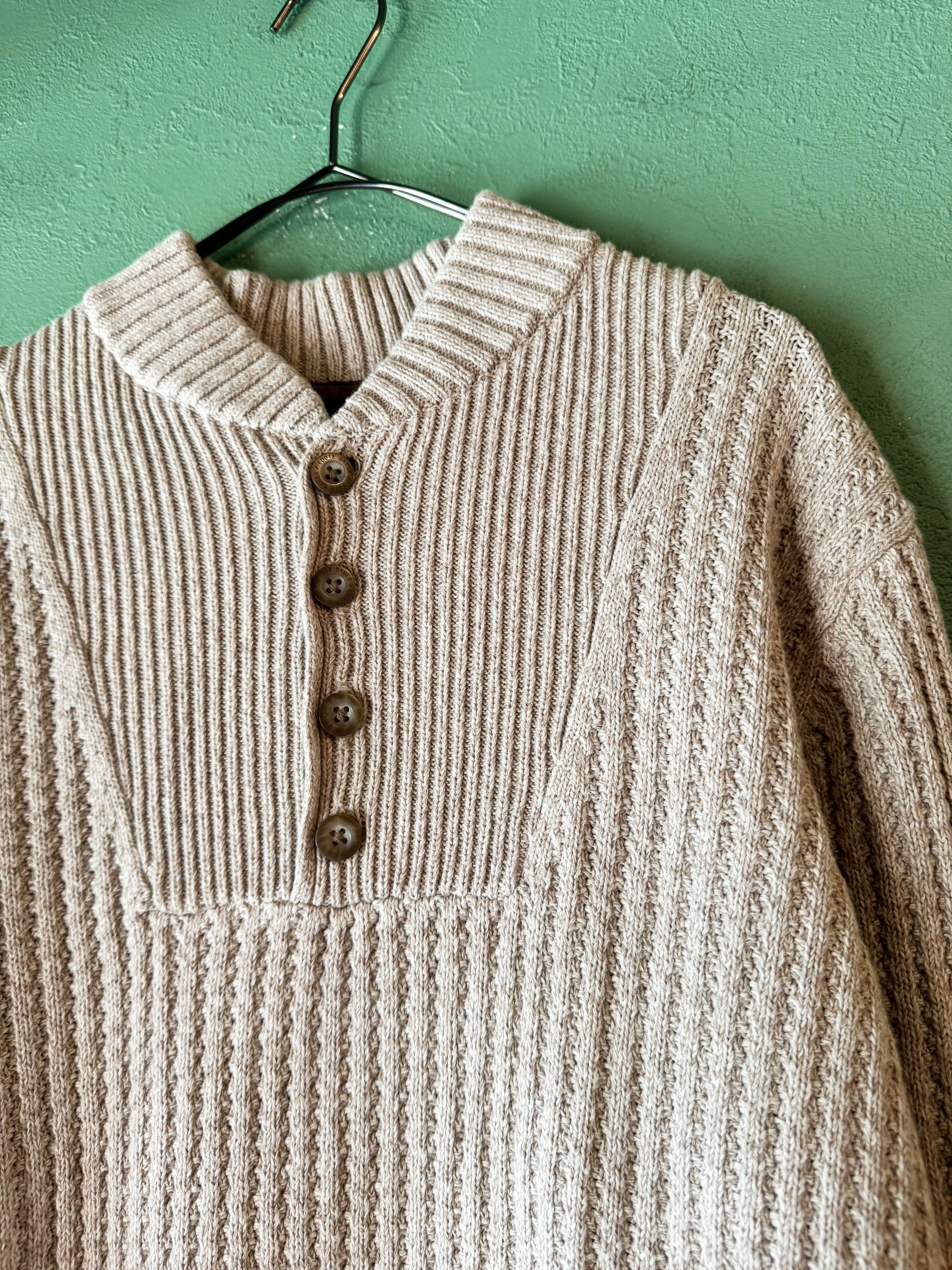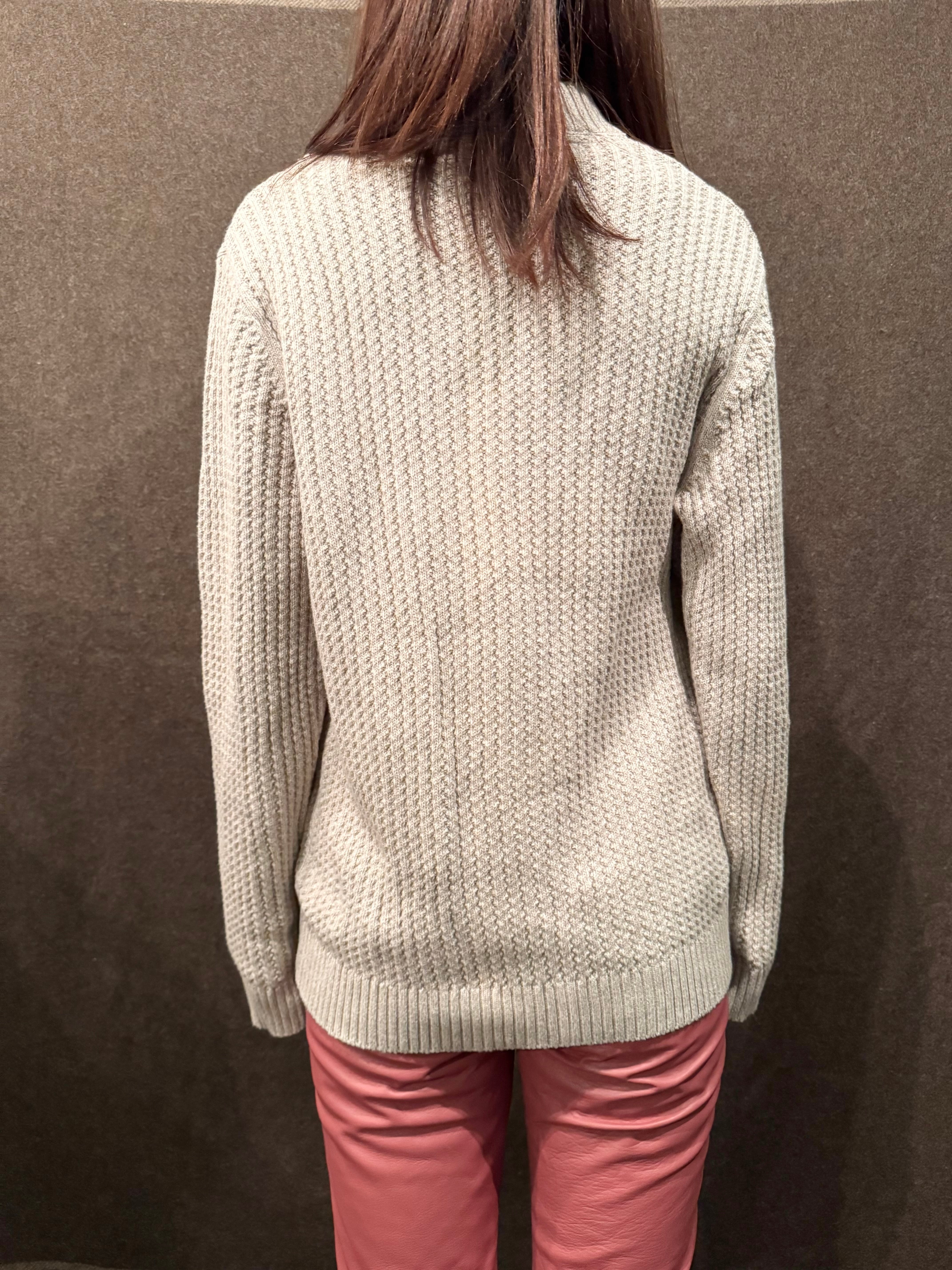 こちらは小慣れ感の出るヘンリーネックに凹凸のあるワッフルのようなデザイン編みの可愛いニット。