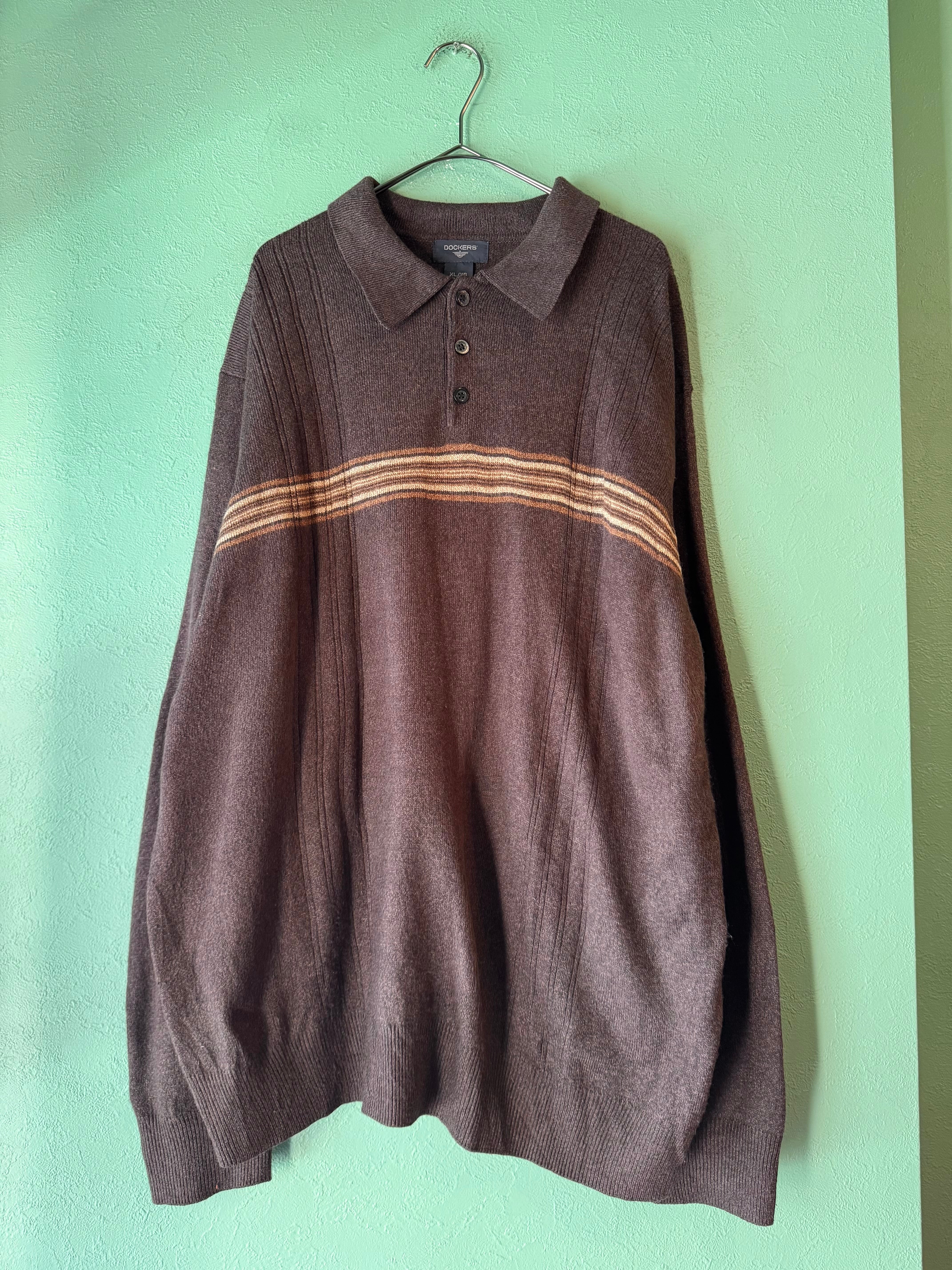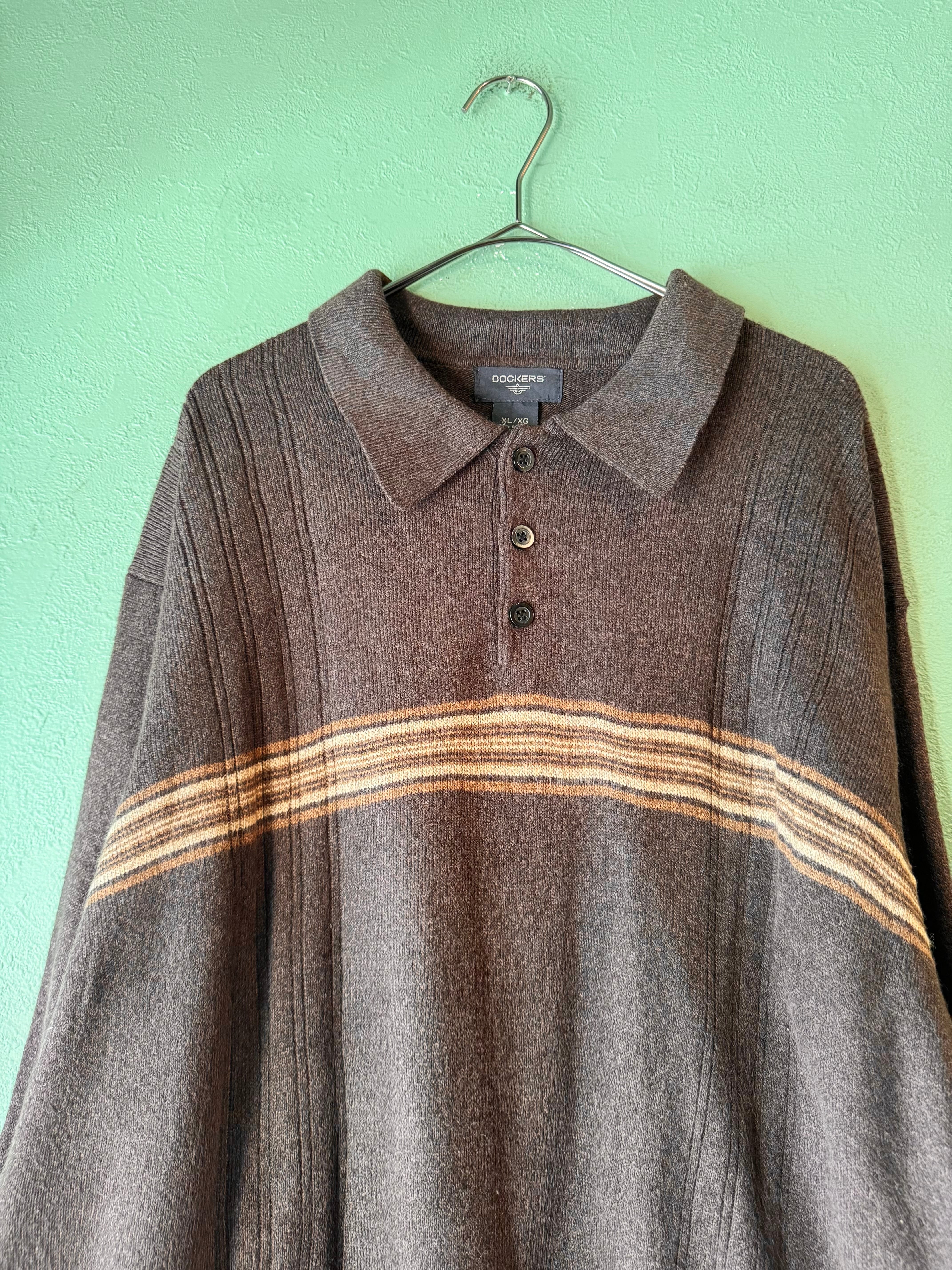 こちらはシックなブラウンカラーにフロントにはラインデザインがアクセントになったニットポロシャツ。