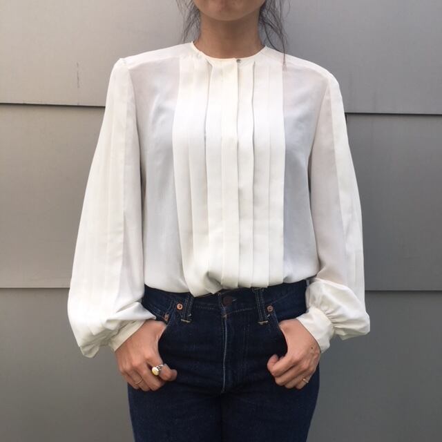 ■60~70年代頃のLouis Feraudのプリーツブラウスです。フロント部分はもちろん、袖にかけてまでプリーツの入っている珍しいデザイン。こちらも袖の部分がゆったりとしたややバルーン調の作り。