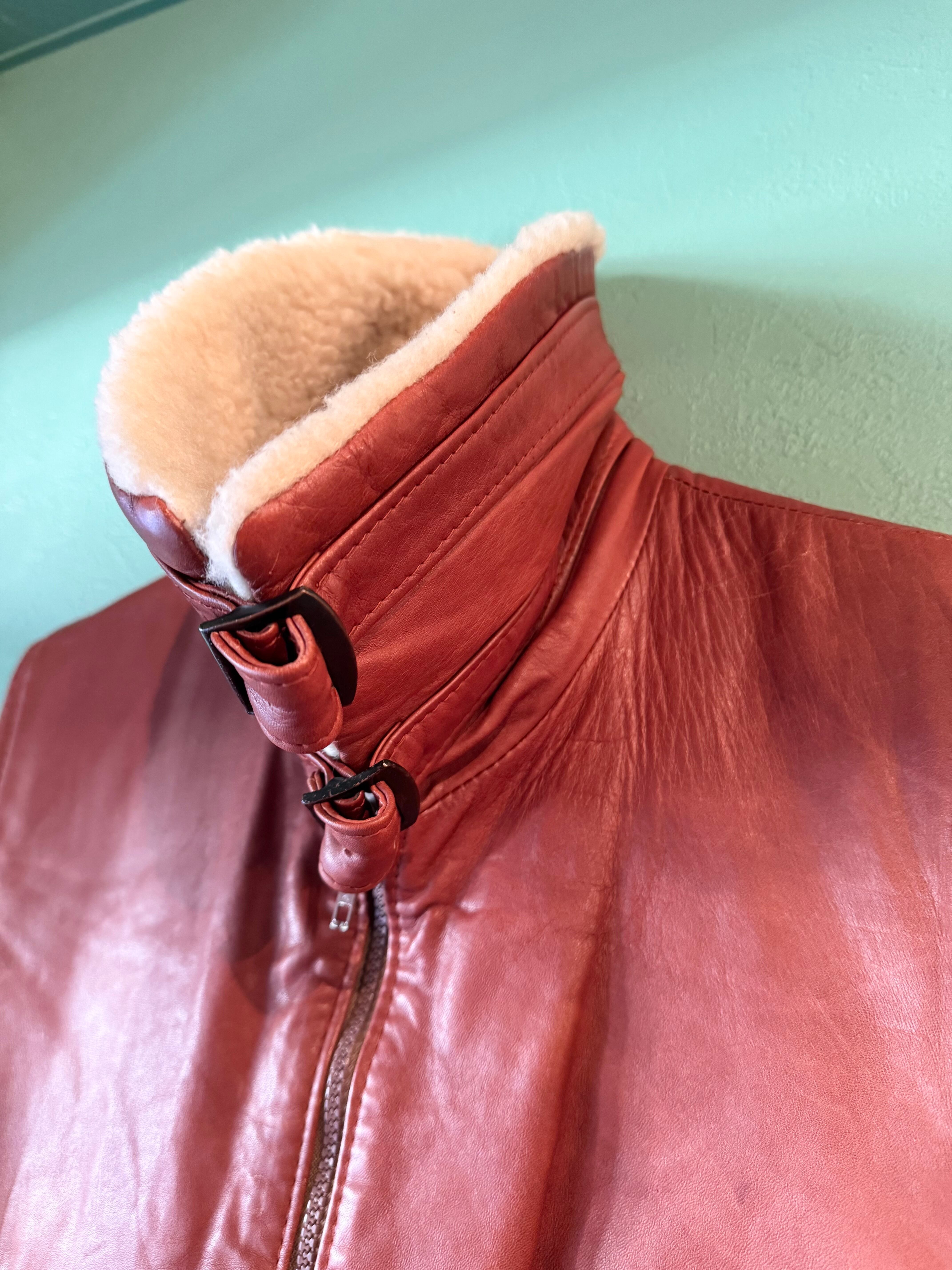 赤味の強いブラウンレザーにボアの切り替えが可愛く、首元はベルトでハイネックのようにできます。