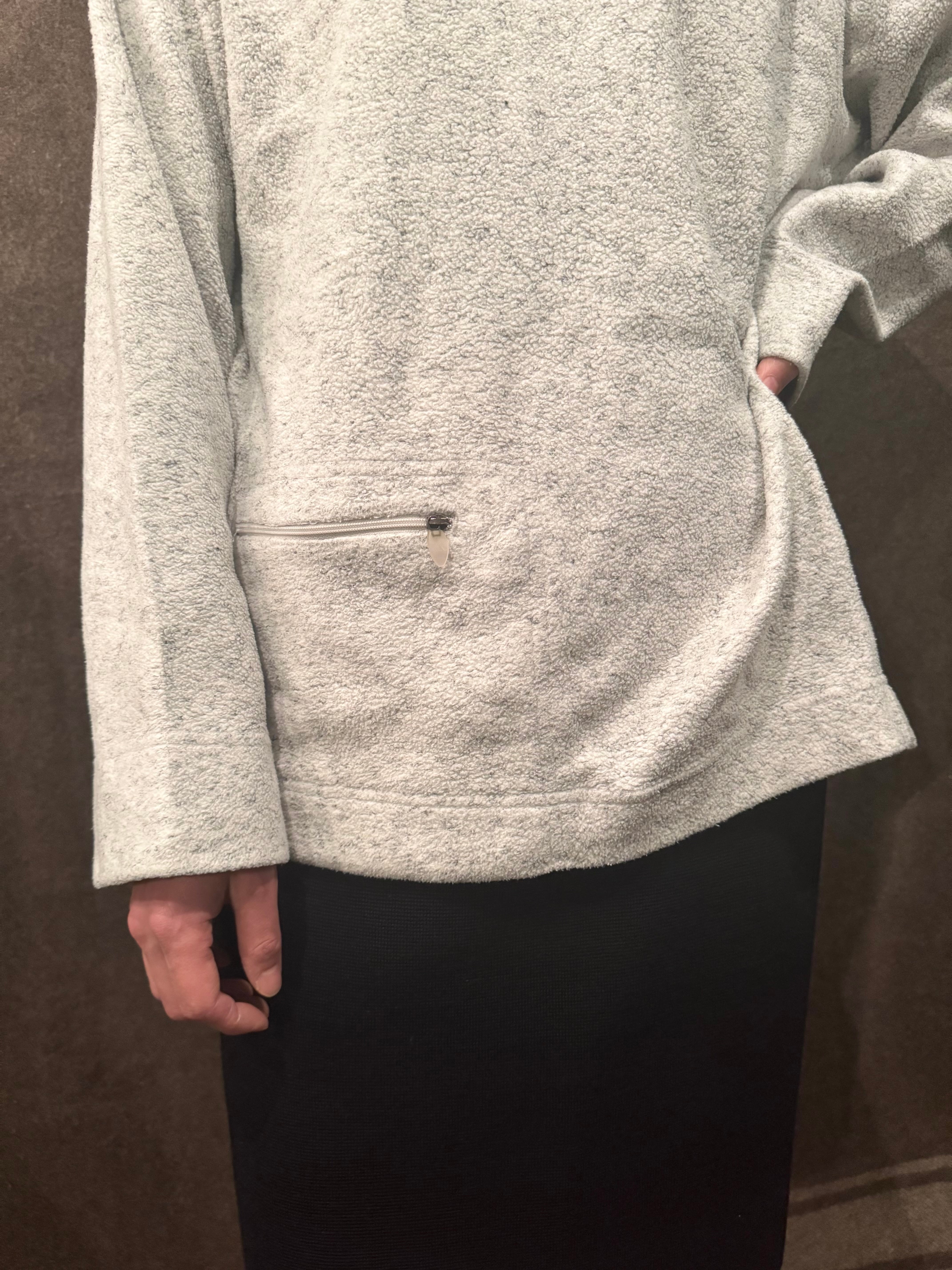 タートルネックのような長めのネックに右裾にはジップポケットのついた面白いデザインになっています。