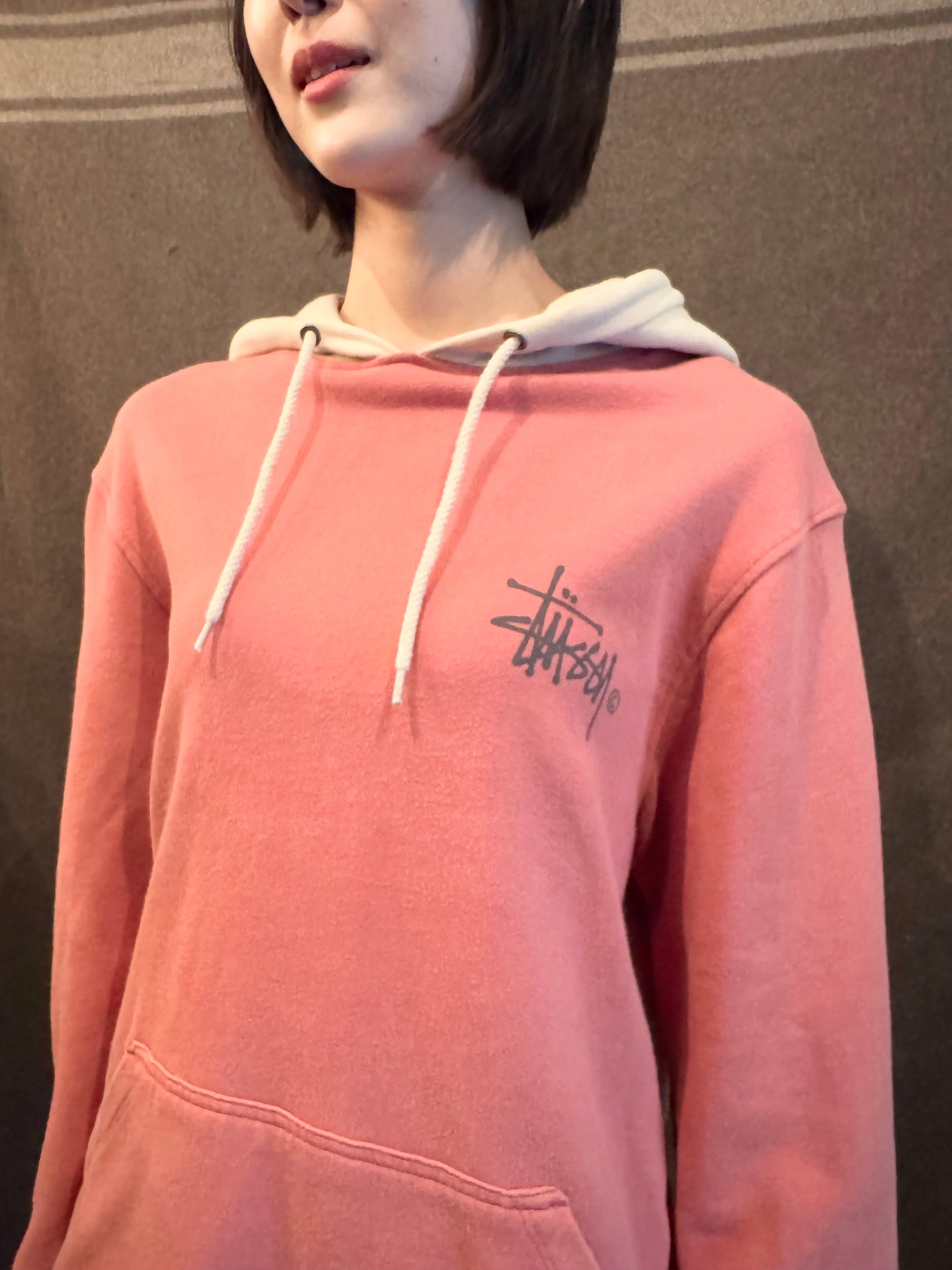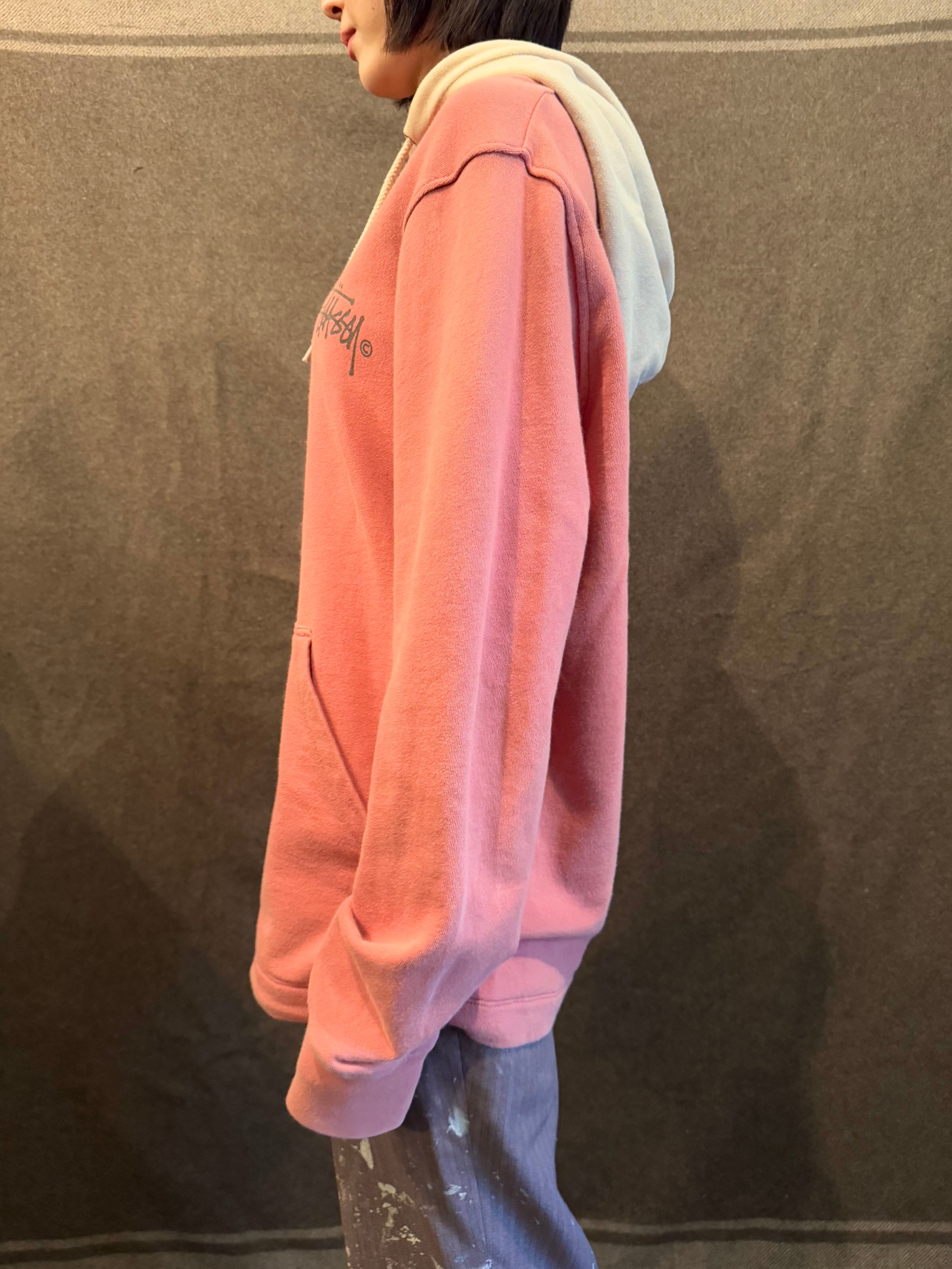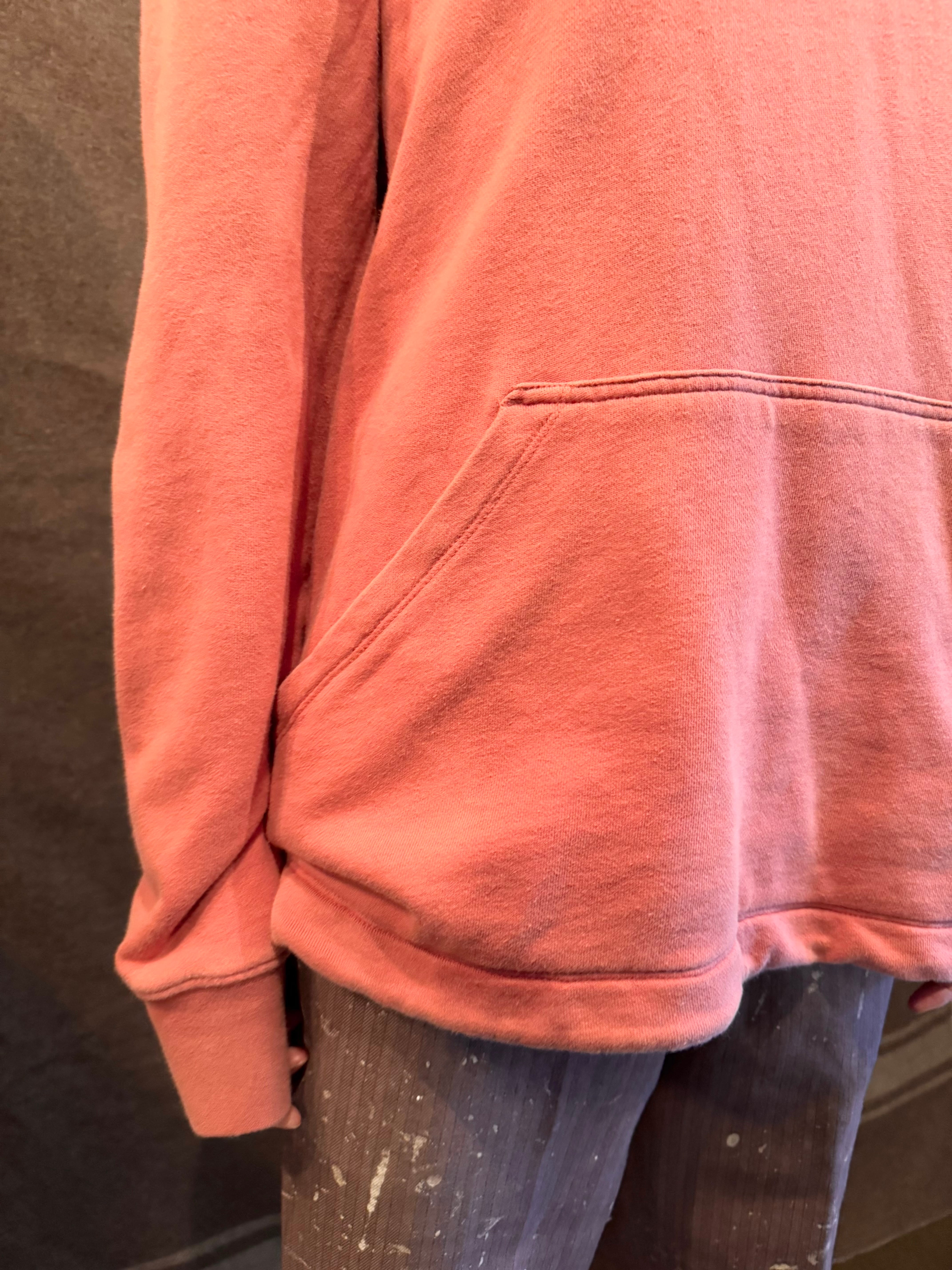 こちらはくすんだピンクカラーのボディーにベージュのフードが切り替わったスウェットパーカー。