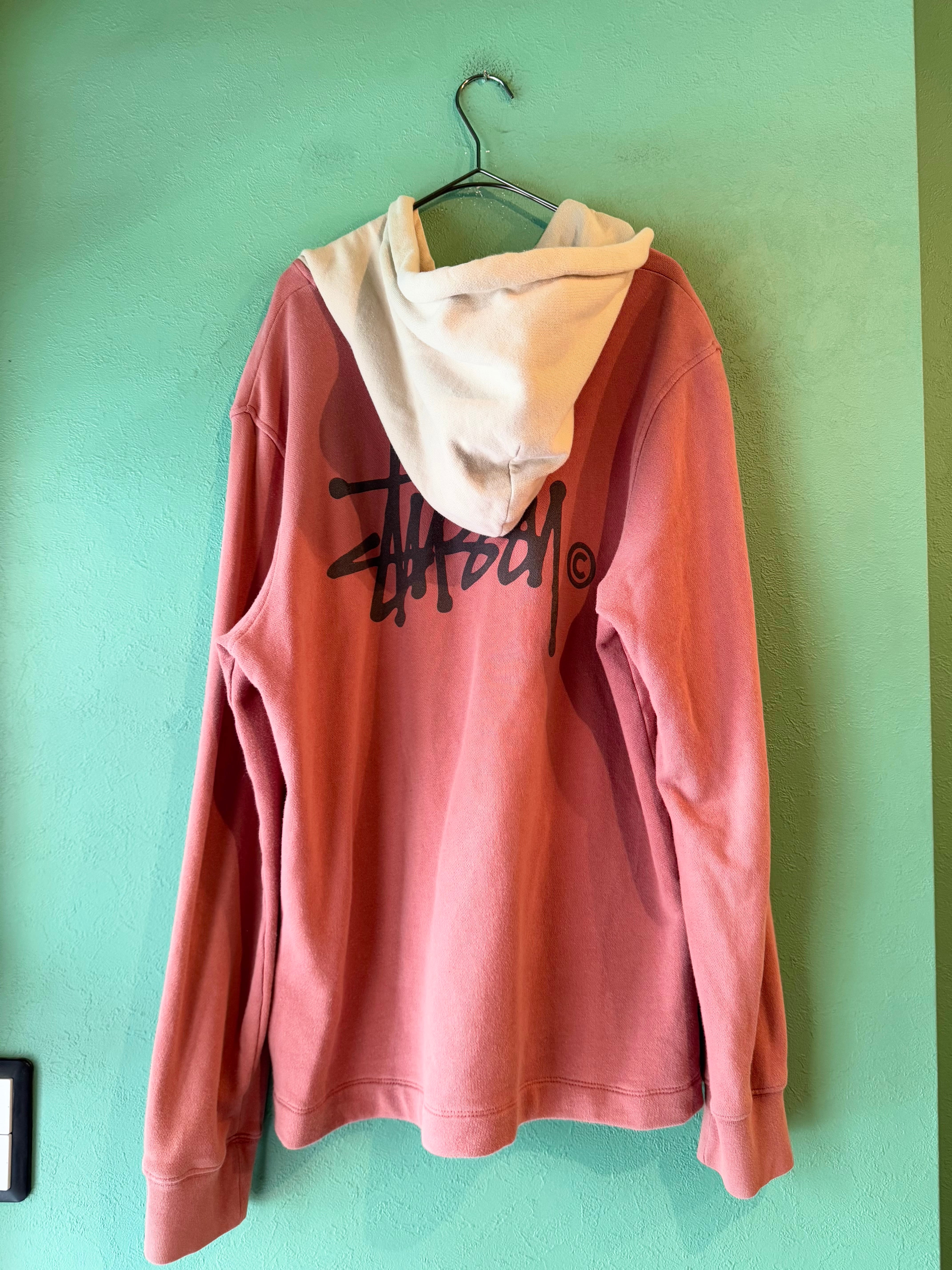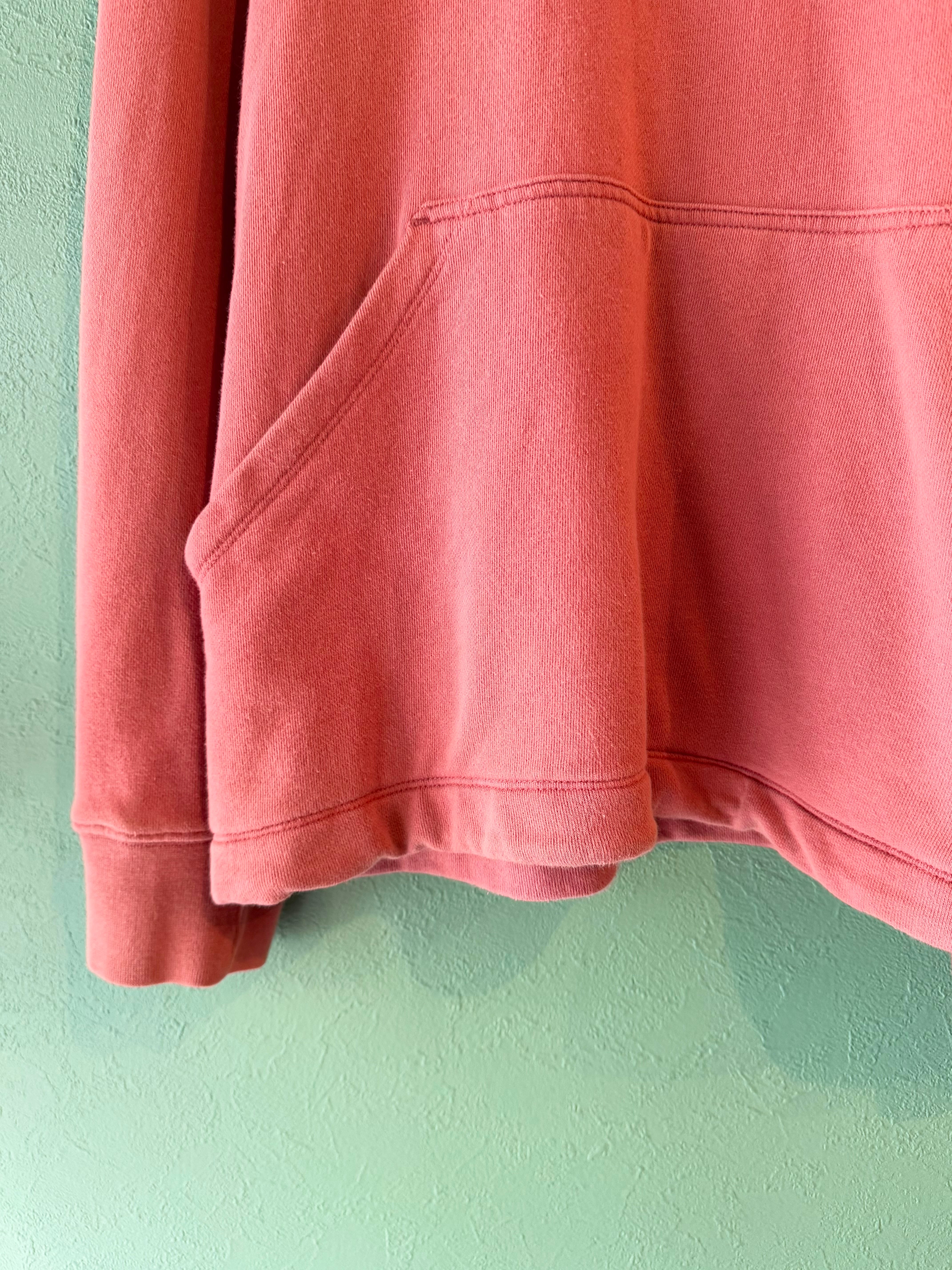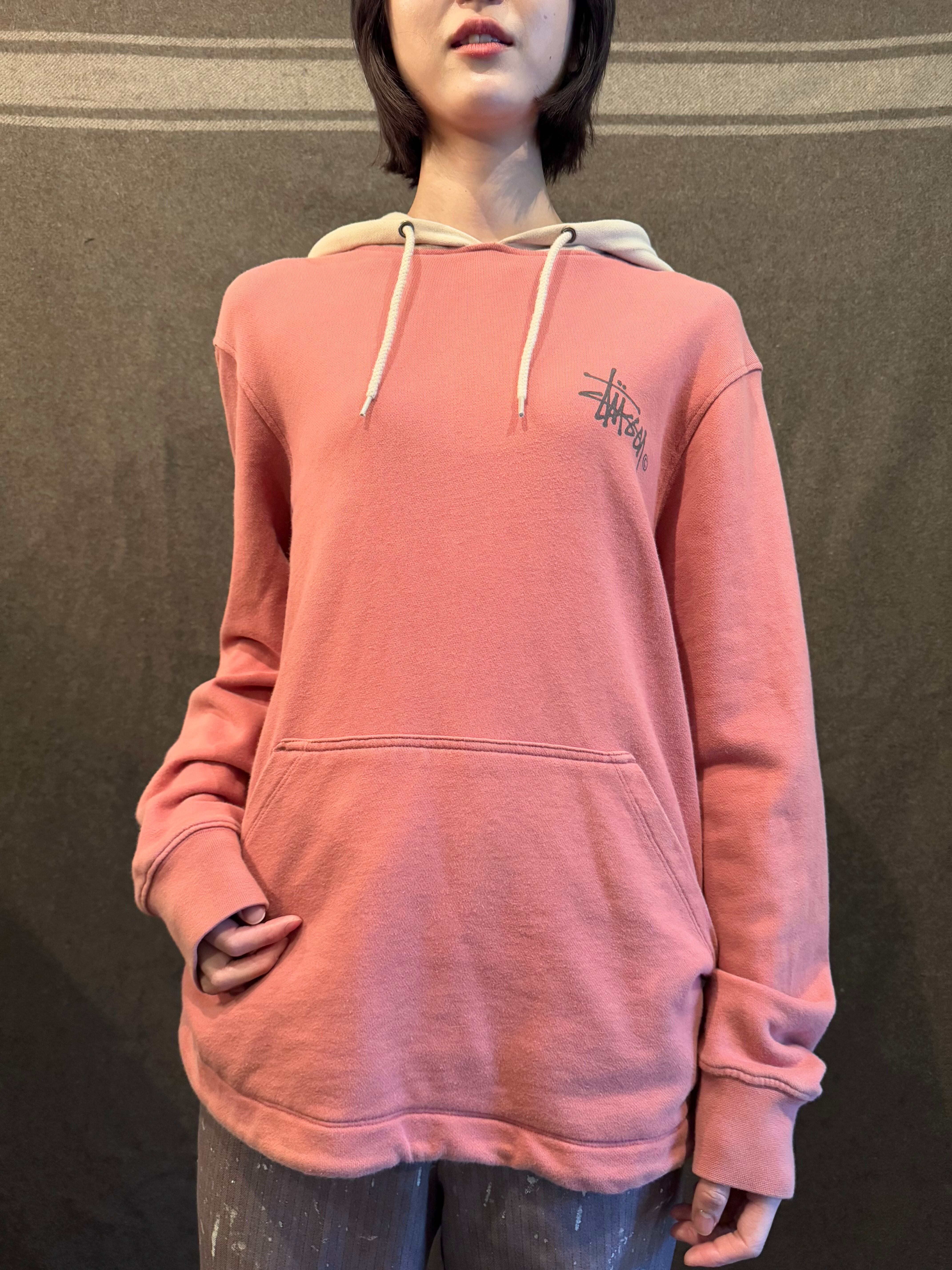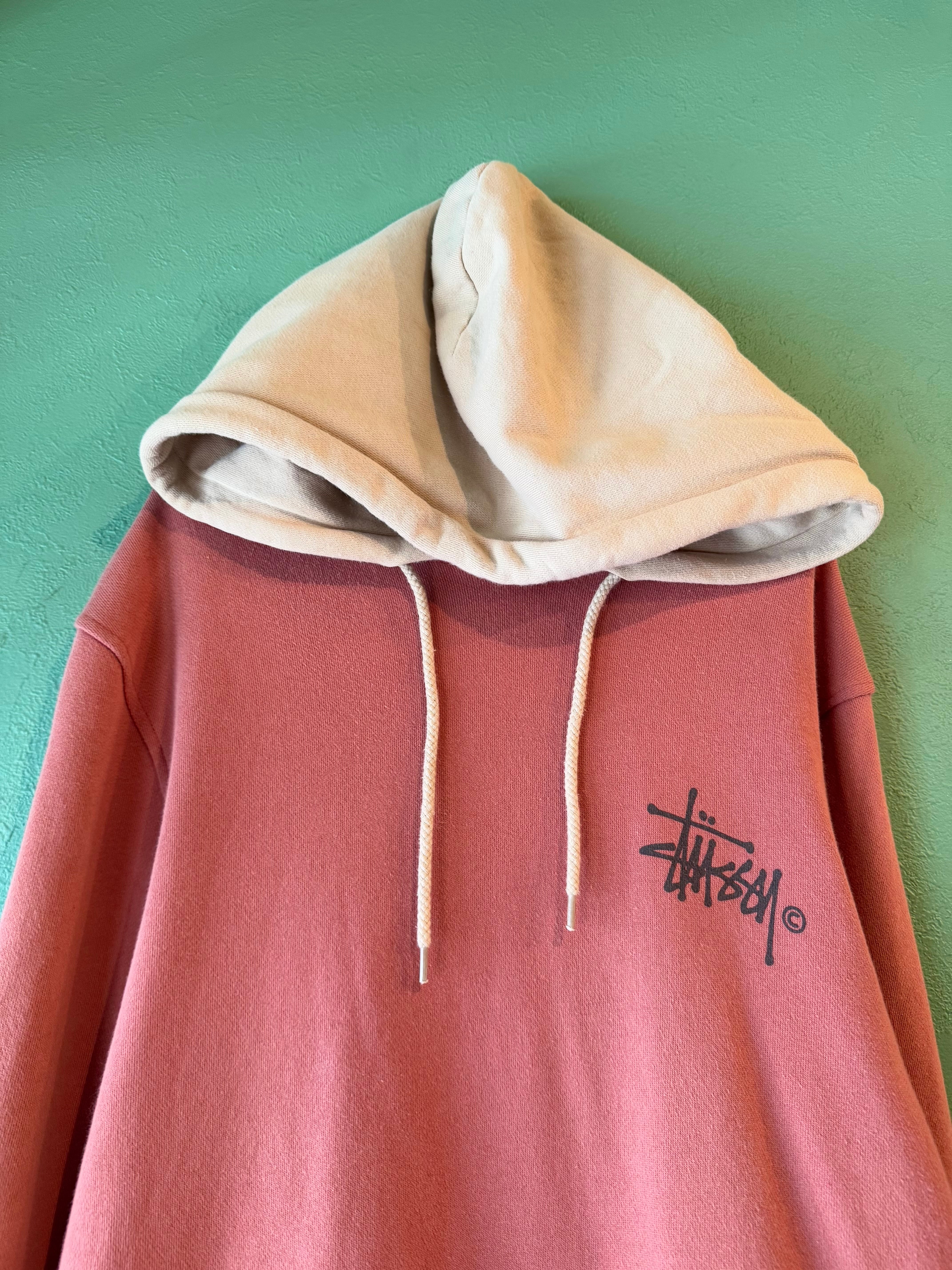 こちらはくすんだピンクカラーのボディーにベージュのフードが切り替わったスウェットパーカー。