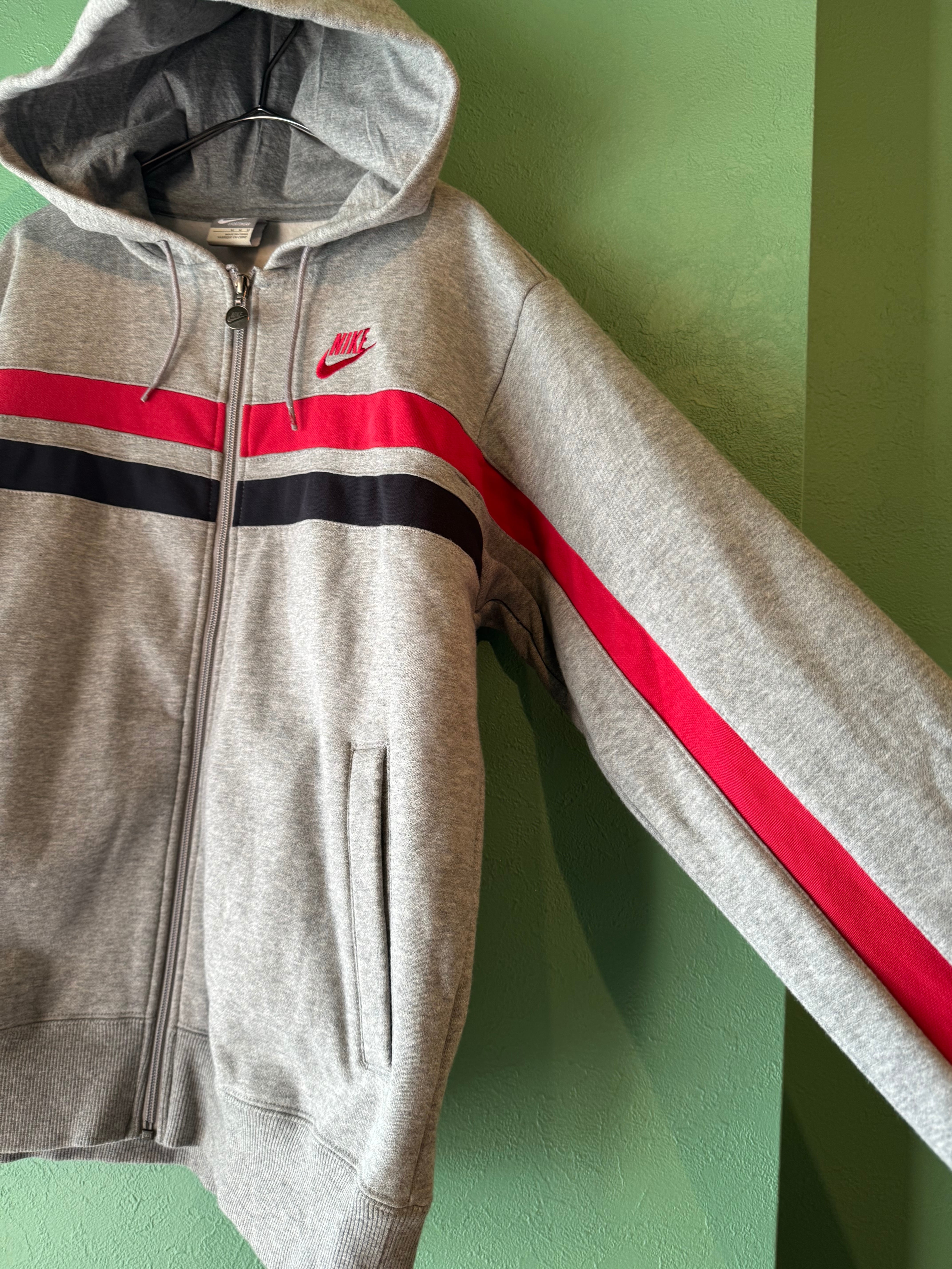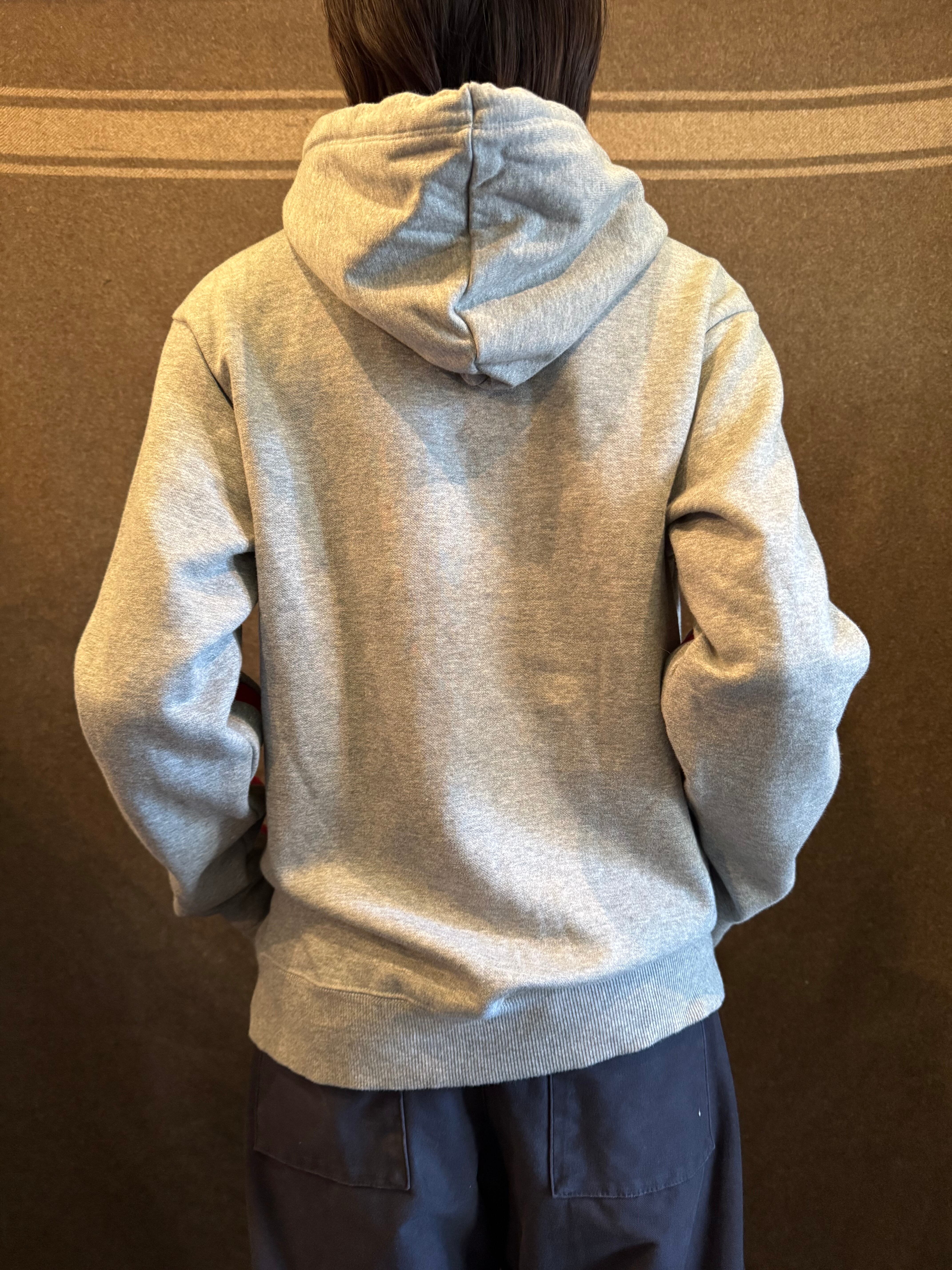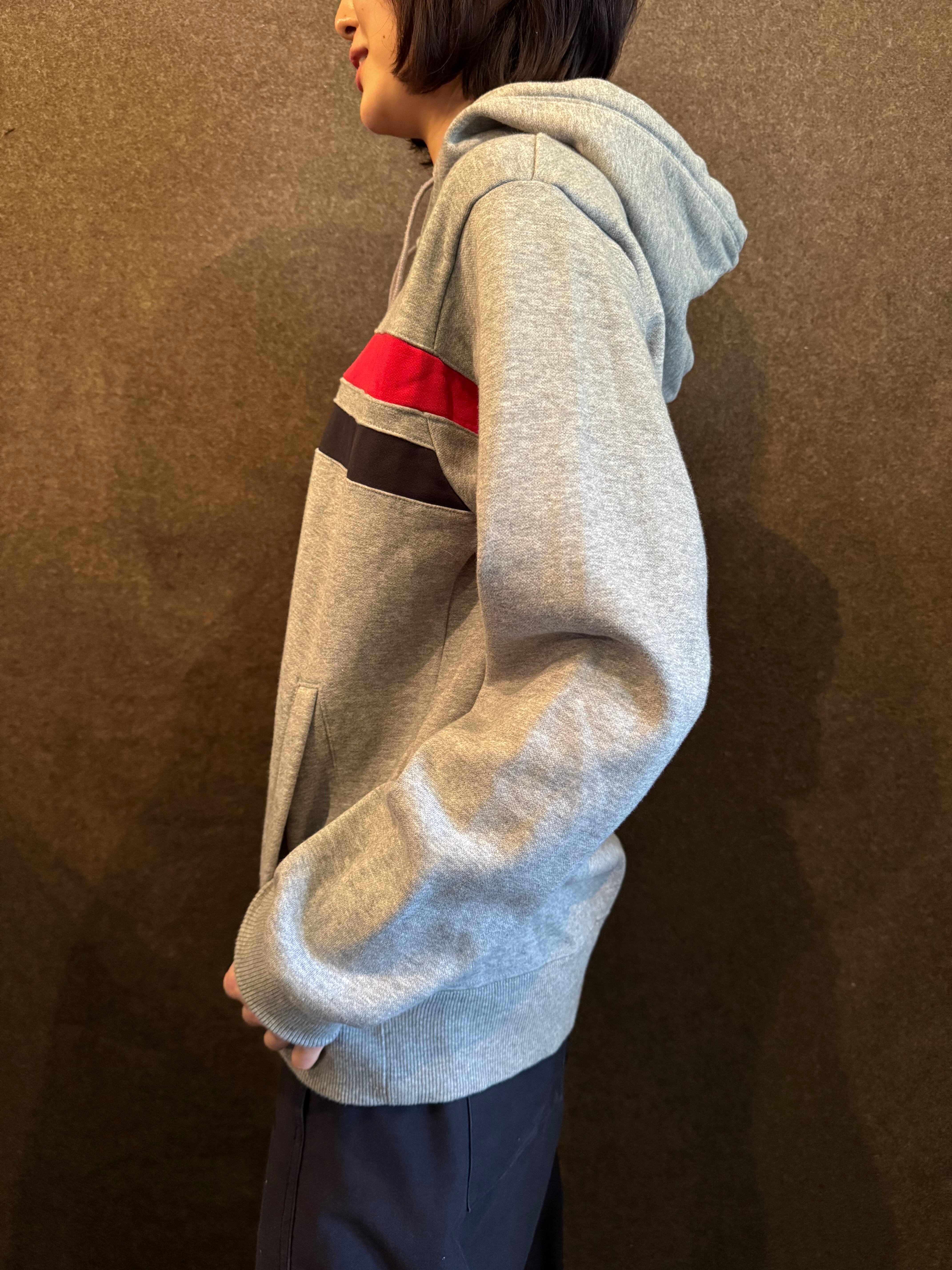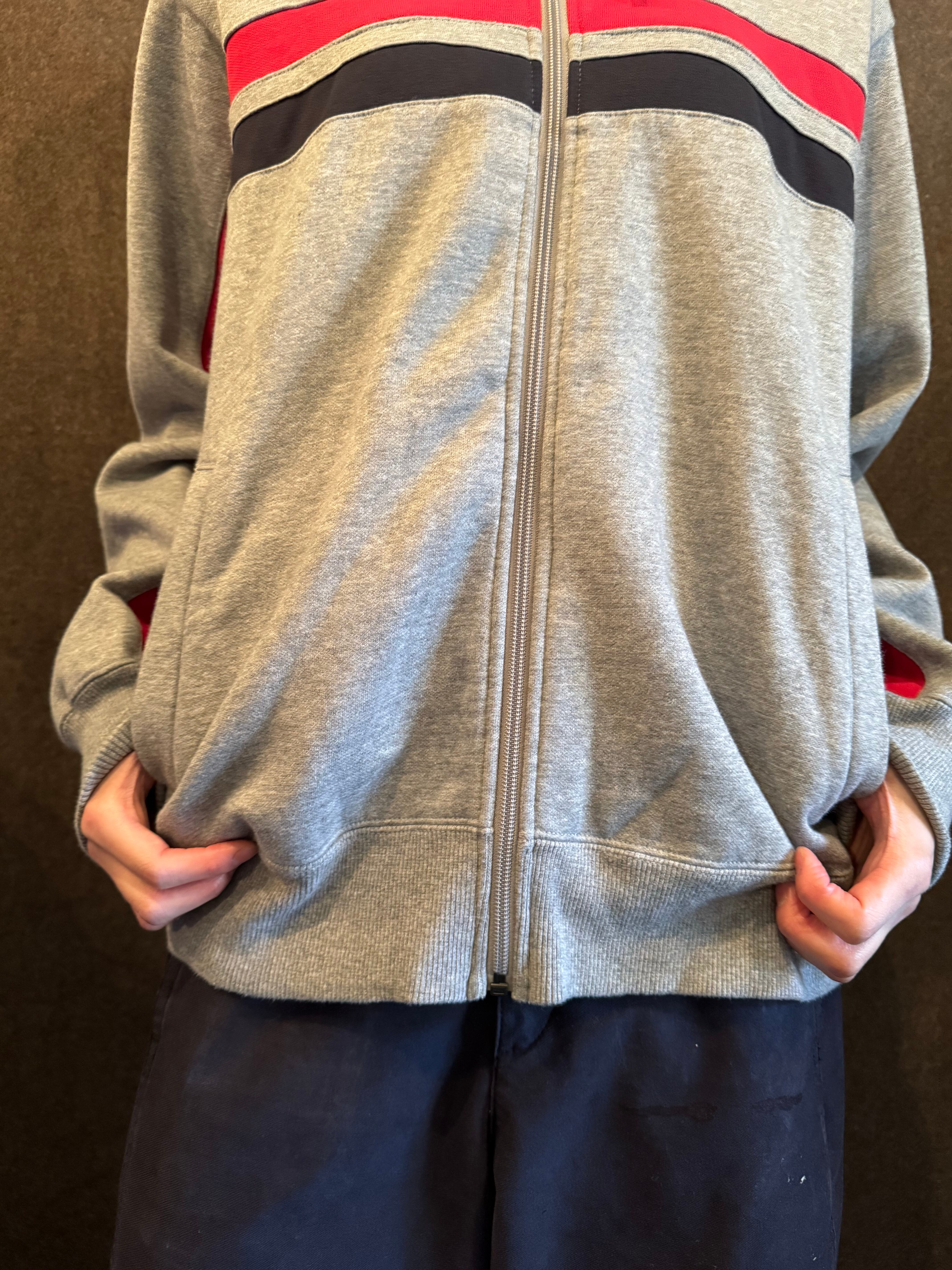 こちらはグレーカラーボディーにレッド×ブラックのラインデザインの施されたジップパーカー。