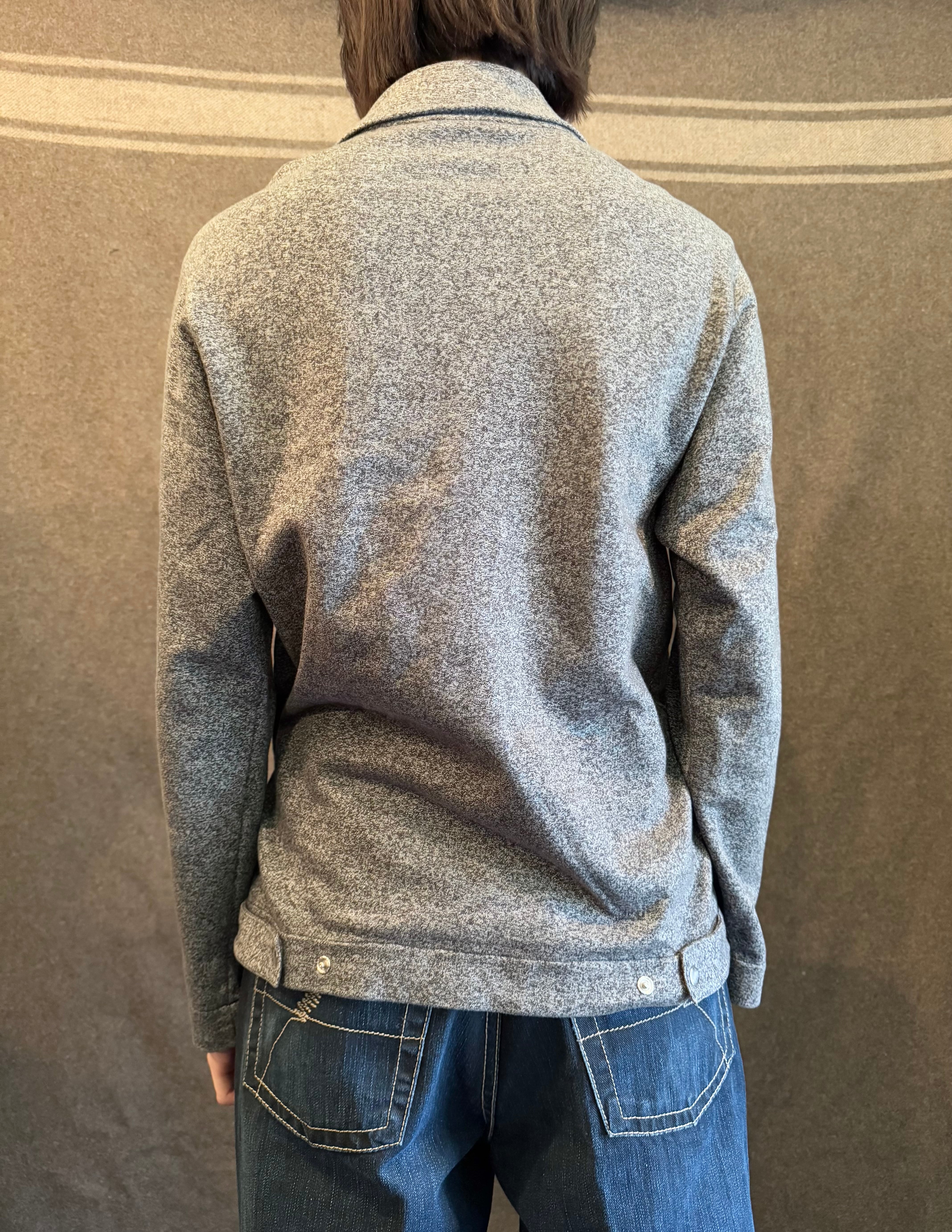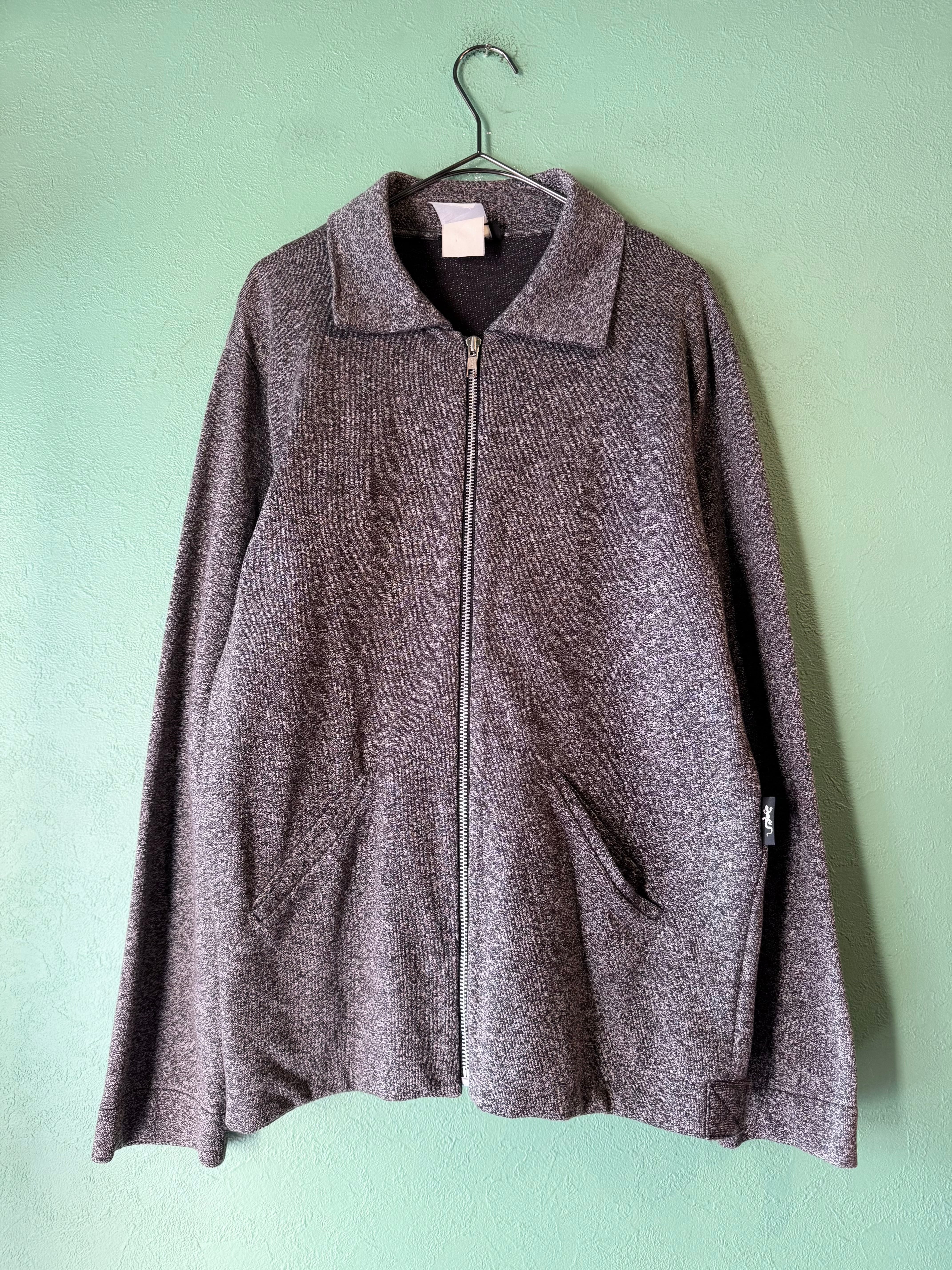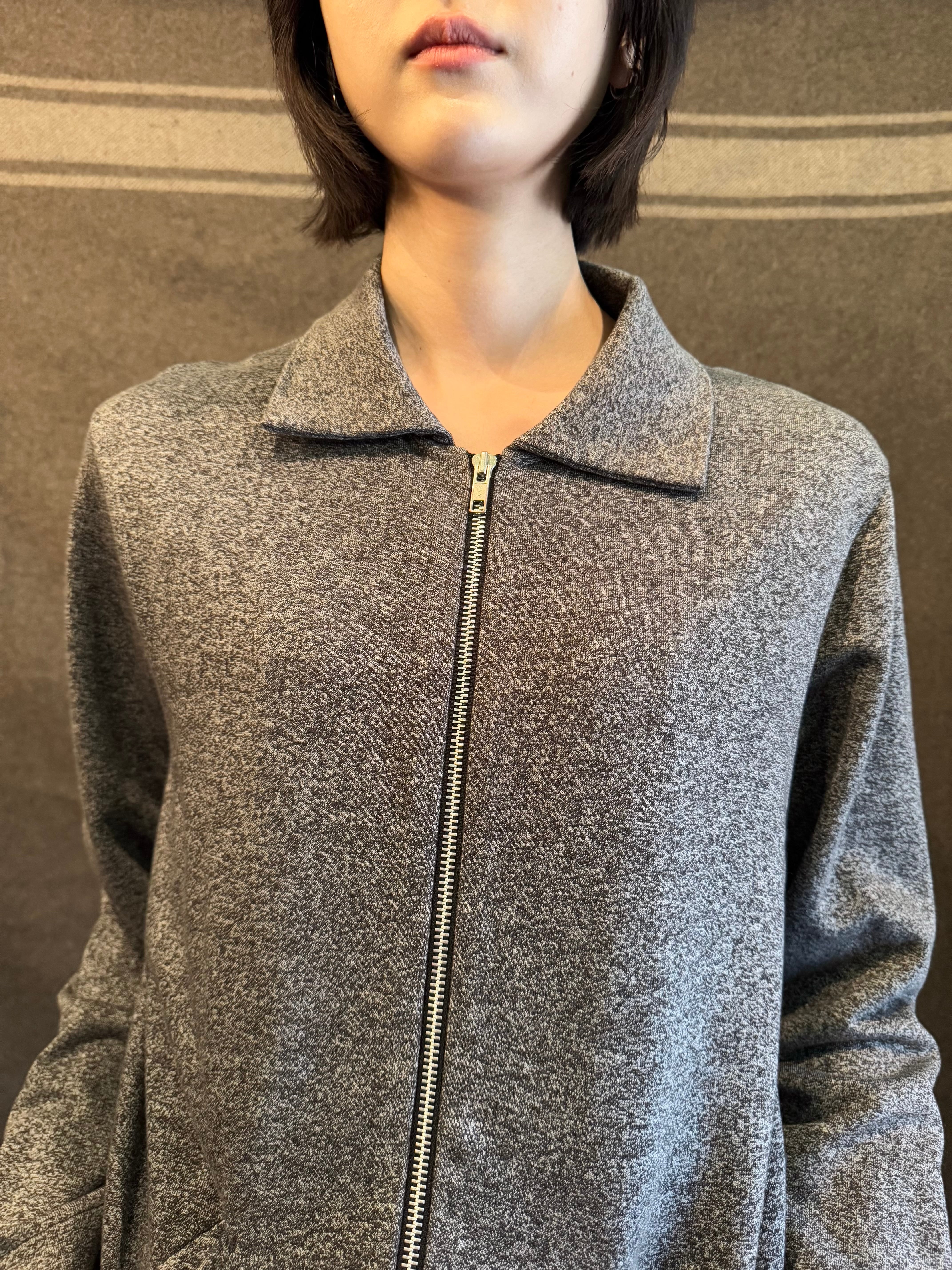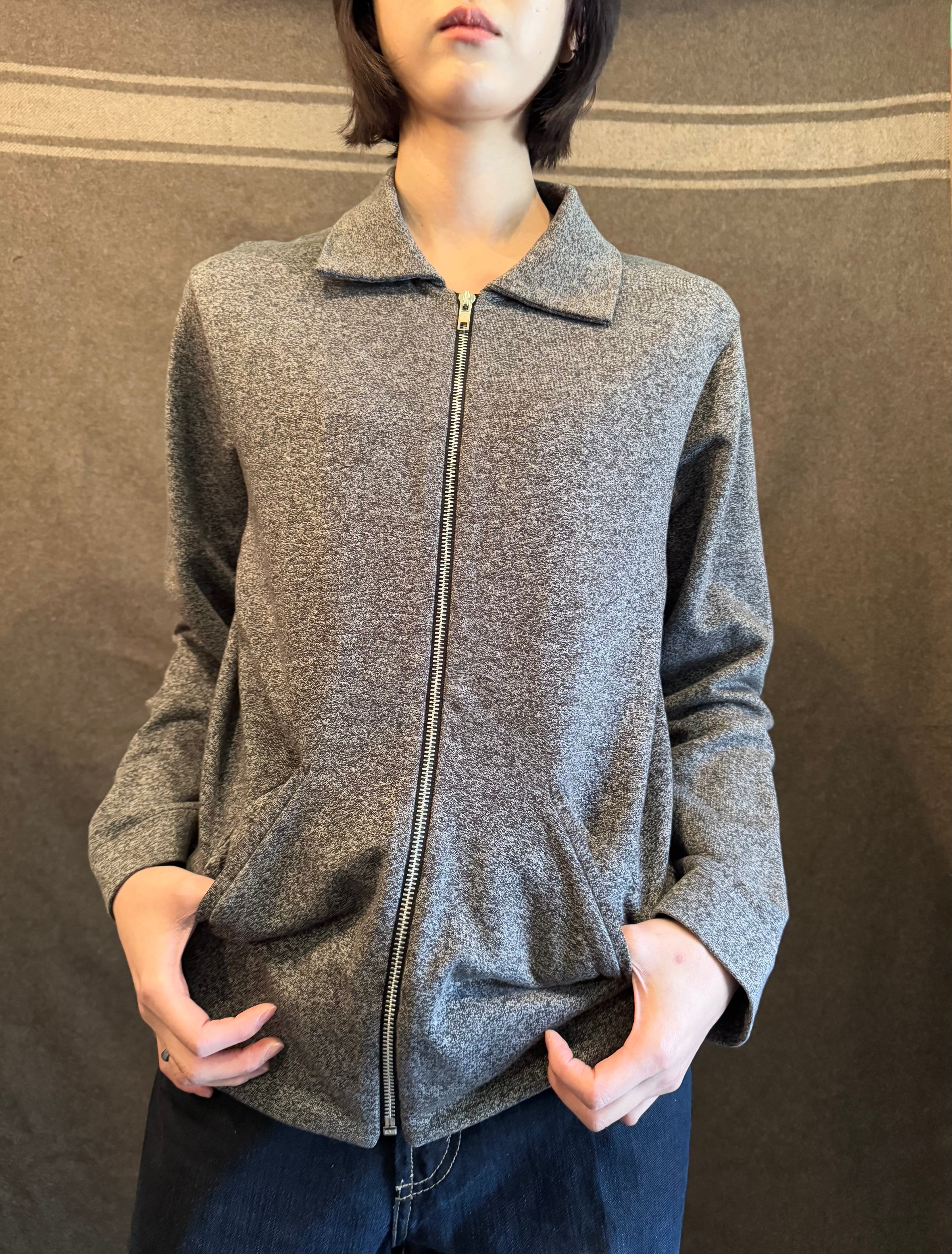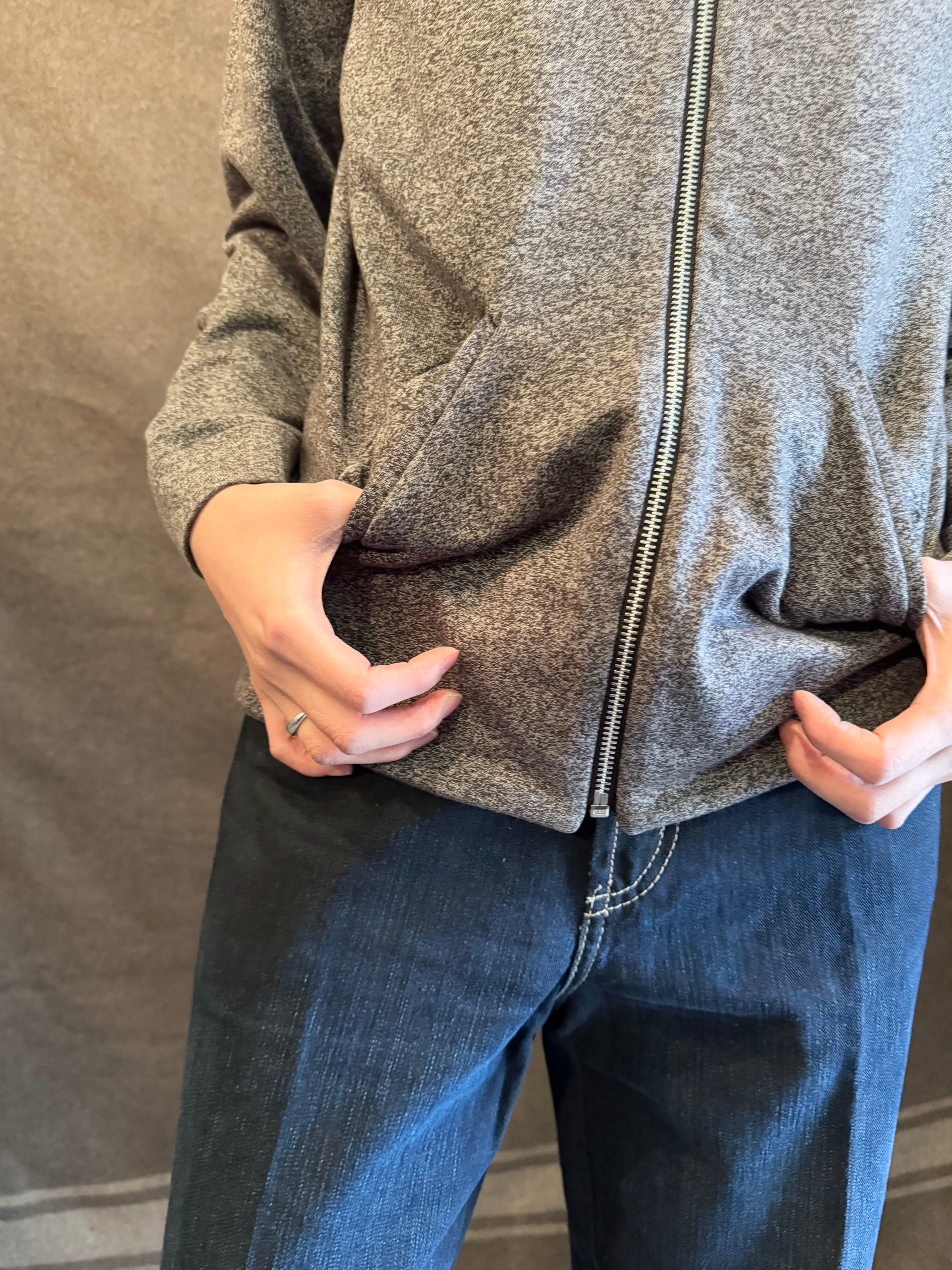 ごま塩のようなグレー×ブラックの霜降りカラーに着脱のしやすいフロントジップタイプのジャケット。
