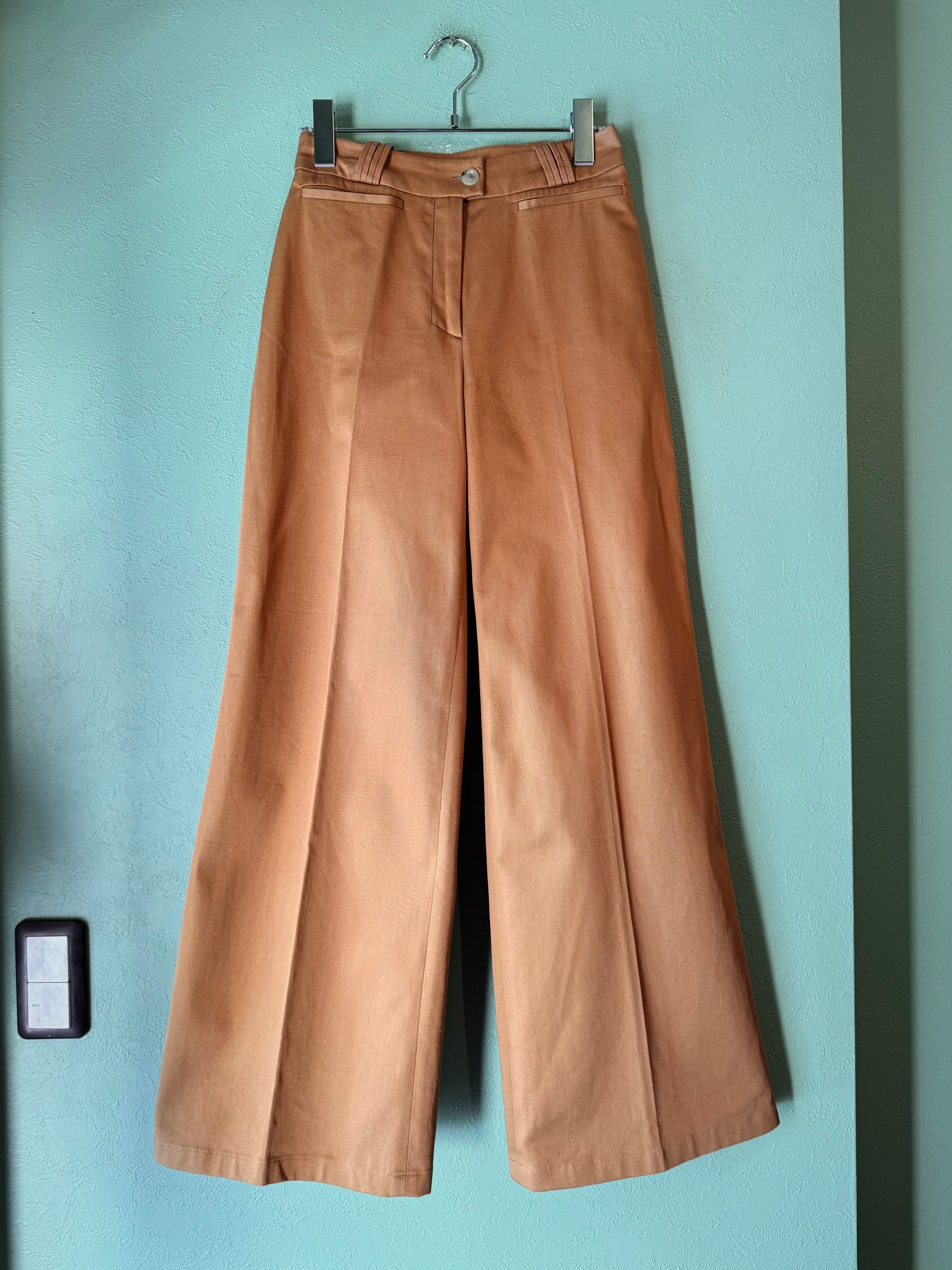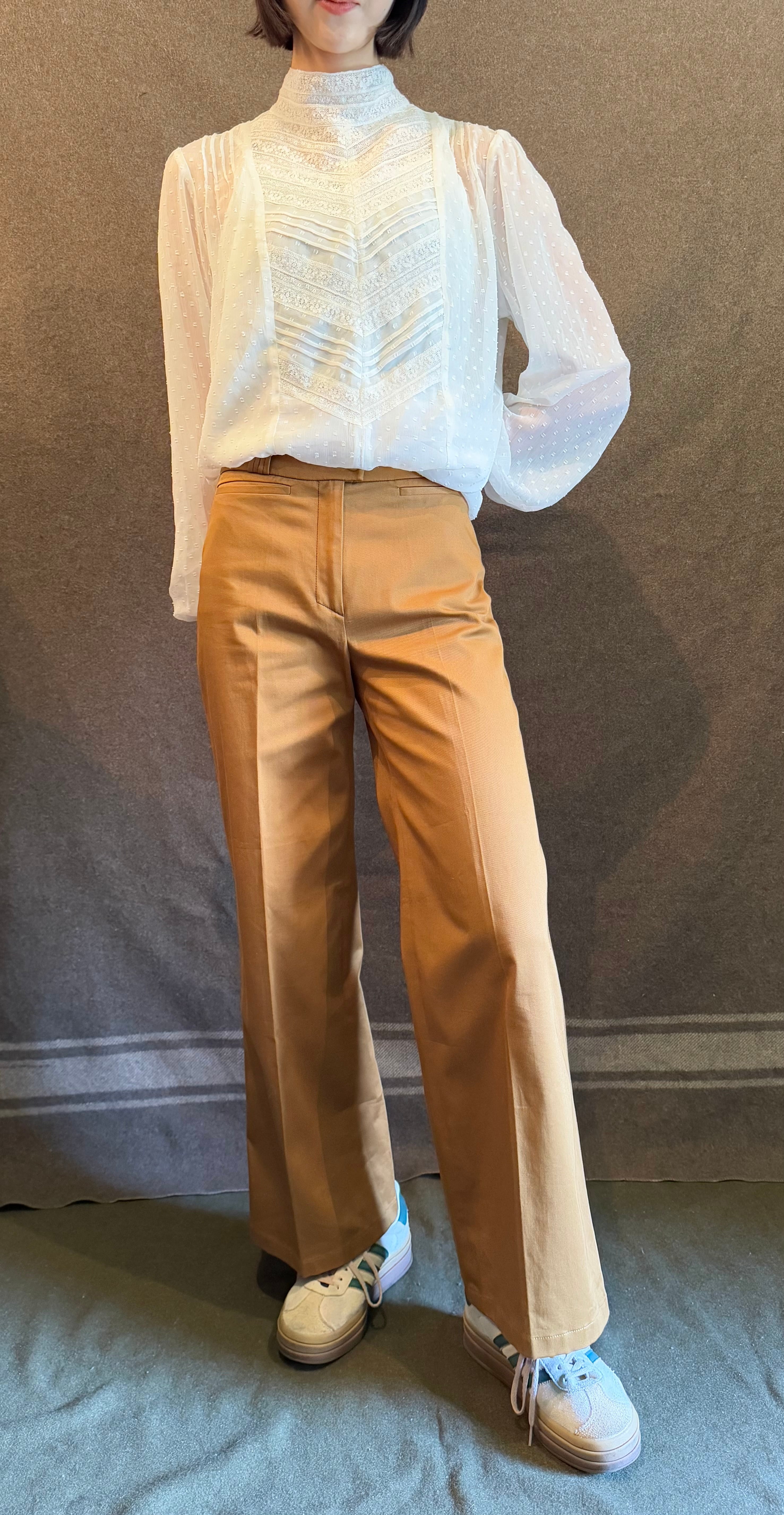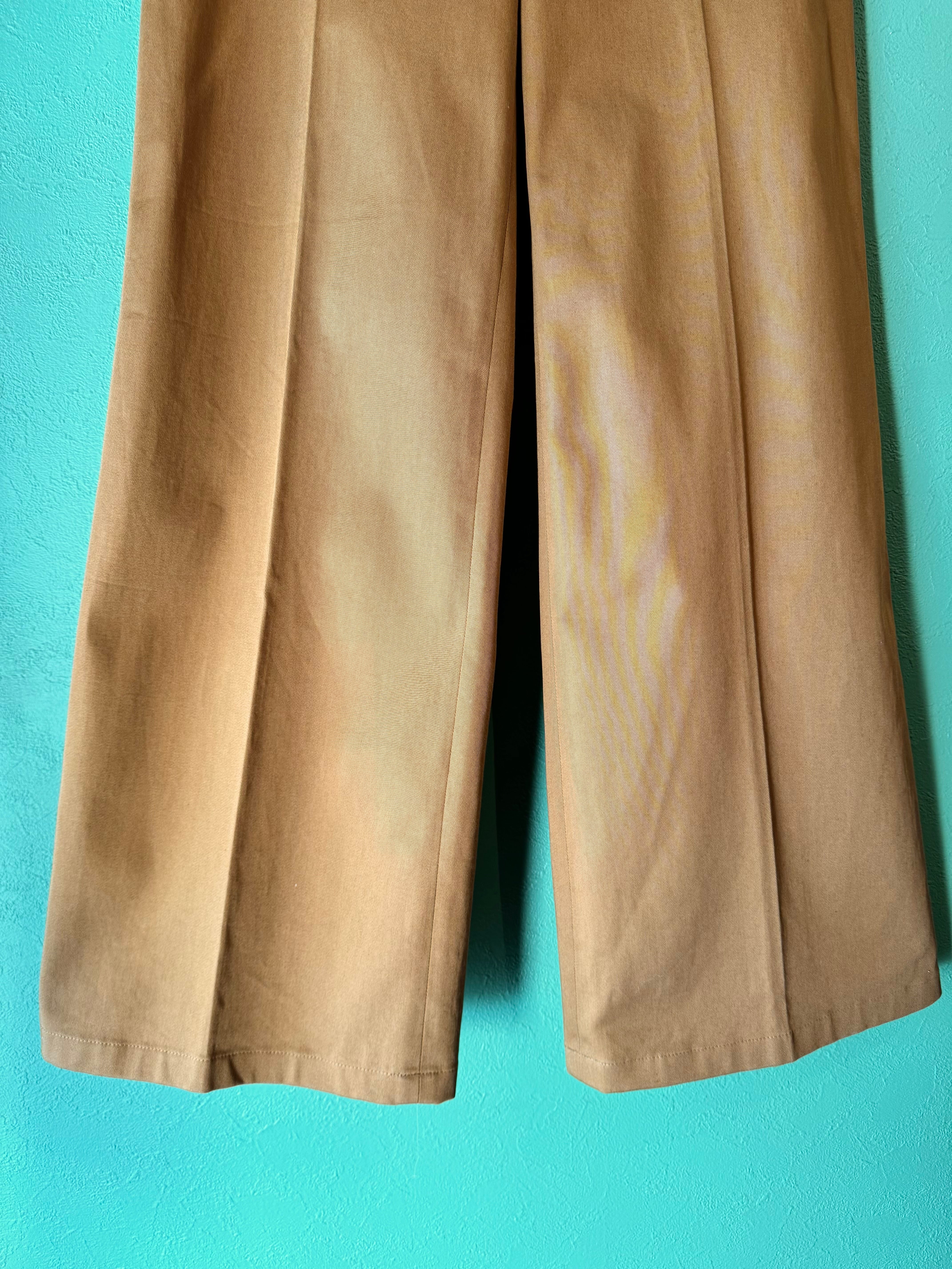 こちらはブラウンベージュカラーに裾に向かうにつれややフレアしたワイドパンツ。