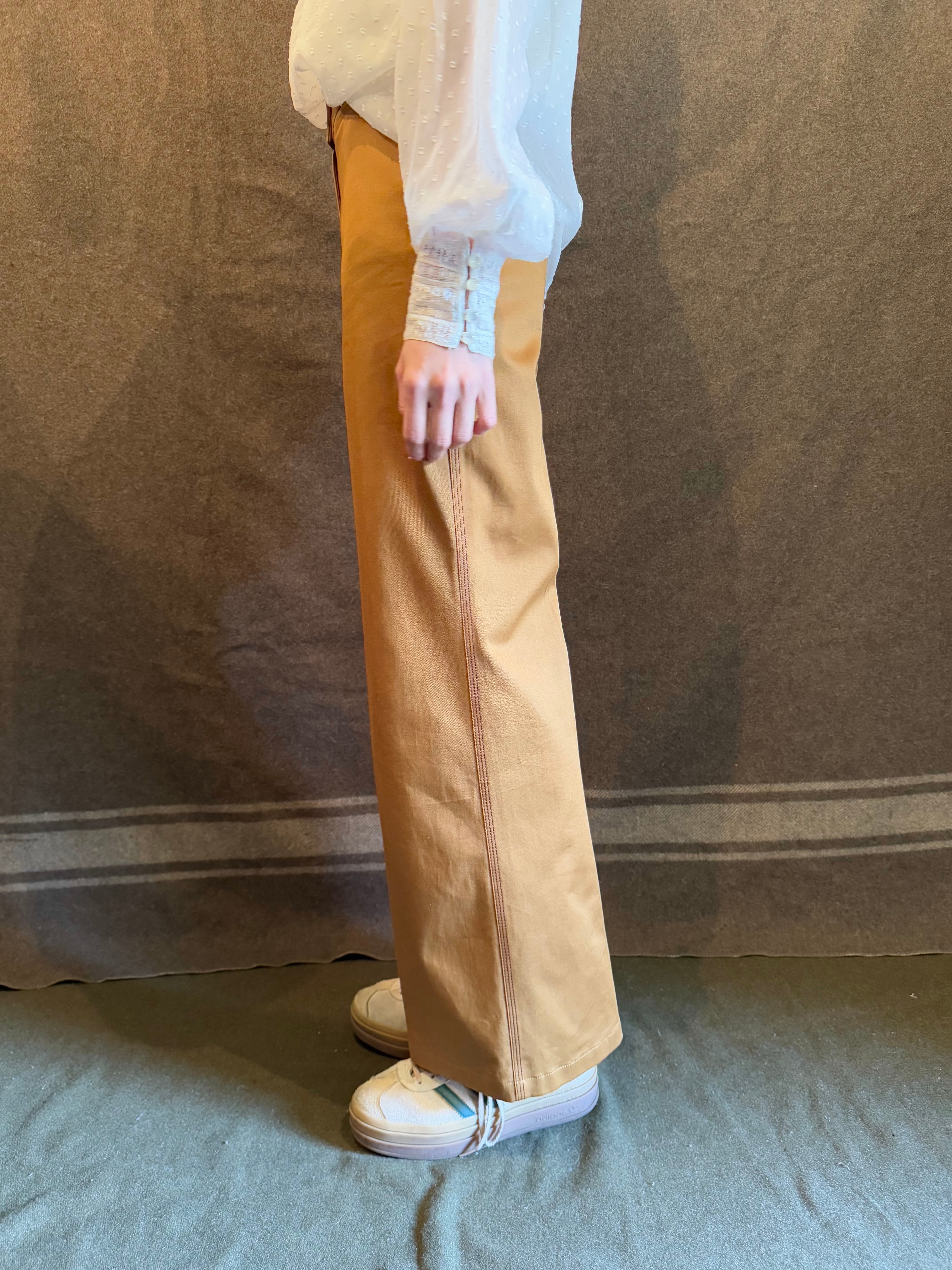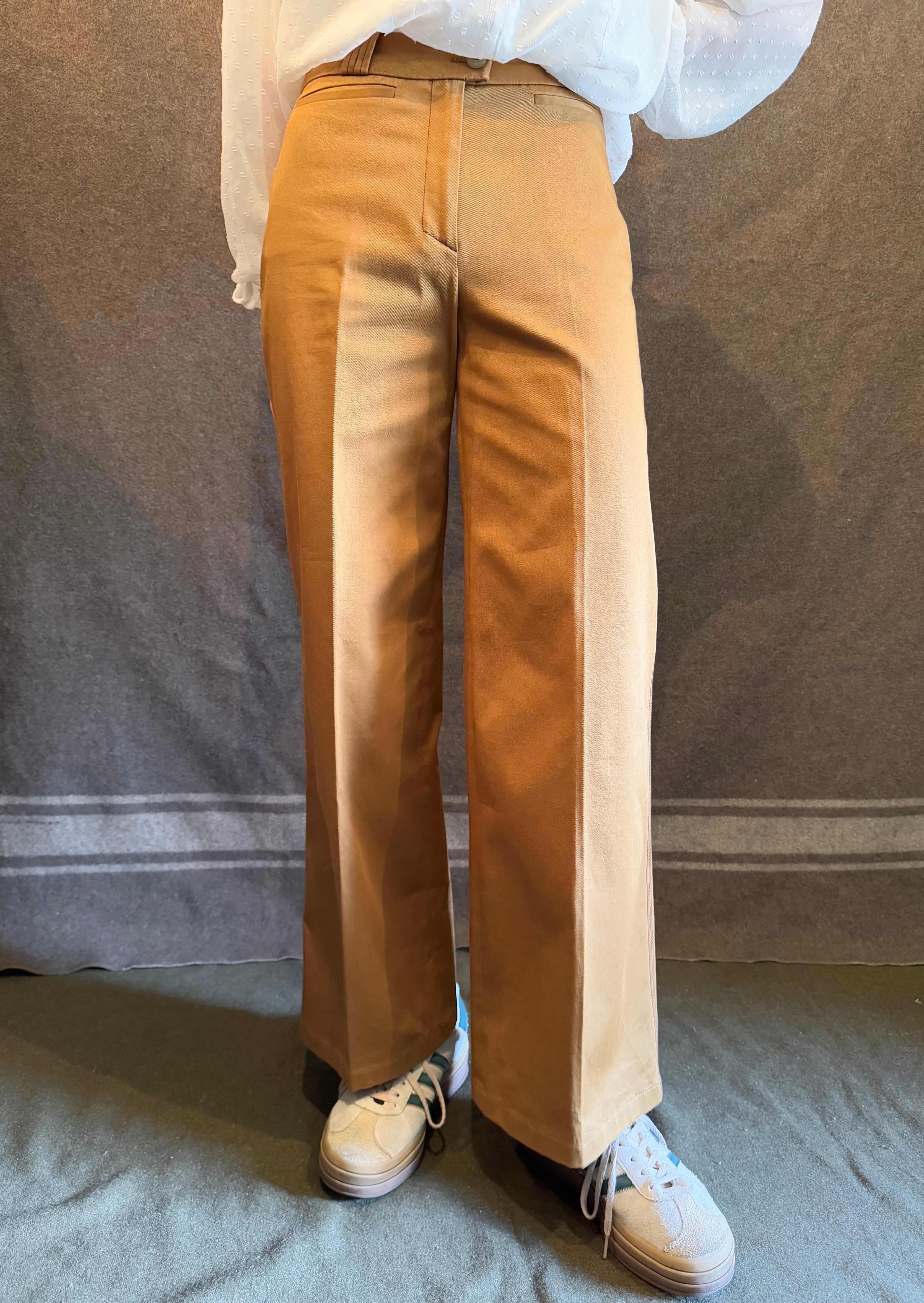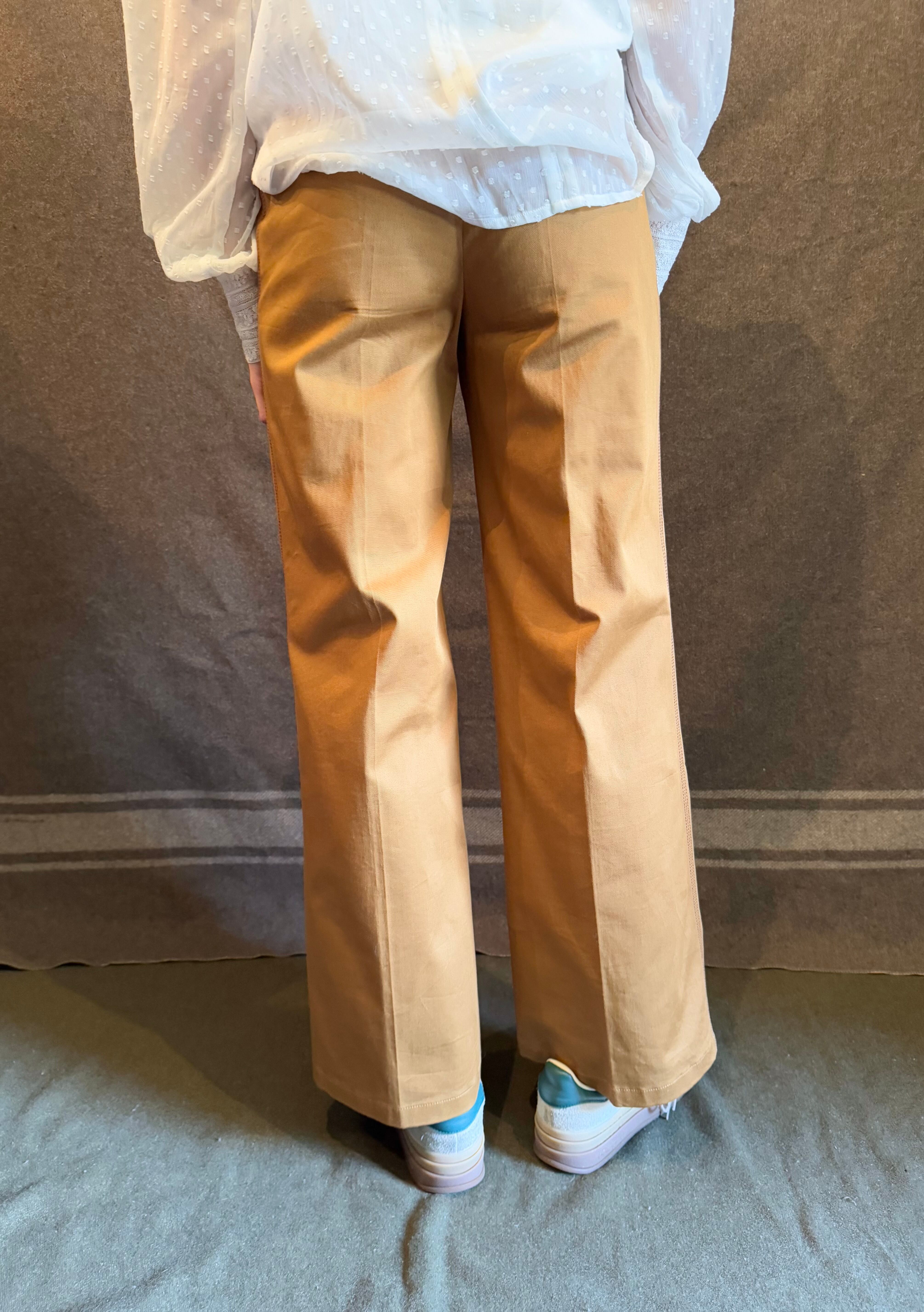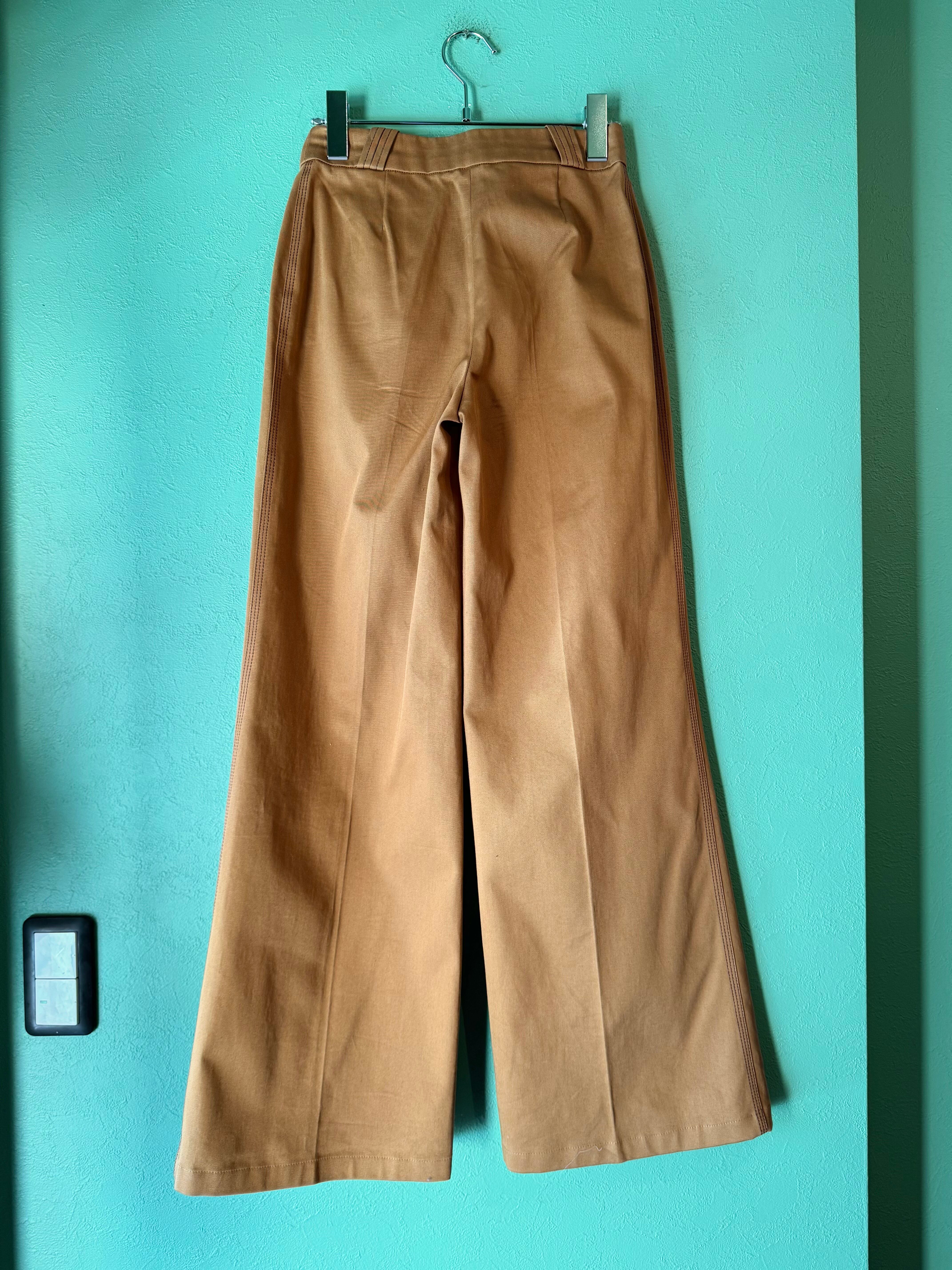 こちらはブラウンベージュカラーに裾に向かうにつれややフレアしたワイドパンツ。