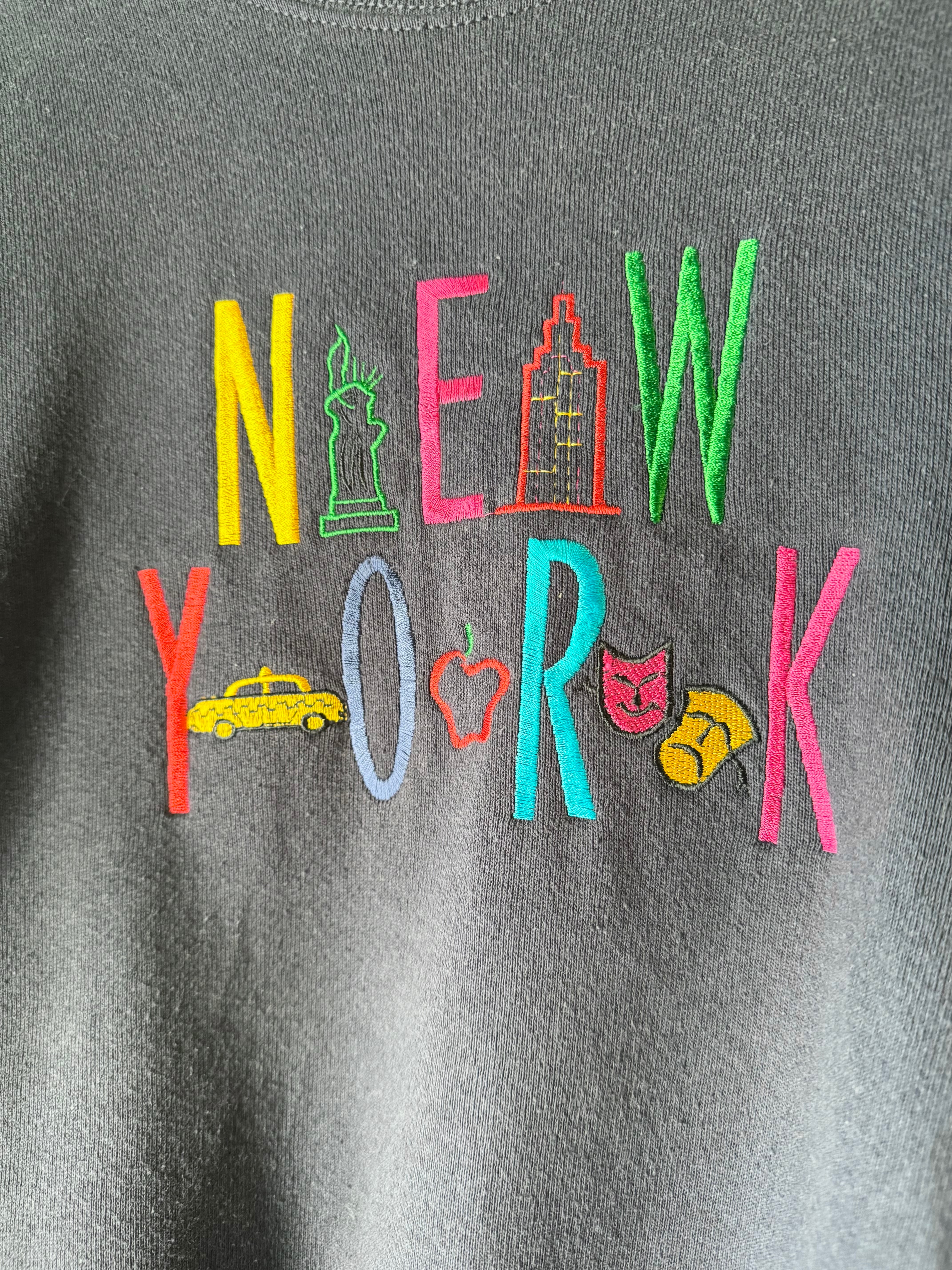 ネイビーボディーにニューヨークの名物がカラフルに刺繍されたオールドライクなデザインが可愛い1着です。