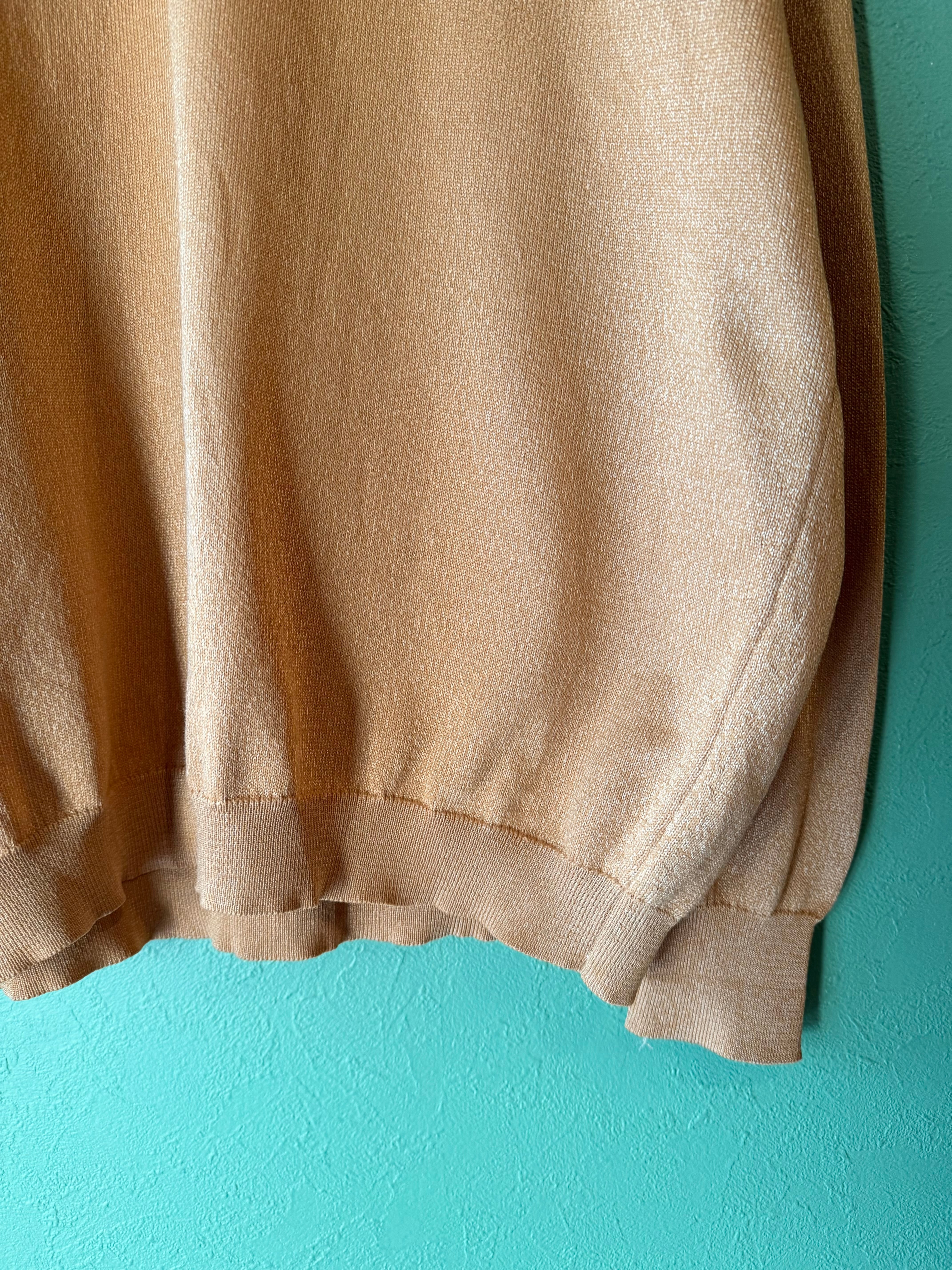 こたらは光沢のあるゴールドがかったマスタードカラーの渋いニットポロシャツ。