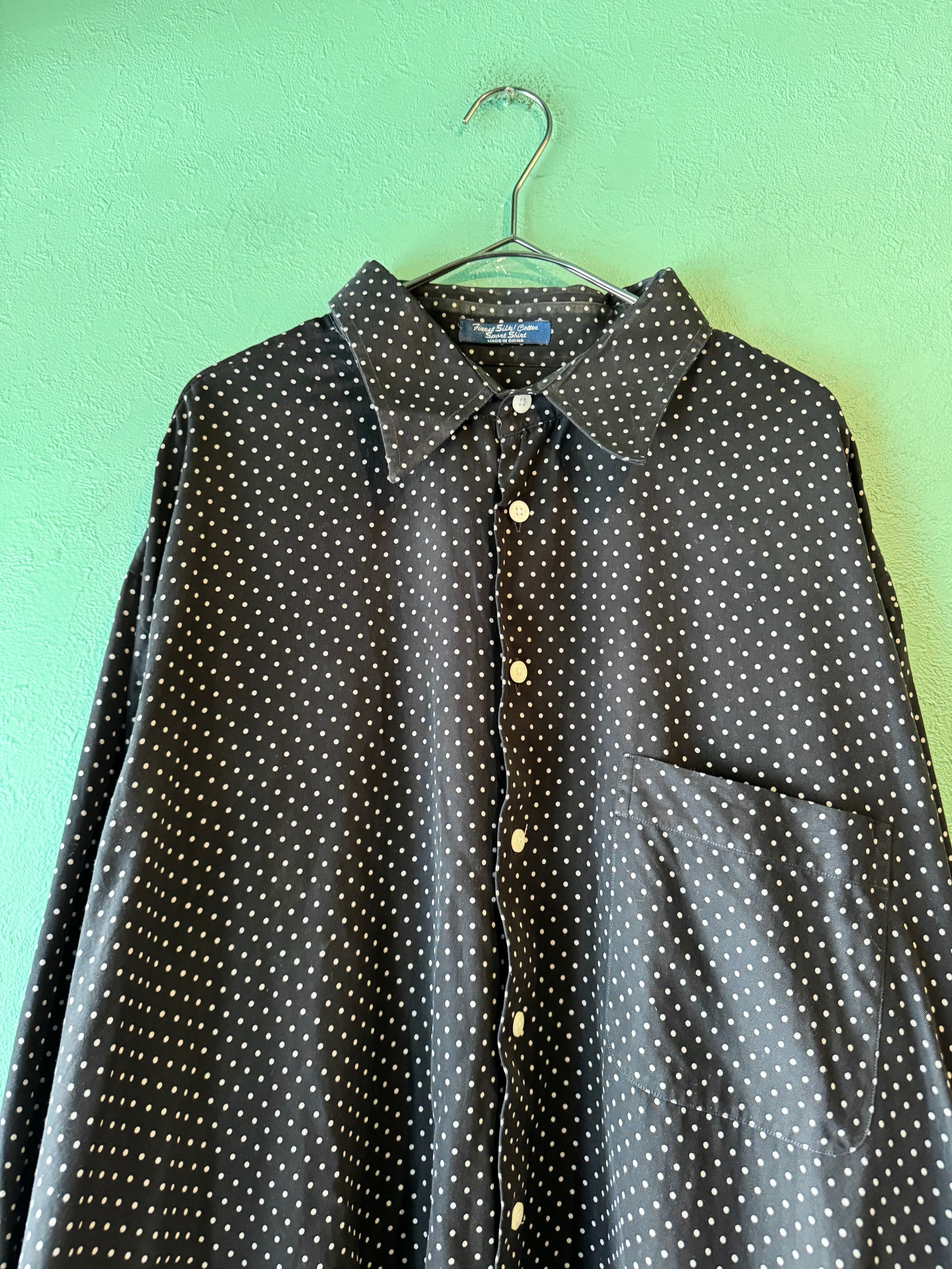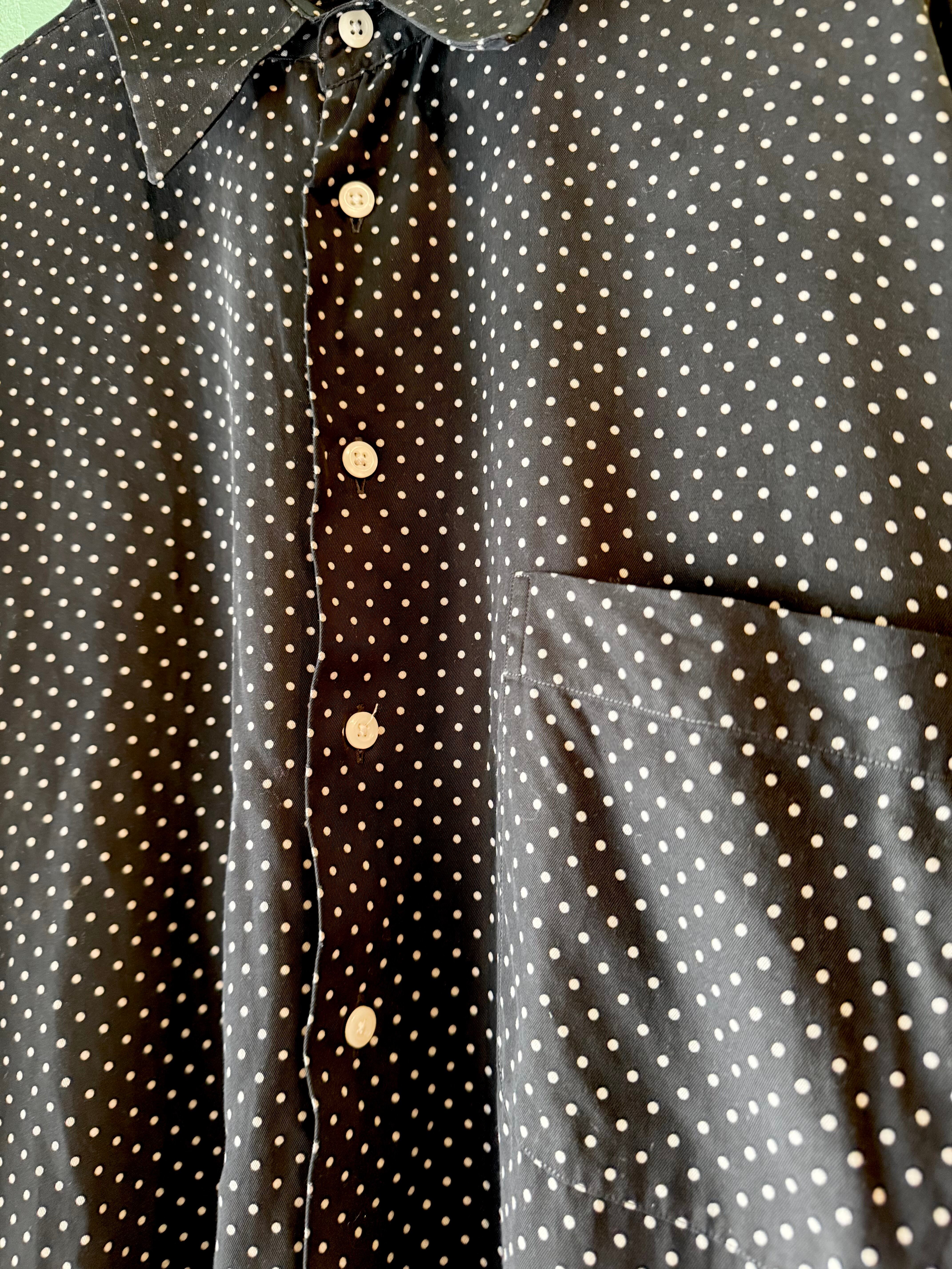 当店ではあまり入荷しないドット柄アイテムですが、これはブラックベースにホワイトのドット柄が可愛く、なんと言っても高級感のあるシルク素材を使用した1着。