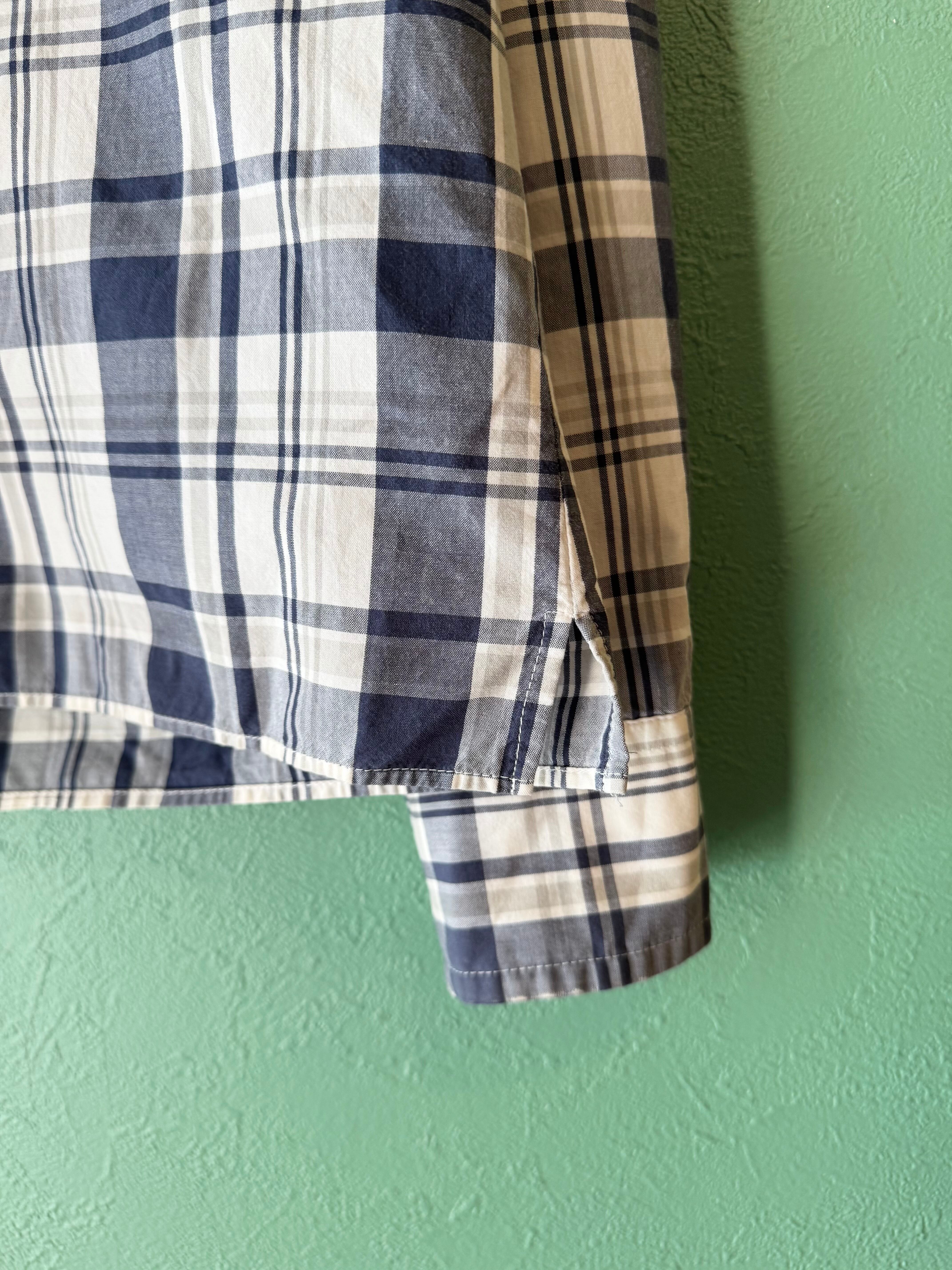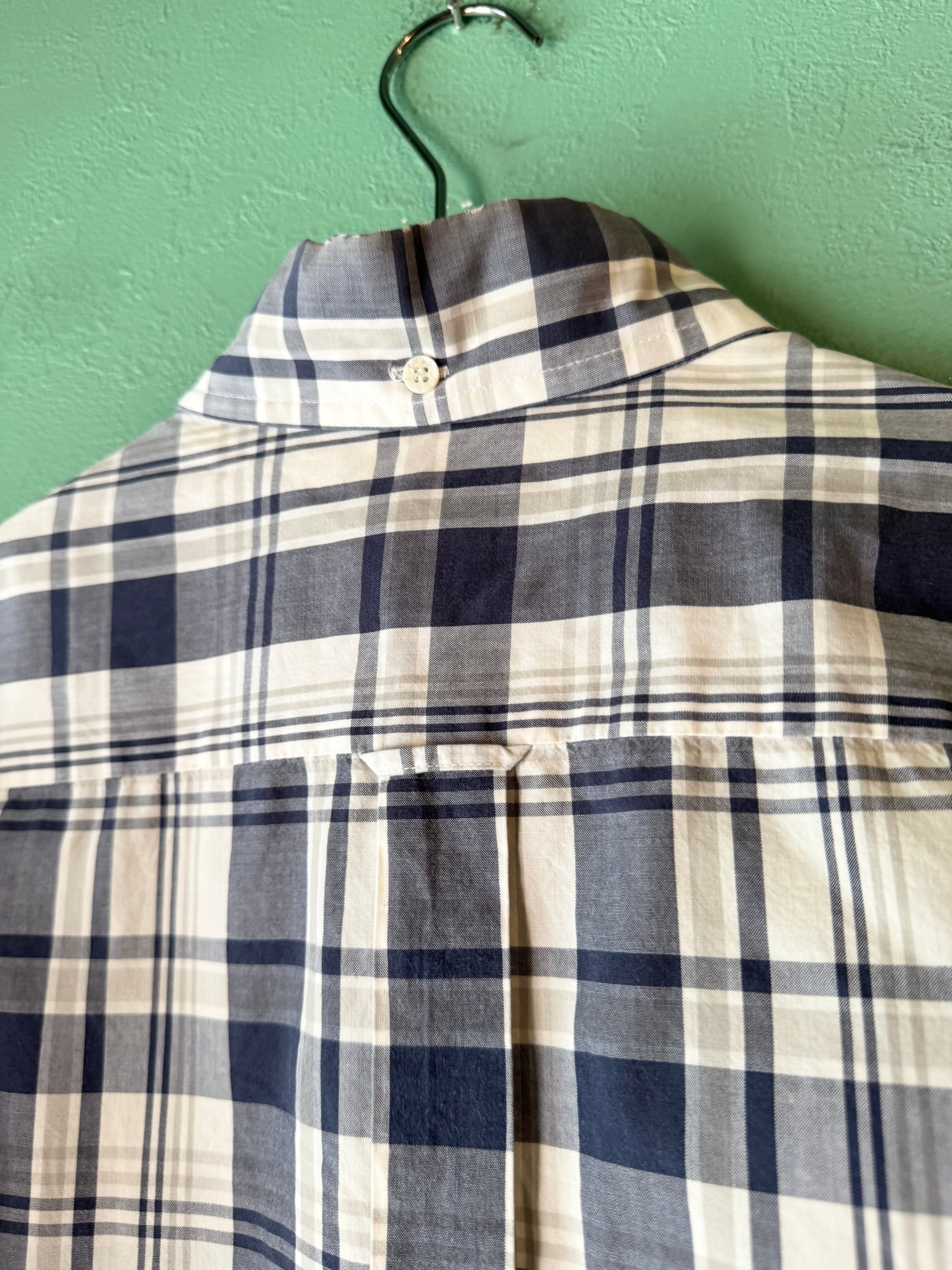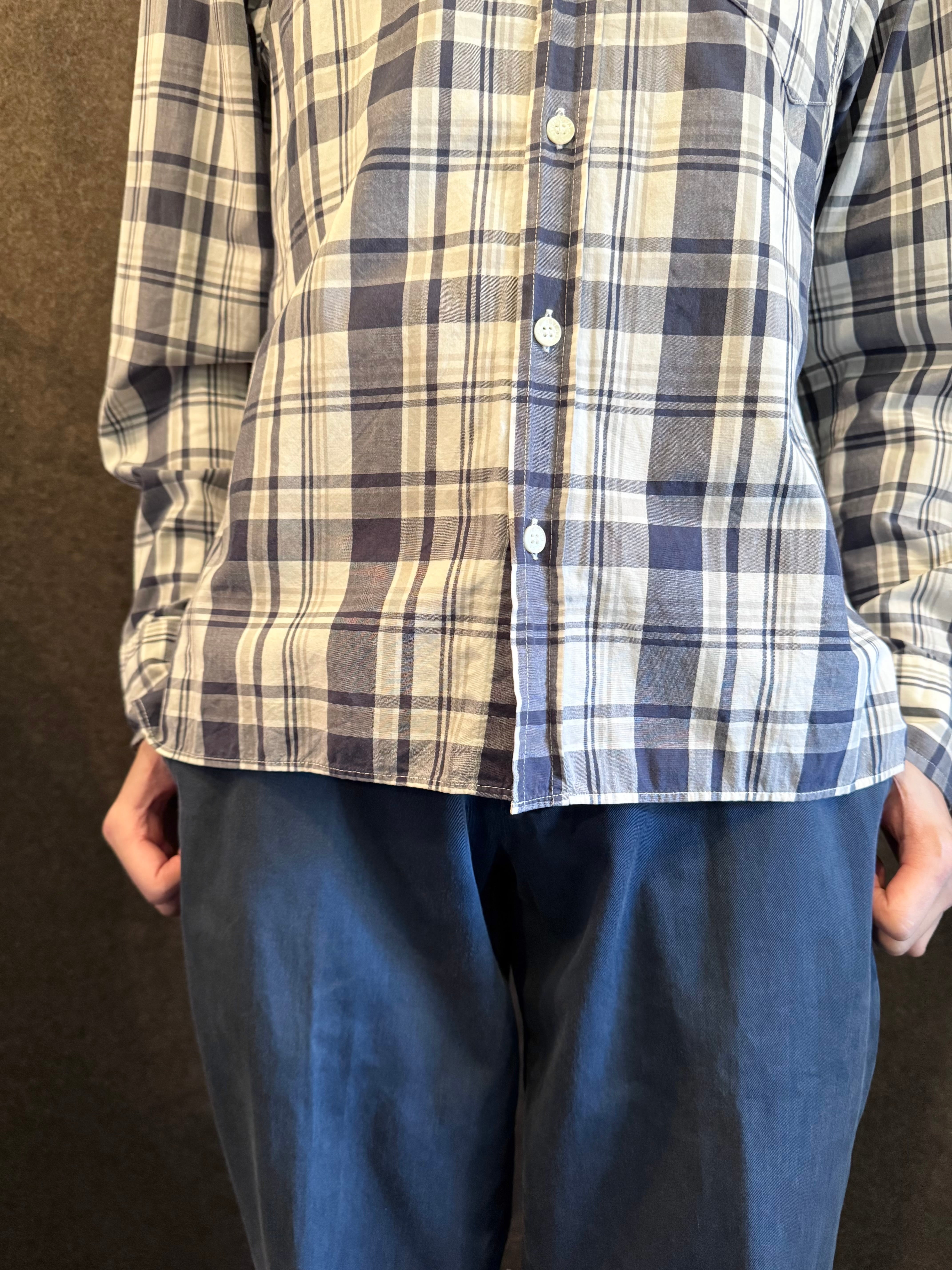 ネイビー×ホワイトを基調としたチェックパターンにクラシックなボタンダウン、襟裏の3点留めといった良い意味でエイプらしくないトラデショナルな1着です。
