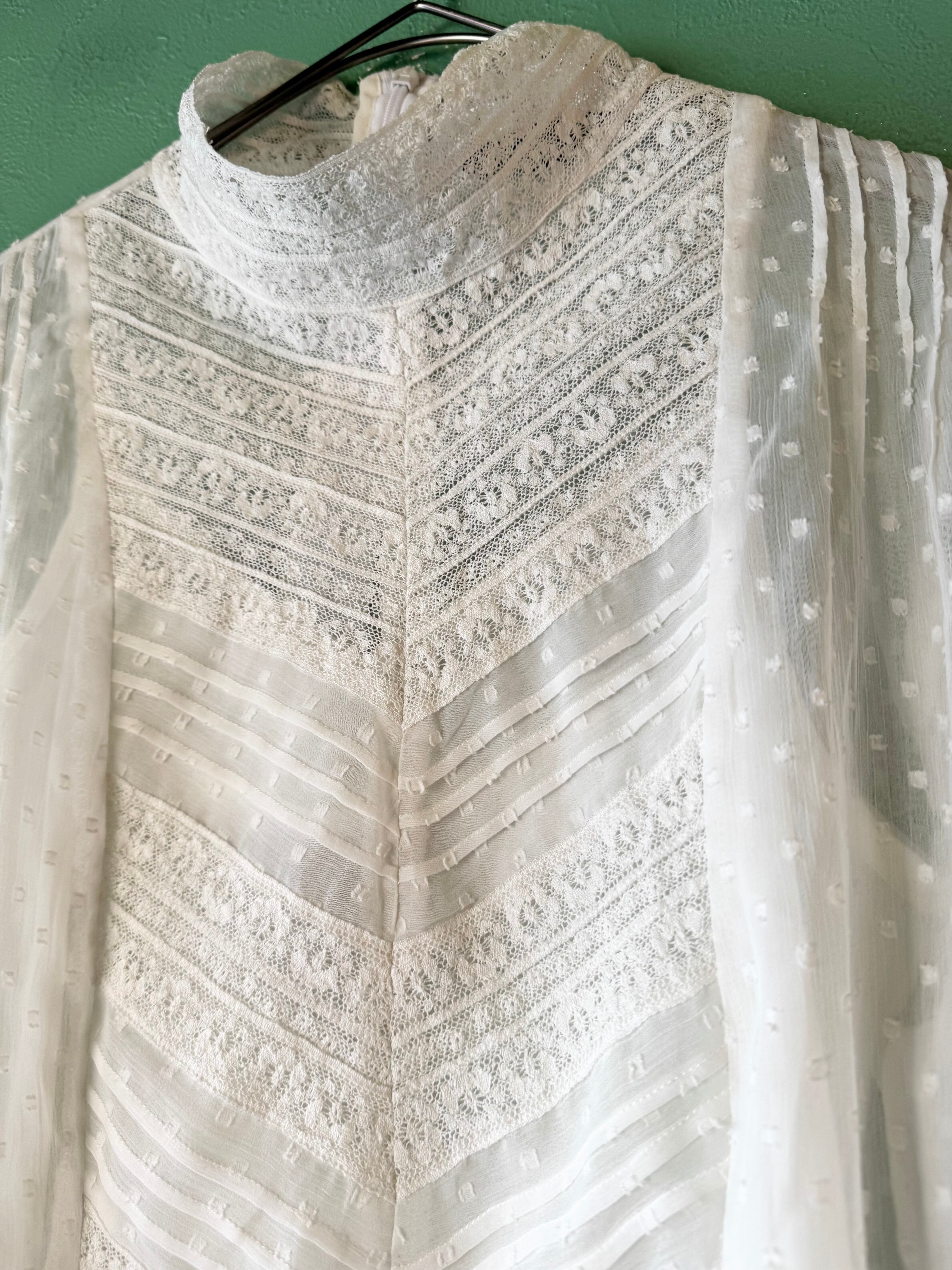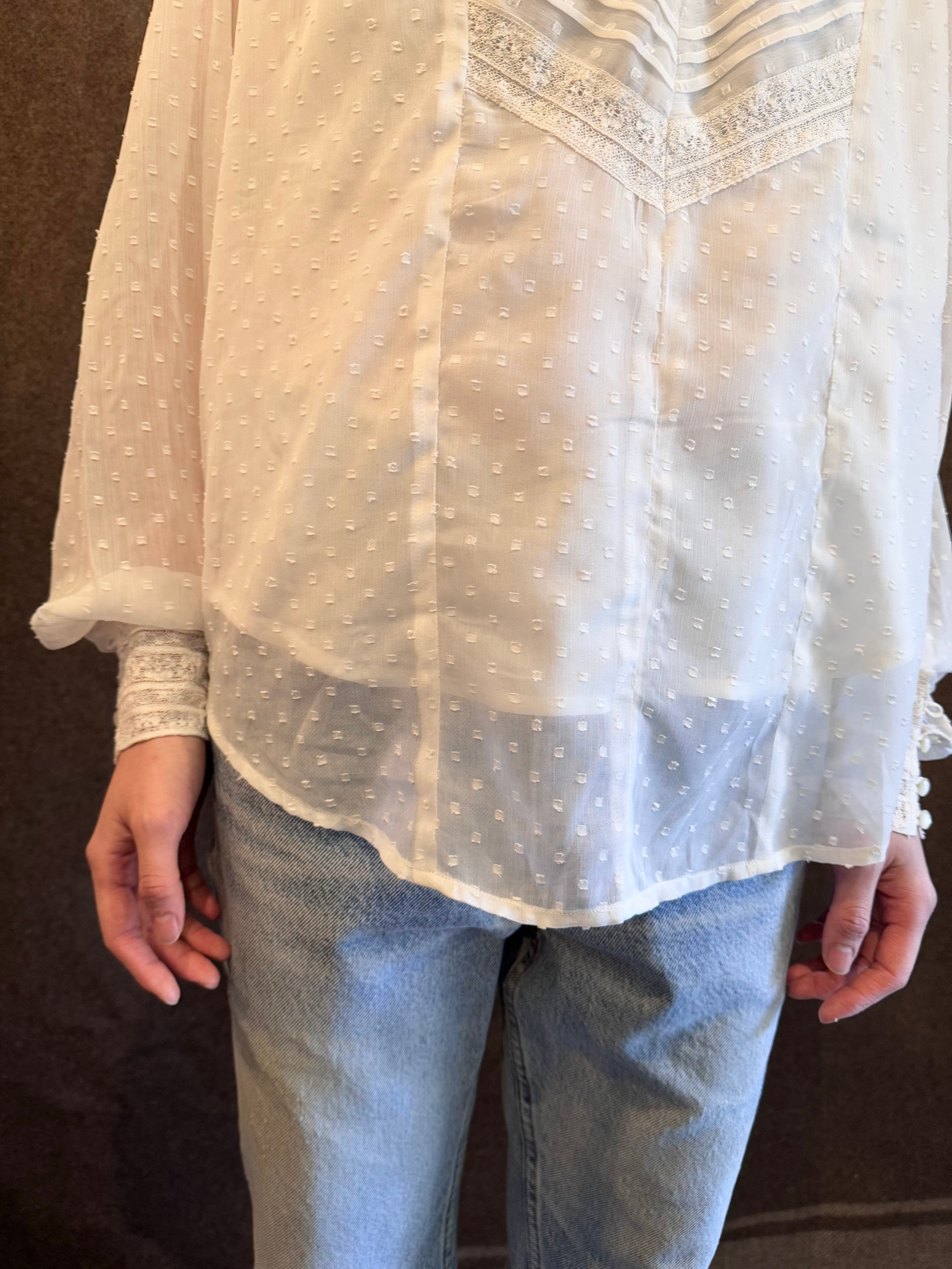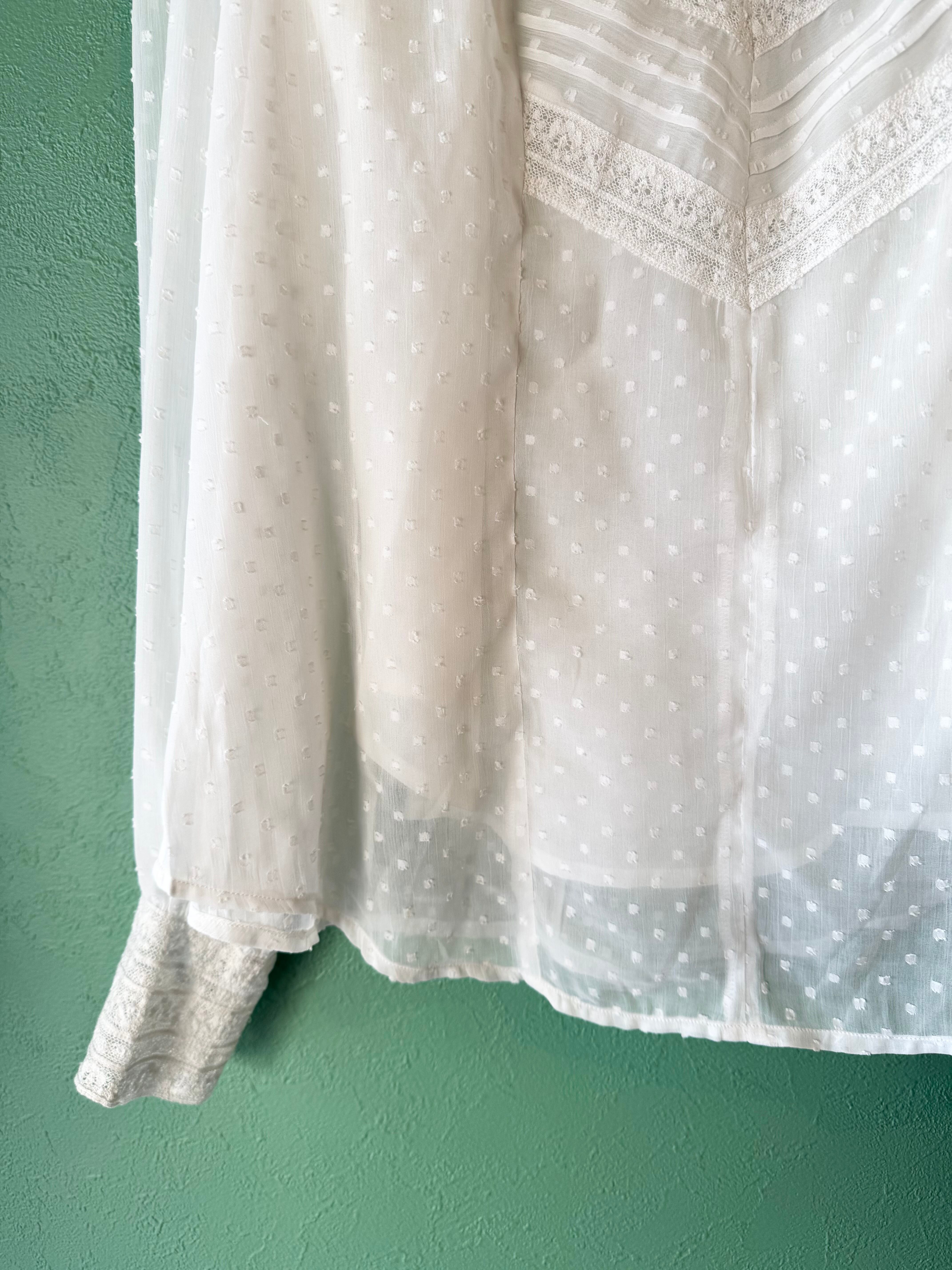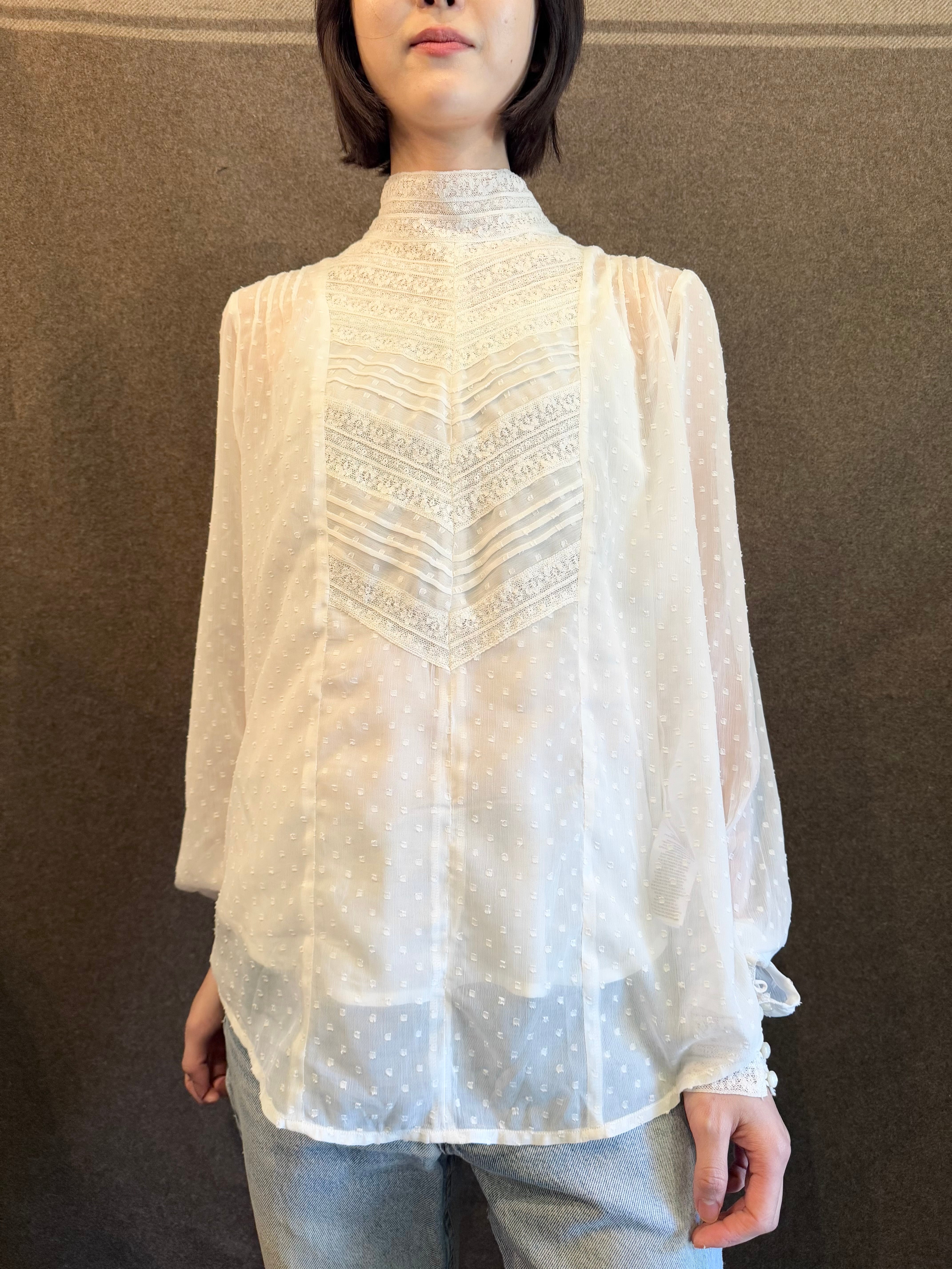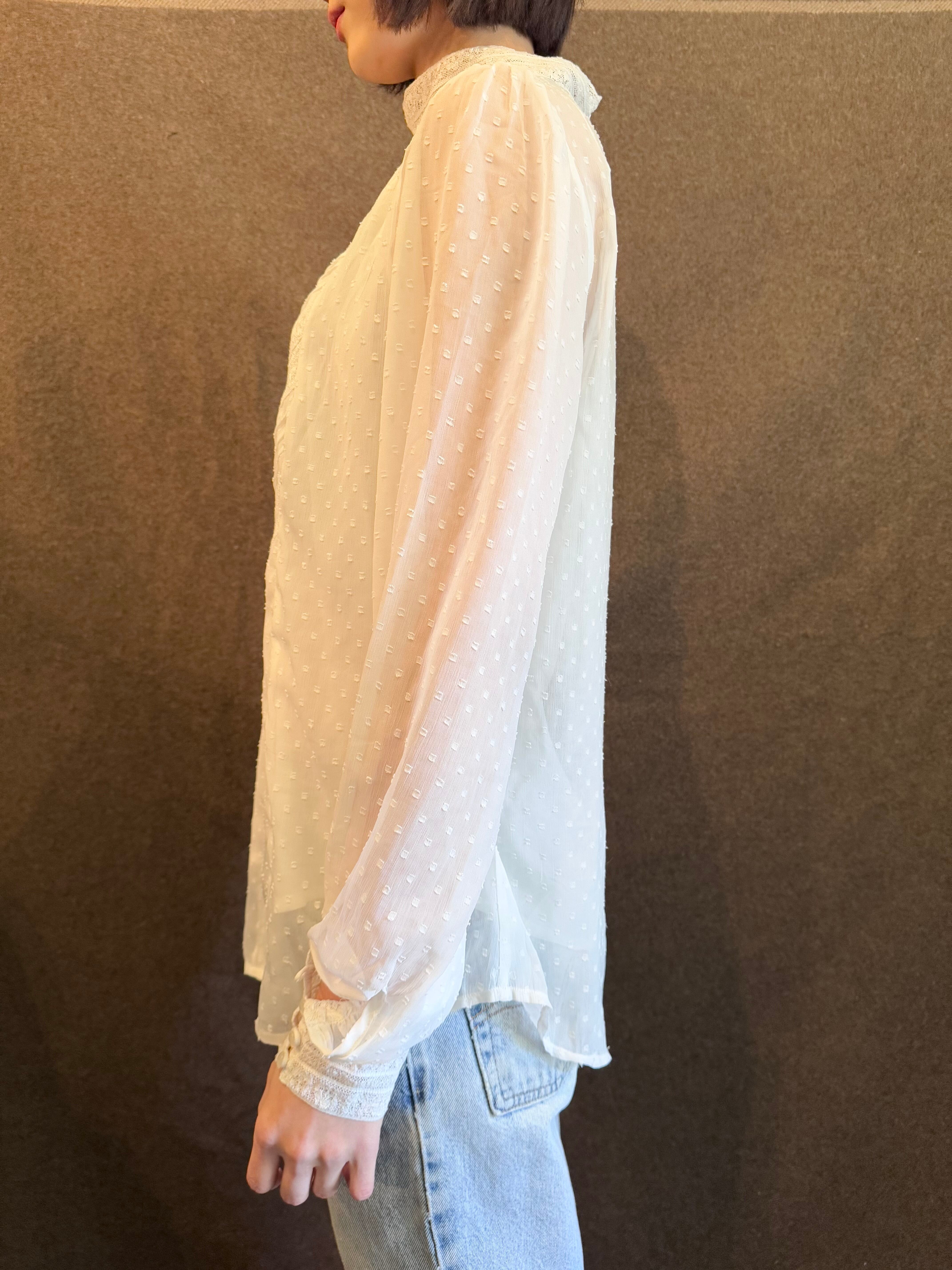 こちらはネックからフロントにかけて花柄、袖や裾はスクエア調のドットパターンのような繊細で凝ったデザインのブラウス。