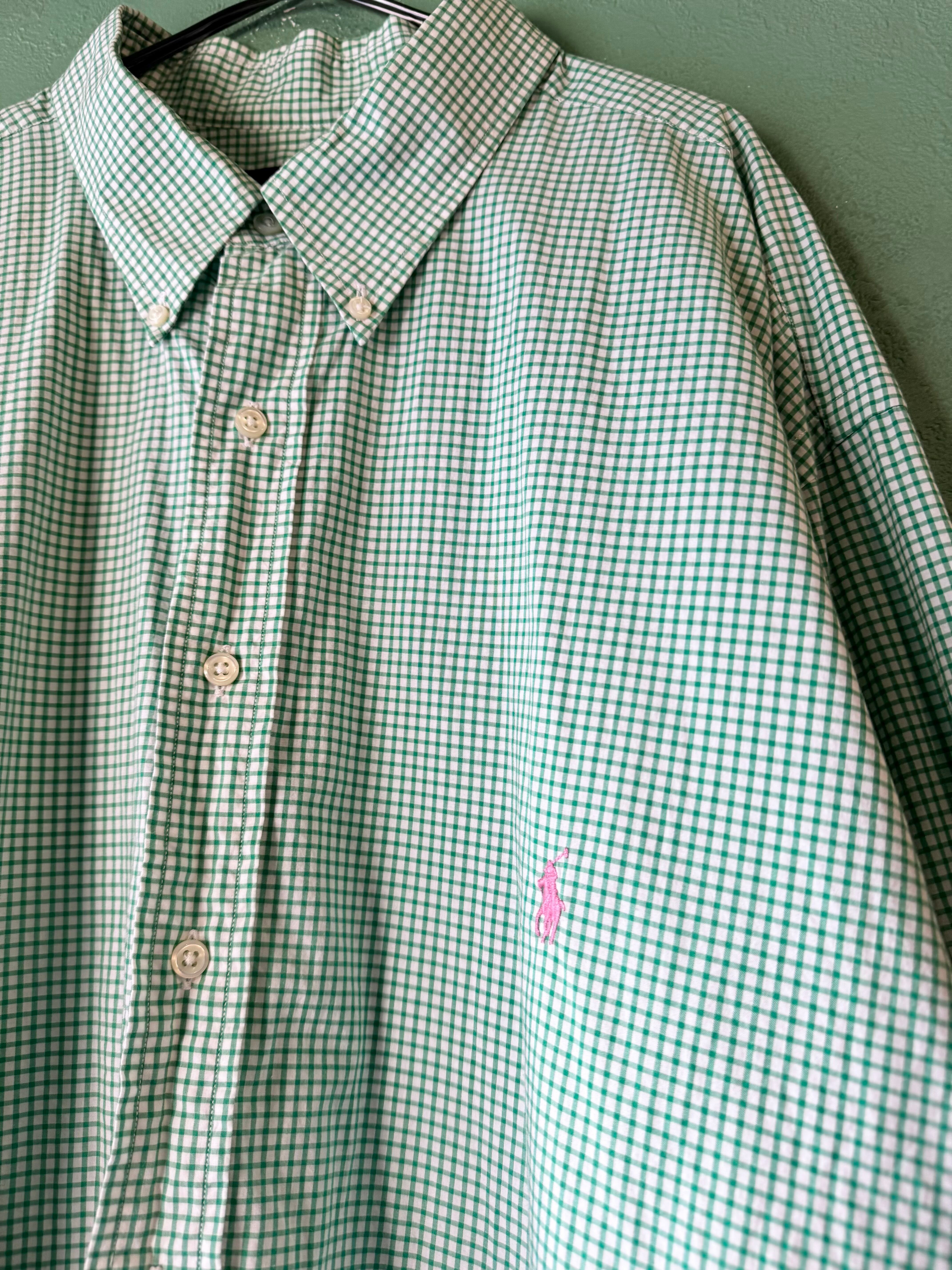 ラルフではベーシックなボタンダウンに可愛らしいグリーン×ホワイトのギンガムチェックパターン、ピンクのポニーロゴがアクセントになっています。