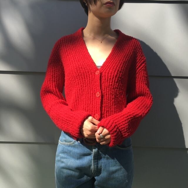 ■80年代頃のデザインニットカーディガンです。パイル地に近いアクリルニットです。くるんとしたカーリーのような編み方にリブ風のデザイン。裾も変わった形をしています。