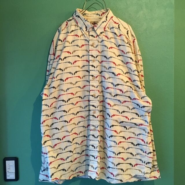 ■90~00年代頃の銃柄シャツです。カラフルな銃が全面にプリントされているシャツ。どこかワコマリアのような雰囲気のあるアイテム。アメリカ製というところも古着好きからすると嬉しいポイントですね。