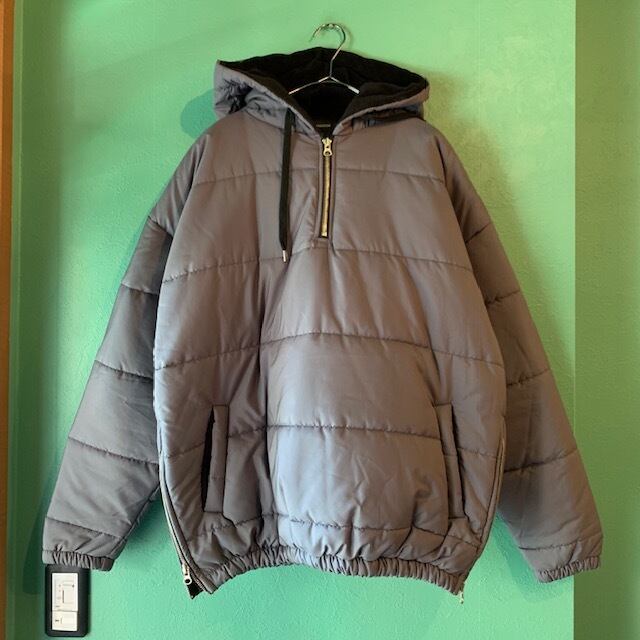 ■90~00年代頃のパディングプルオーバーパーカーです。ダウンではありませんが中綿がパンパンに入っているプルオーバーパーカー。マッドグレーのカラーリングにハーフジップ、スリットジップ仕様の良い意味で古着らしくない、どこかブランドアイテムにありそうな一着。